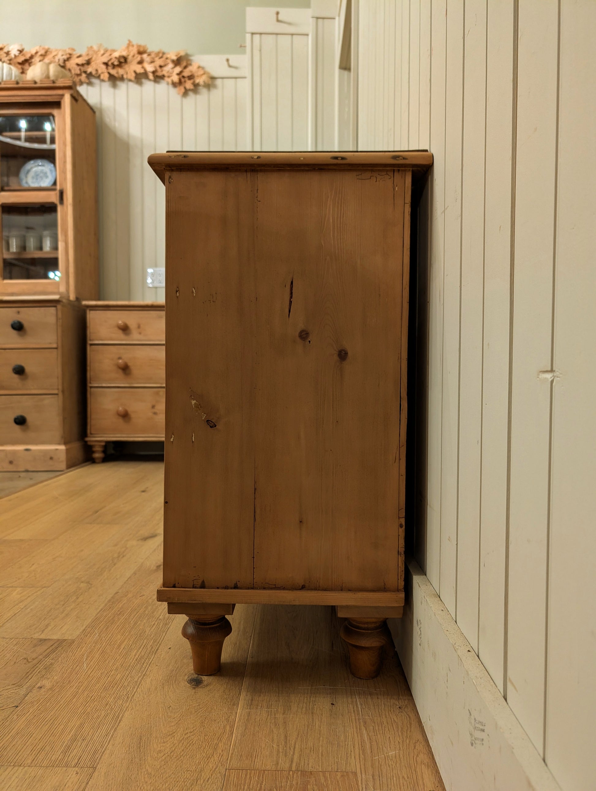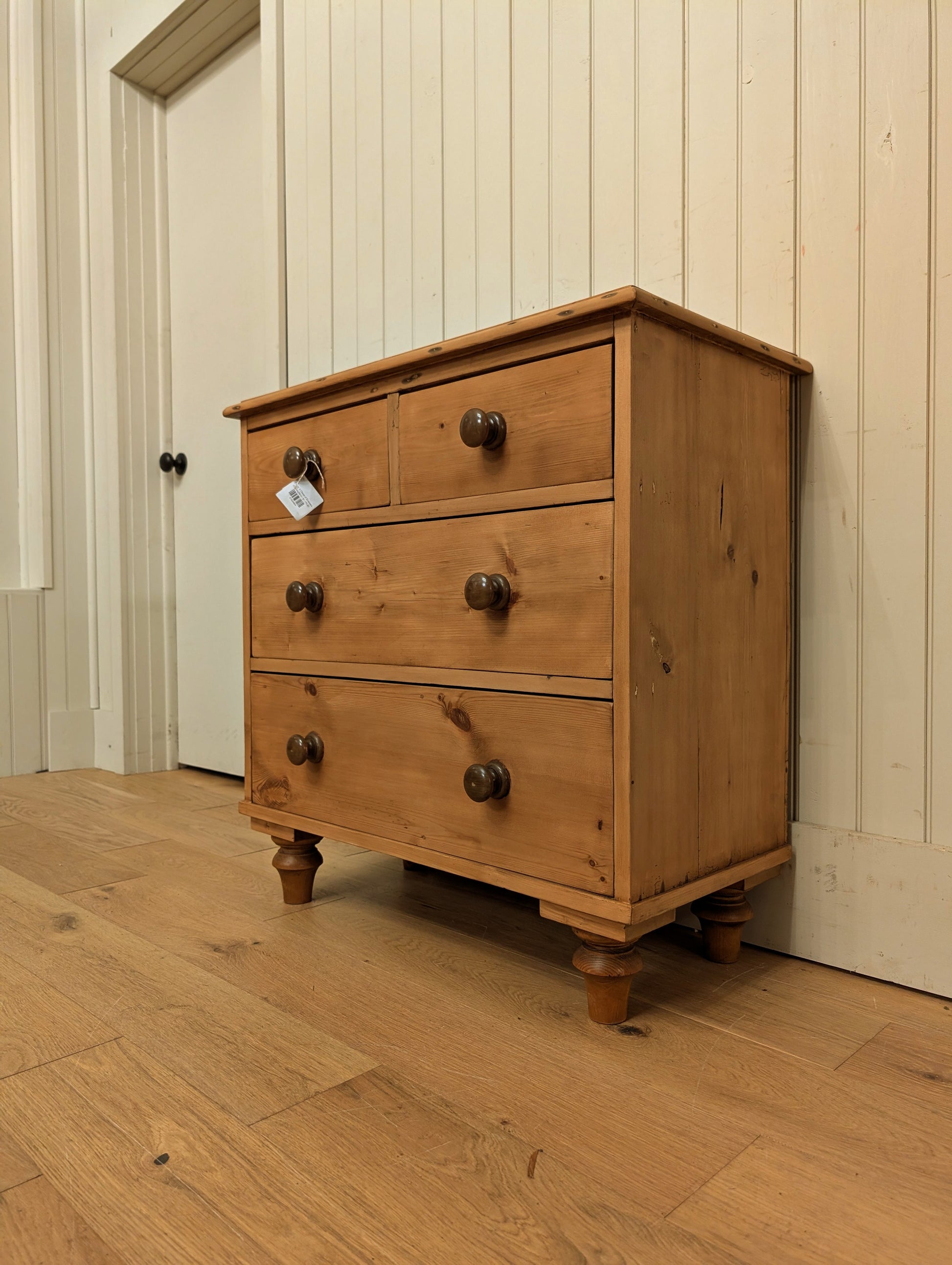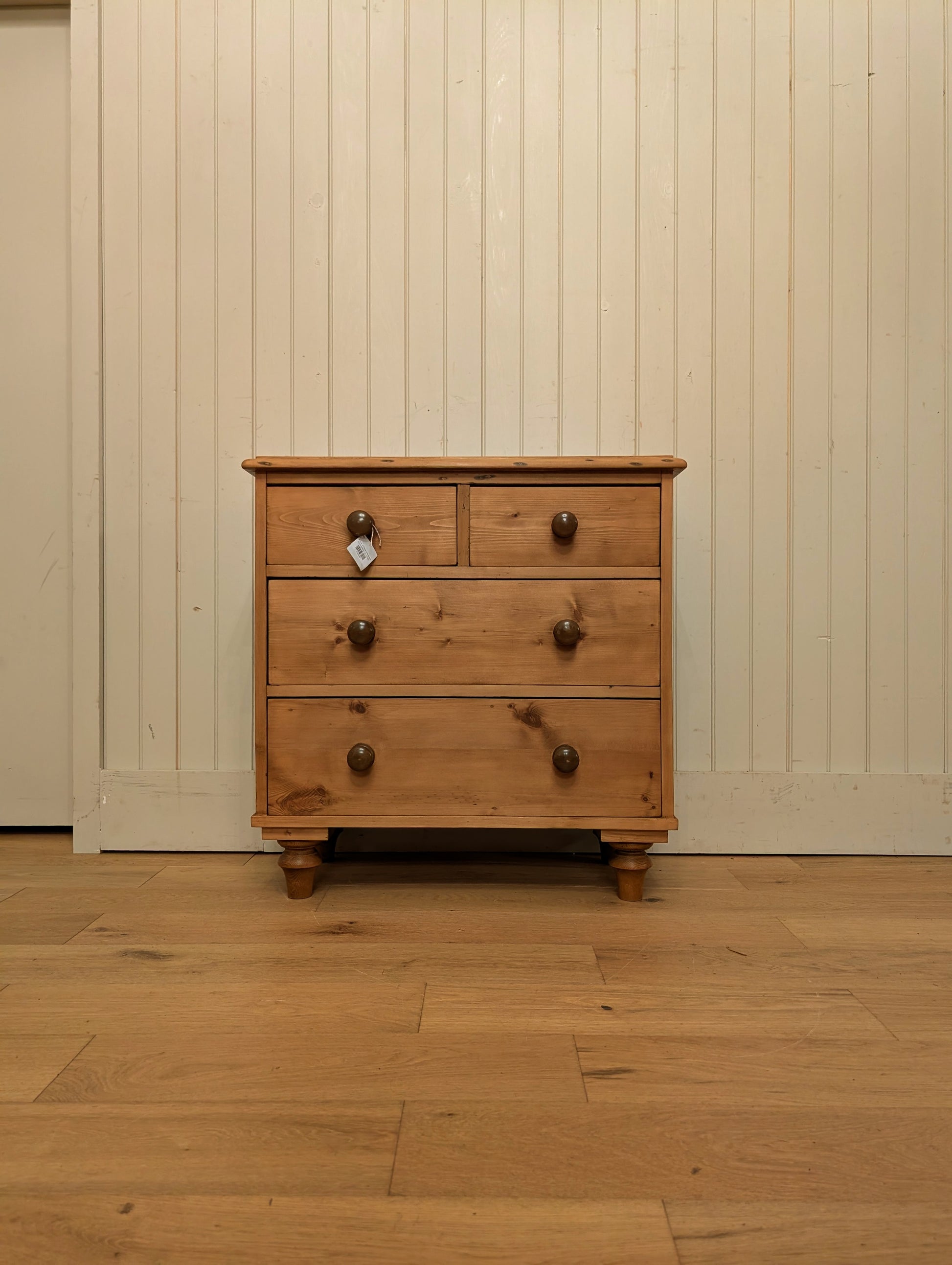 A fully waxed English pine 2 over 2 chest of drawers. All drawers are smooth gliding with hand cut dove tail construction.