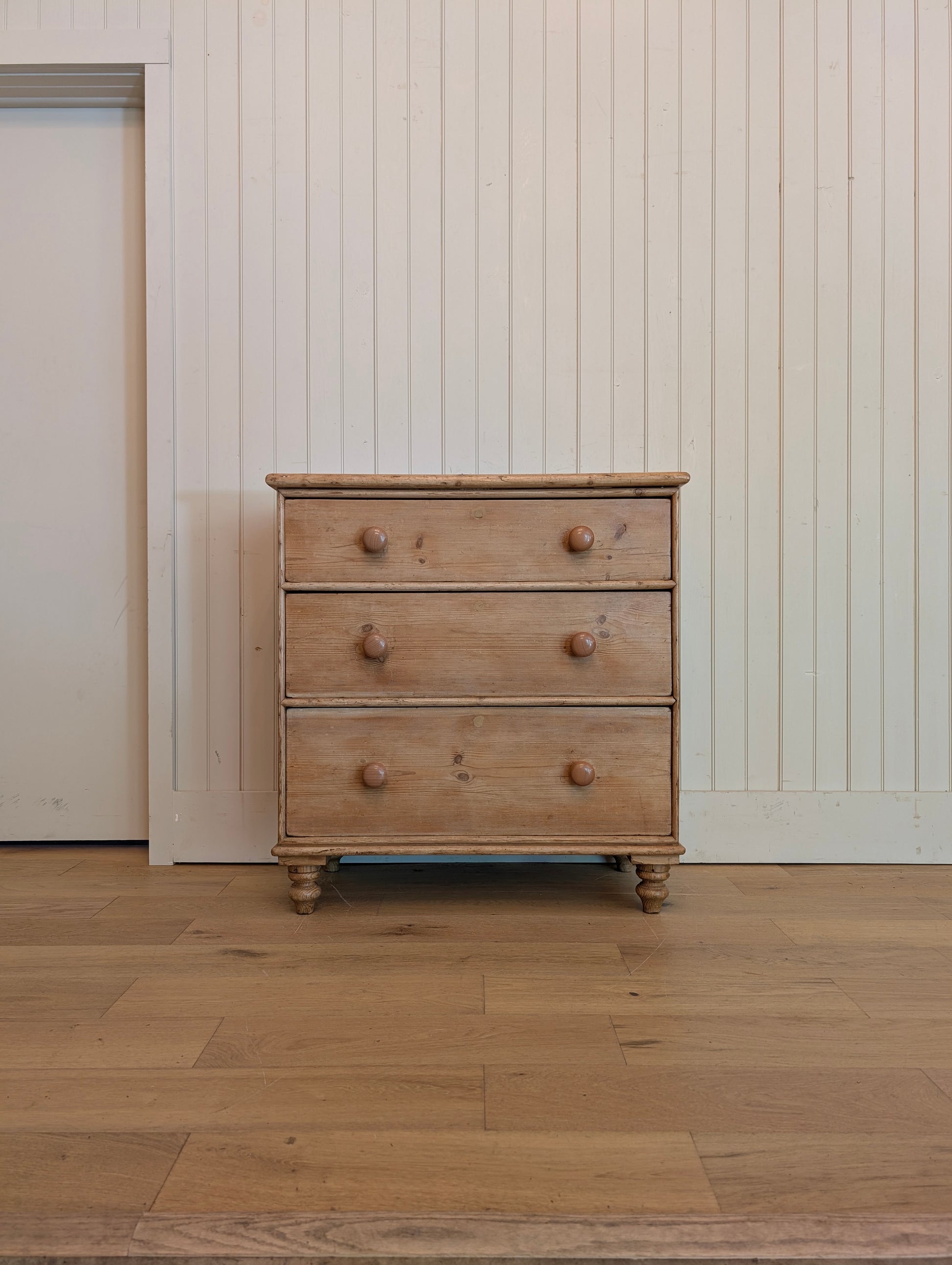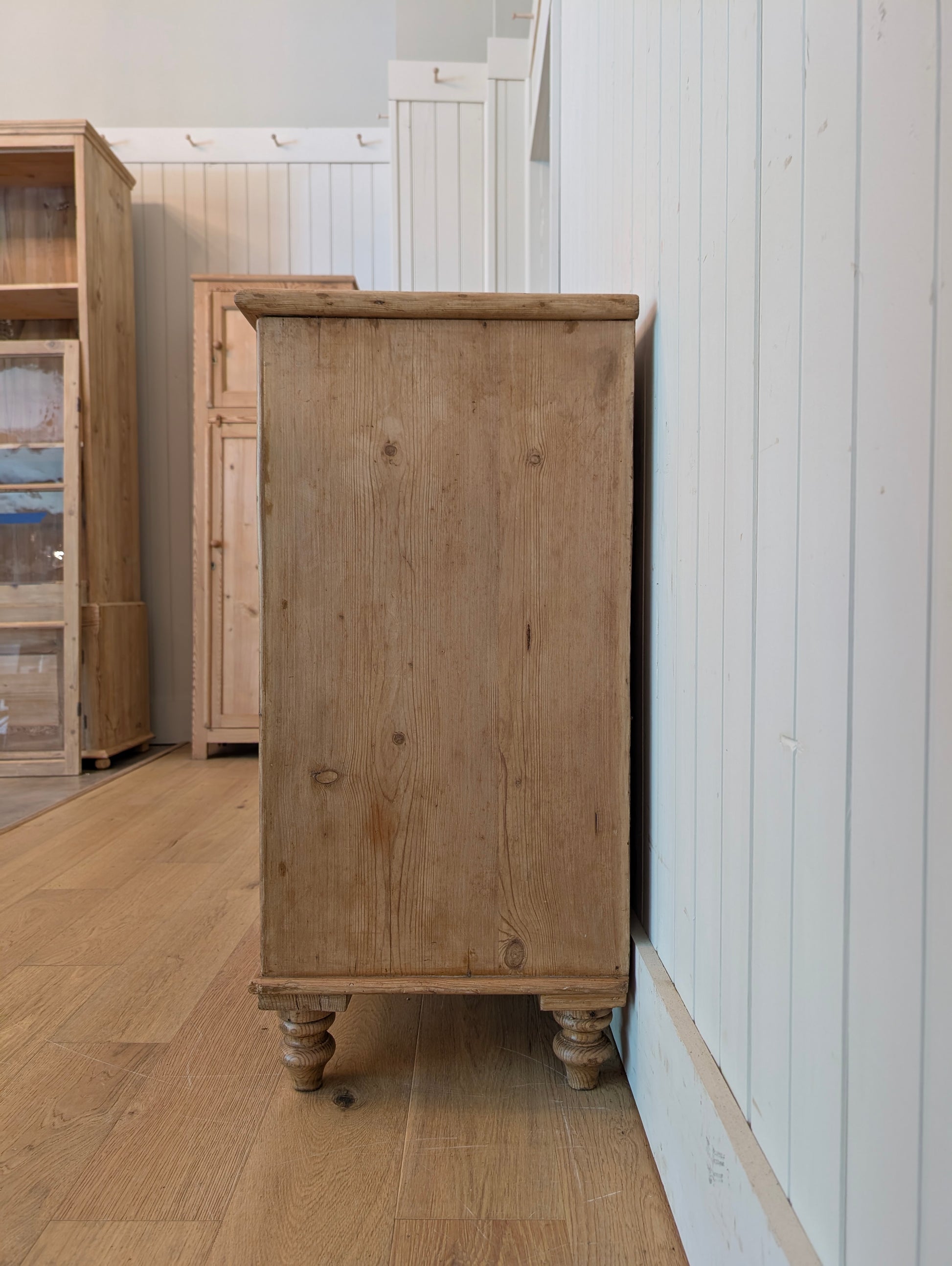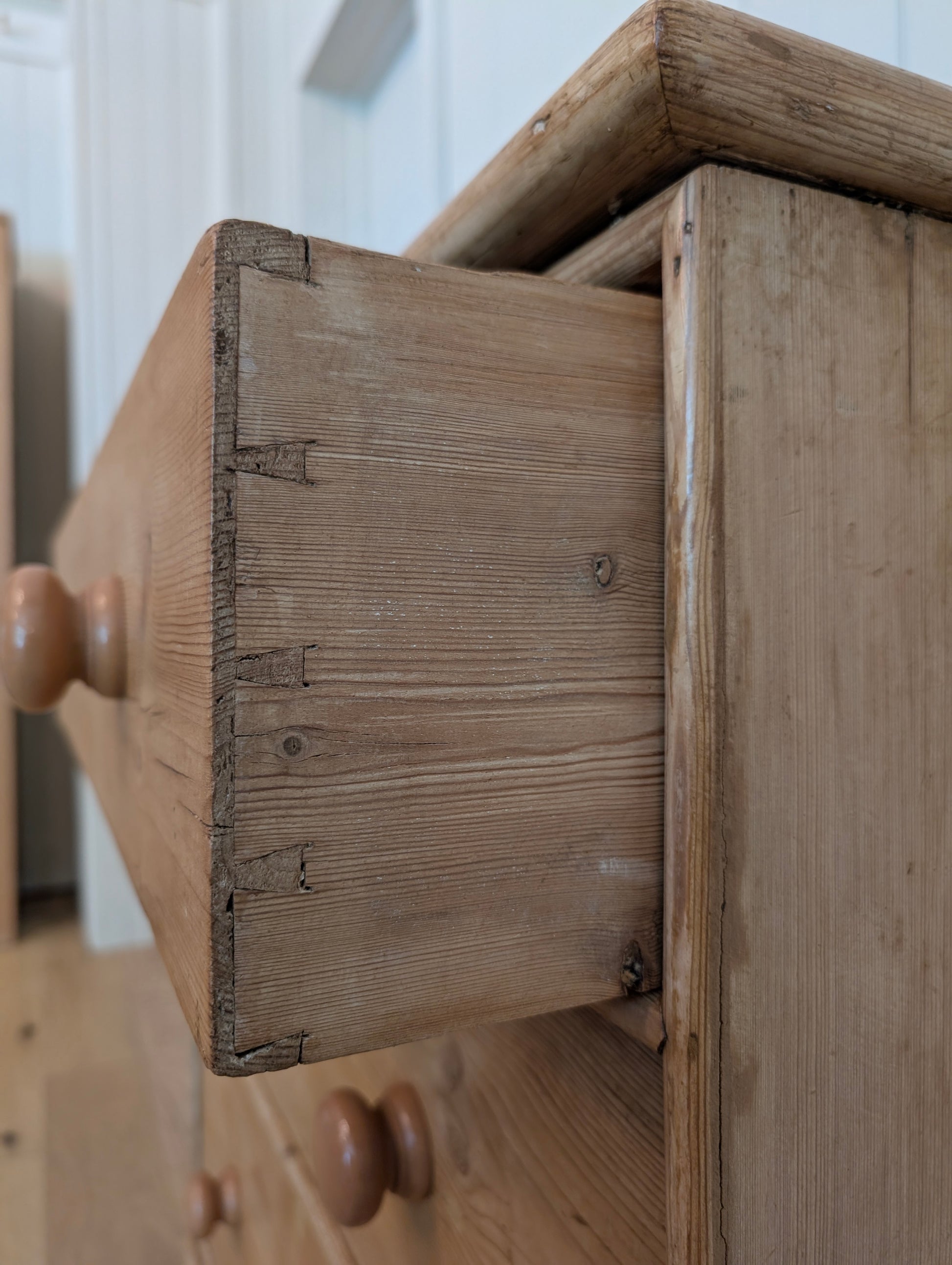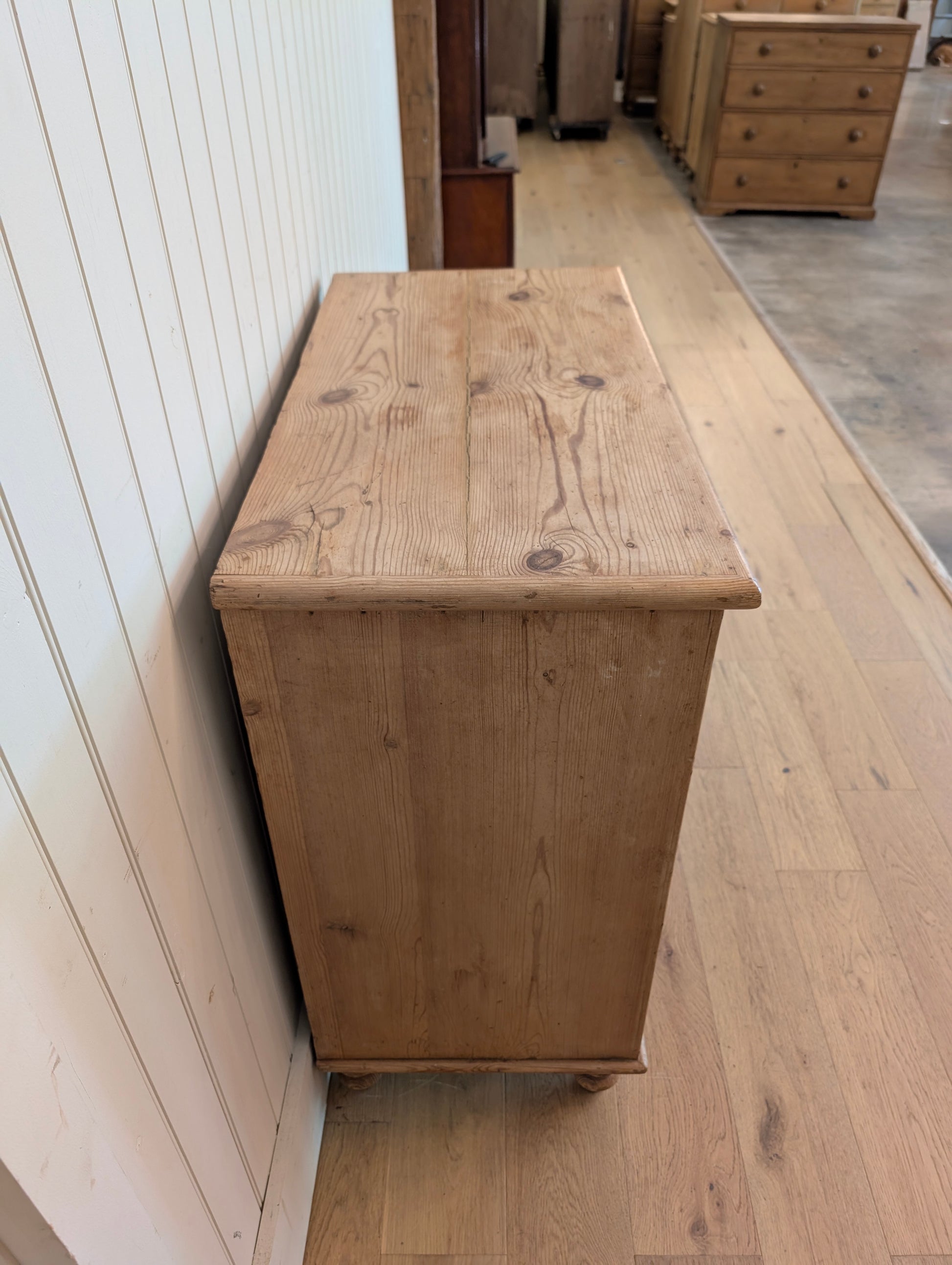 Fully waxed, and near 3 feet wide, this chest reads light in finish. Made of entirely English pine, this chest is an excellent size for the bedroom. We love the consistently light coloring seen on the knobs, feet, and body itself. The drawers are hand cut dovetail construction and glide smoothly. We date this piece to the Victorian era (c.1837-1901).