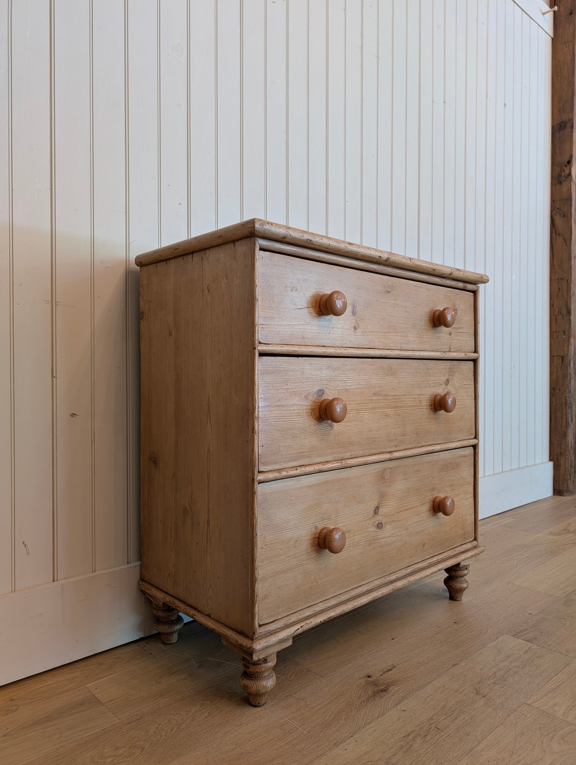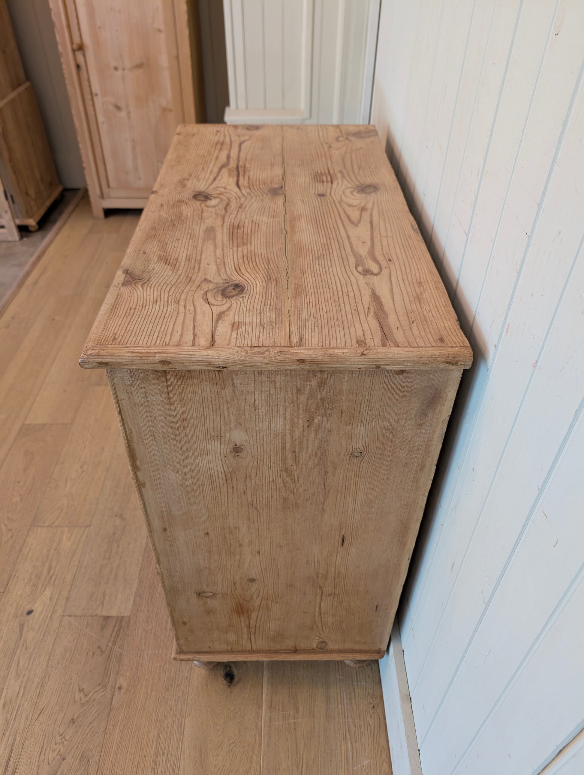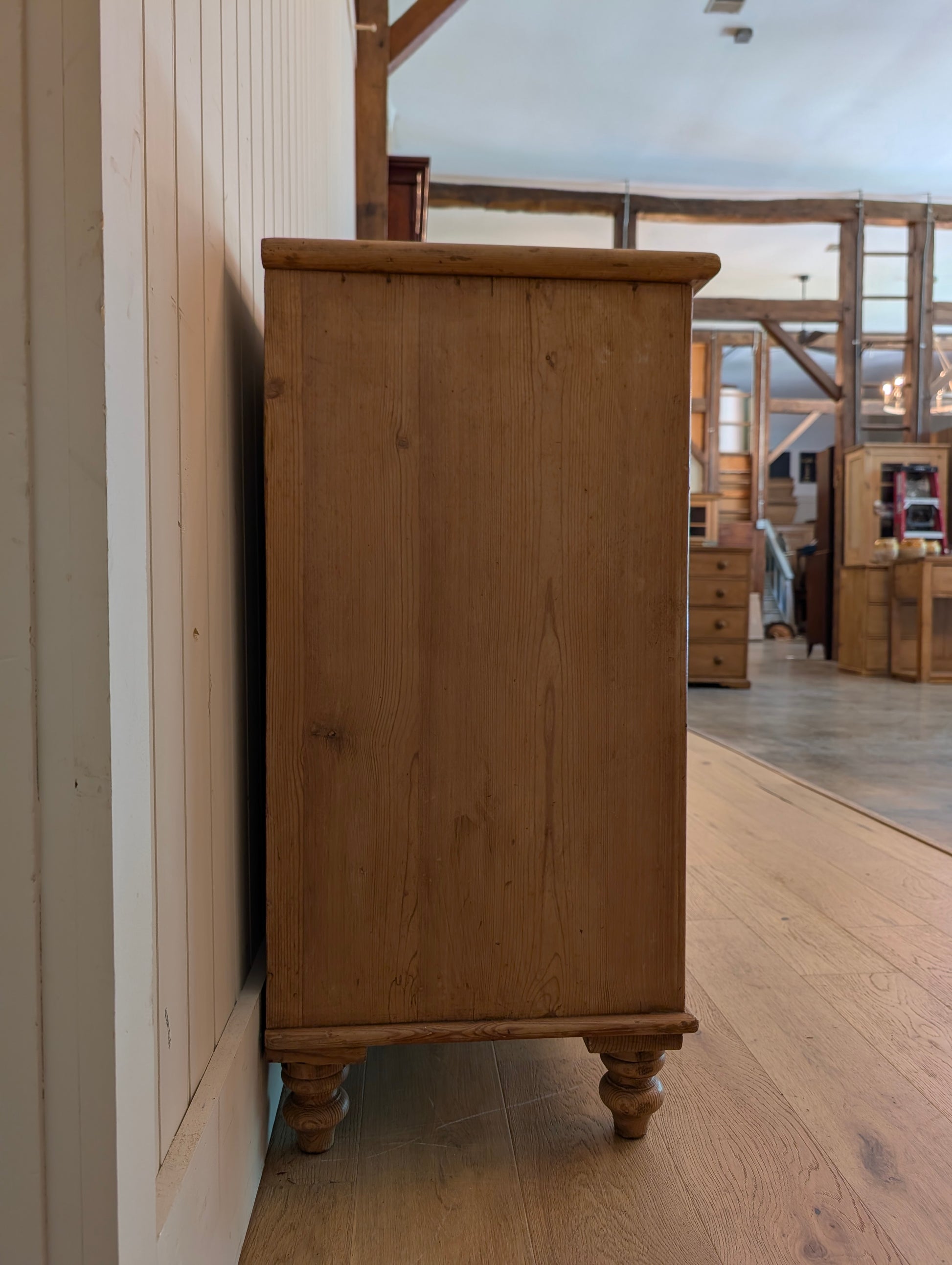 Fully waxed, and near 3 feet wide, this chest reads light in finish. Made of entirely English pine, this chest is an excellent size for the bedroom. We love the consistently light coloring seen on the knobs, feet, and body itself. The drawers are hand cut dovetail construction and glide smoothly. We date this piece to the Victorian era (c.1837-1901).
