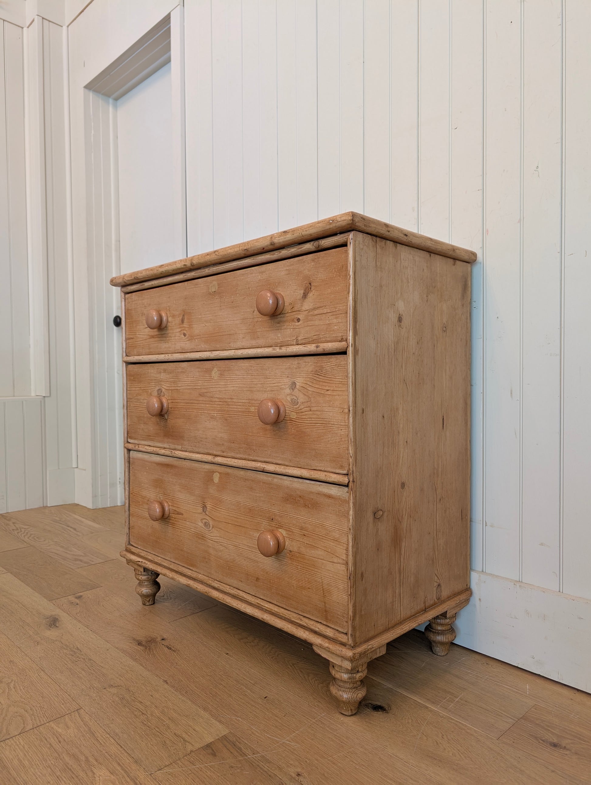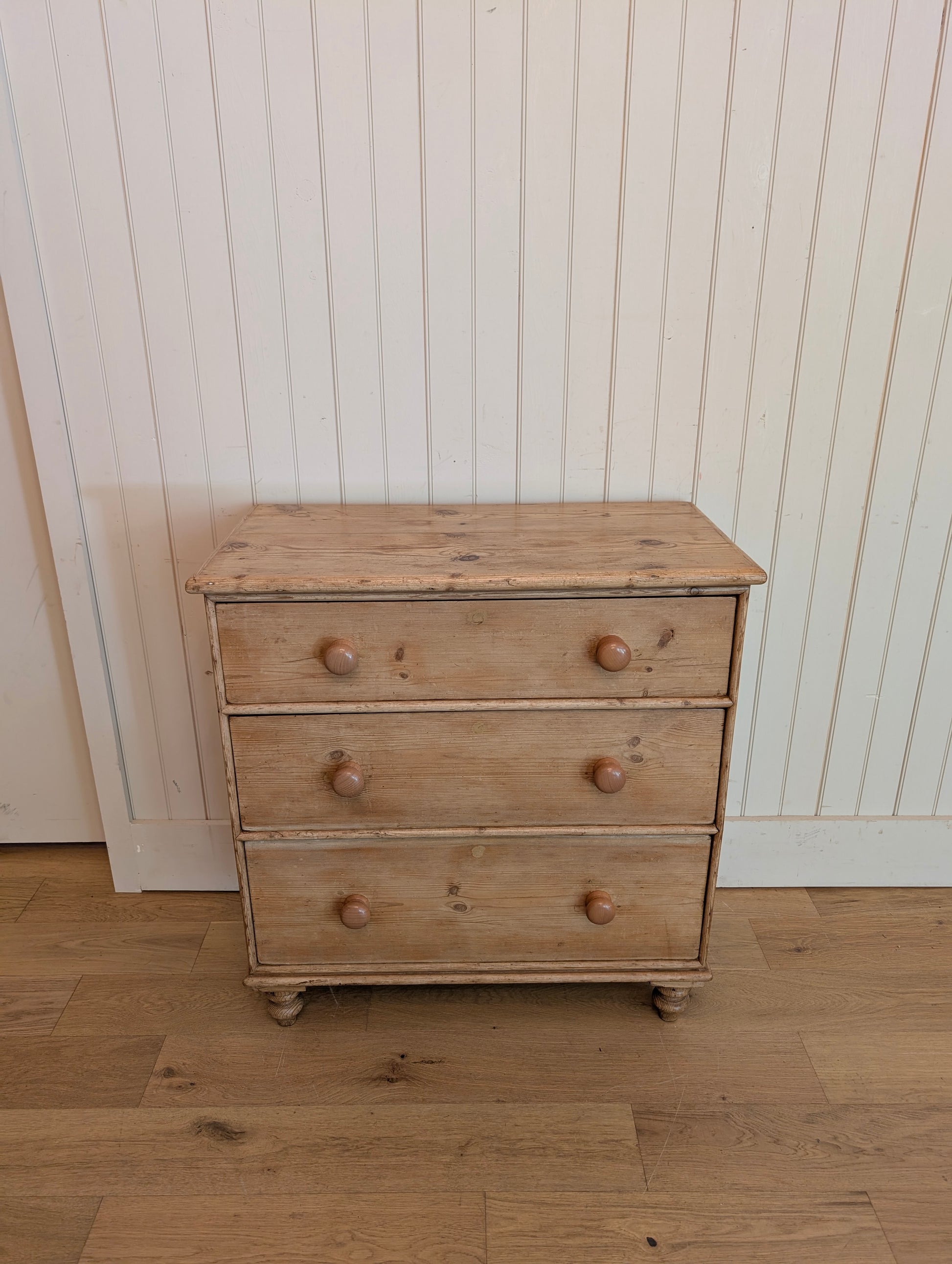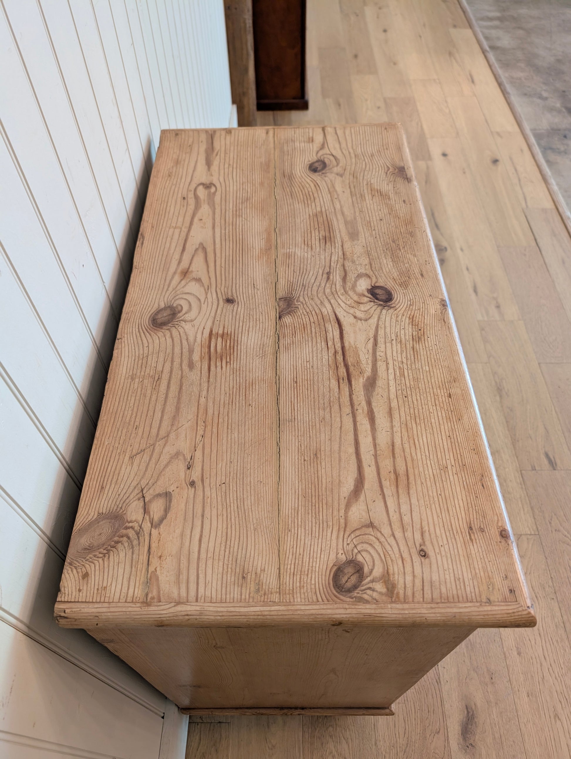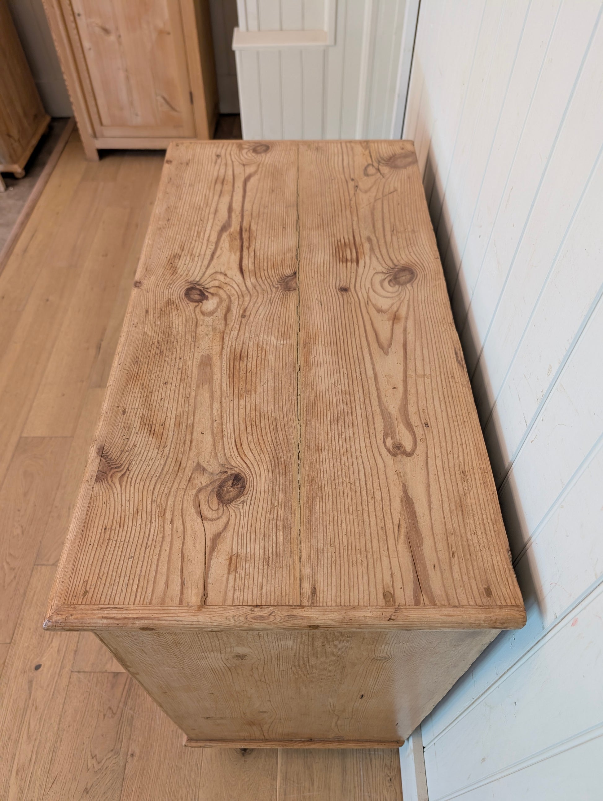 Fully waxed, and near 3 feet wide, this chest reads light in finish. Made of entirely English pine, this chest is an excellent size for the bedroom. We love the consistently light coloring seen on the knobs, feet, and body itself. The drawers are hand cut dovetail construction and glide smoothly. We date this piece to the Victorian era (c.1837-1901).