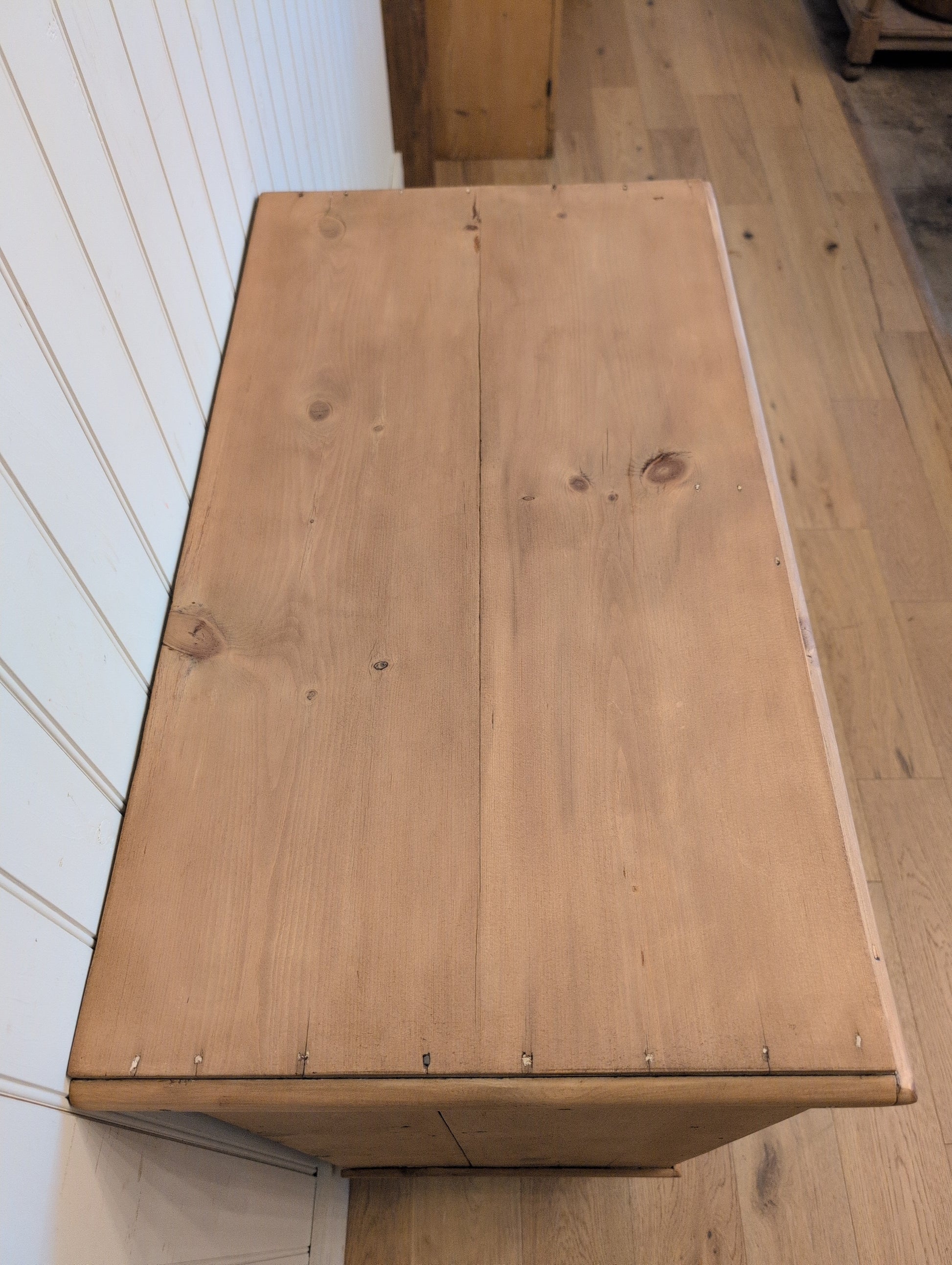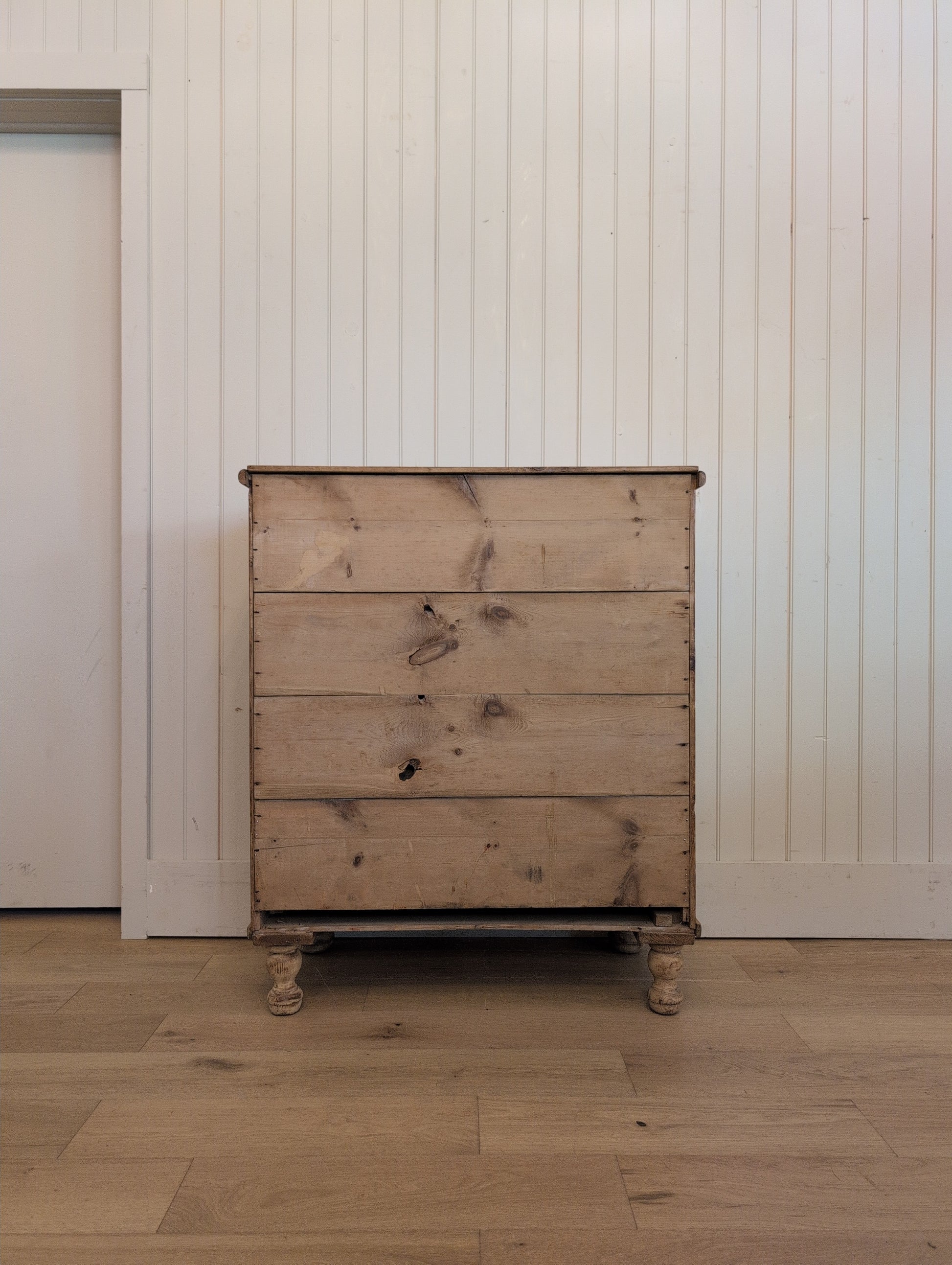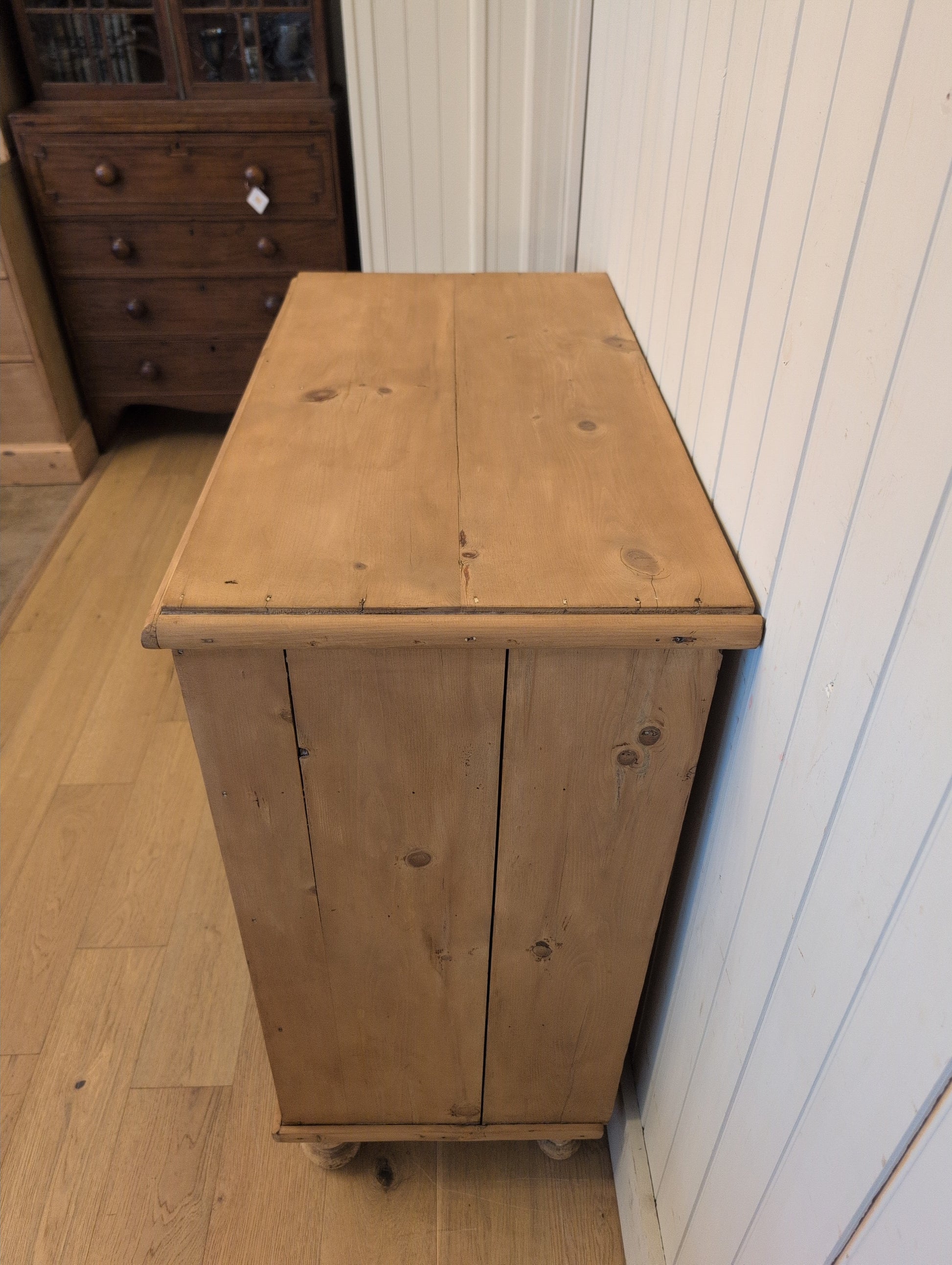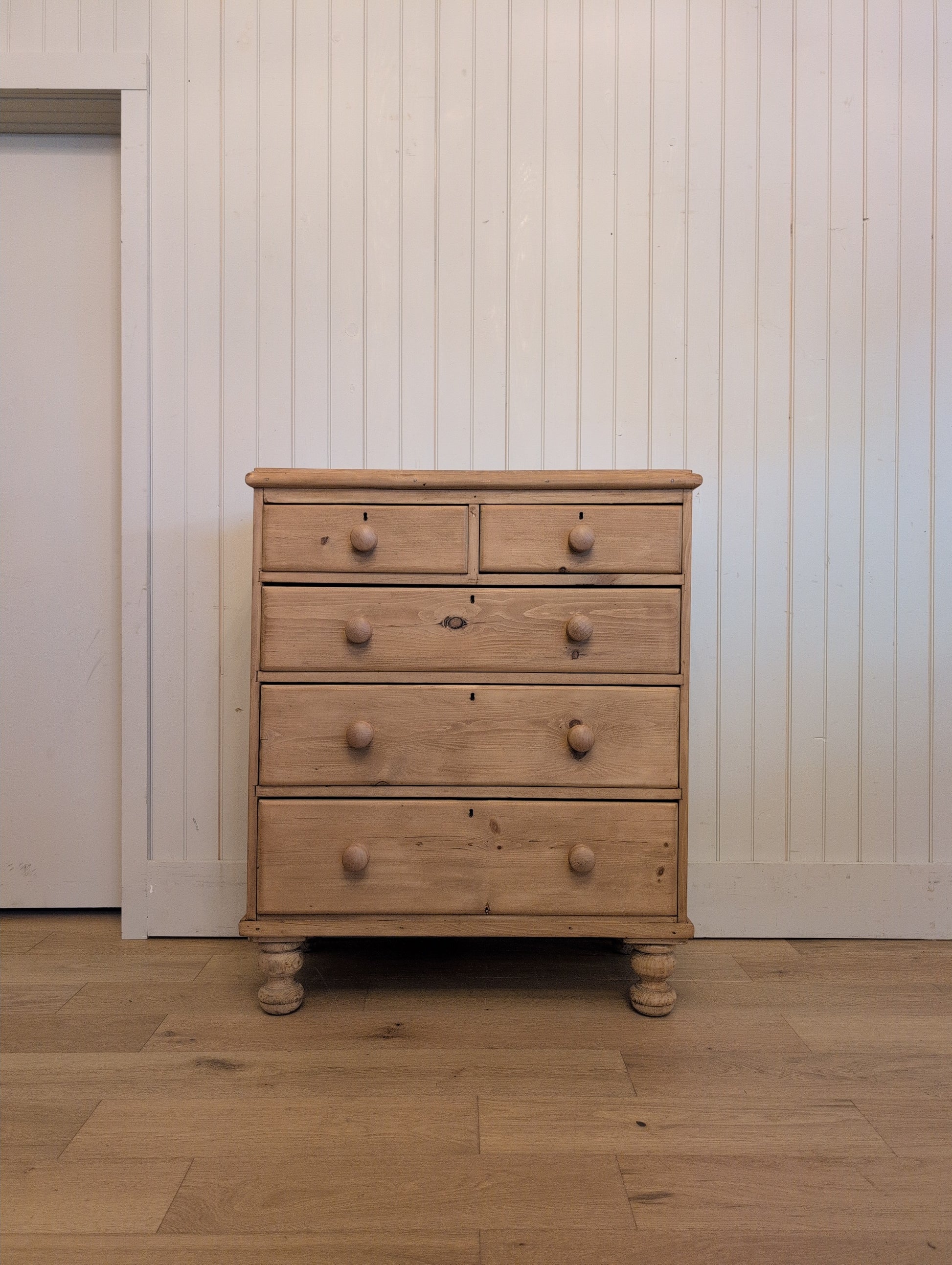A nicely sized 2 over 3 English pine chest of drawers. At just shy of 3 feet wide, we appreciate the narrow size of this one. The finish is fully waxed and has a medium brown hue. The drawers are smooth gliding hand cut dovetail construction.