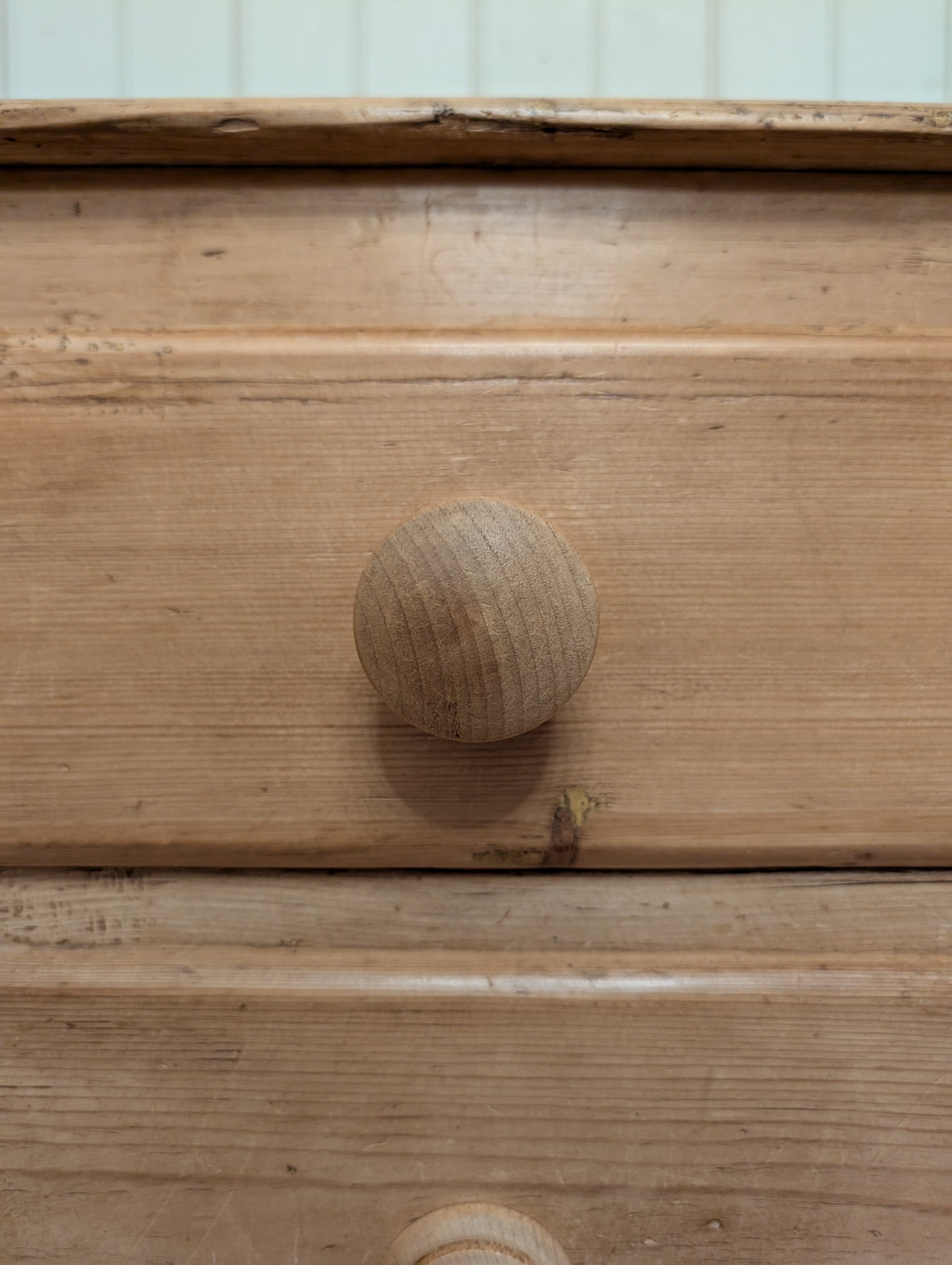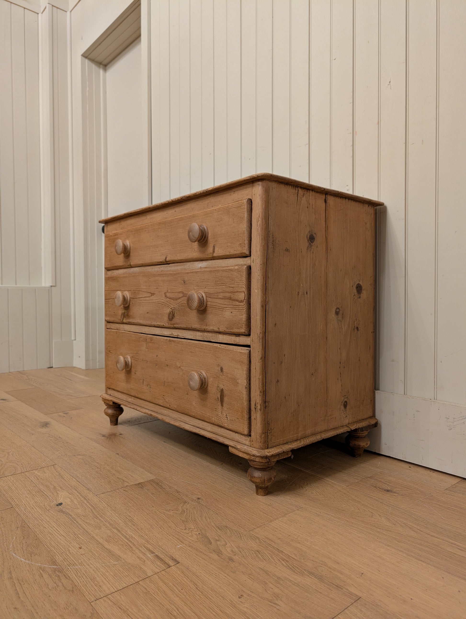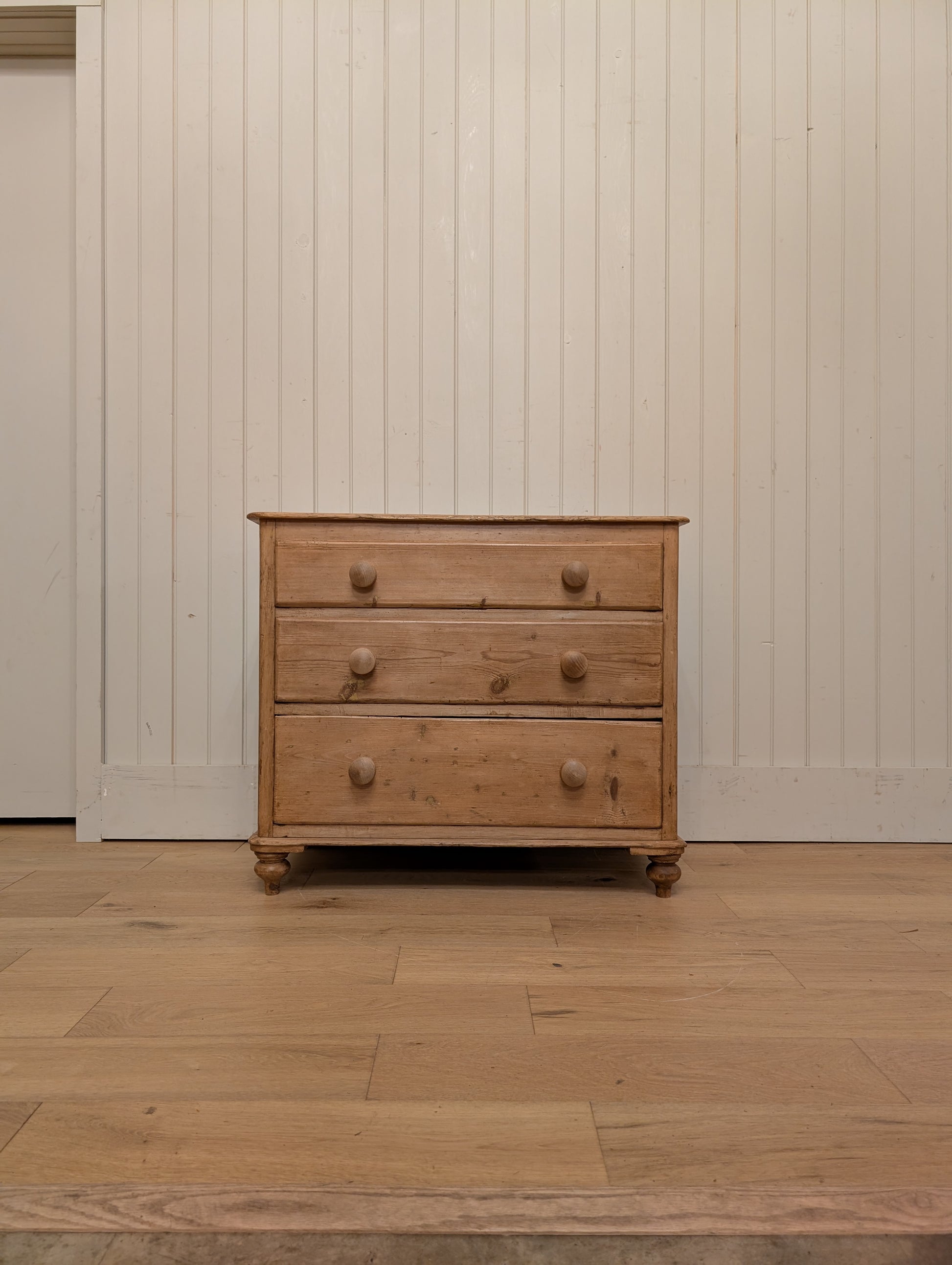 A sweet little 3 drawer English pine chest. Perfect as a night stand or in the kiddos room, this chest is fully waxed. We love the quaint size of it, wooden hardware, and traditional bun feet. The drawers are hand cut dovetails and smooth gliding. Please note the minor chip on the top of the bottom drawer.