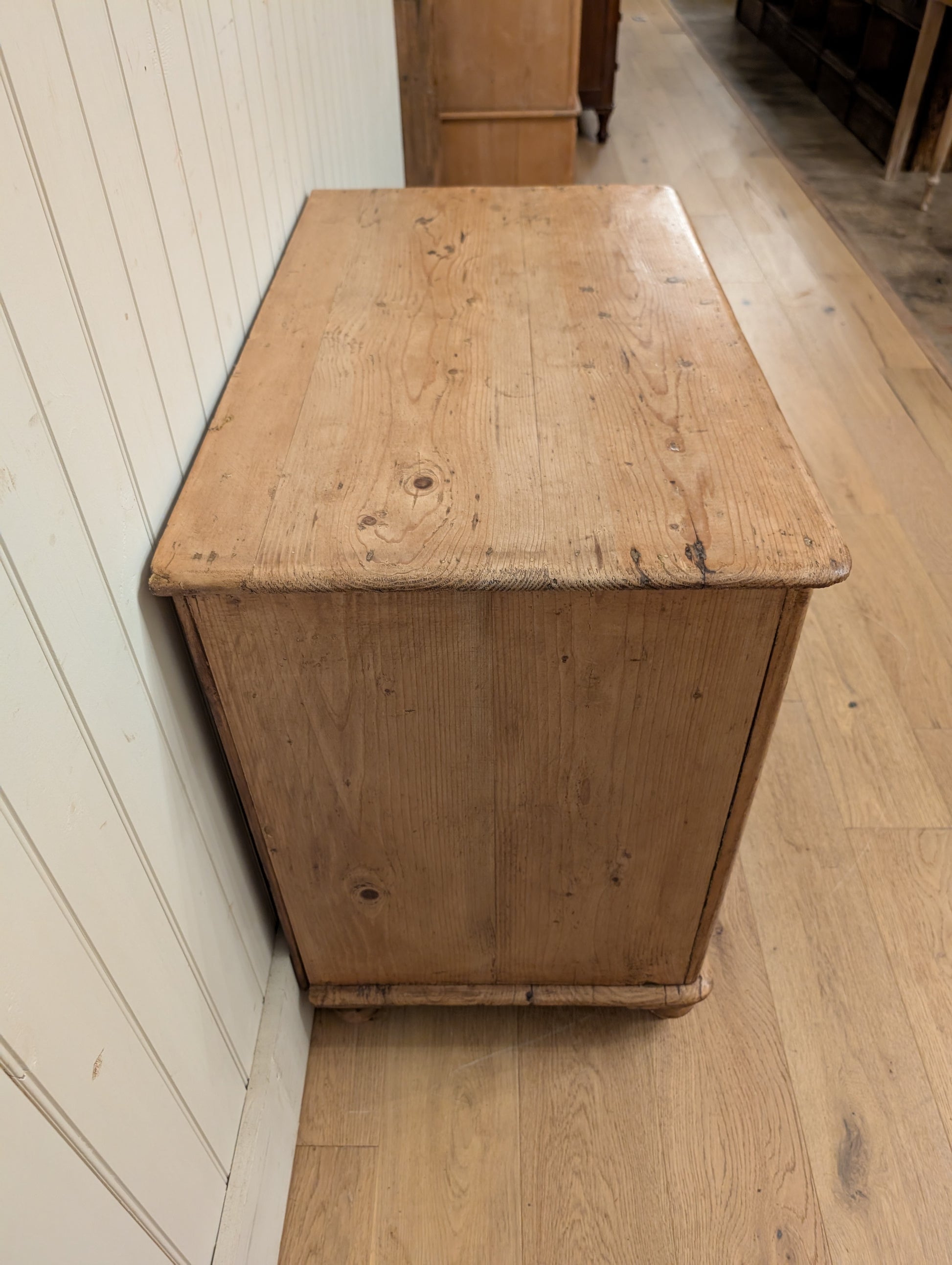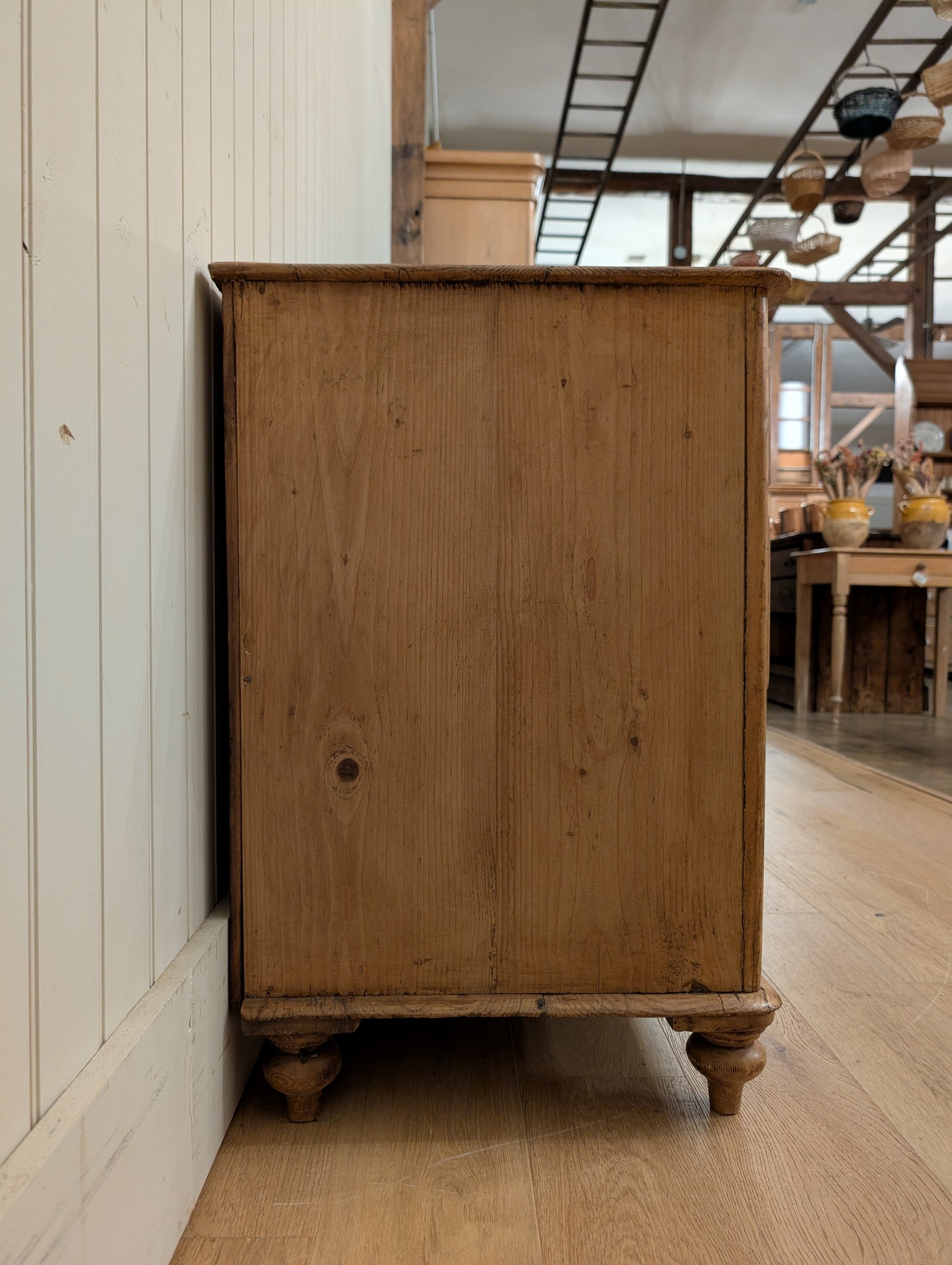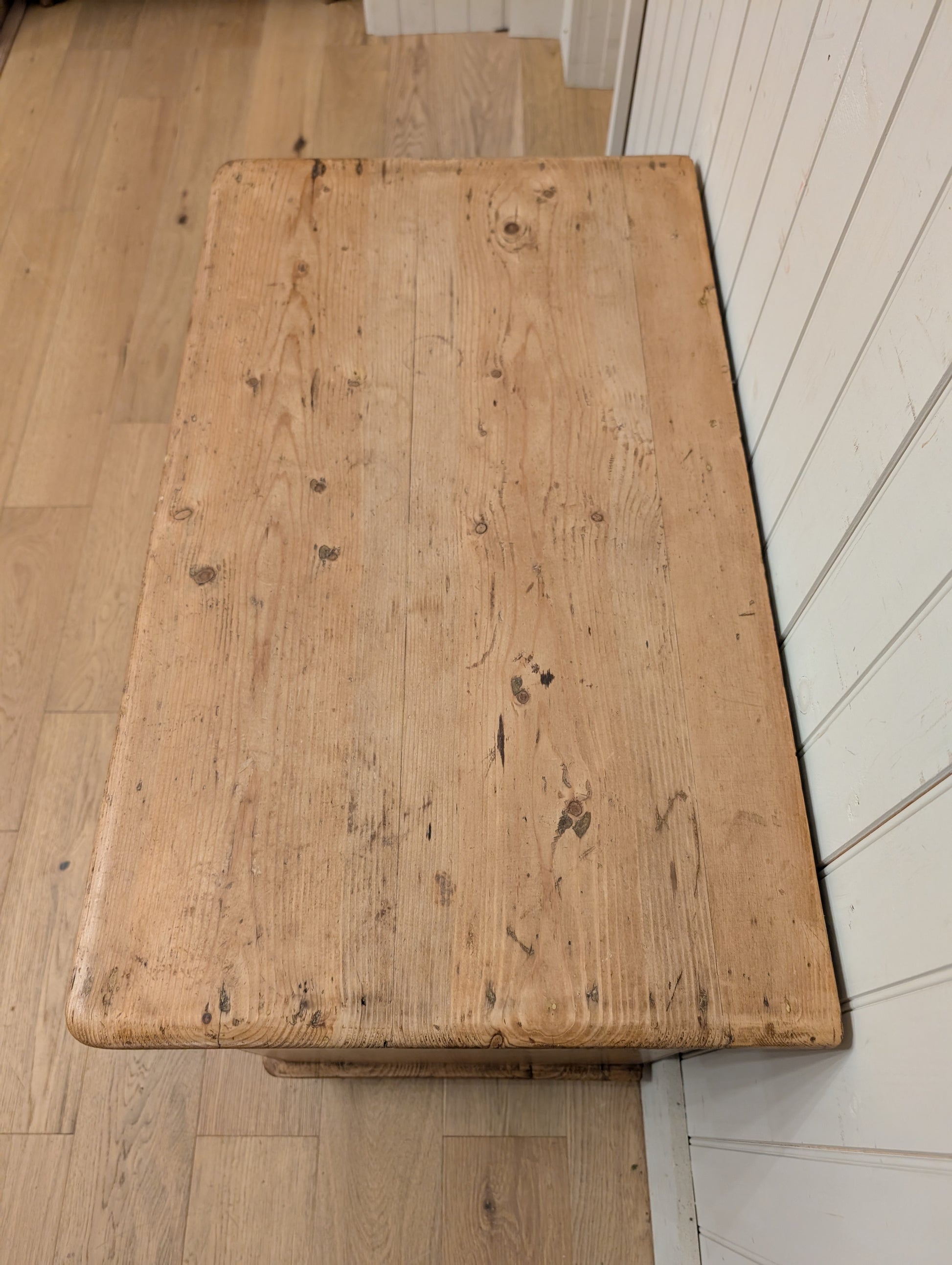 A sweet little 3 drawer English pine chest. Perfect as a night stand or in the kiddos room, this chest is fully waxed. We love the quaint size of it, wooden hardware, and traditional bun feet. The drawers are hand cut dovetails and smooth gliding. Please note the minor chip on the top of the bottom drawer.