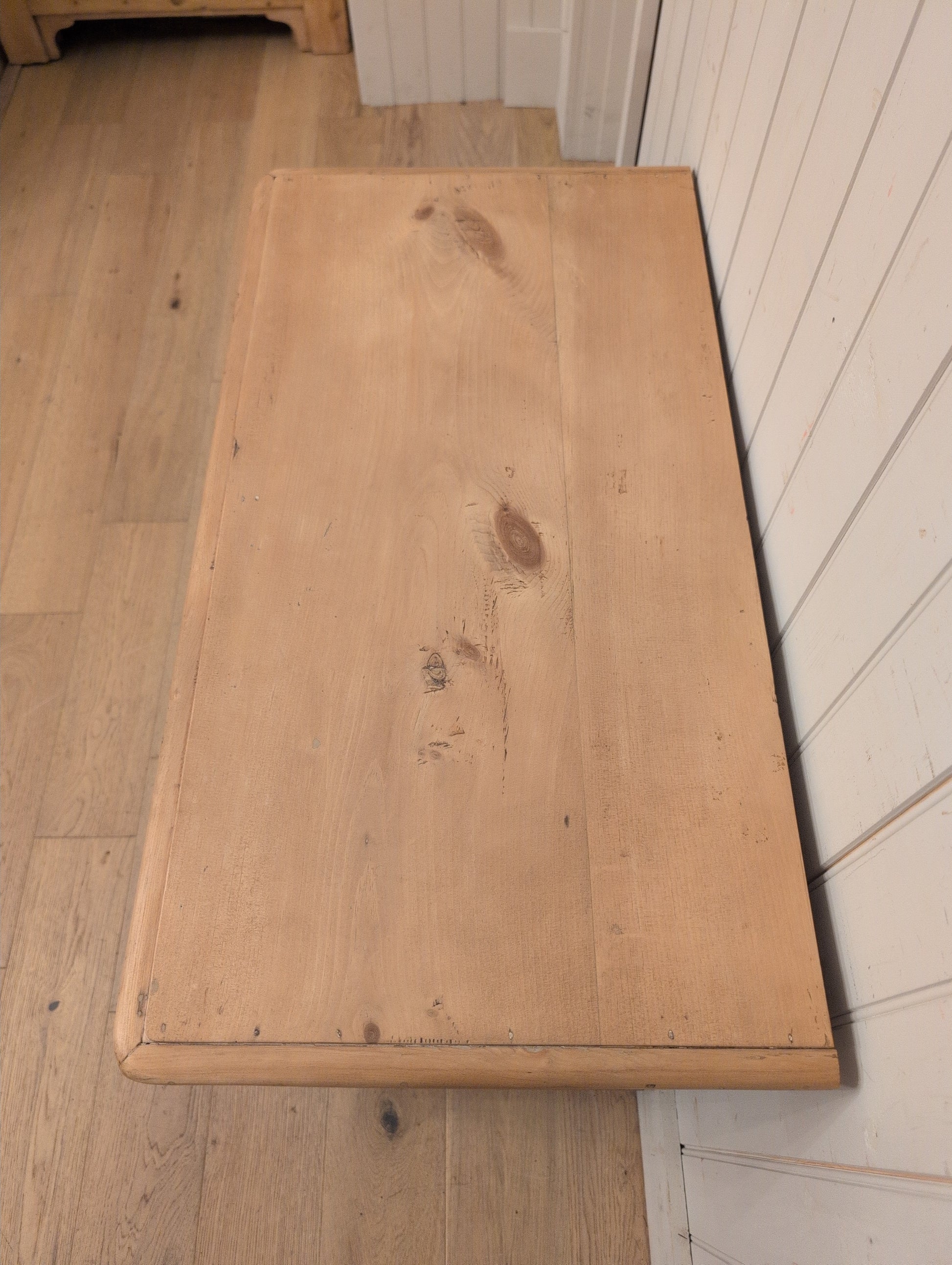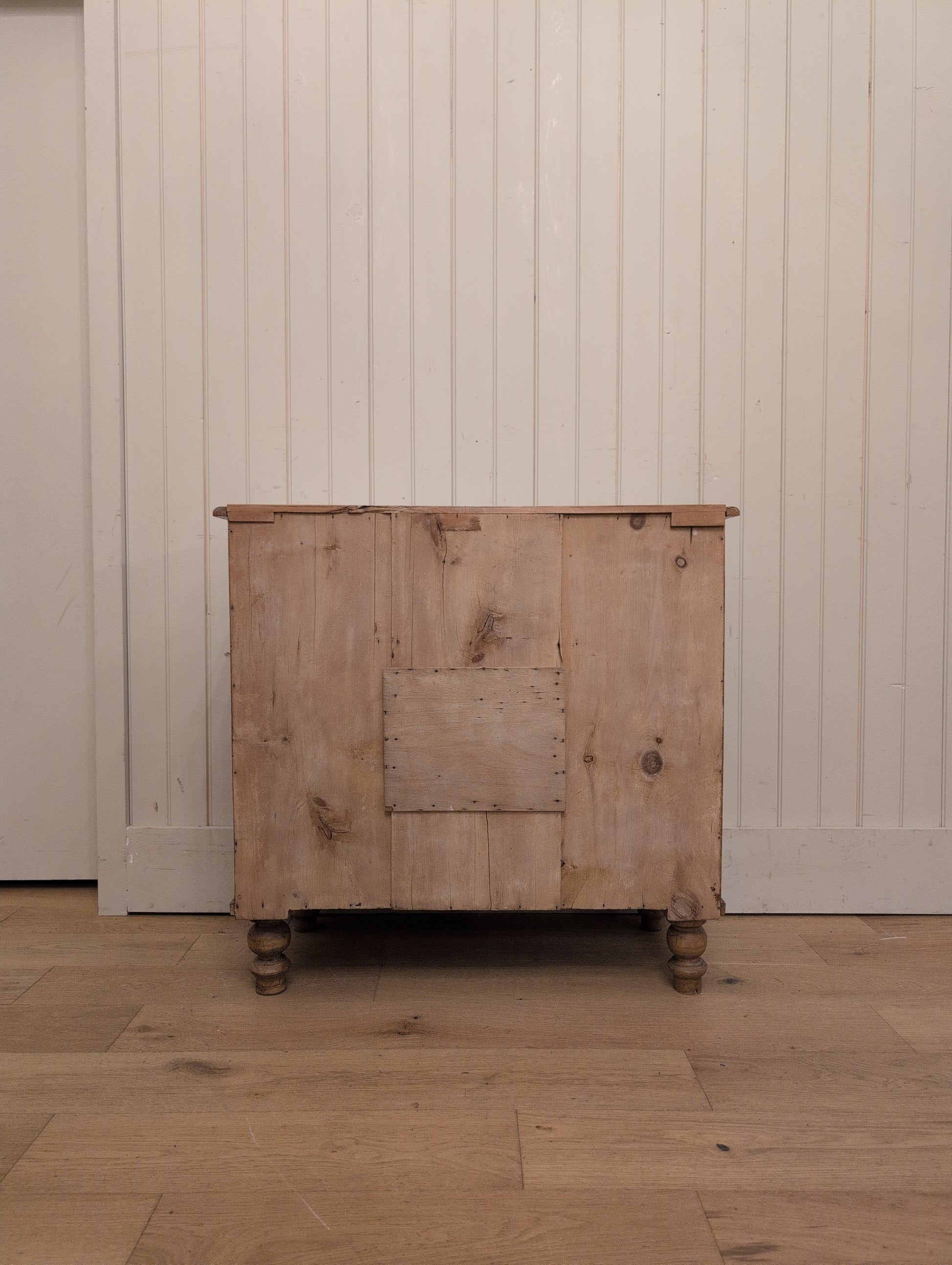A nicely proportioned 2 over 2 English pine chest of drawers. We love the near perfect square size of this chest, making it visually pleasing to the eye. This chest is fully waxed with wooden knob hardware, making it very traditional in English style. The drawers are hand cut dovetail and smooth gliding.