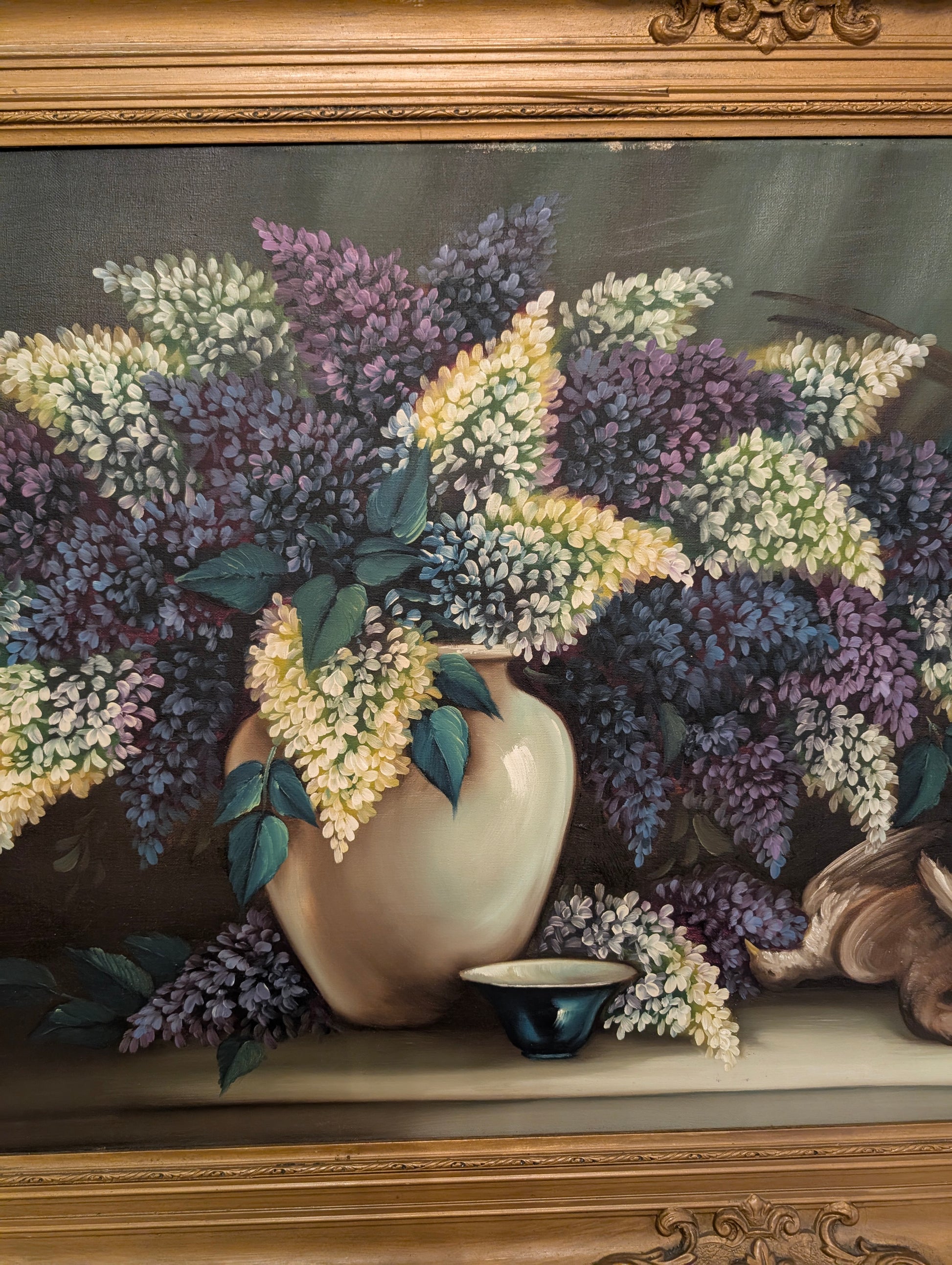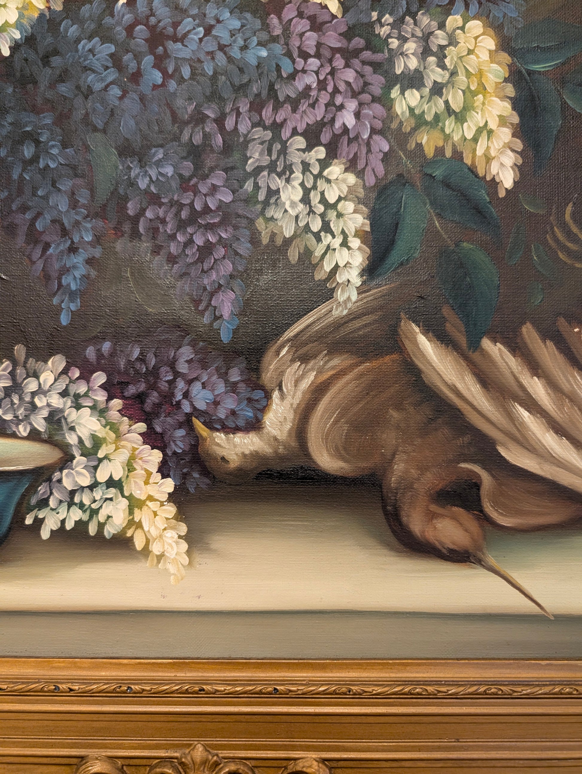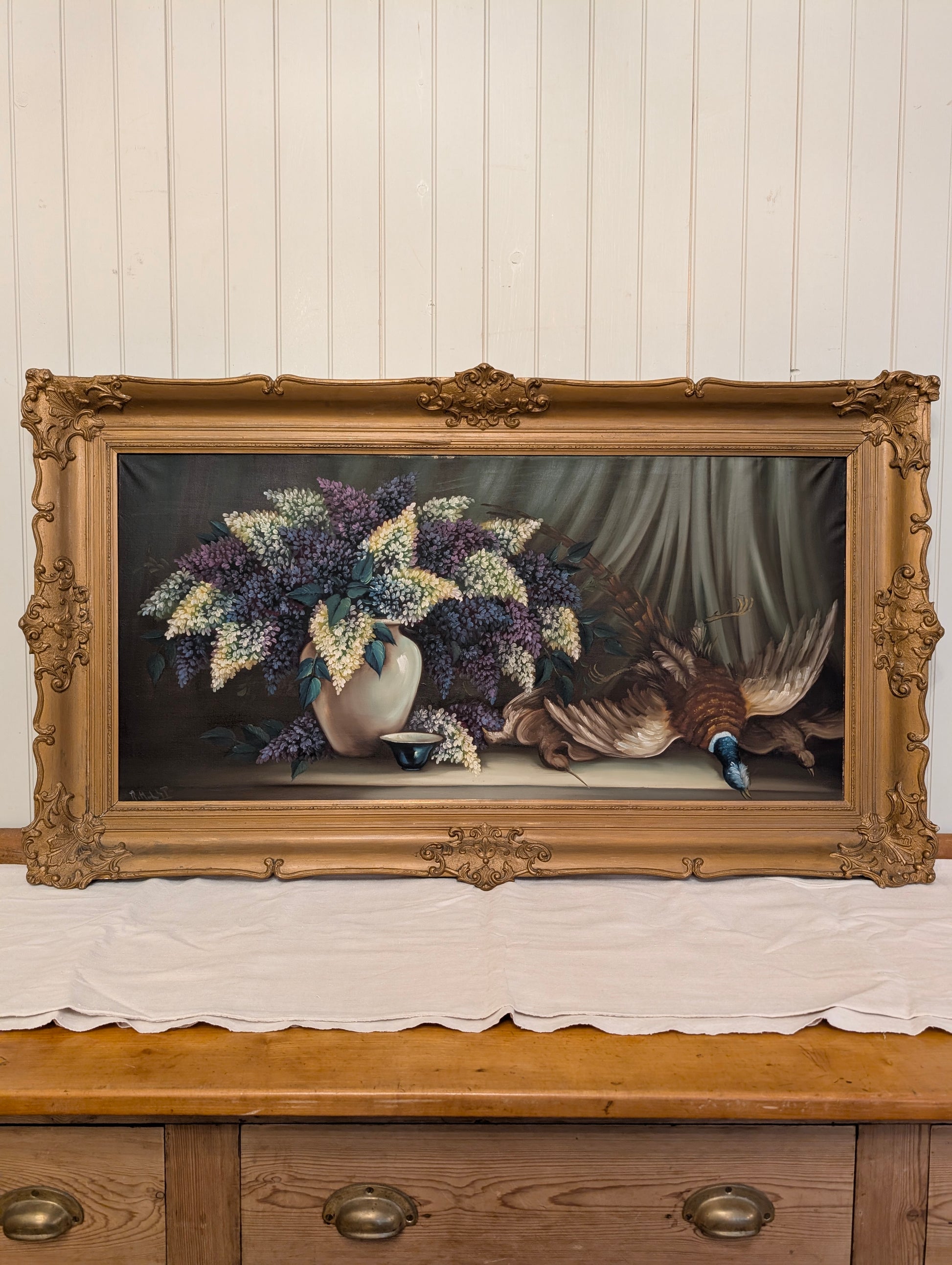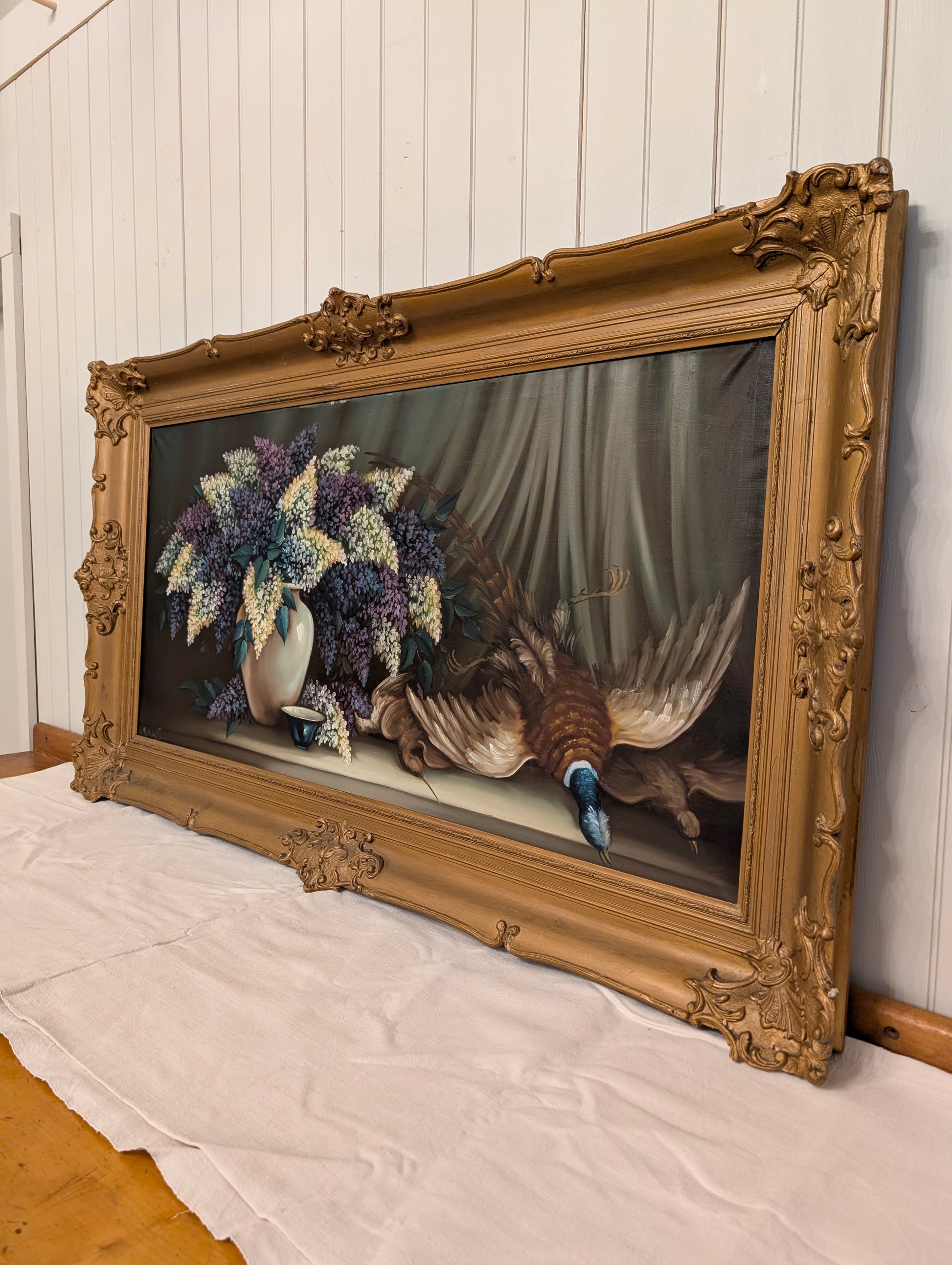 An impressively large framed oil on canvas, pheasant and lilac scene. The bouquet of lilacs are deep navy, purple, and cream in color. The painting is signed in the bottom left. Please note there is a small 1" tear in the lilac bouquet, as picture in photos 14, 15, 17, 19. There is also an older tear on the pheasant, which has been repaired (photo 16,18,19).