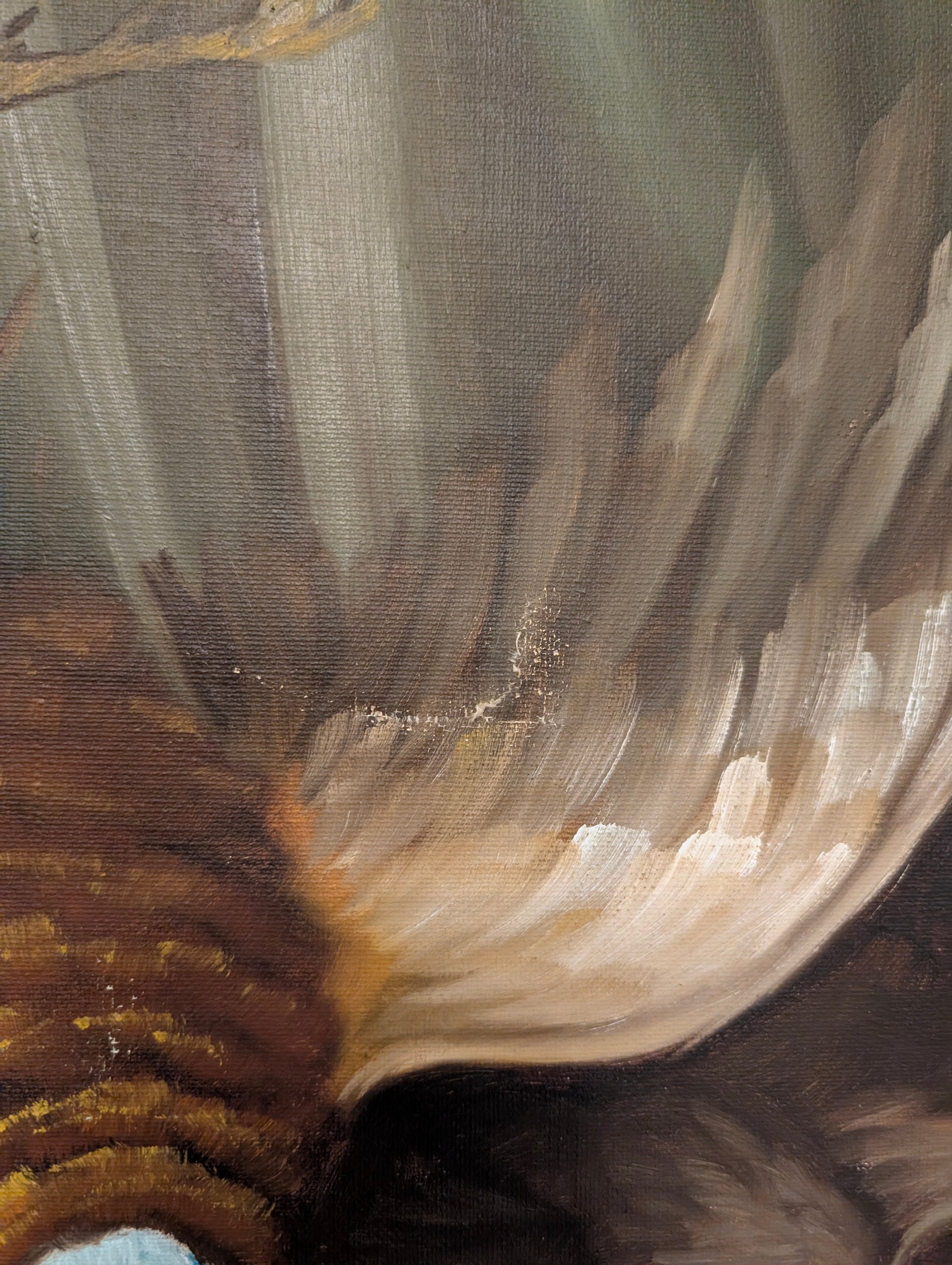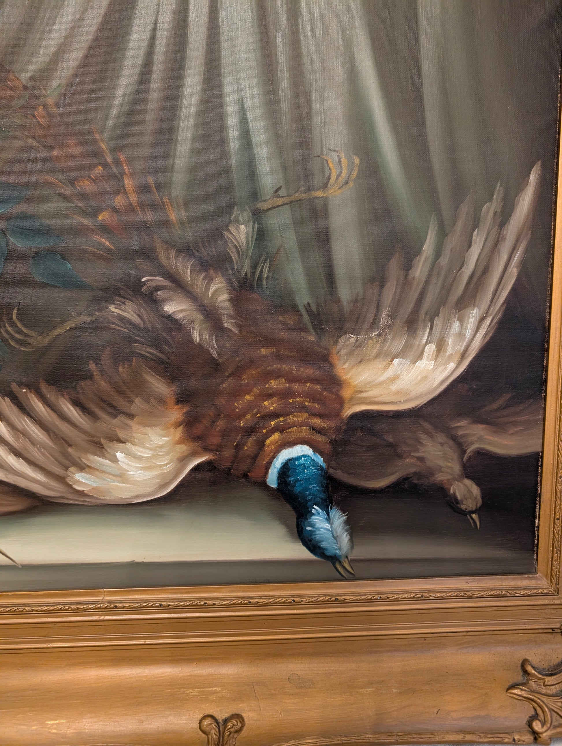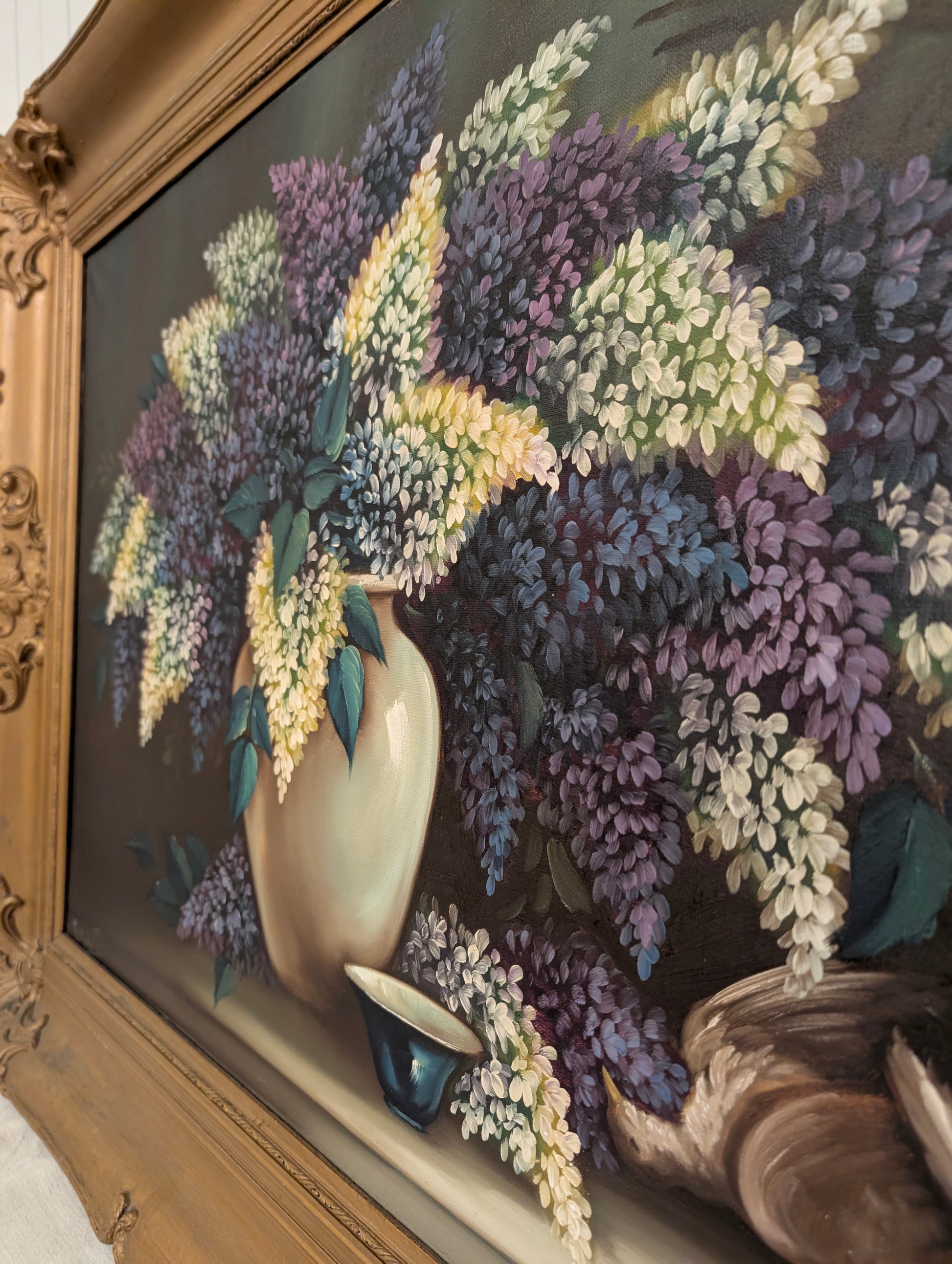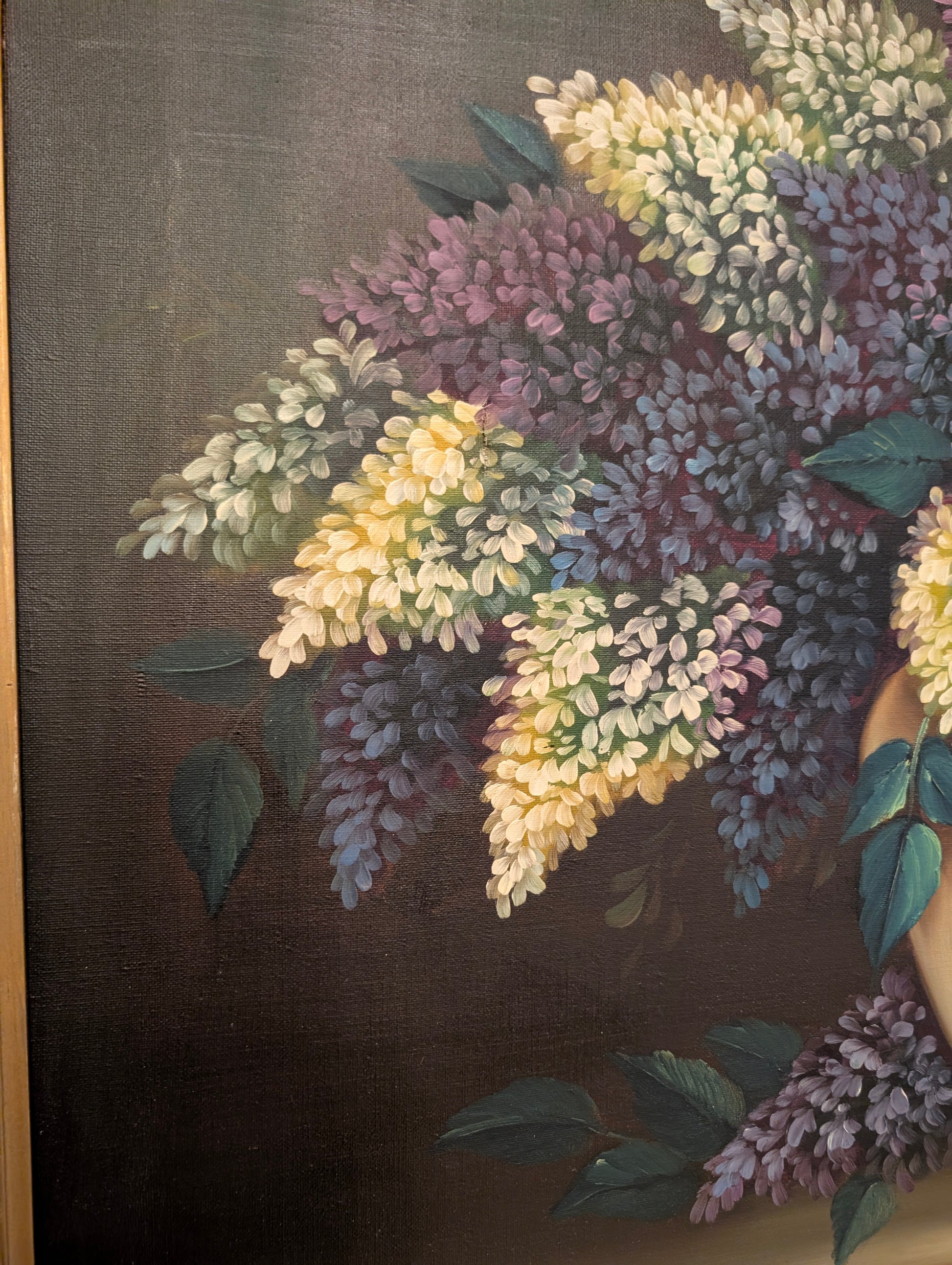 An impressively large framed oil on canvas, pheasant and lilac scene. The bouquet of lilacs are deep navy, purple, and cream in color. The painting is signed in the bottom left. Please note there is a small 1" tear in the lilac bouquet, as picture in photos 14, 15, 17, 19. There is also an older tear on the pheasant, which has been repaired (photo 16,18,19).