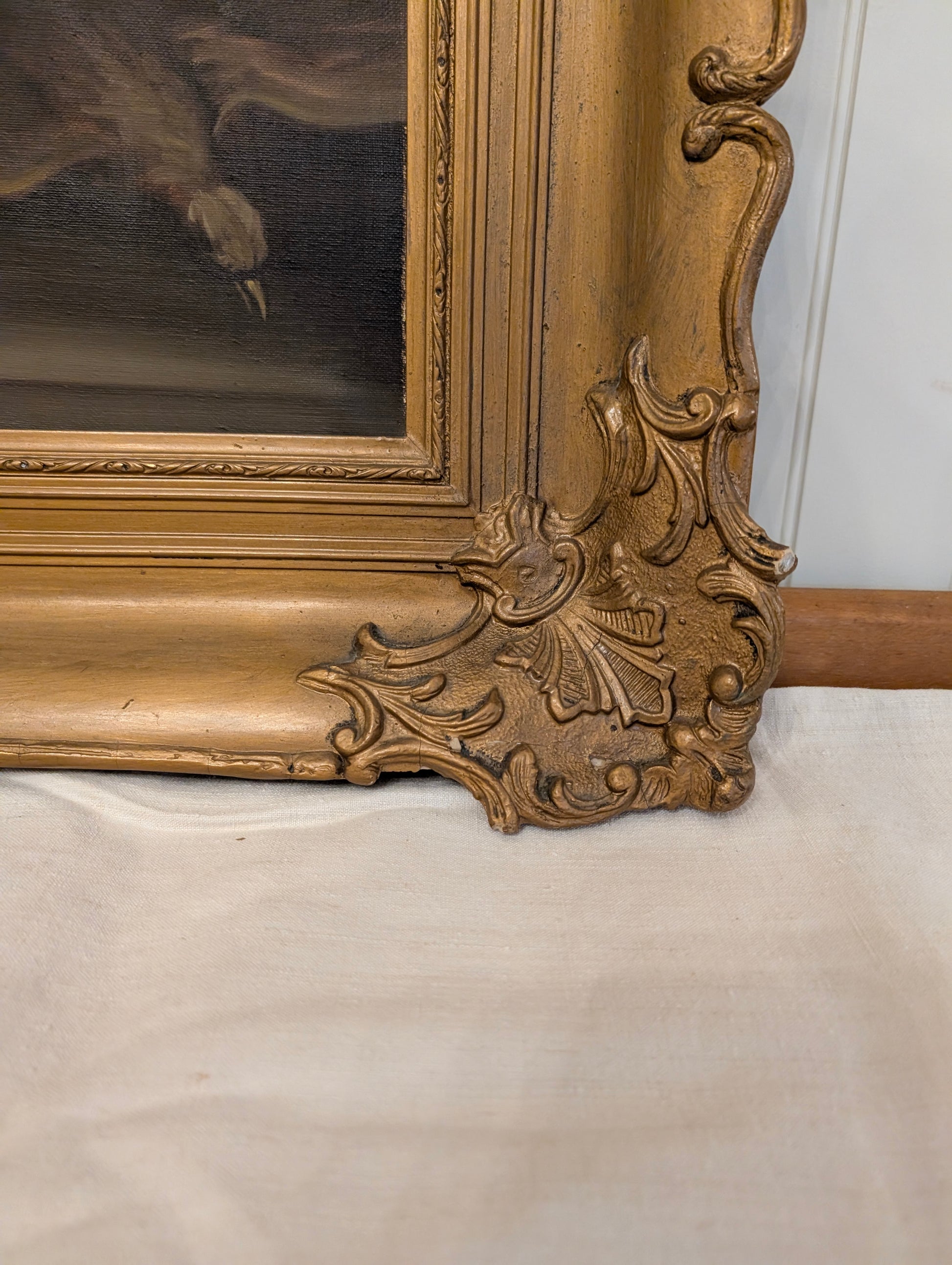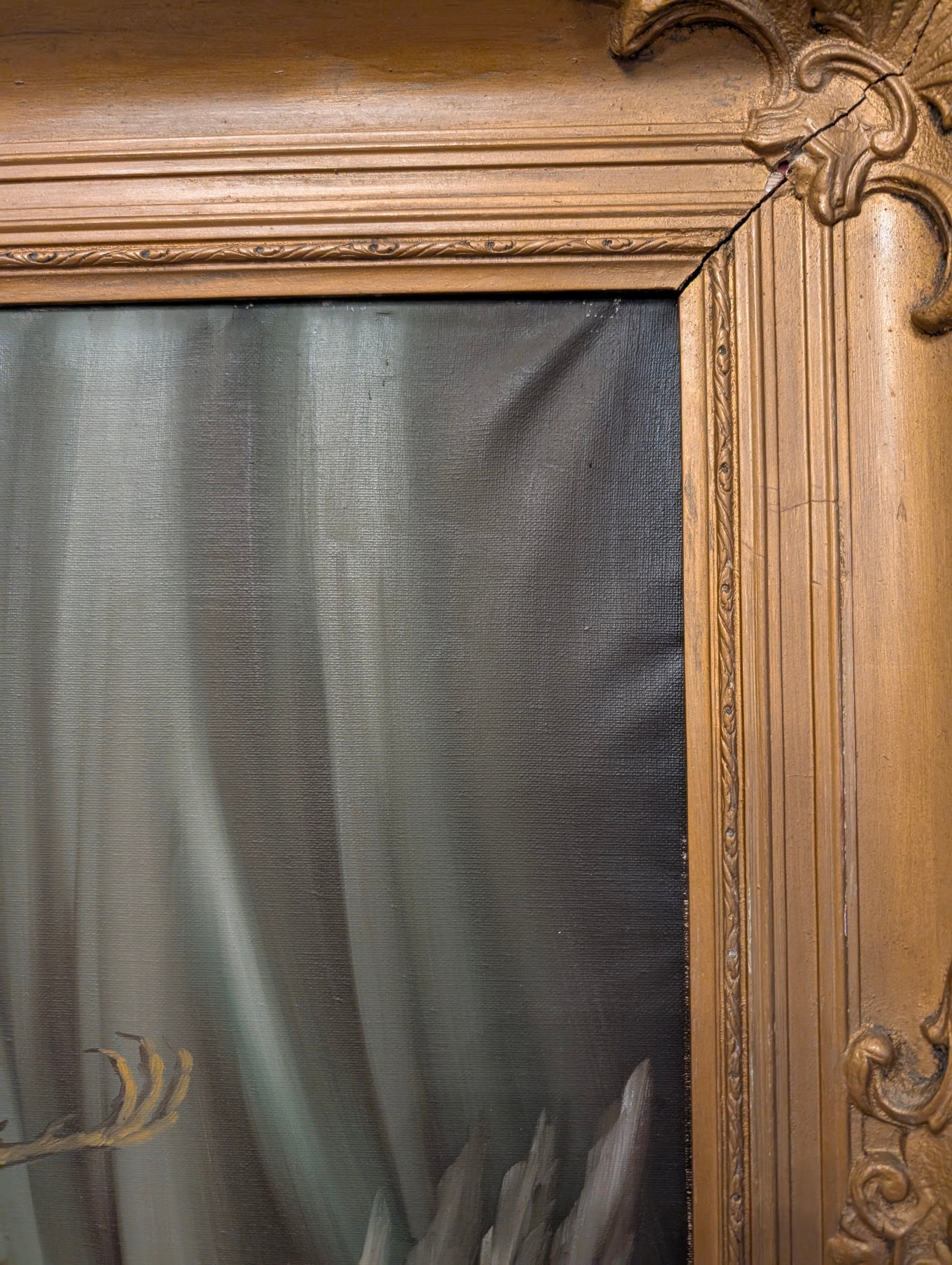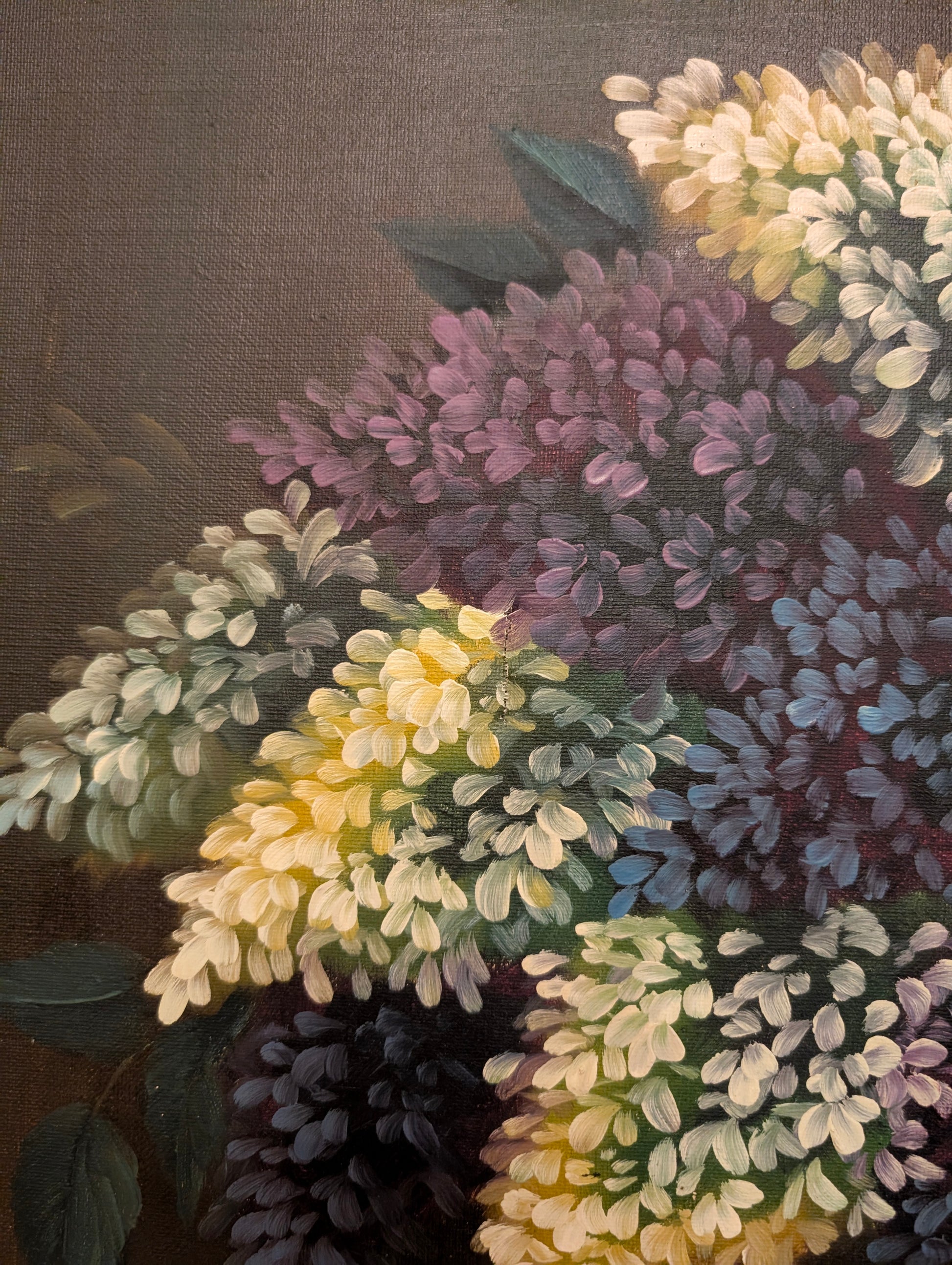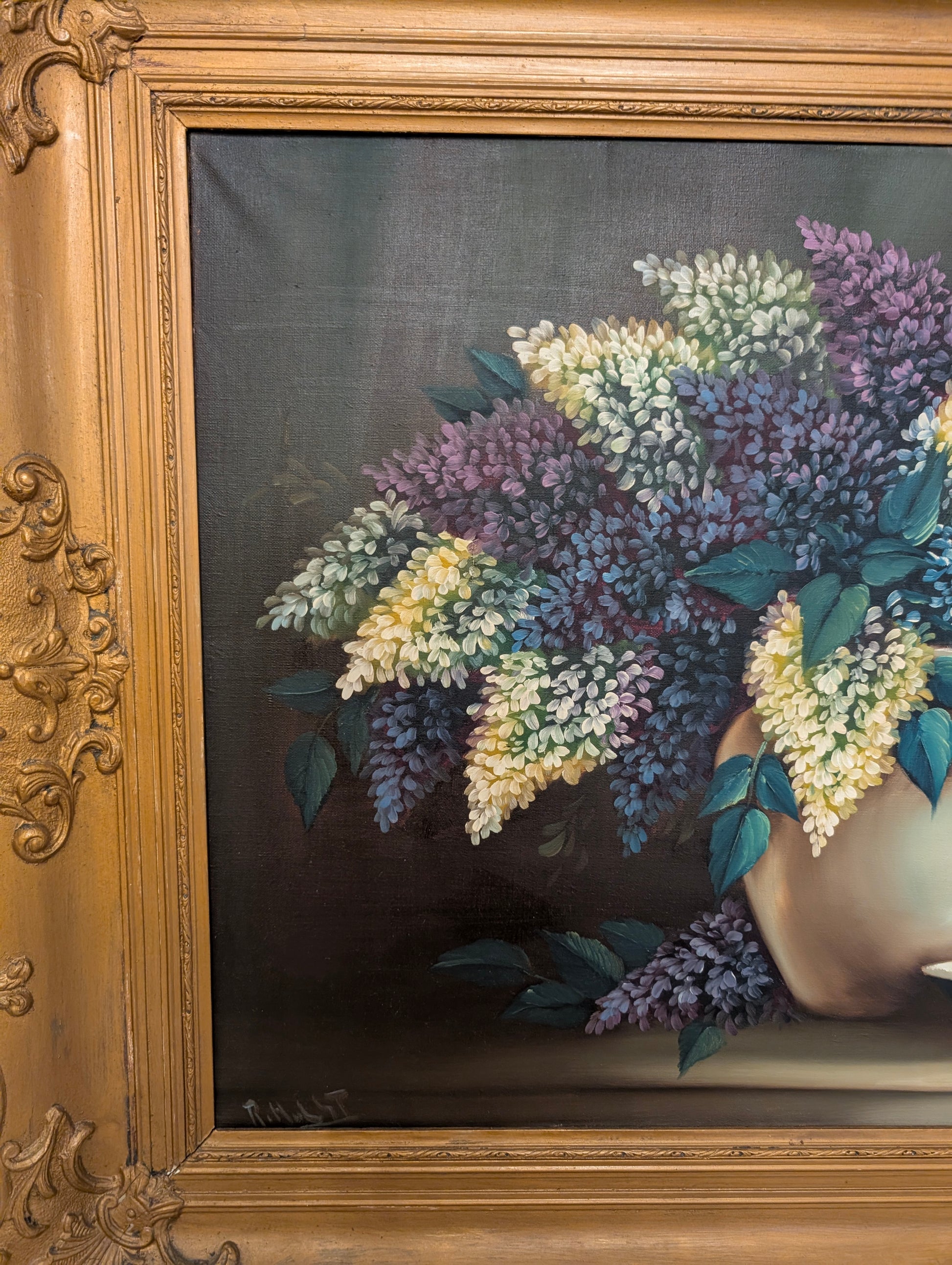 An impressively large framed oil on canvas, pheasant and lilac scene. The bouquet of lilacs are deep navy, purple, and cream in color. The painting is signed in the bottom left. Please note there is a small 1" tear in the lilac bouquet, as picture in photos 14, 15, 17, 19. There is also an older tear on the pheasant, which has been repaired (photo 16,18,19).