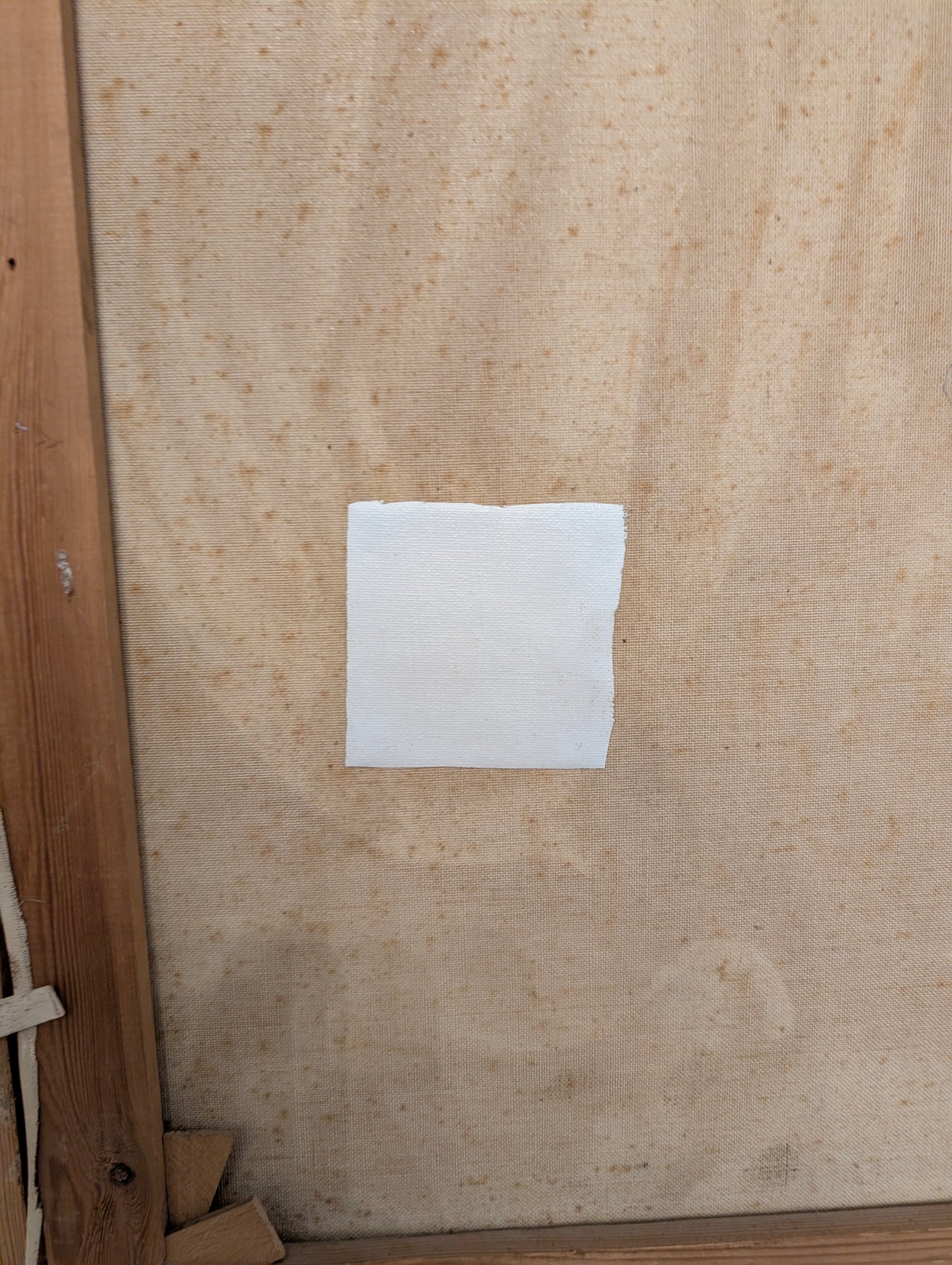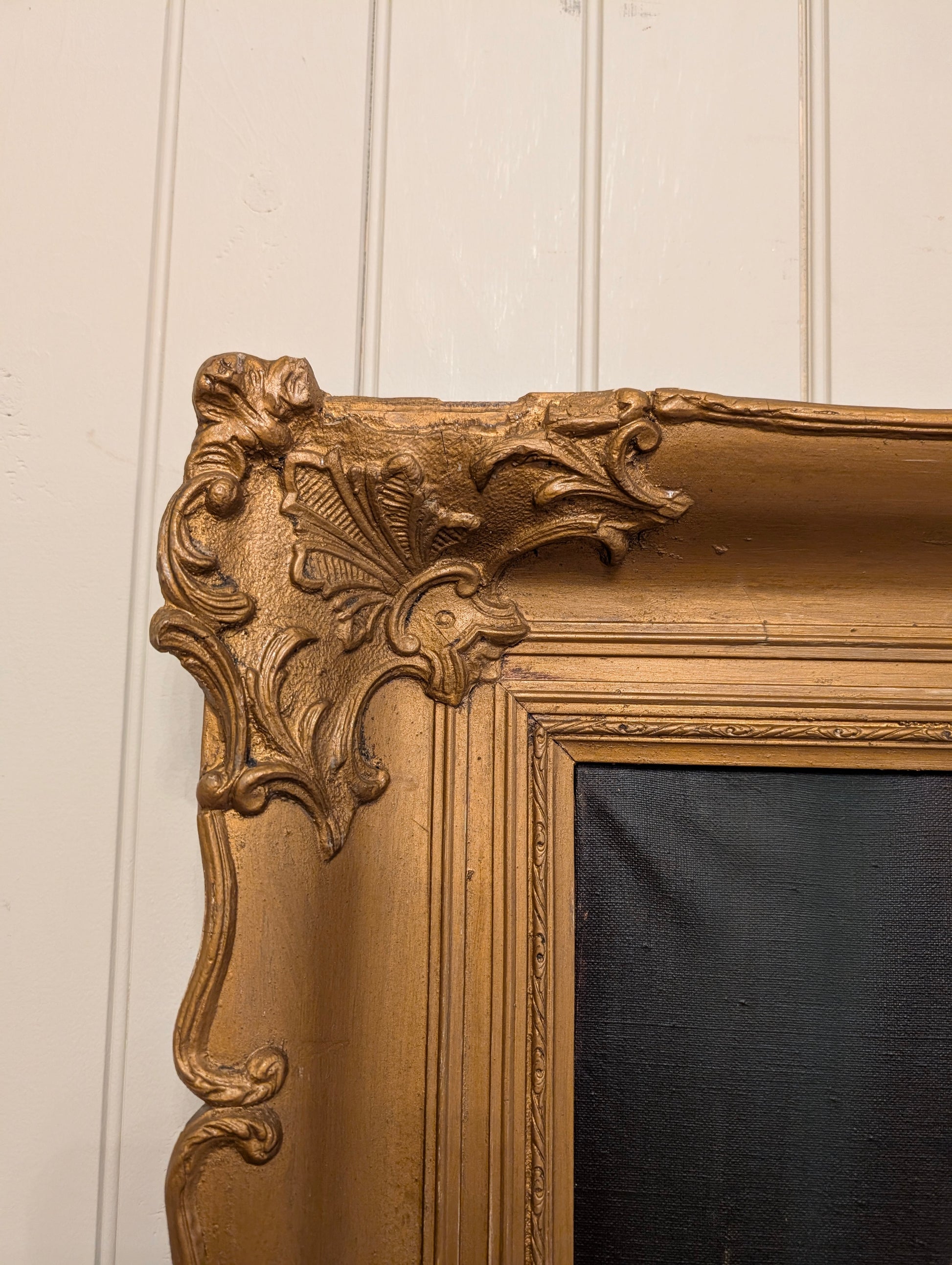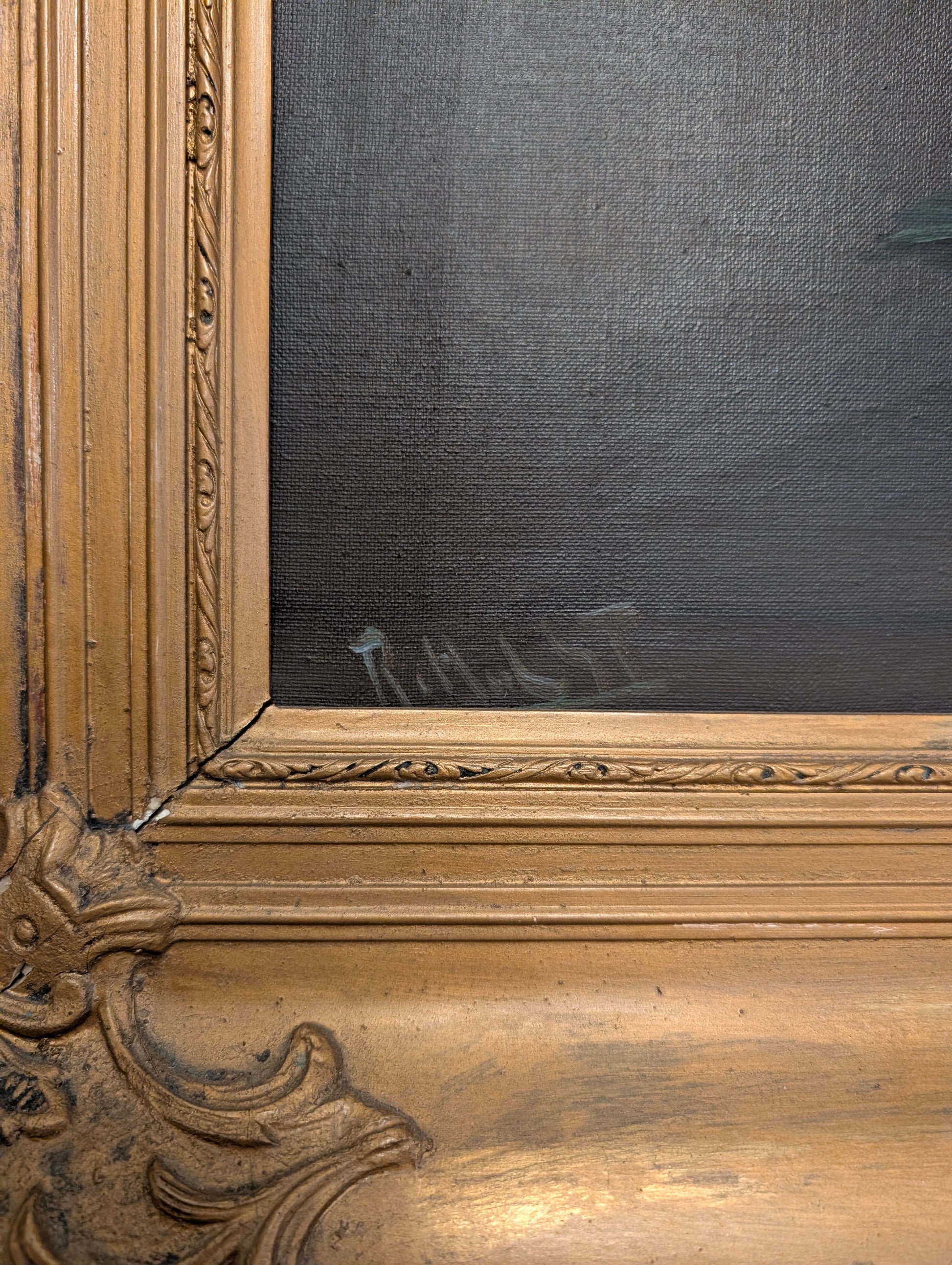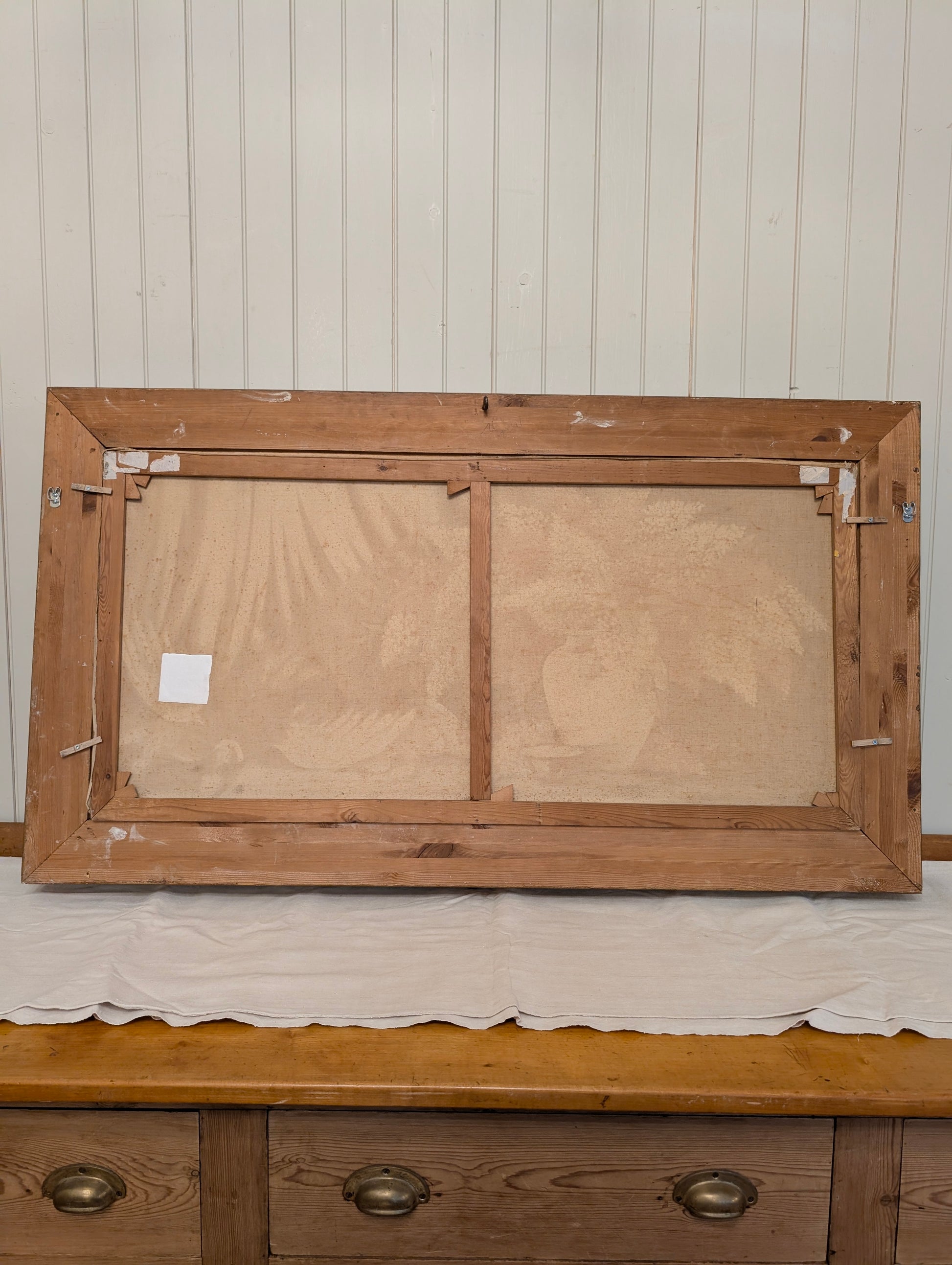 An impressively large framed oil on canvas, pheasant and lilac scene. The bouquet of lilacs are deep navy, purple, and cream in color. The painting is signed in the bottom left. Please note there is a small 1" tear in the lilac bouquet, as picture in photos 14, 15, 17, 19. There is also an older tear on the pheasant, which has been repaired (photo 16,18,19).