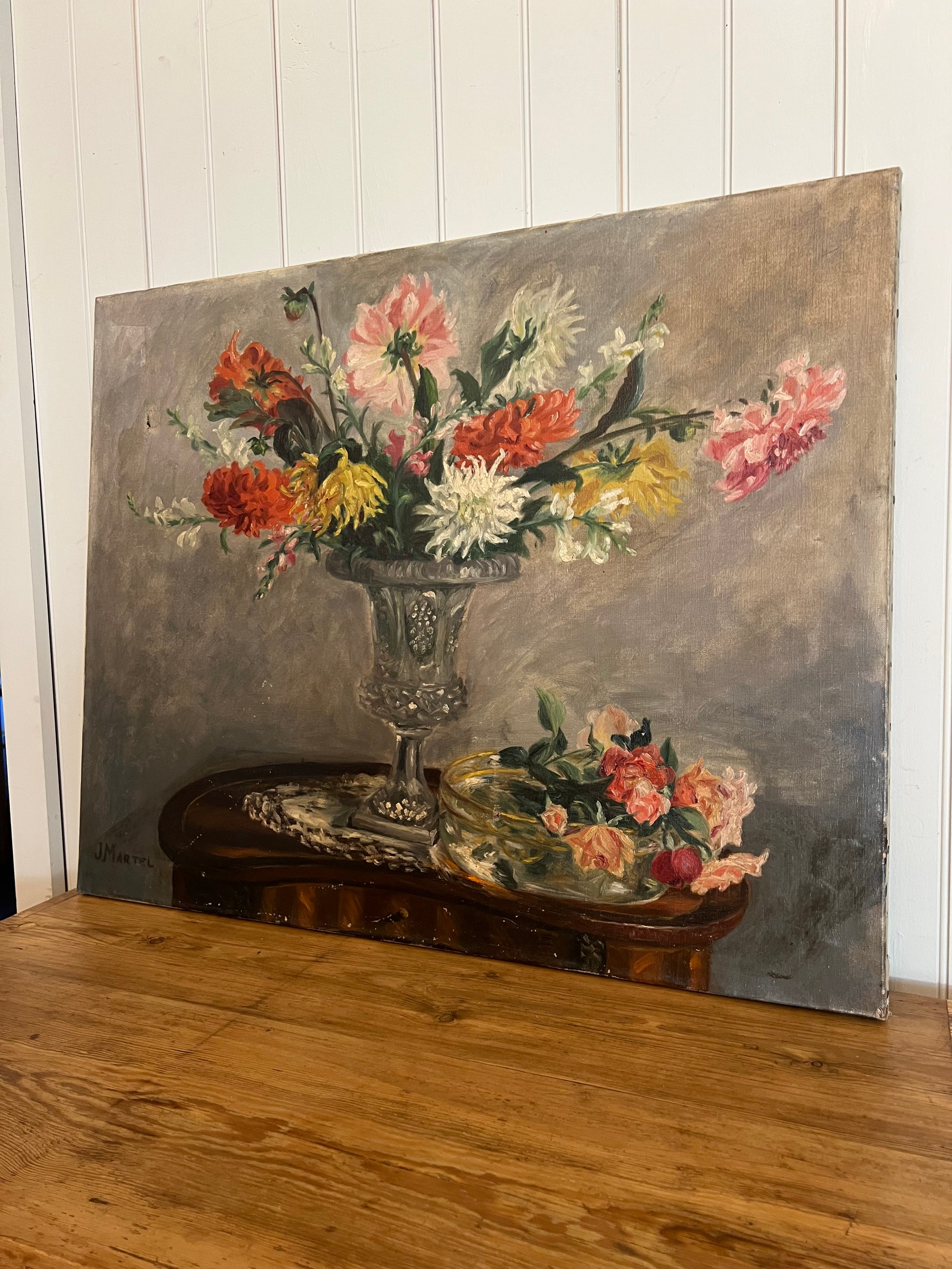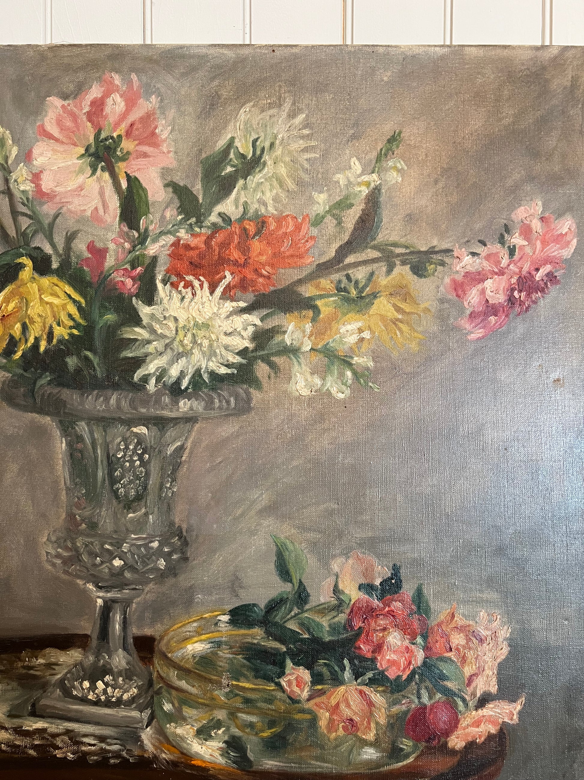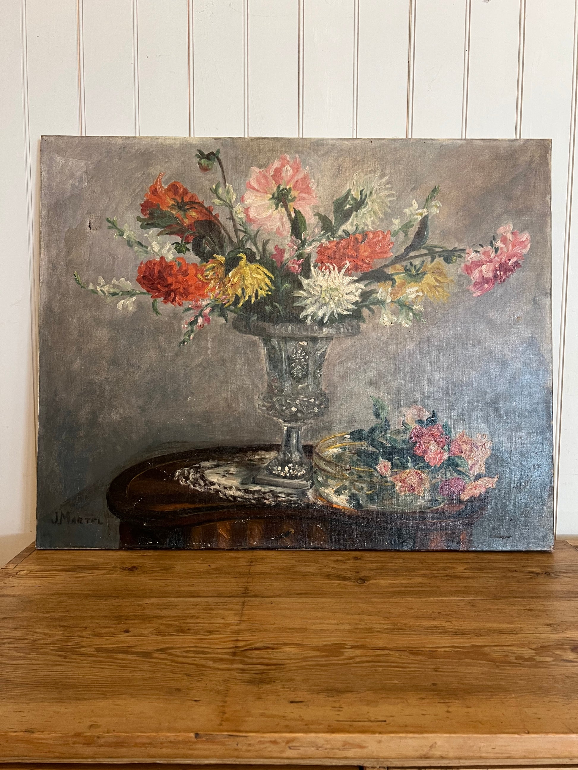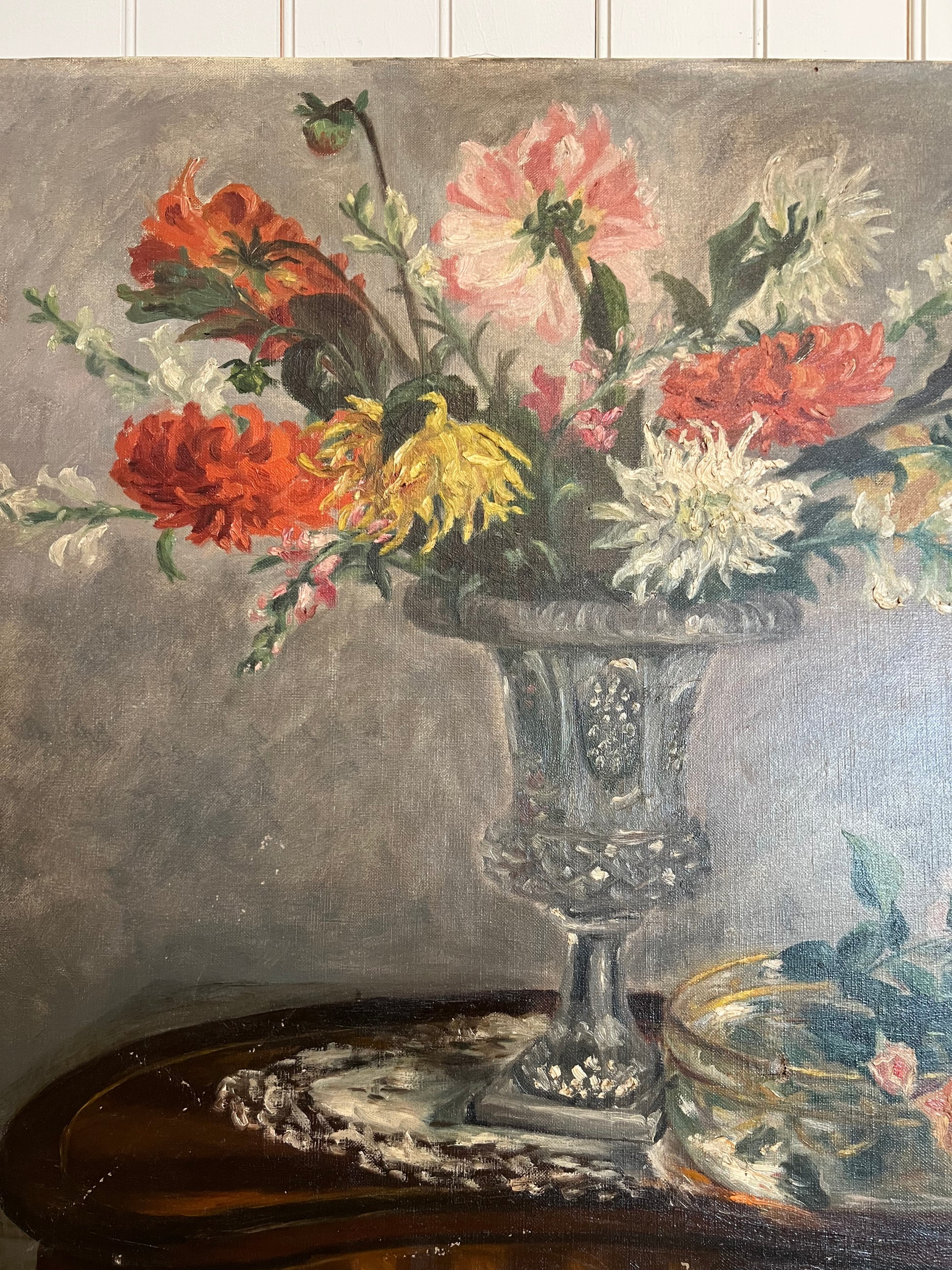 A stunning French oil on board depicting a bouquet of dahlias. The primary colors are red-orange, pink, white, and yellow. We can't help but feel the sunlight streaming in on the vase as the artist captured the reflective properties of the glass so well. The painting is signed in the bottom left corner. Please note the small tear in the top left as shown.