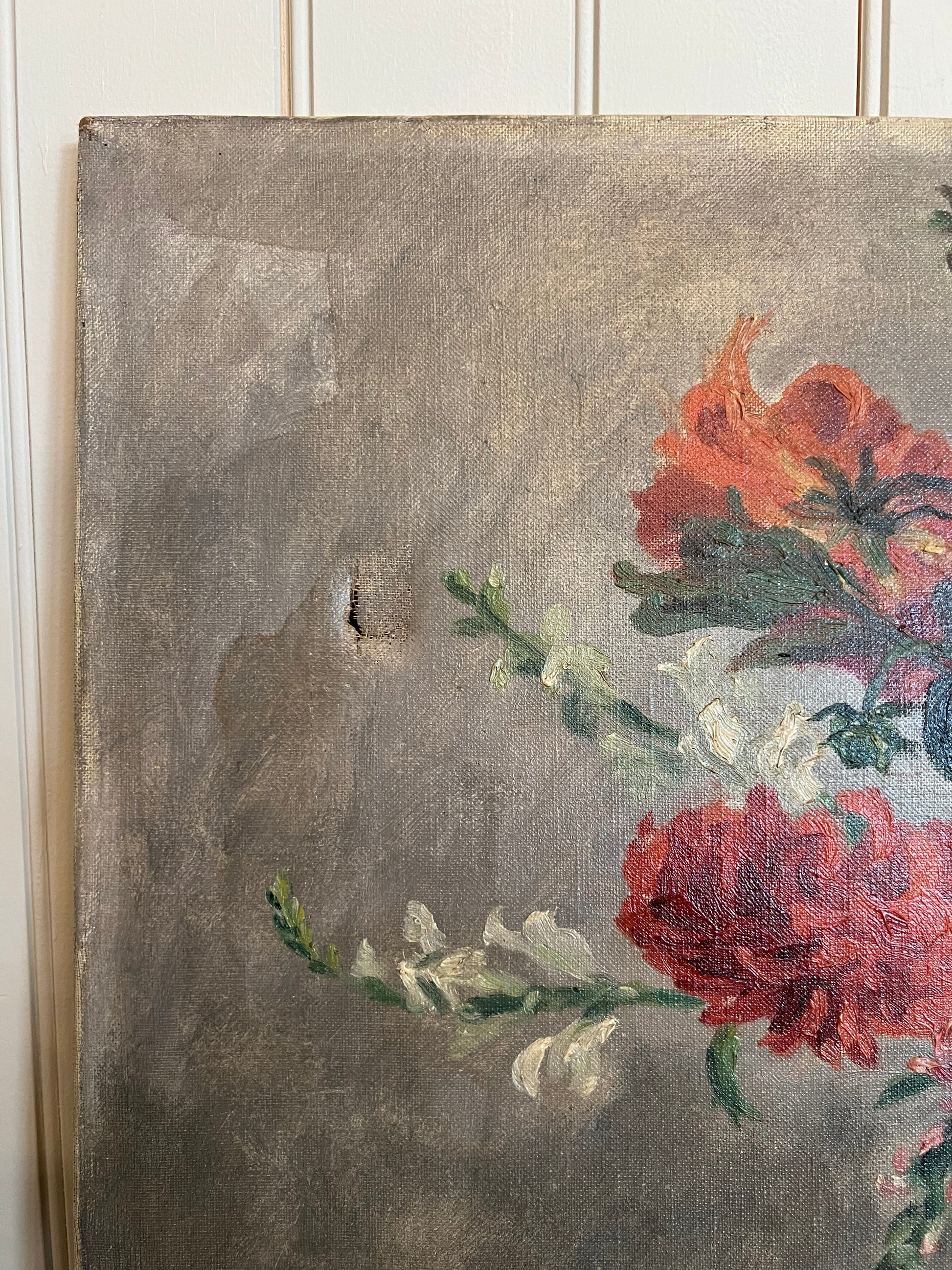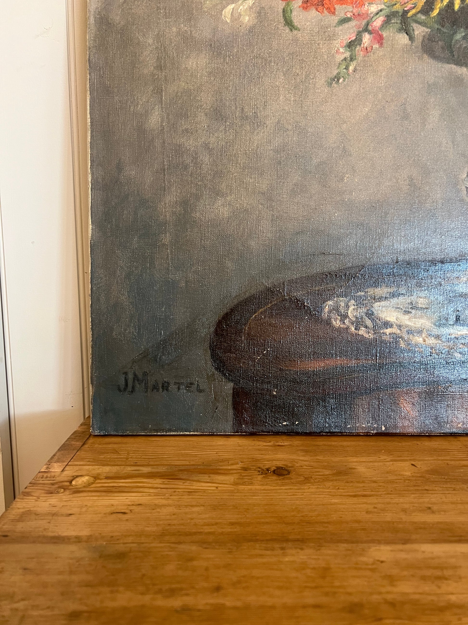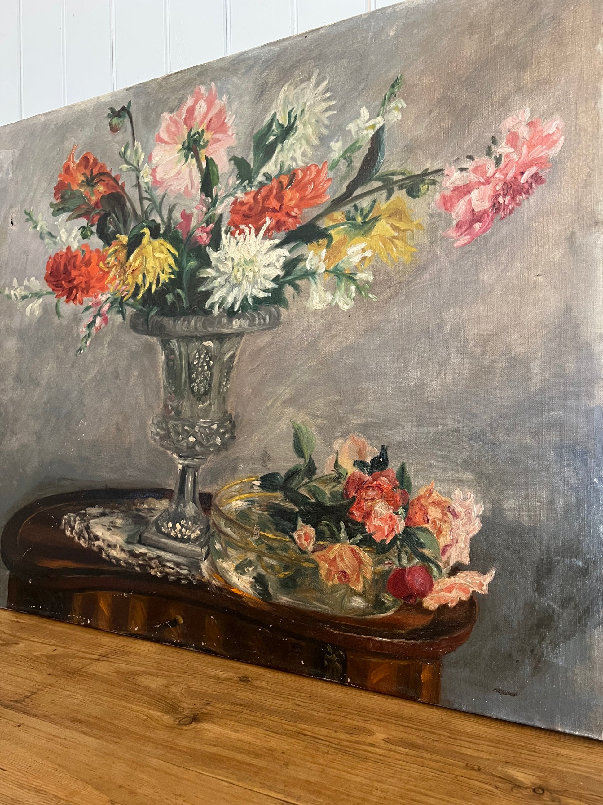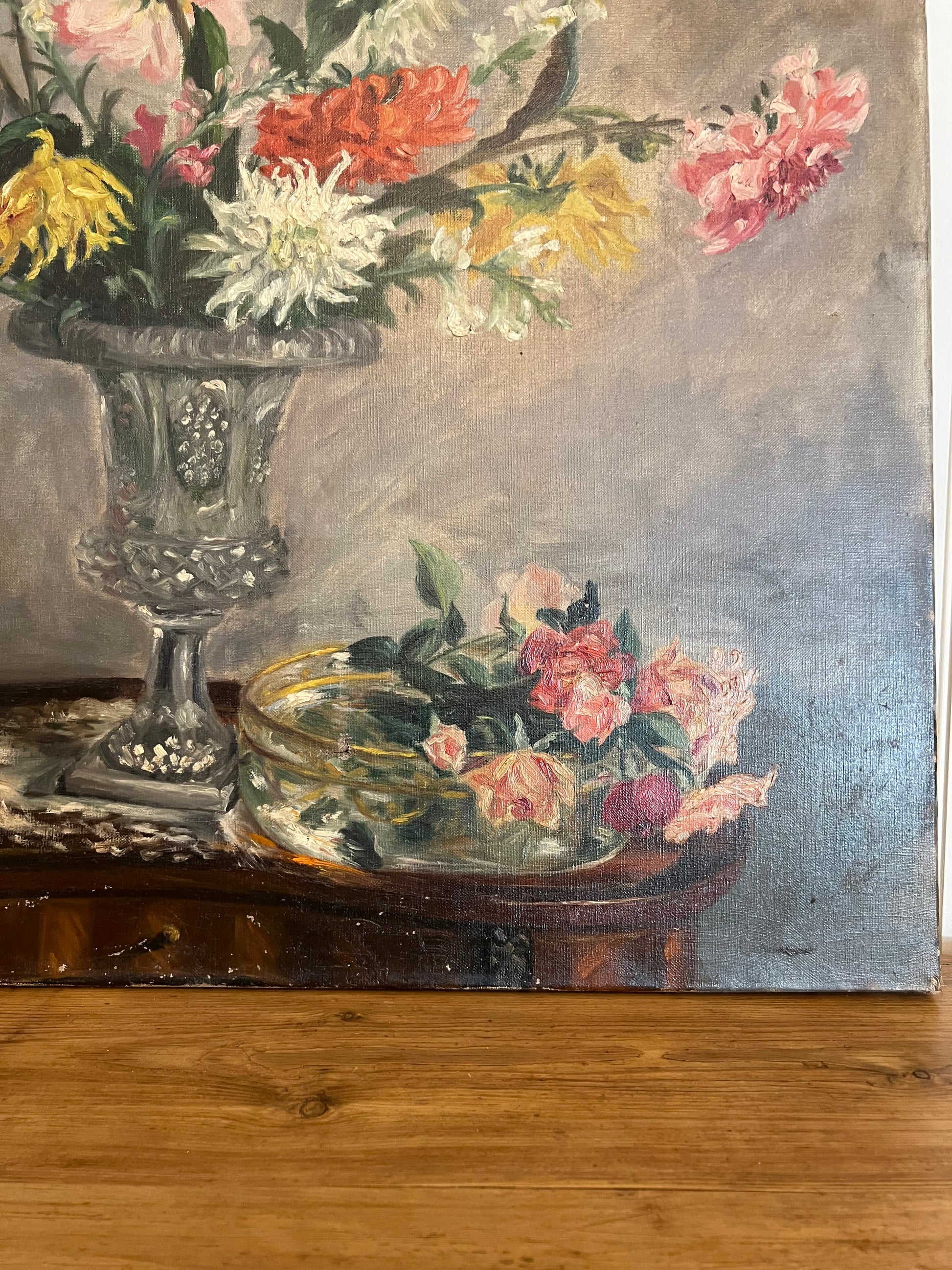 A stunning French oil on board depicting a bouquet of dahlias. The primary colors are red-orange, pink, white, and yellow. We can't help but feel the sunlight streaming in on the vase as the artist captured the reflective properties of the glass so well. The painting is signed in the bottom left corner. Please note the small tear in the top left as shown.
