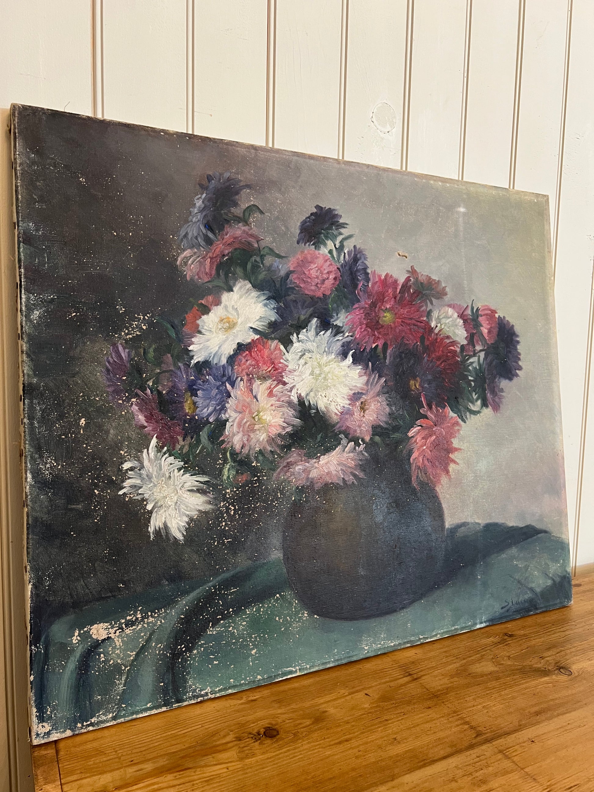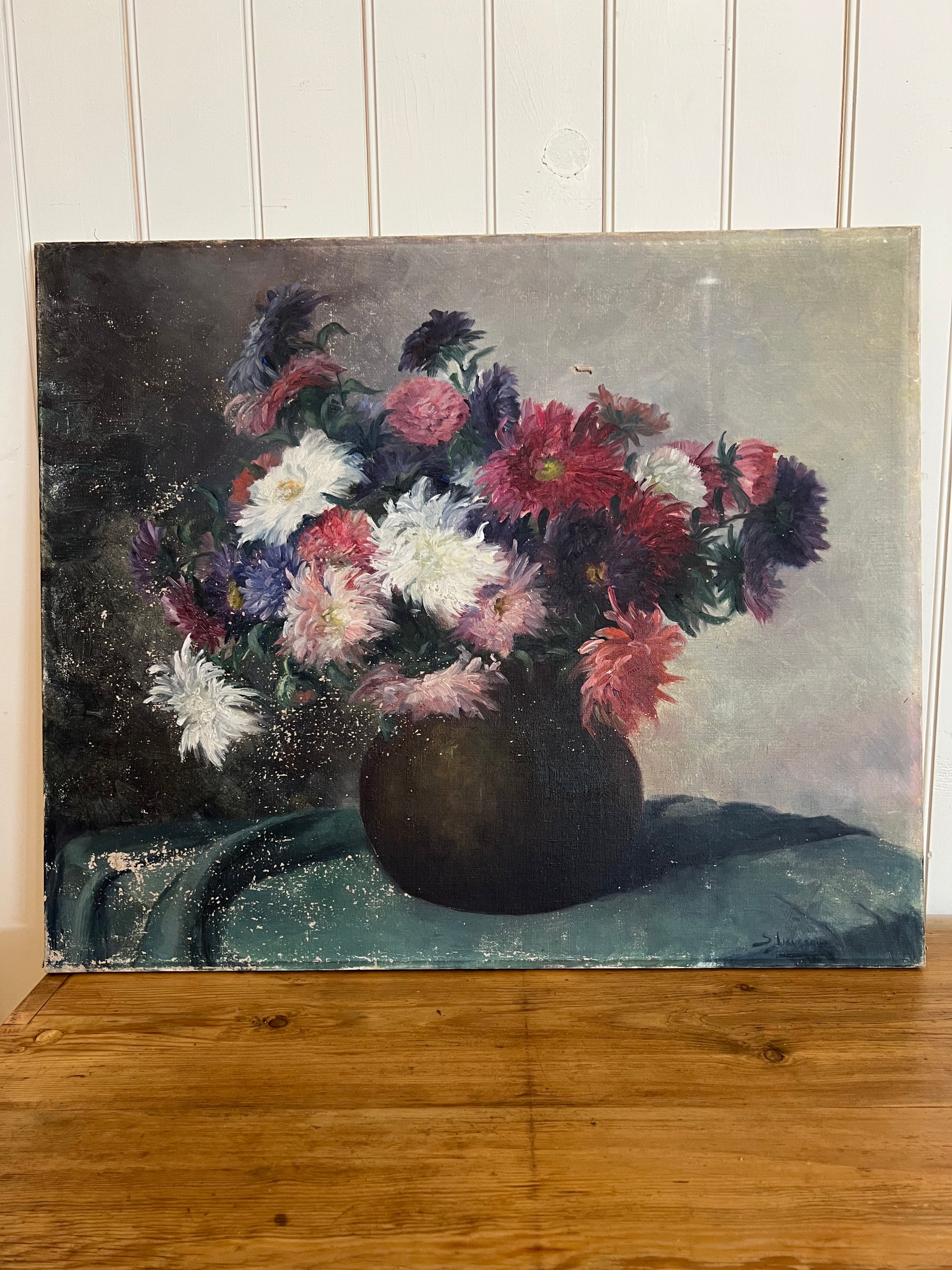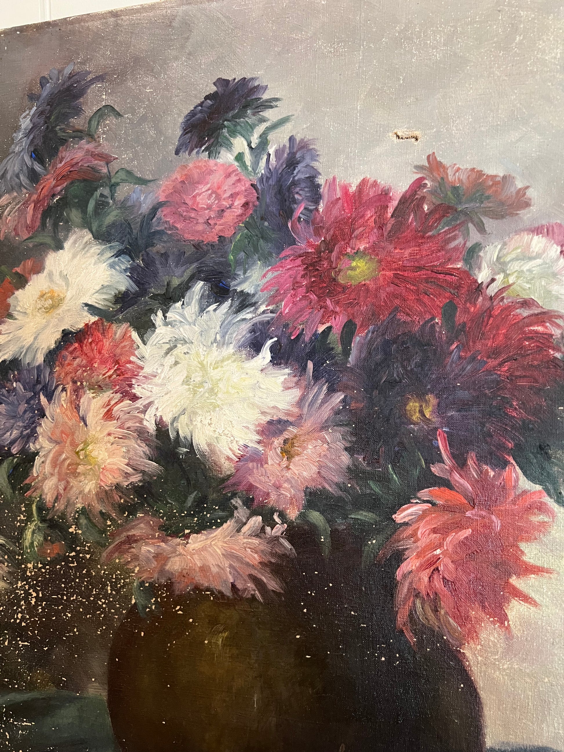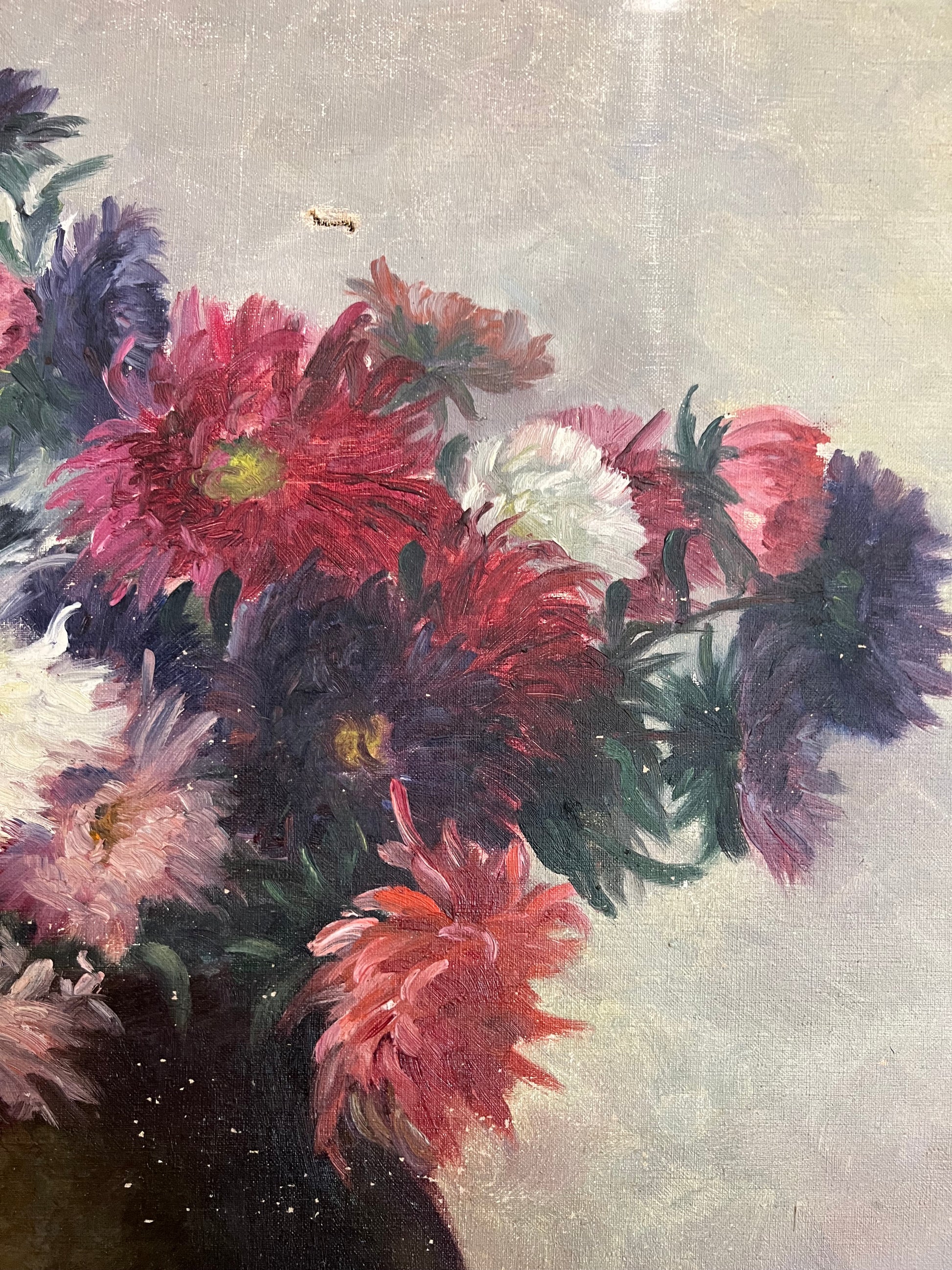 A French oil on canvas bouquet of Dahlias. The primary floral colors are purple, red, pink, and white. There is an overall rich and moody vibe to this painting, captured with the depth of the paint colors used. Please note the minor paint loss on the left side, and a small tear in the upper middle of the painting. Signed in the bottom right corner.