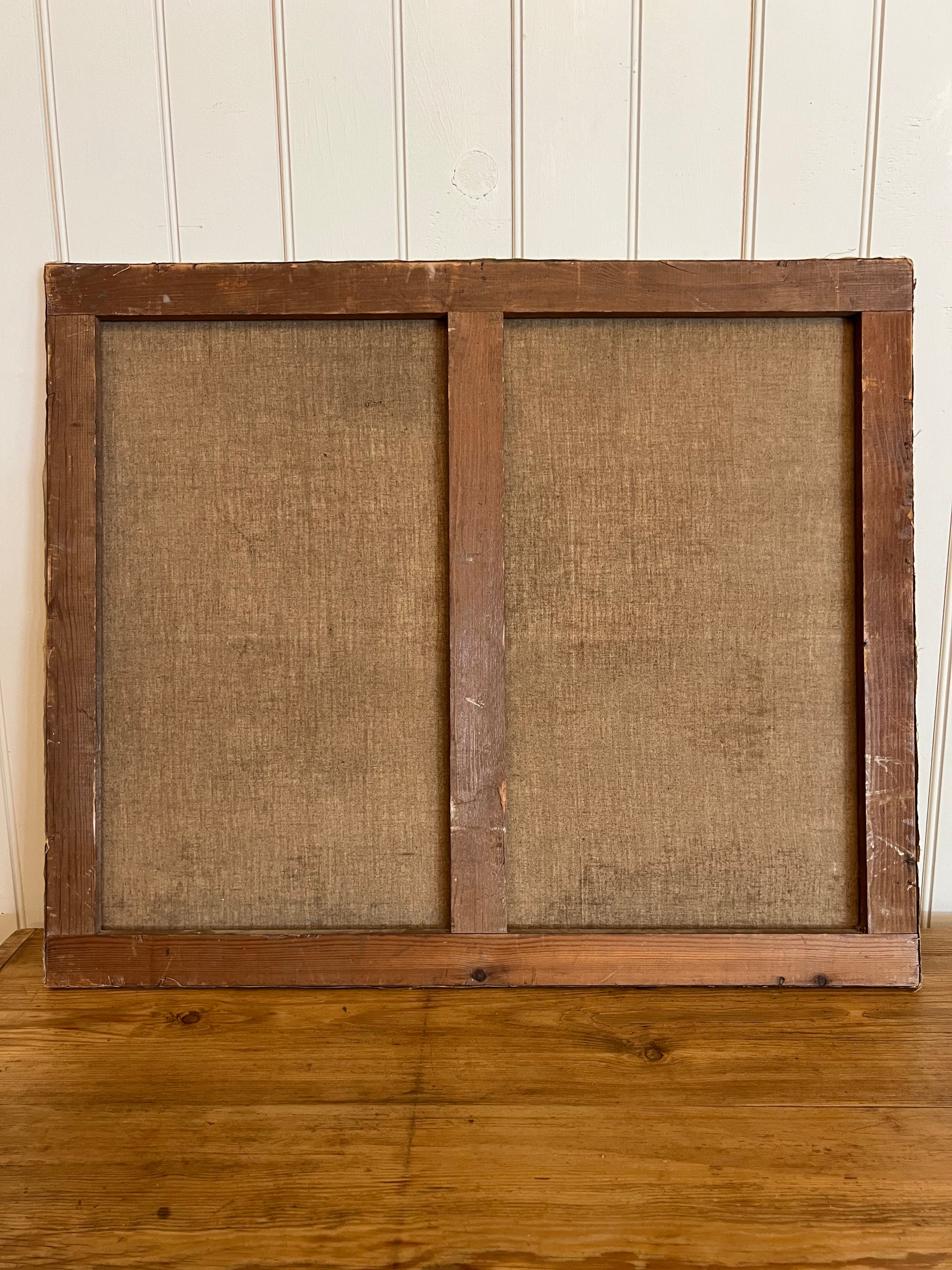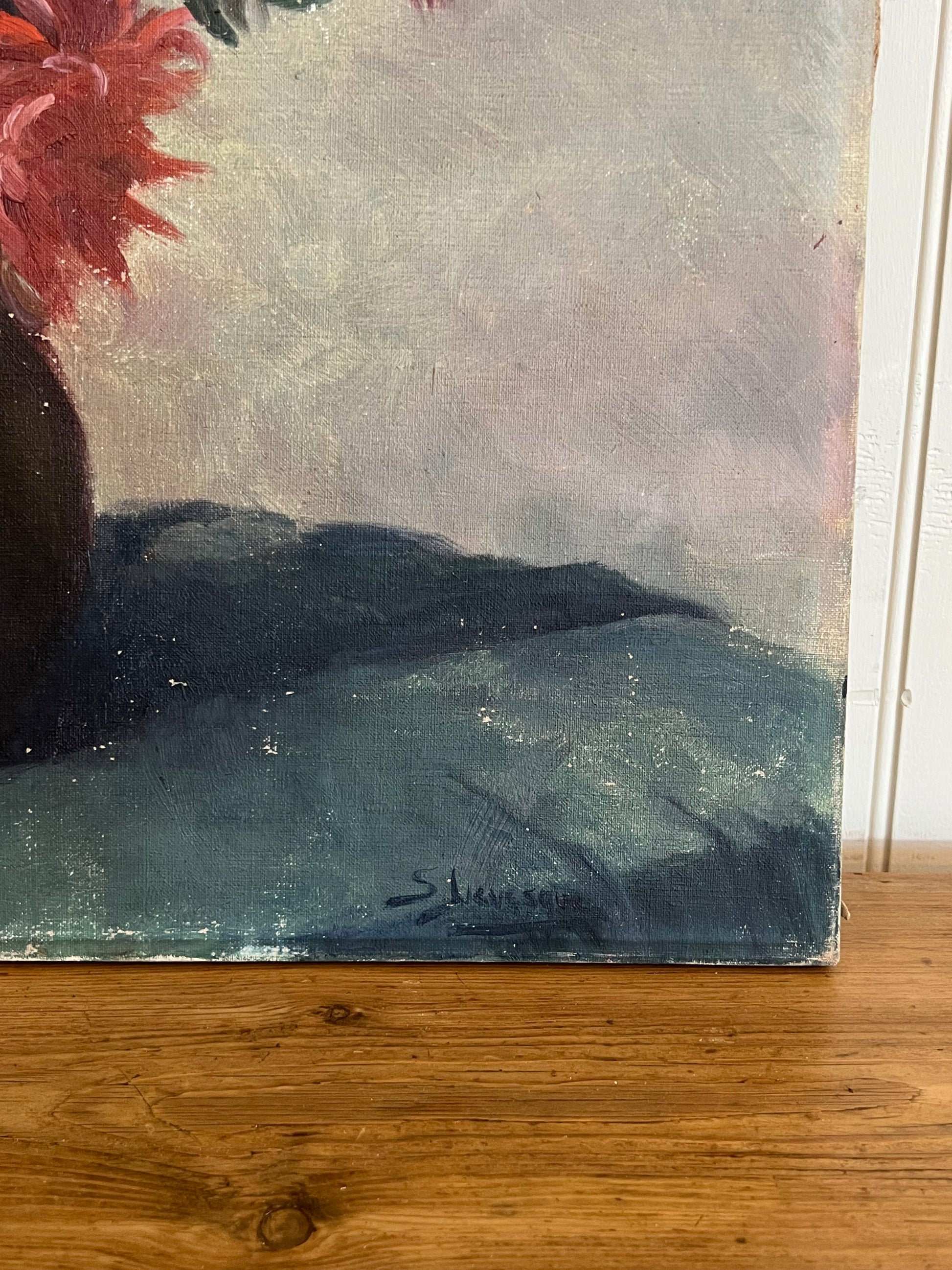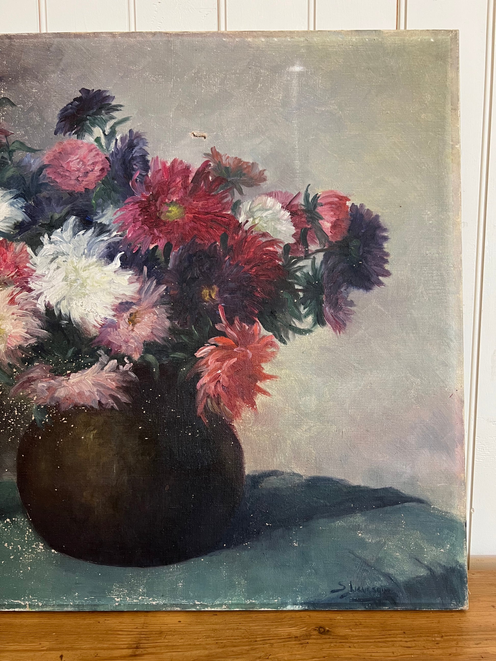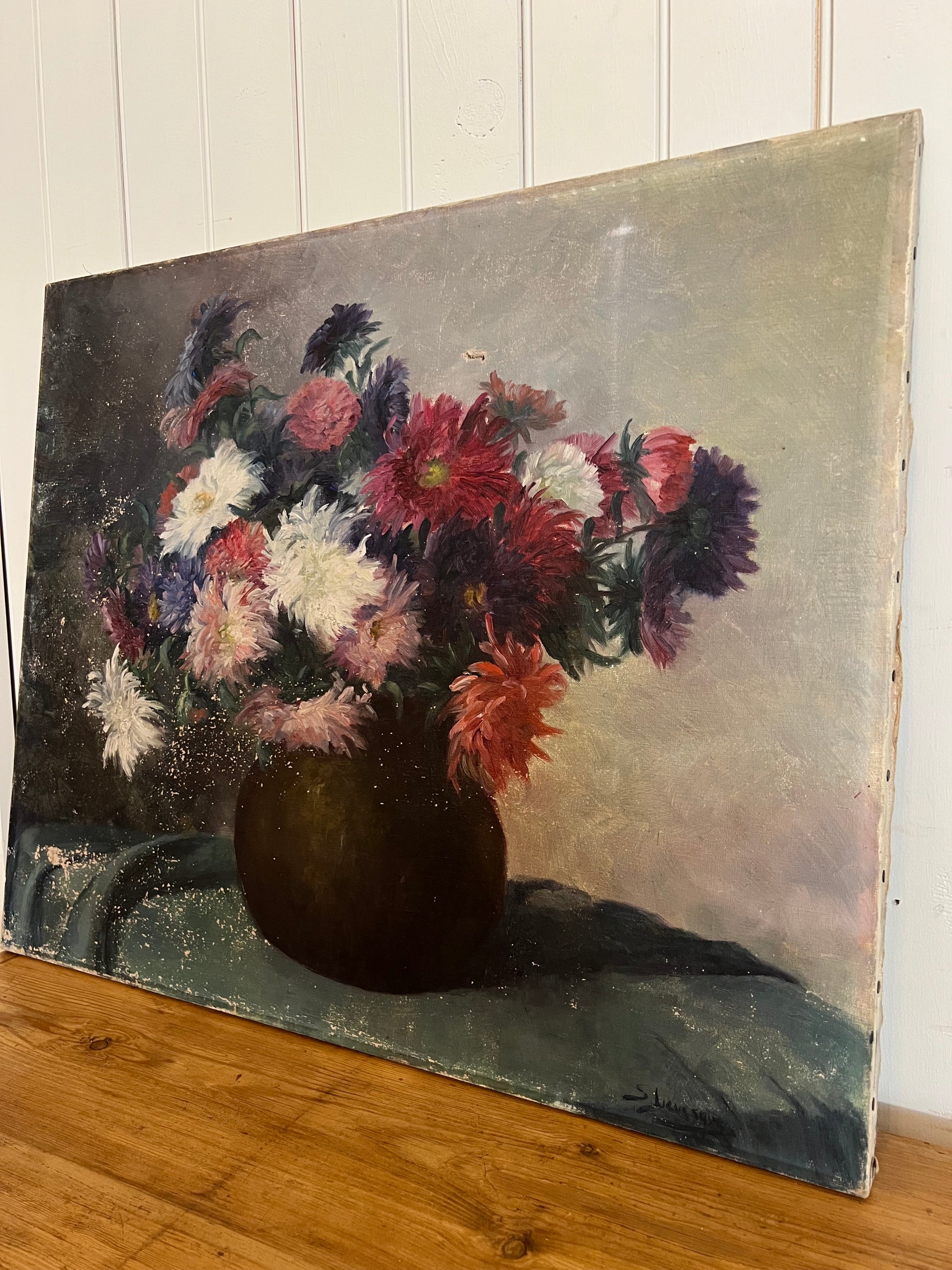 A French oil on canvas bouquet of Dahlias. The primary floral colors are purple, red, pink, and white. There is an overall rich and moody vibe to this painting, captured with the depth of the paint colors used. Please note the minor paint loss on the left side, and a small tear in the upper middle of the painting. Signed in the bottom right corner.