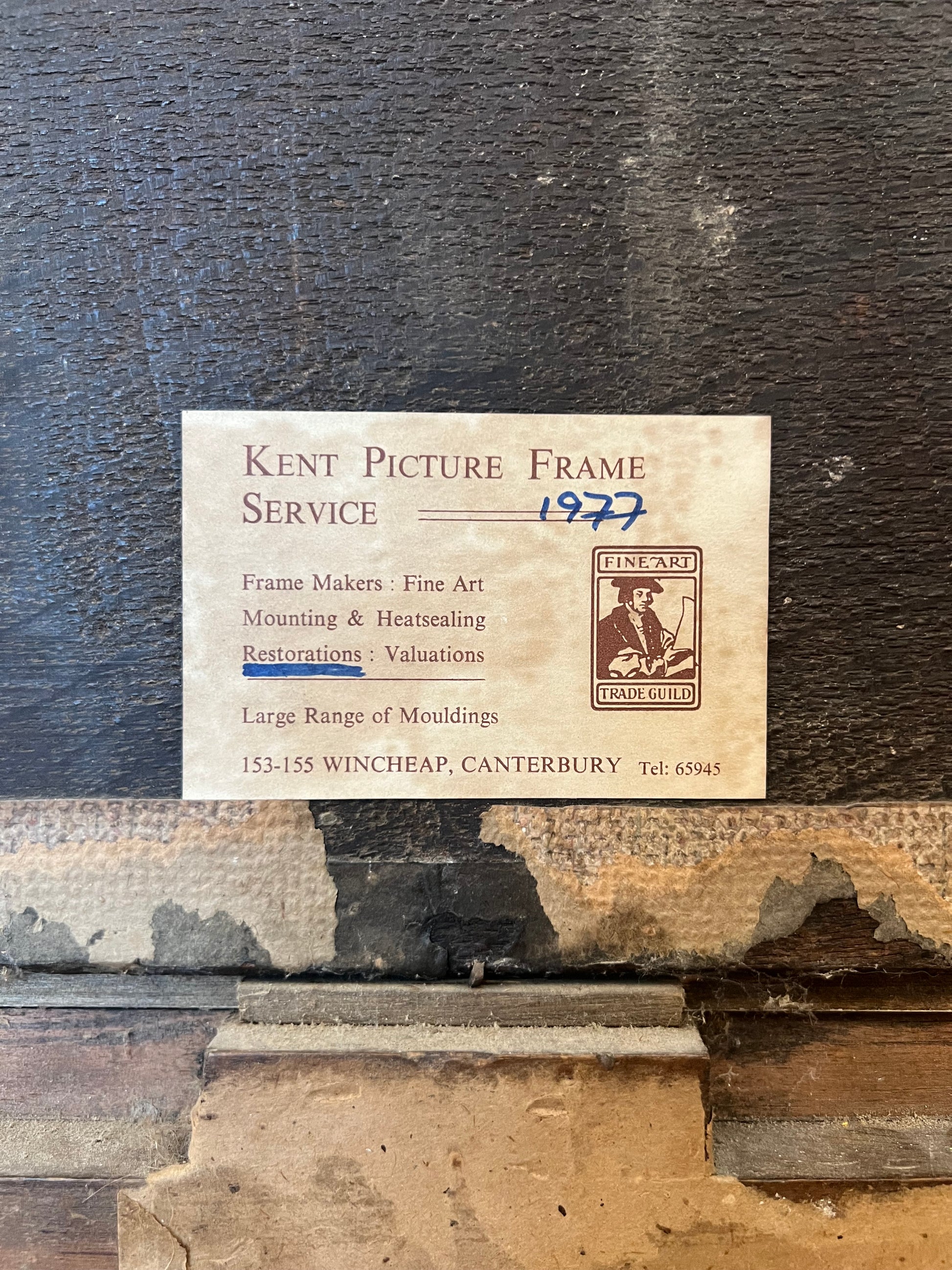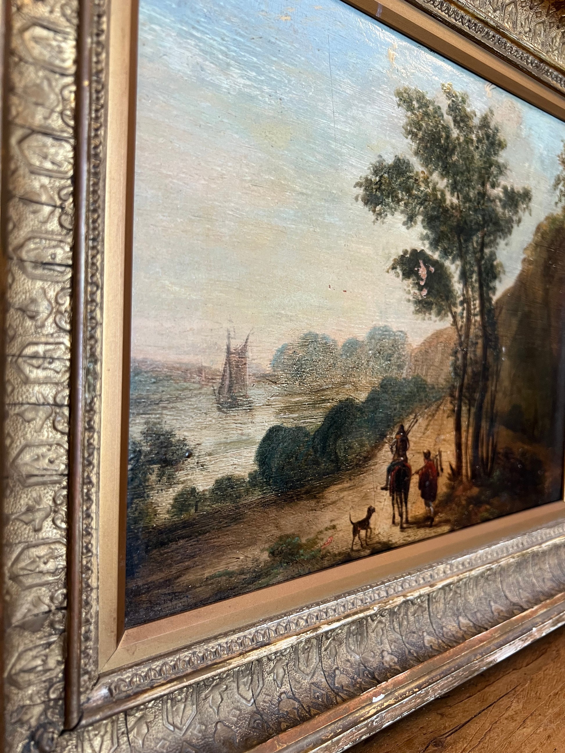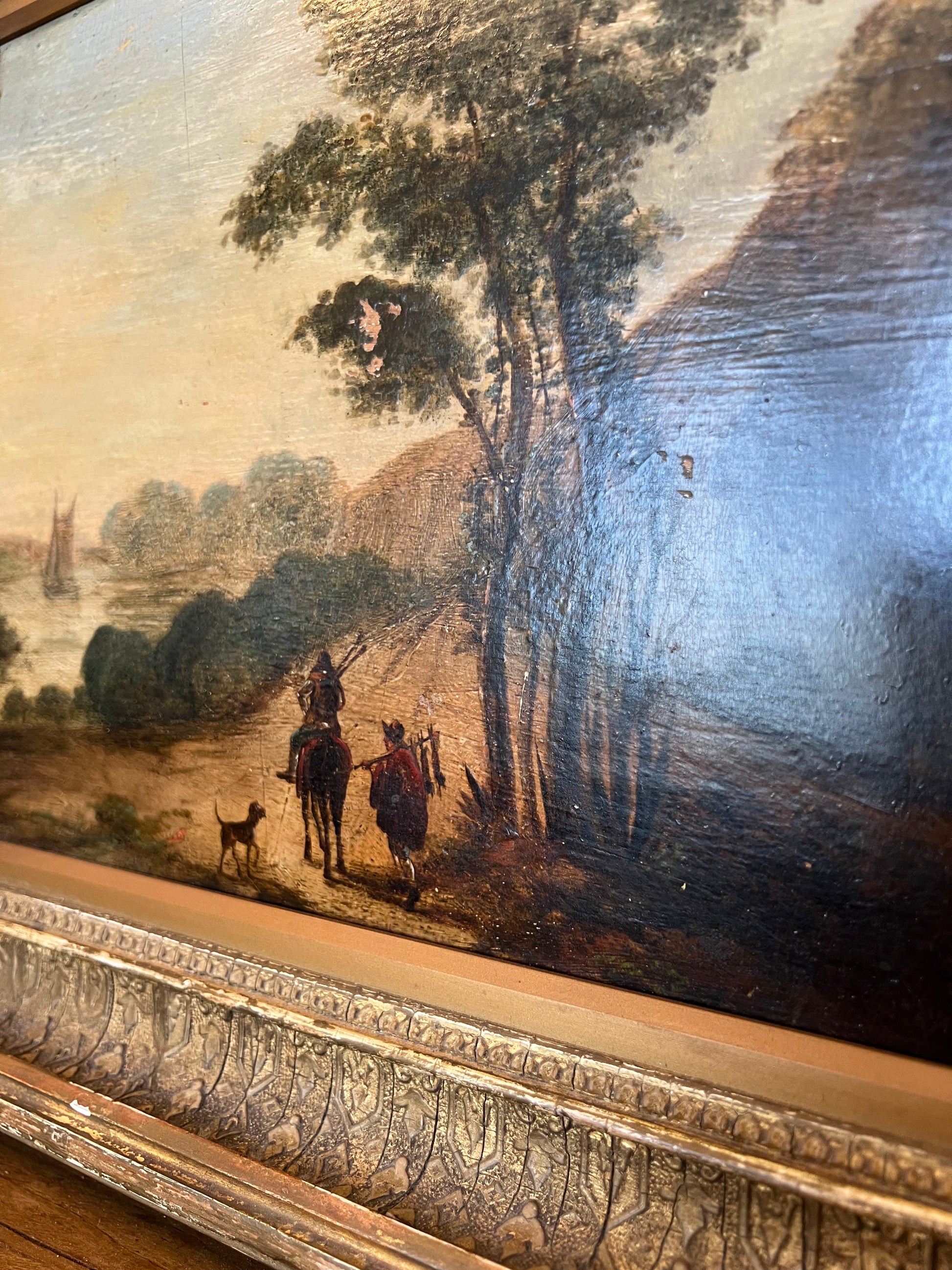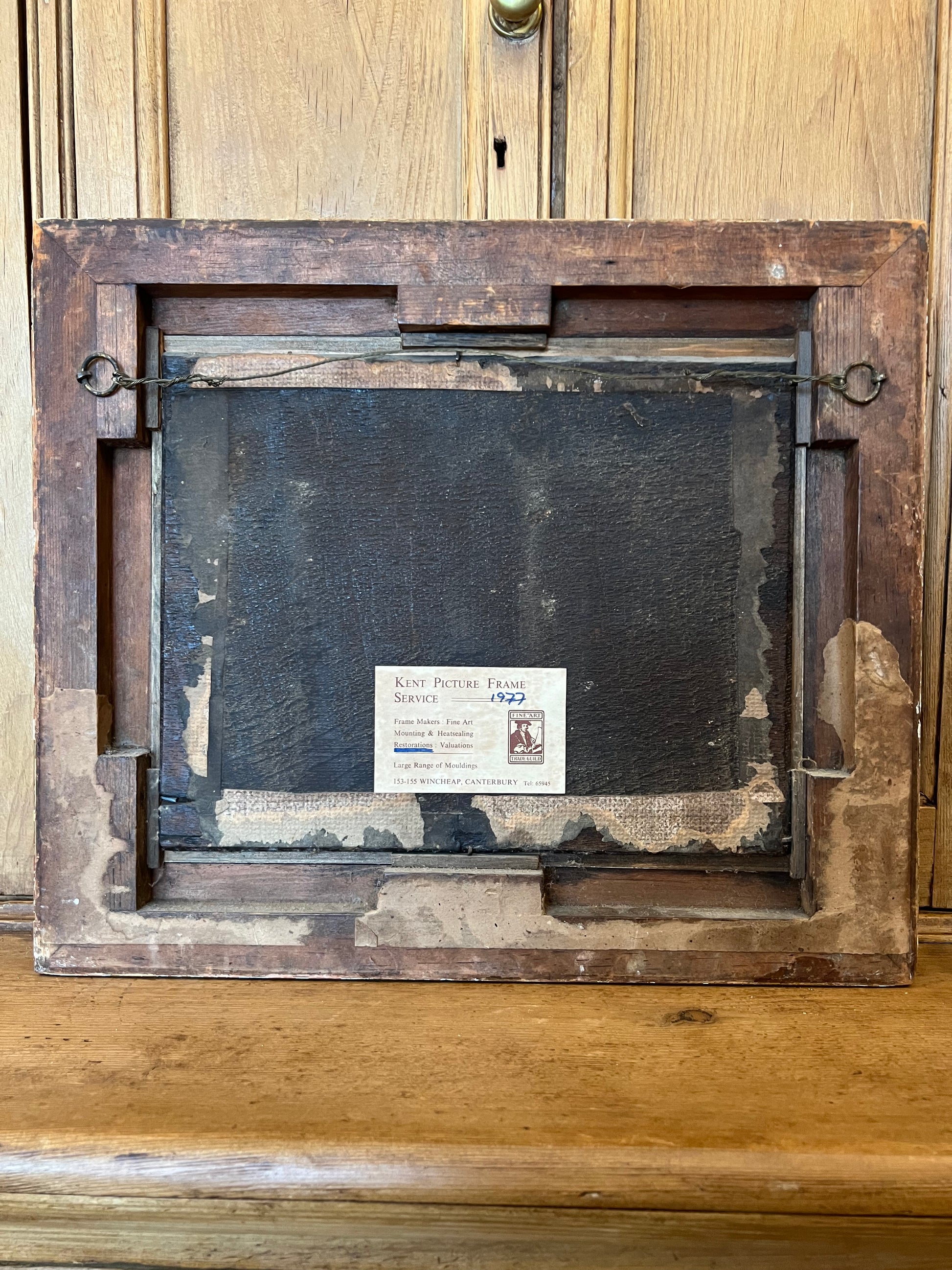 An original framed oil on board scenic scape. "The Last Ride" features a man on his horse, his dog, and his servant carrying his goods. There is a ship off in the distance and a large tree off to the right. The back tag indicates this painting was framed in Canterbury in 1977, although we believe the painting to be much older. There is no signature.