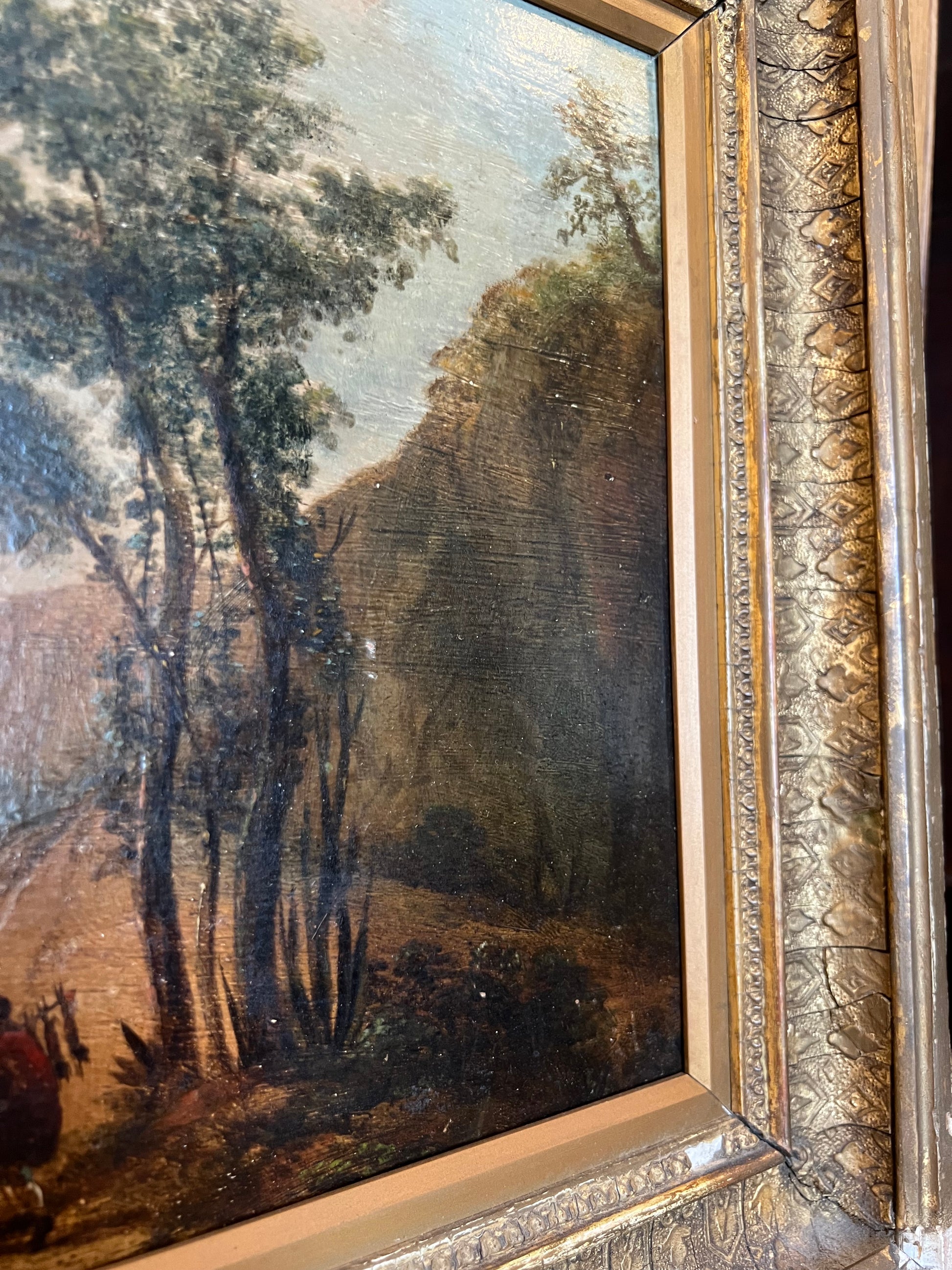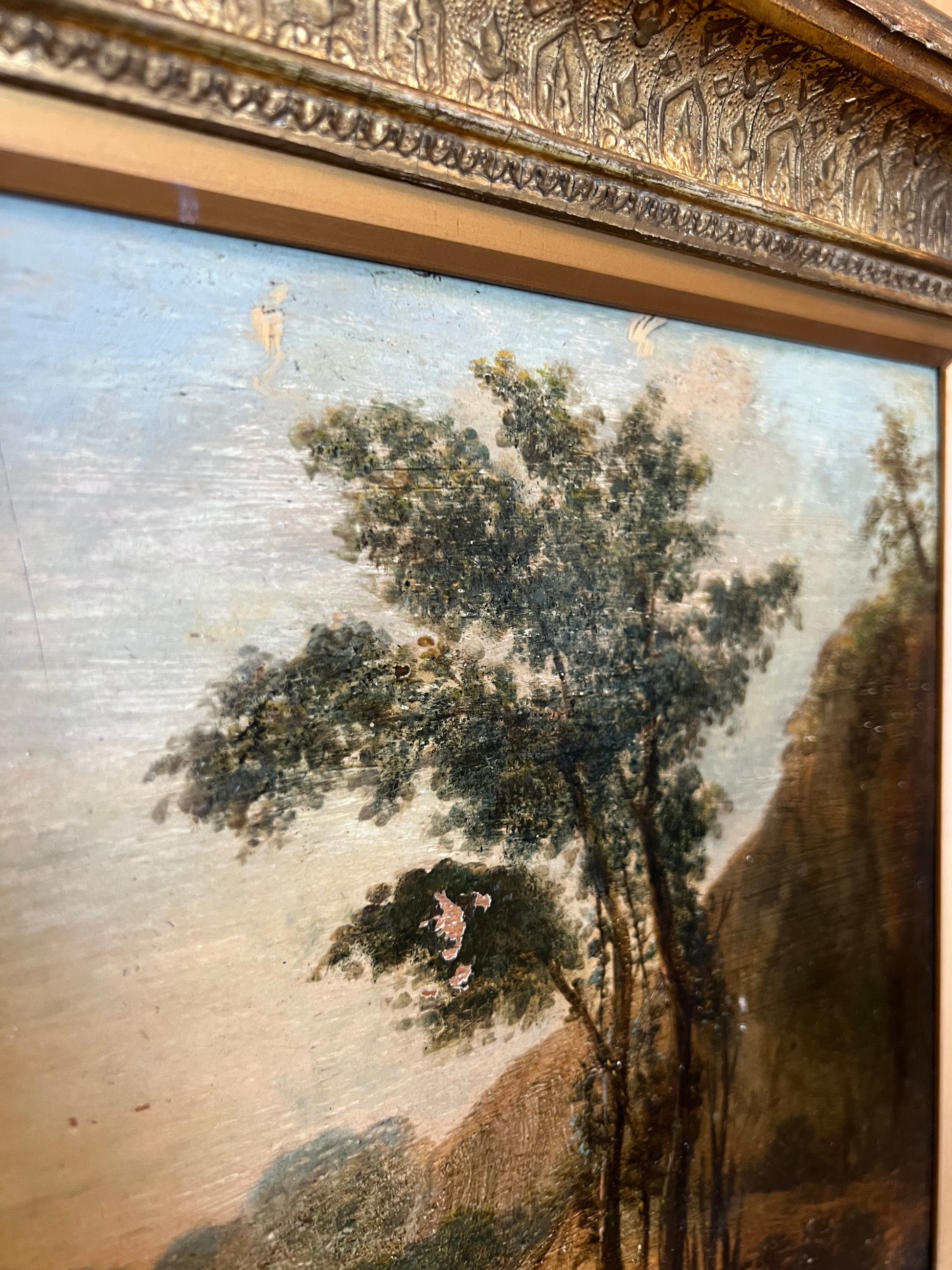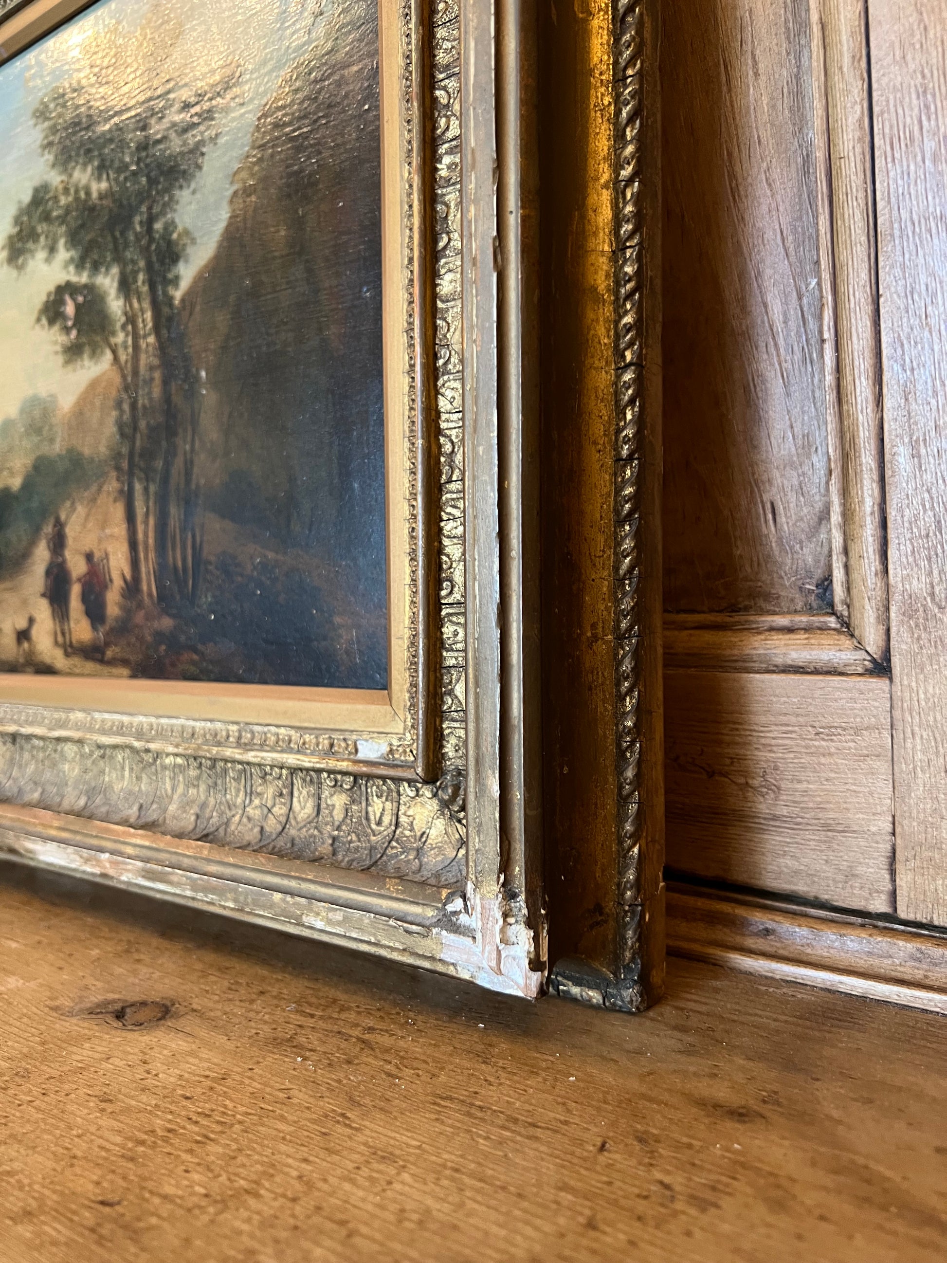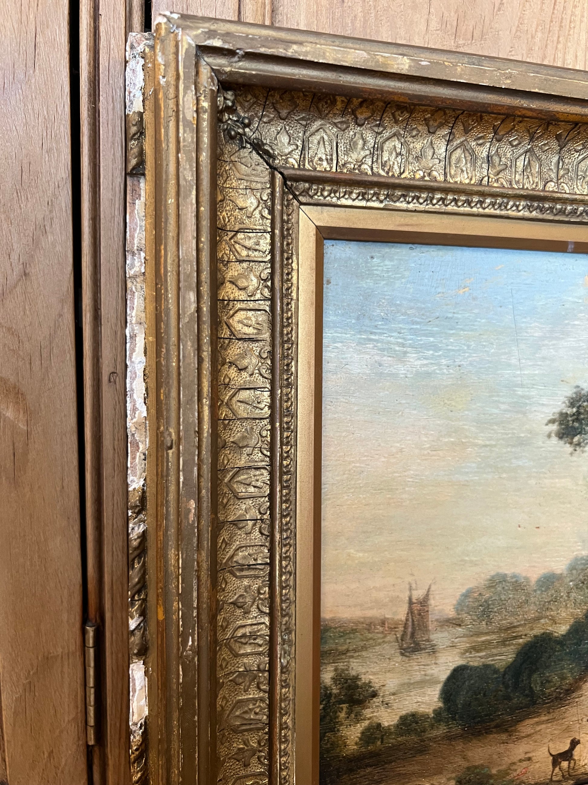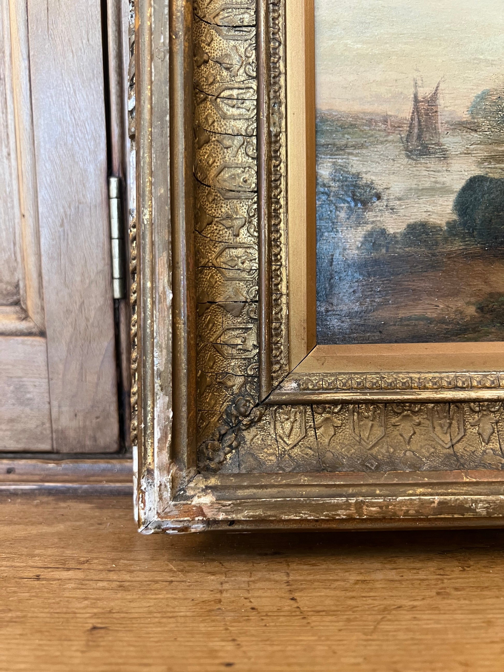An original framed oil on board scenic scape. "The Last Ride" features a man on his horse, his dog, and his servant carrying his goods. There is a ship off in the distance and a large tree off to the right. The back tag indicates this painting was framed in Canterbury in 1977, although we believe the painting to be much older. There is no signature.