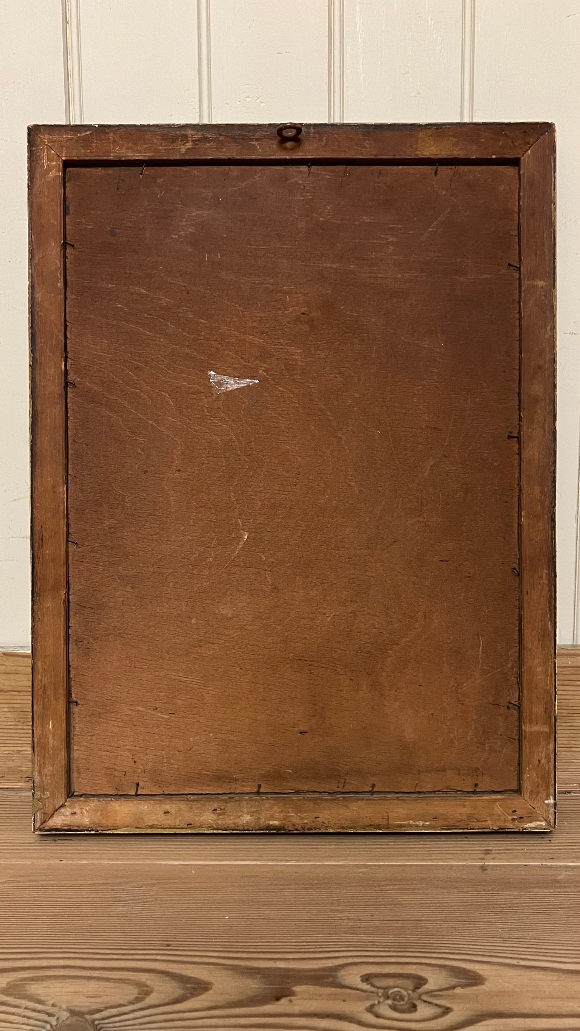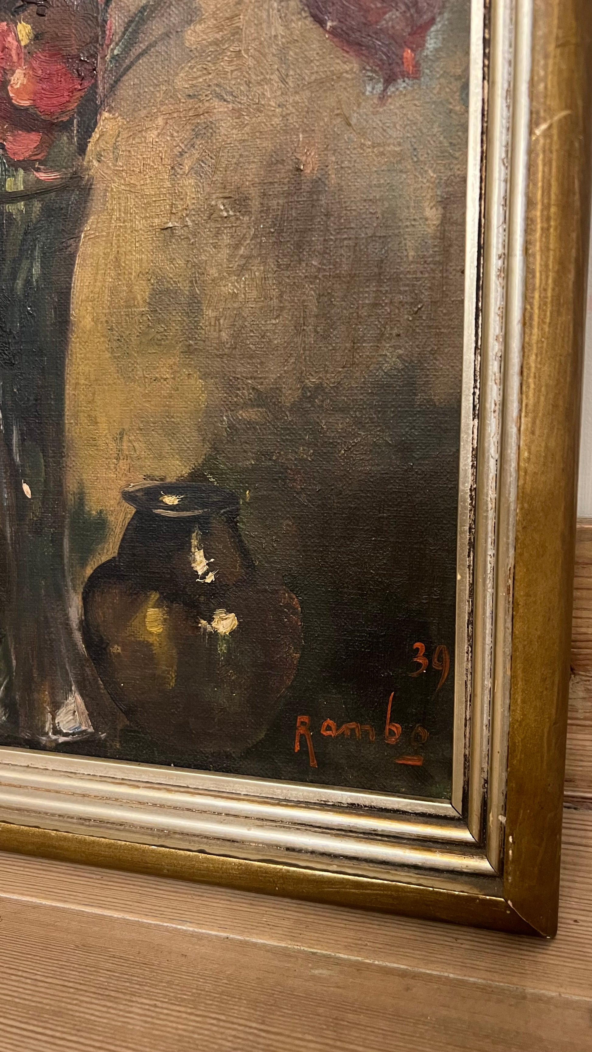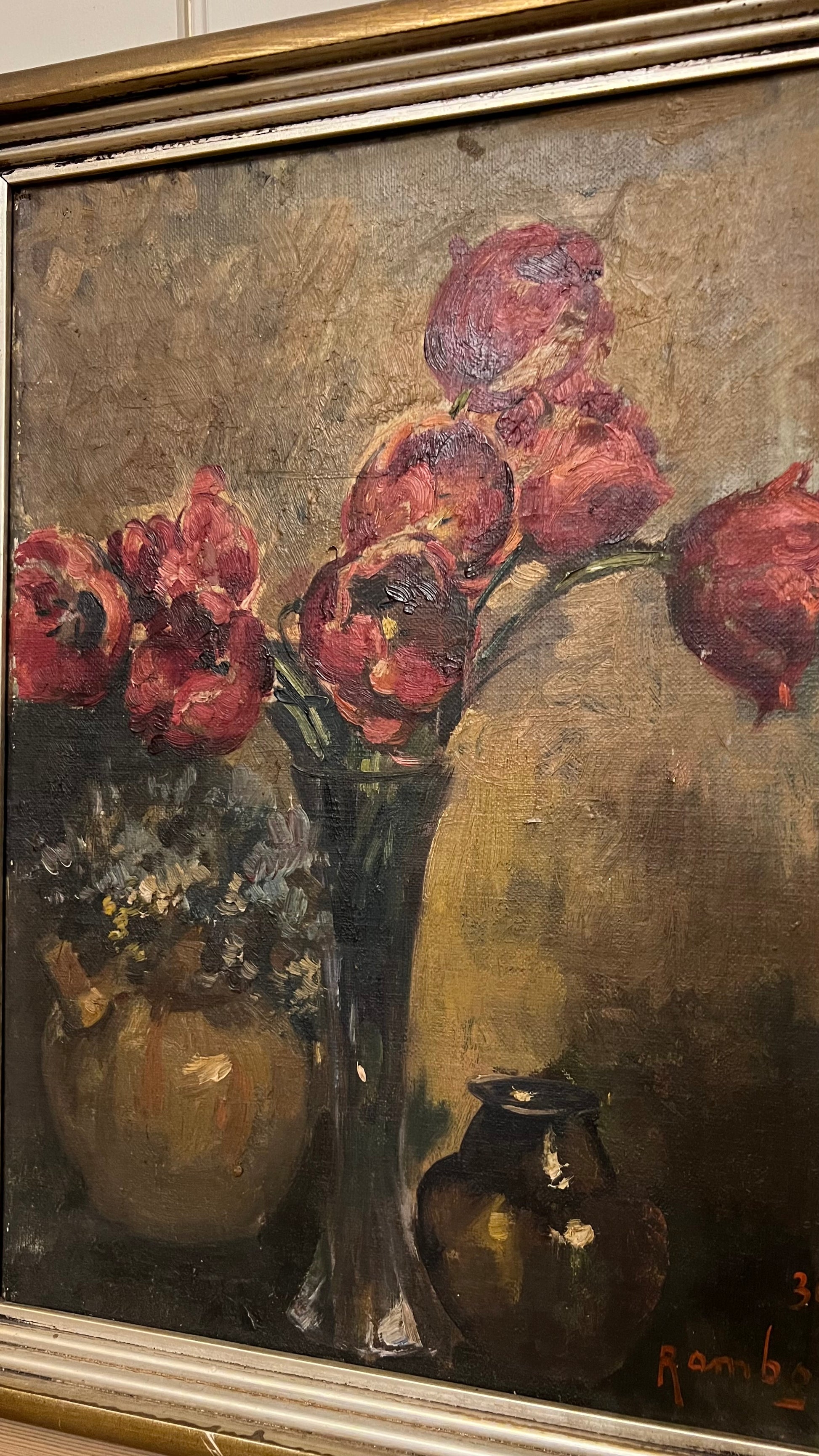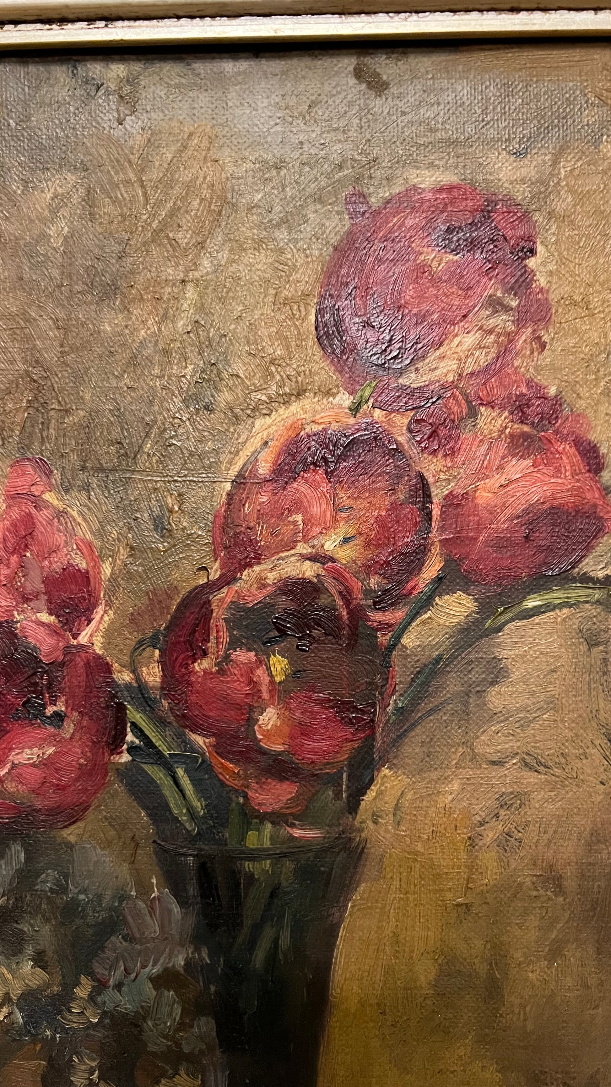 This moody oil on board painting depicts a vase of red tulips. The simple frame allows the focus to stay on the floral subject. This painting also showcases heavy brushstrokes with buildup of paint. It is signed and dated in the bottom right and is an original Dutch painting. There are no signs of repair to the painting.
