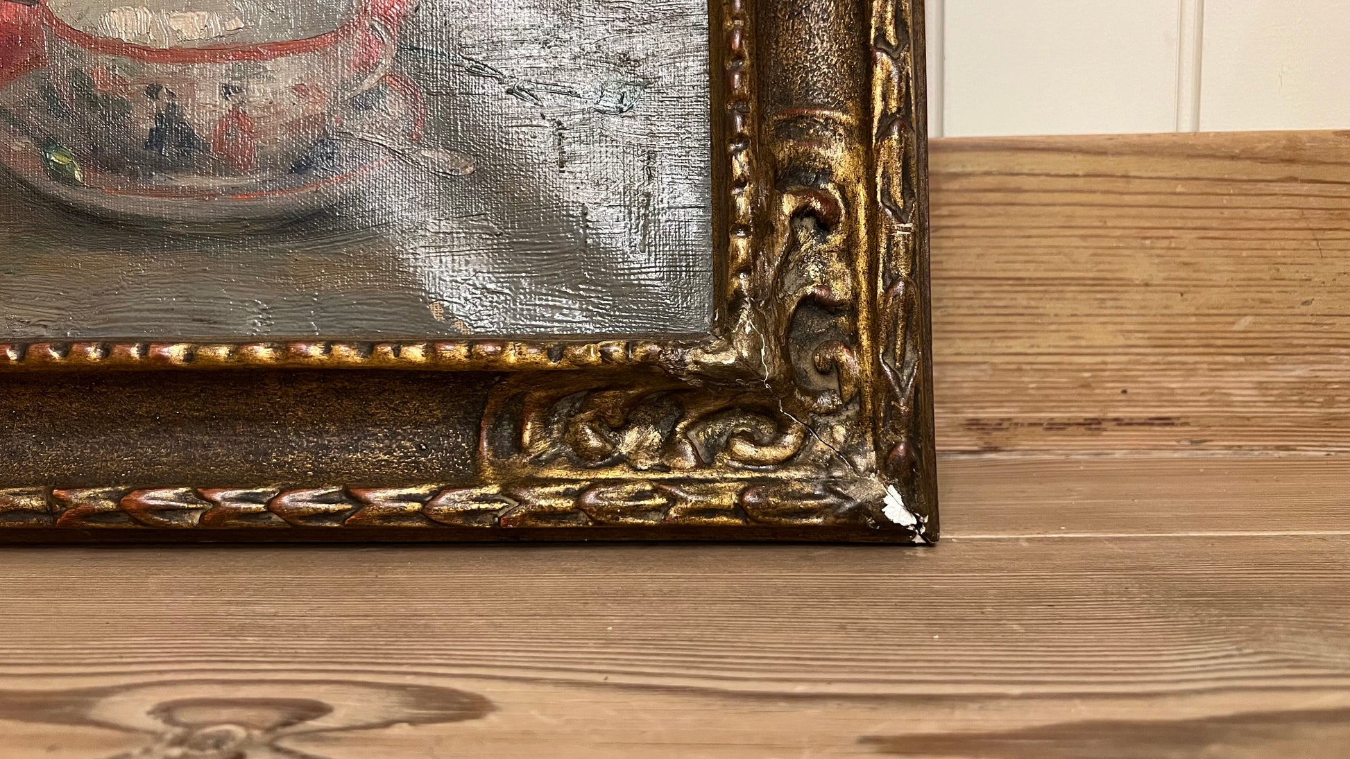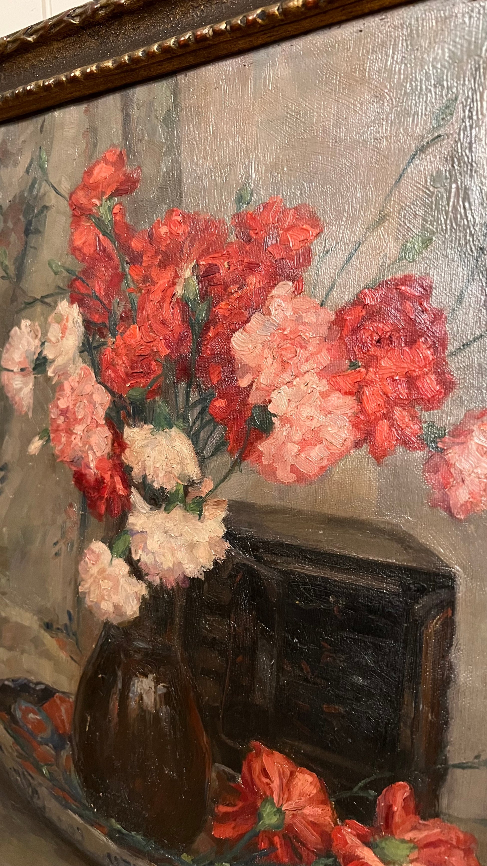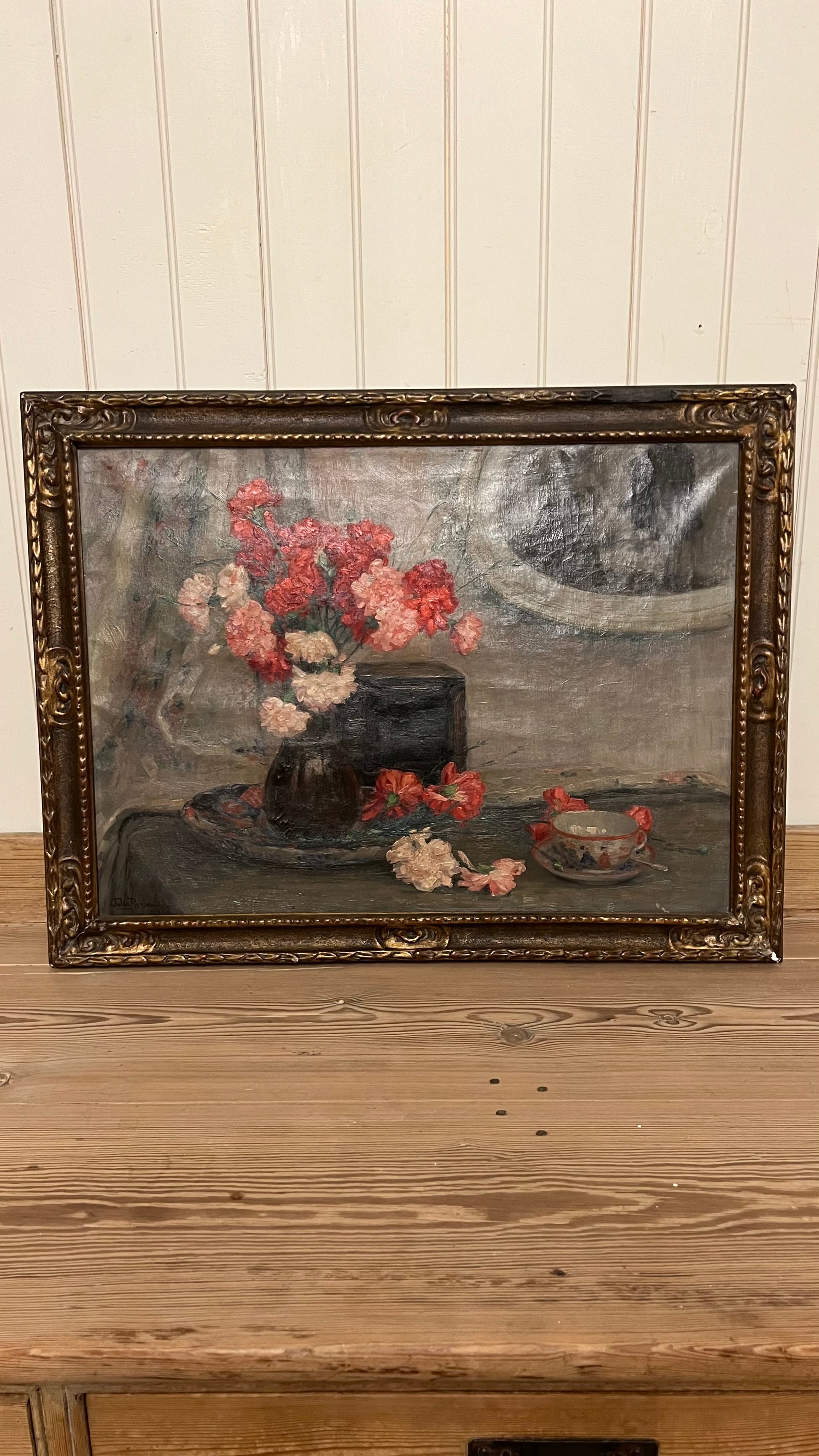 This painting depicts a vase with red, pink, and white carnations on a table. The background also contains a teacup and saucer, a portrait on the wall, with drapes off to the left. The muted background showcases the bright colors of the flowers to draw the eye in. There are two old repairs to the canvas as seen on the backside. There is one small point of plaster loss on the bottom right corner, as well as a missing border on the top right corner (painted over). This painting is an original French oil on canvas, unsigned.