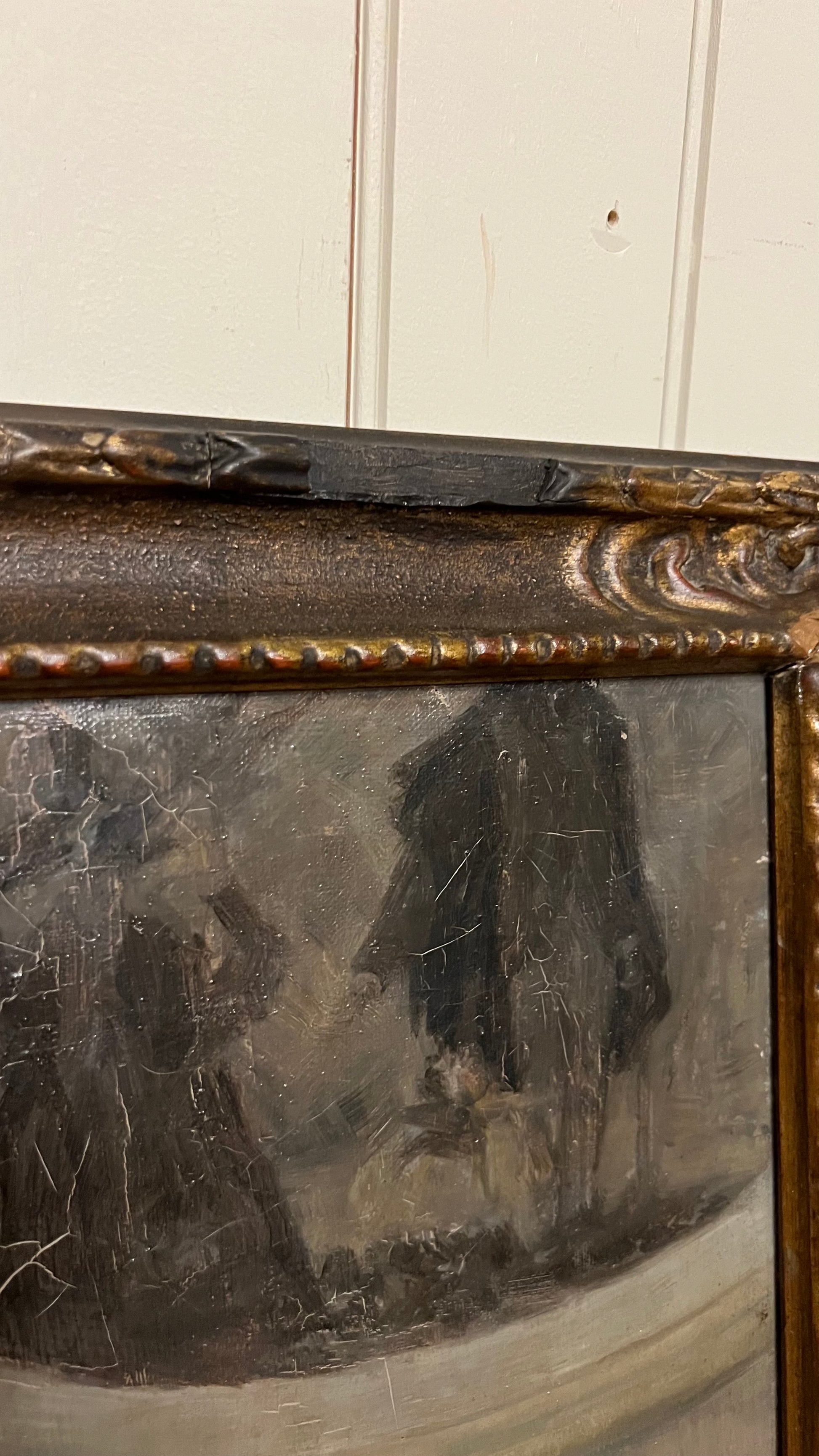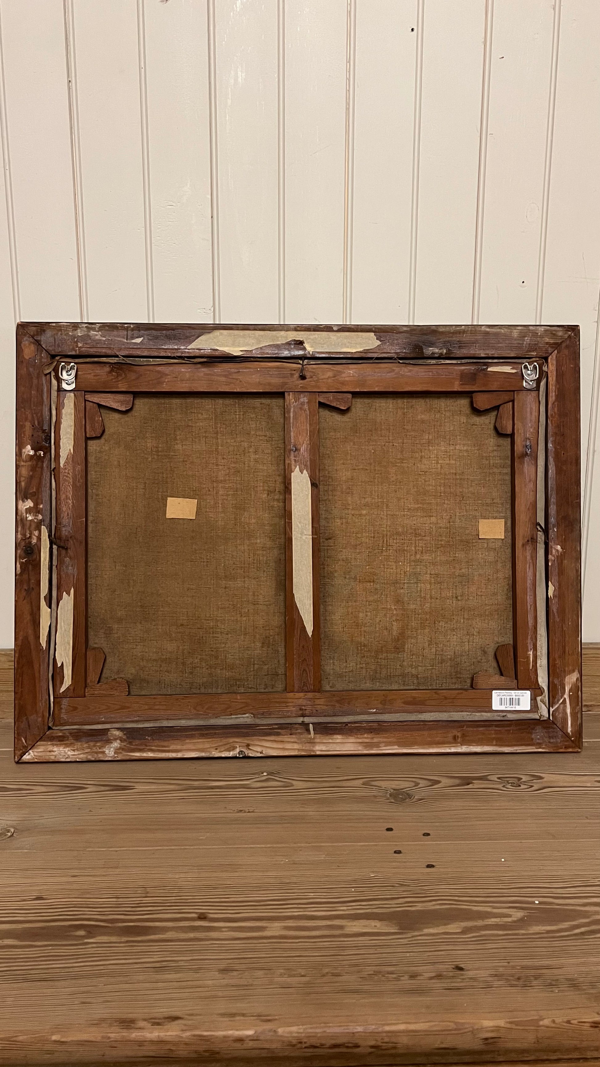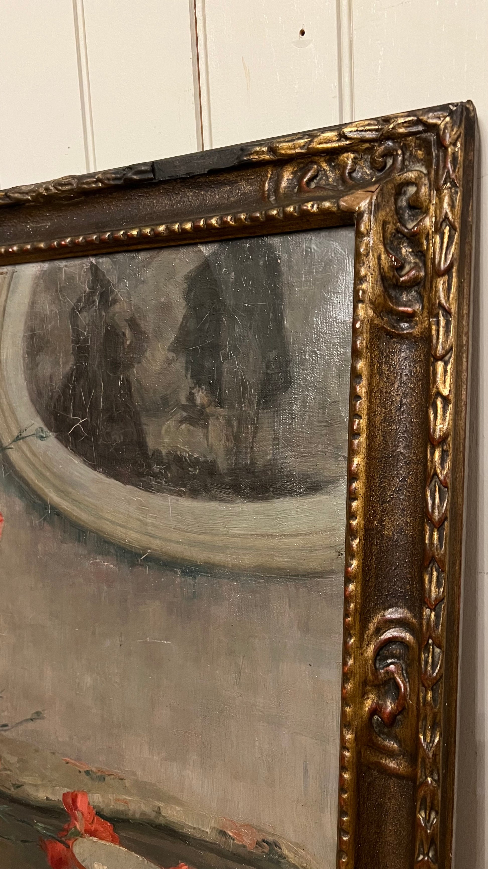 This painting depicts a vase with red, pink, and white carnations on a table. The background also contains a teacup and saucer, a portrait on the wall, with drapes off to the left. The muted background showcases the bright colors of the flowers to draw the eye in. There are two old repairs to the canvas as seen on the backside. There is one small point of plaster loss on the bottom right corner, as well as a missing border on the top right corner (painted over). This painting is an original French oil on canvas, unsigned.