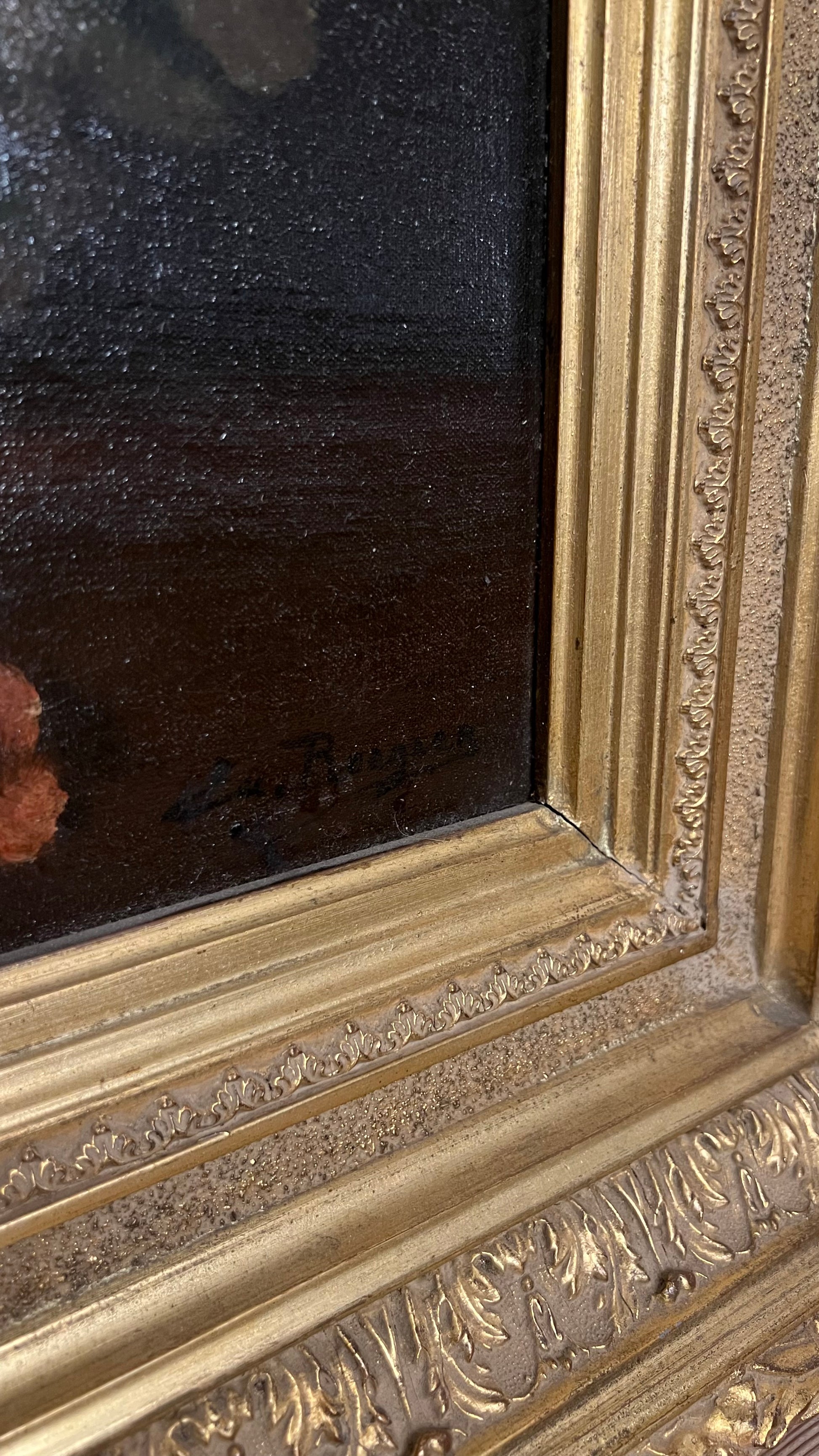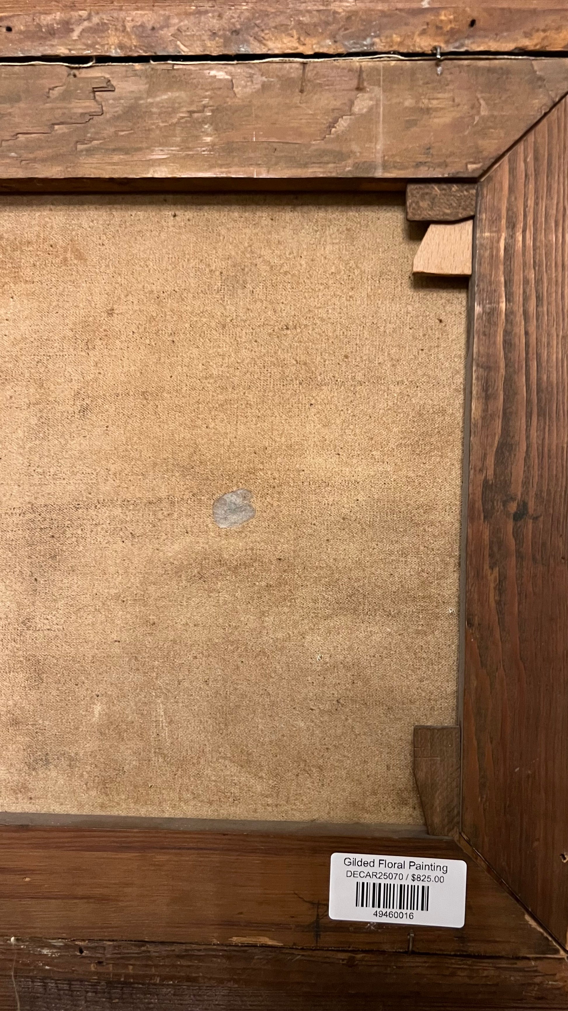 This painting depicts a bouquet of pansies in a vase with peaches off to the left. It is an original Belgian oil on canvas and signed in the bottom right. The black background contrasts both the subject and the thick gilded frame. The frame has substantial weight to it and is most likely original to the artwork. This painting is in excellent condition with no sign of repair to the canvas. There is slight plaster loss on the top left corner.