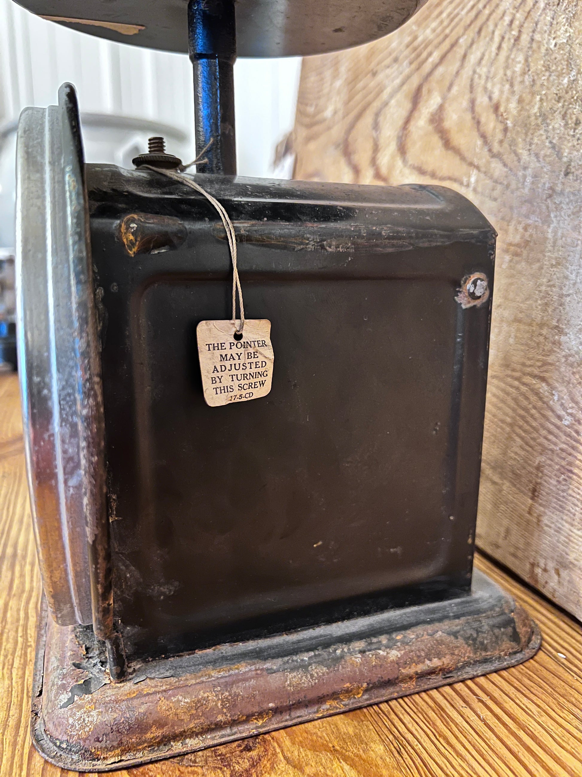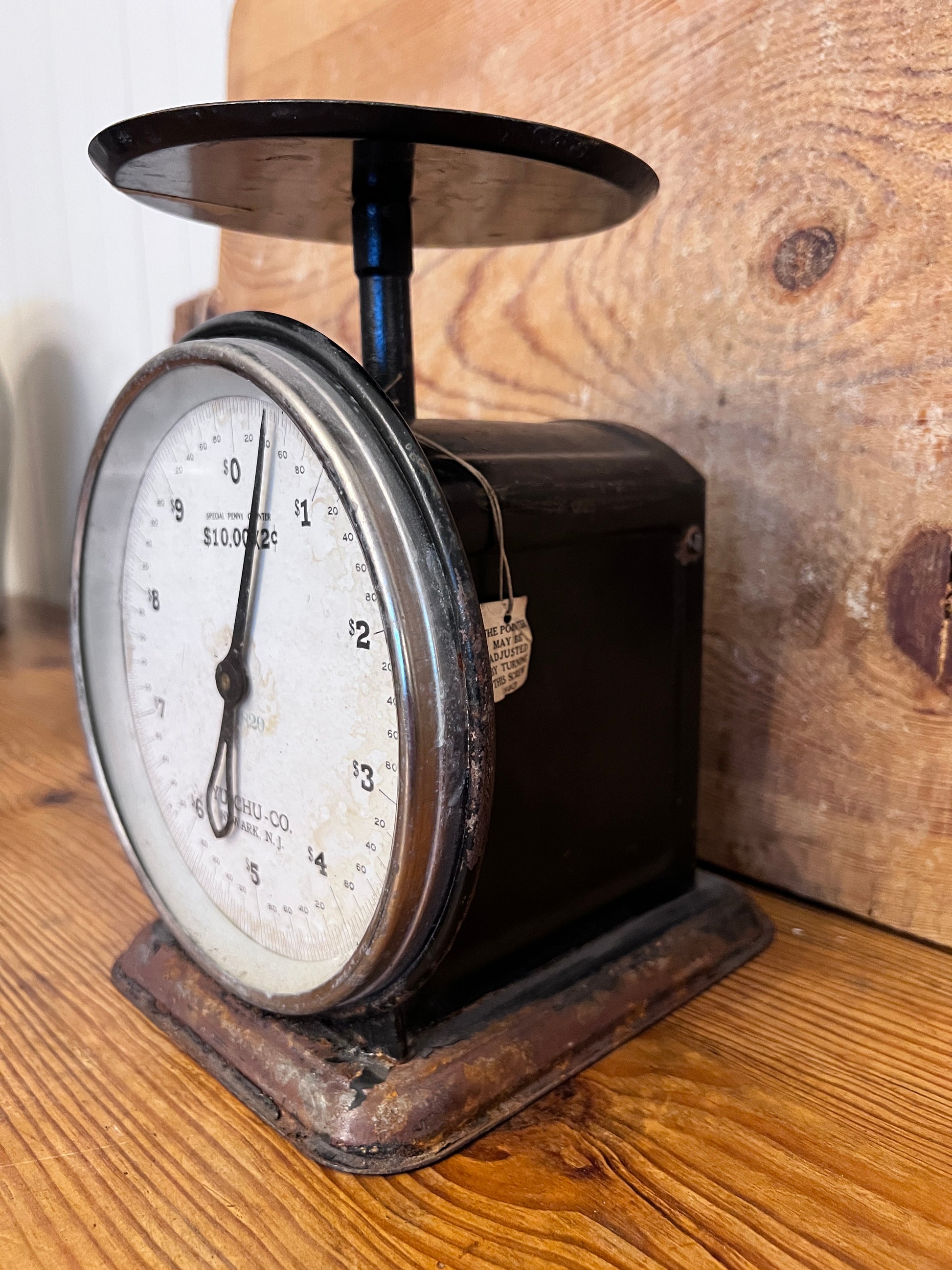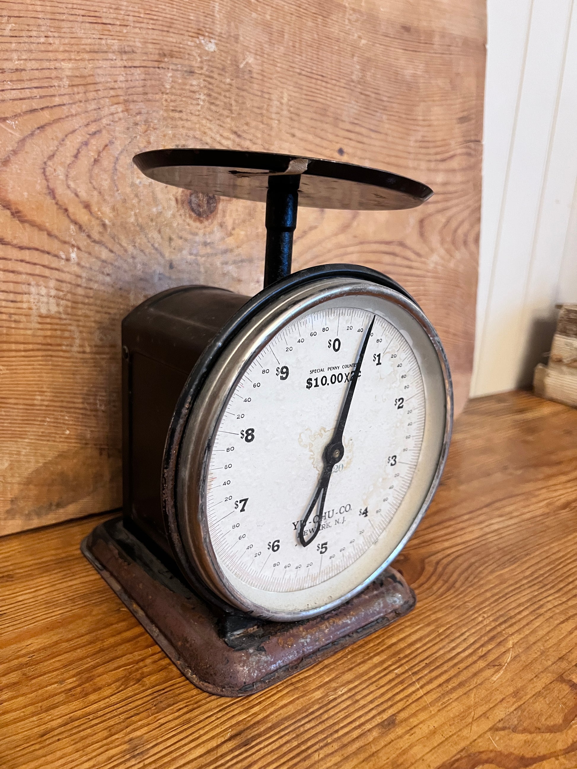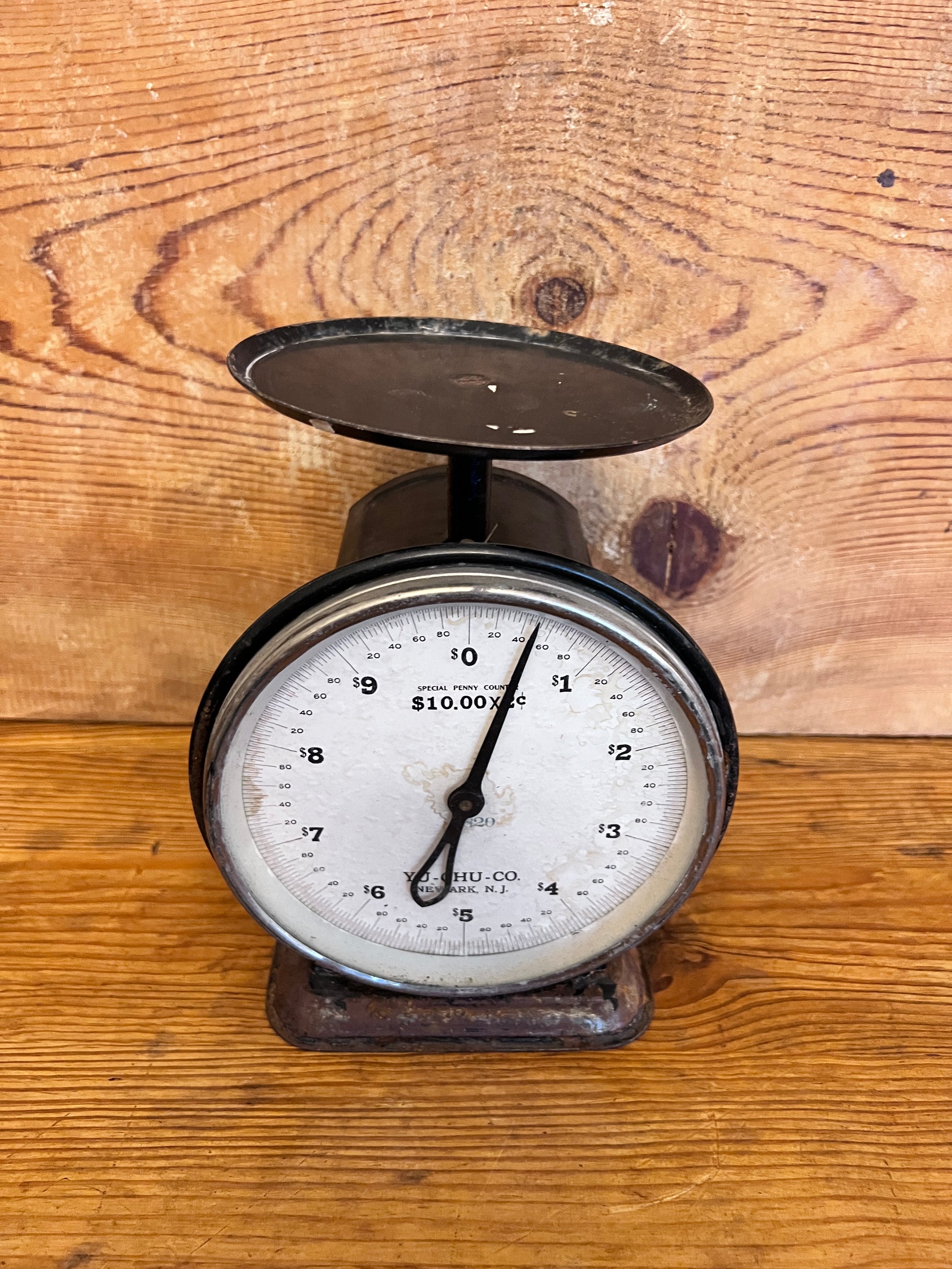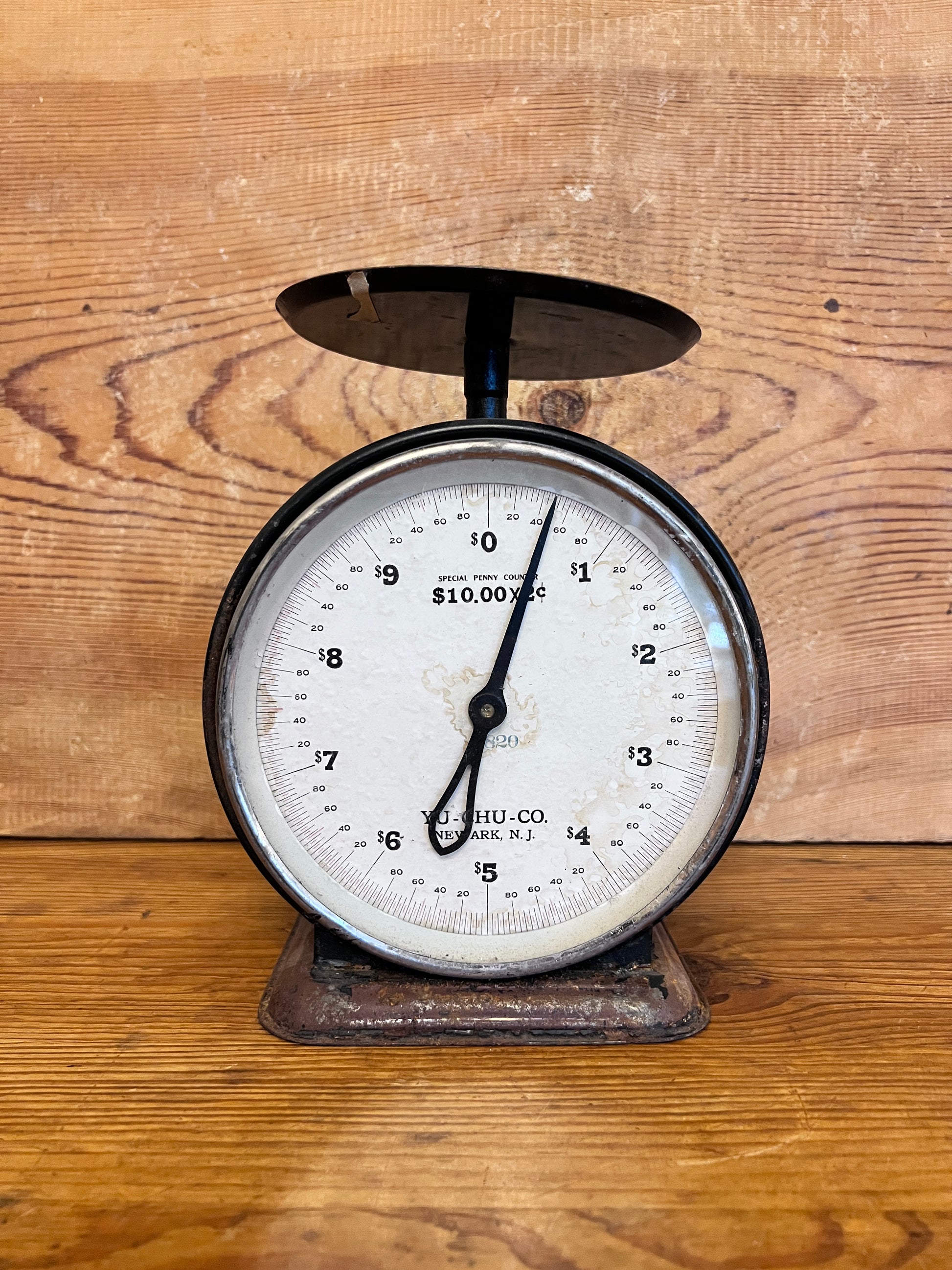 Larger than most, this Yu-Chu-Co. scale has wonderful chippy black paint throughout. The numerical face plate is in good legible condition with minor staining on the surface.