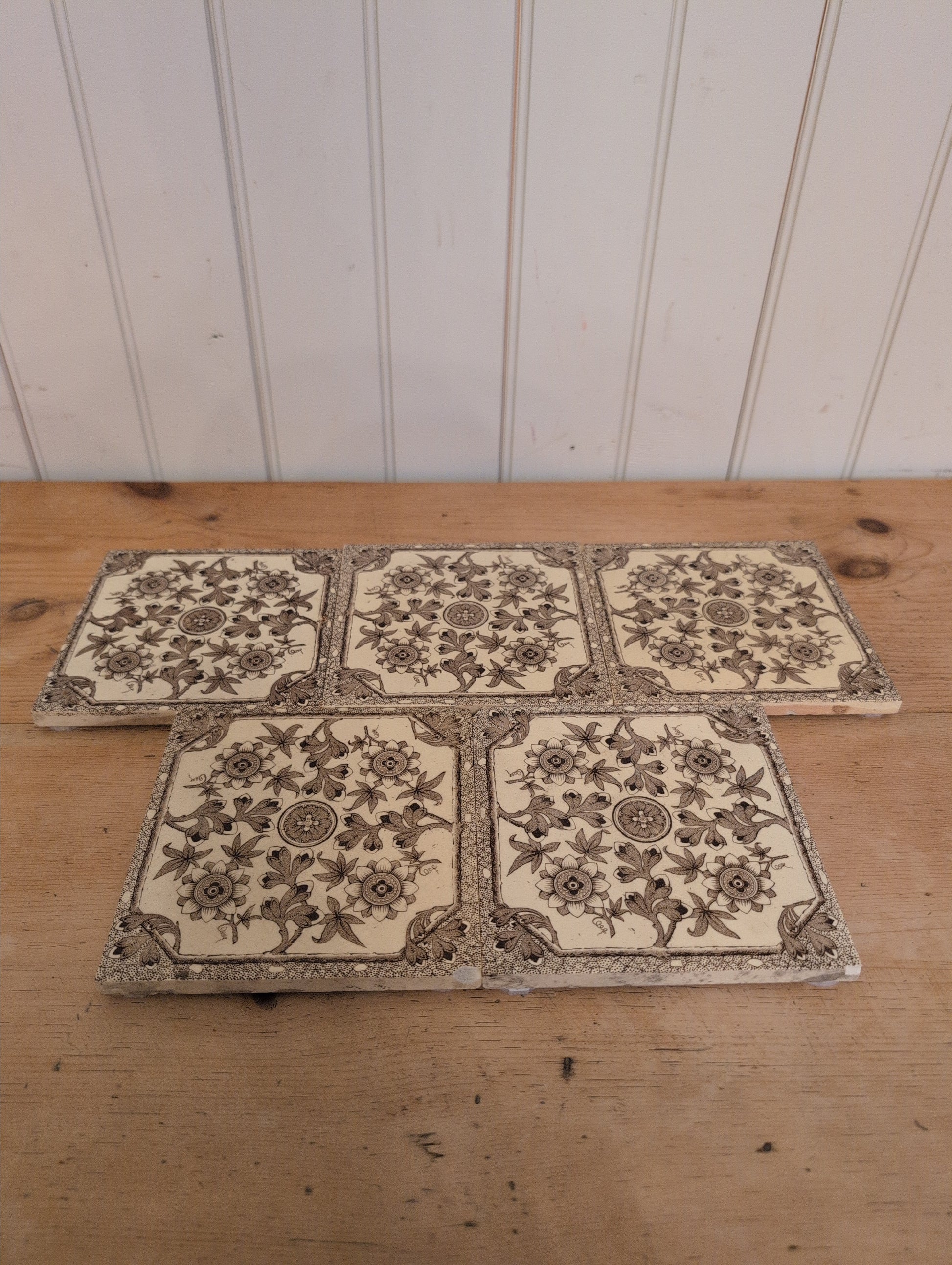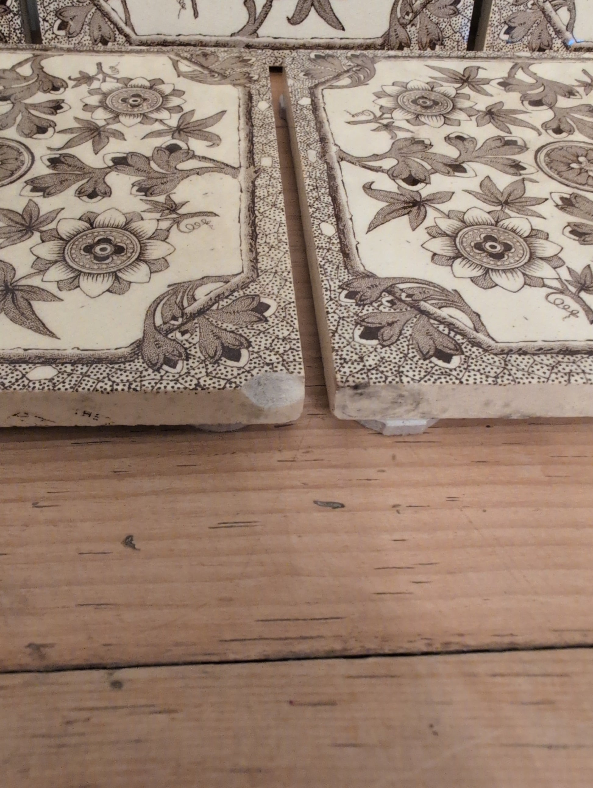 Victorian era fireplace surround tiles. 5 tiles in this pattern are available at time of listing. Minor chips present on most.