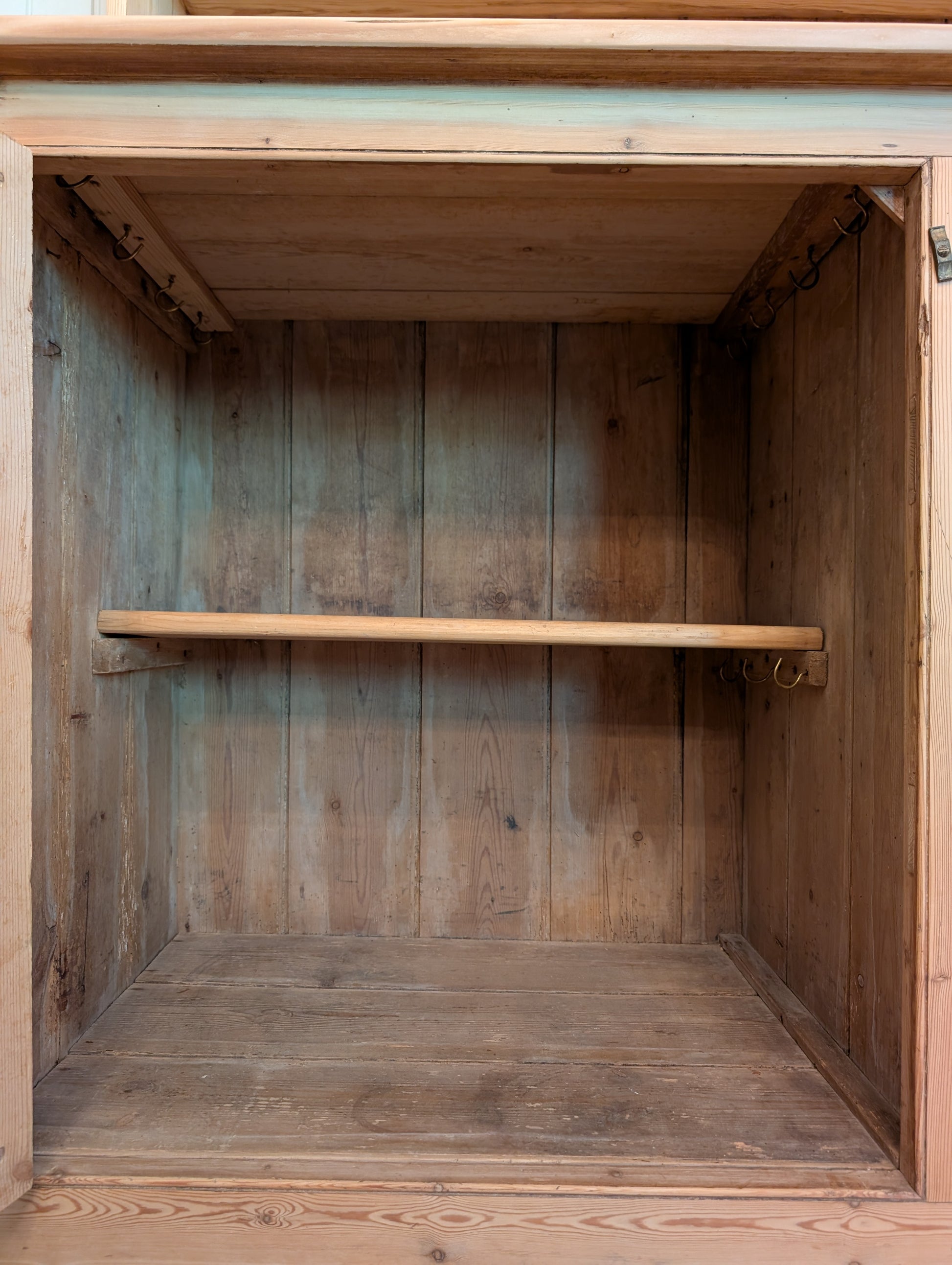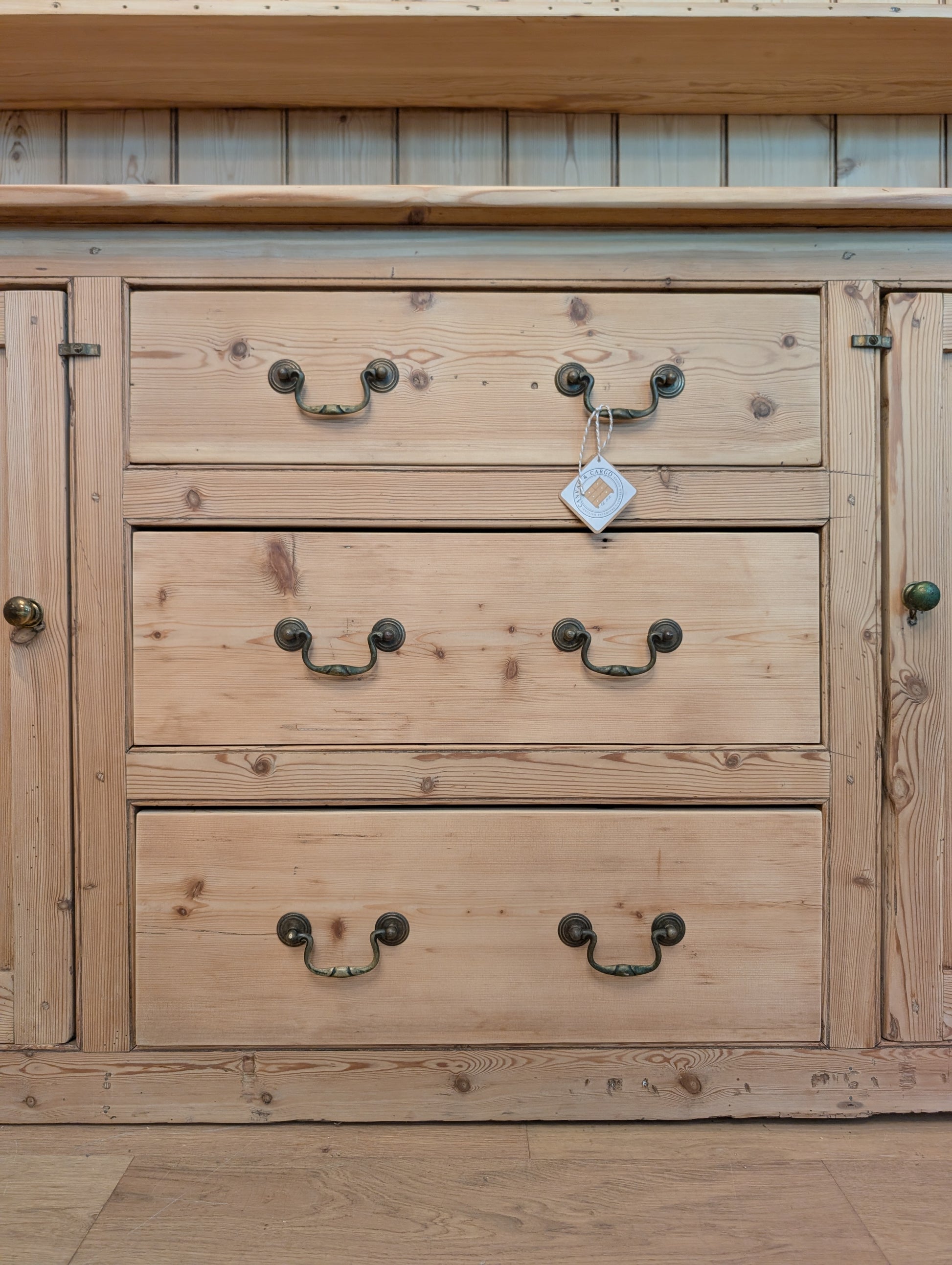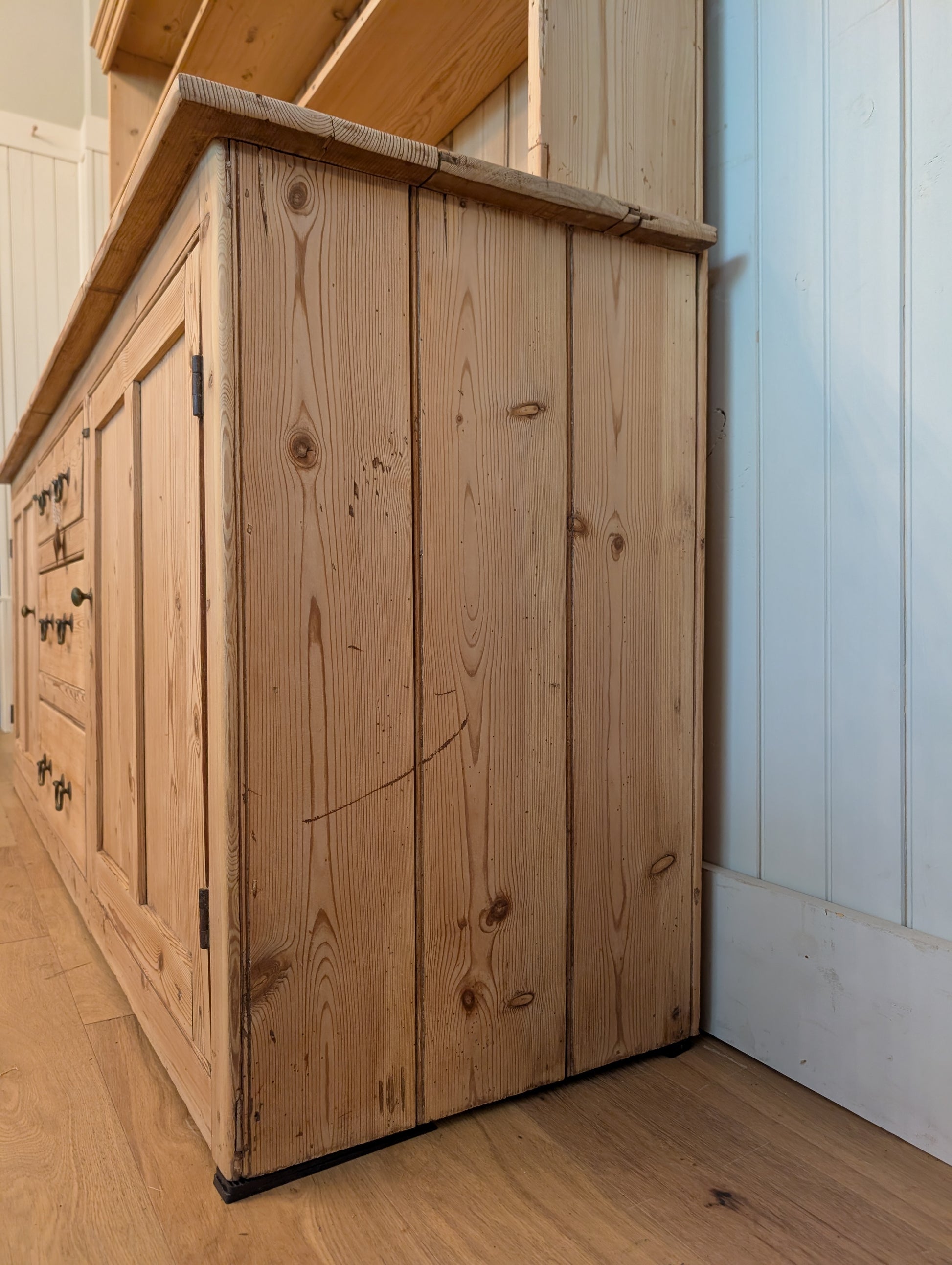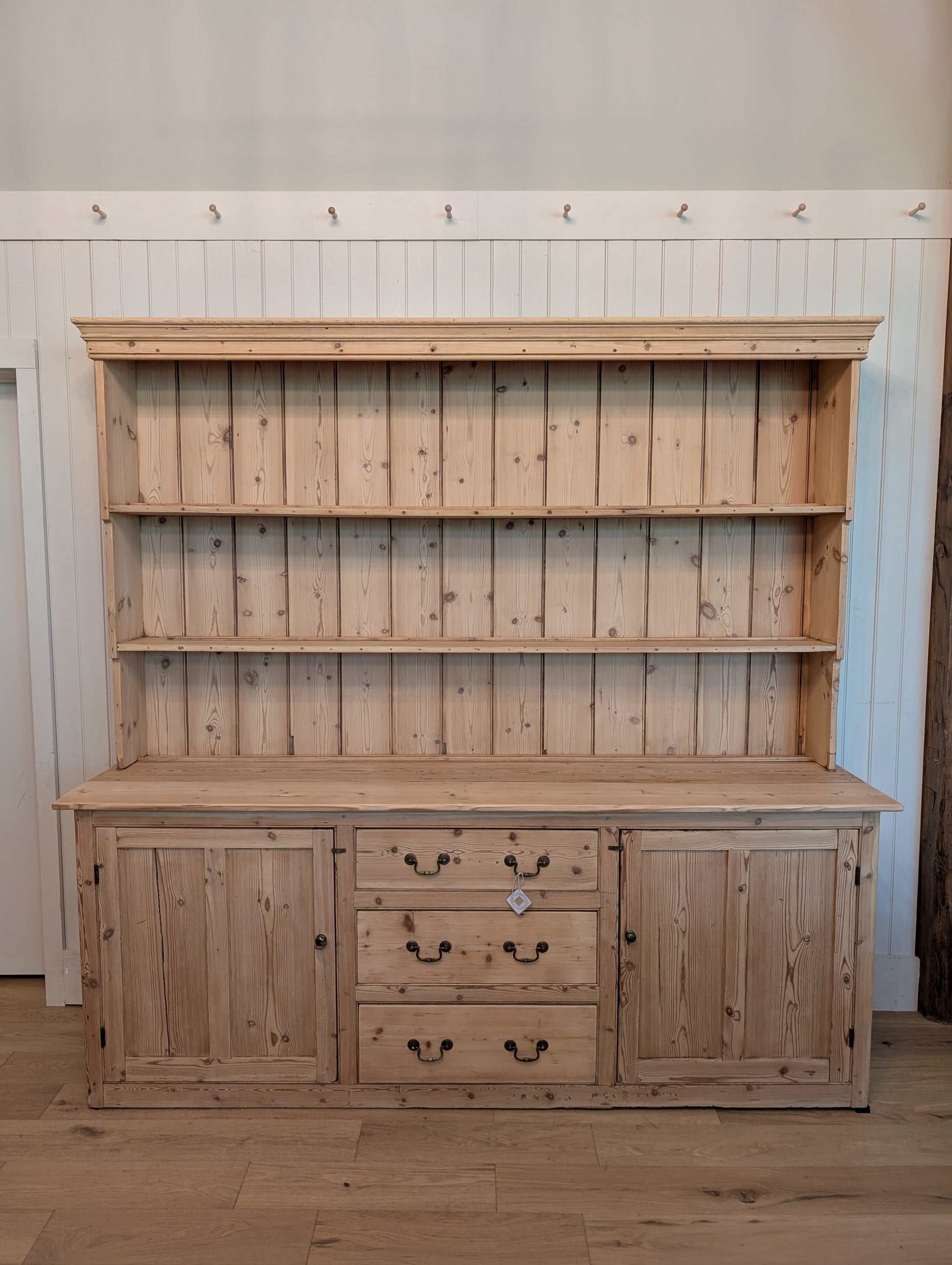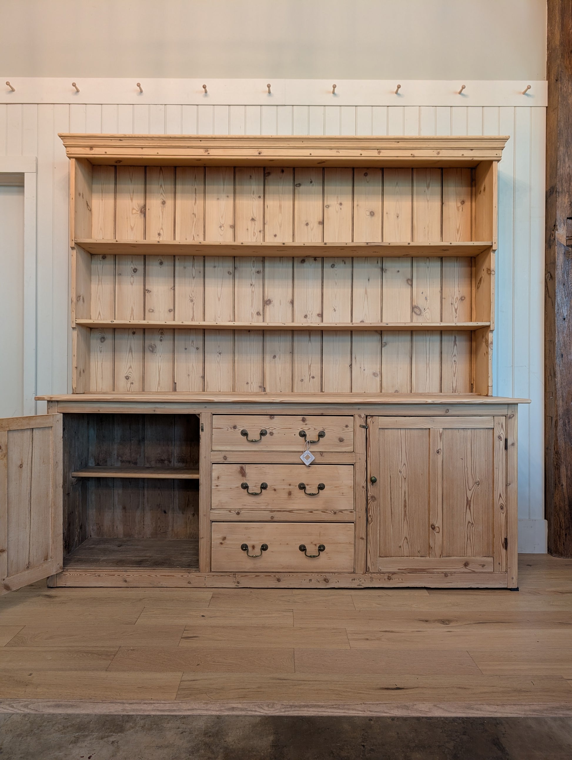Once covered in a thick orange shellac, this English pine hutch has been fully stripped and returned to its original coloring. We have finished this in a clear wax to retain its light coloring. At over 7ft wide, there is an abundance of storage space in the lower cupboard doors and drawers. The saddle bracket hardware is brass in finish and original to the piece. The top of the hutch is graduated in design and has two spacious shelves, both of which have plate rails. The top of the base has a plate rail as well, allowing for additional display space. This hutch is two pieces.
