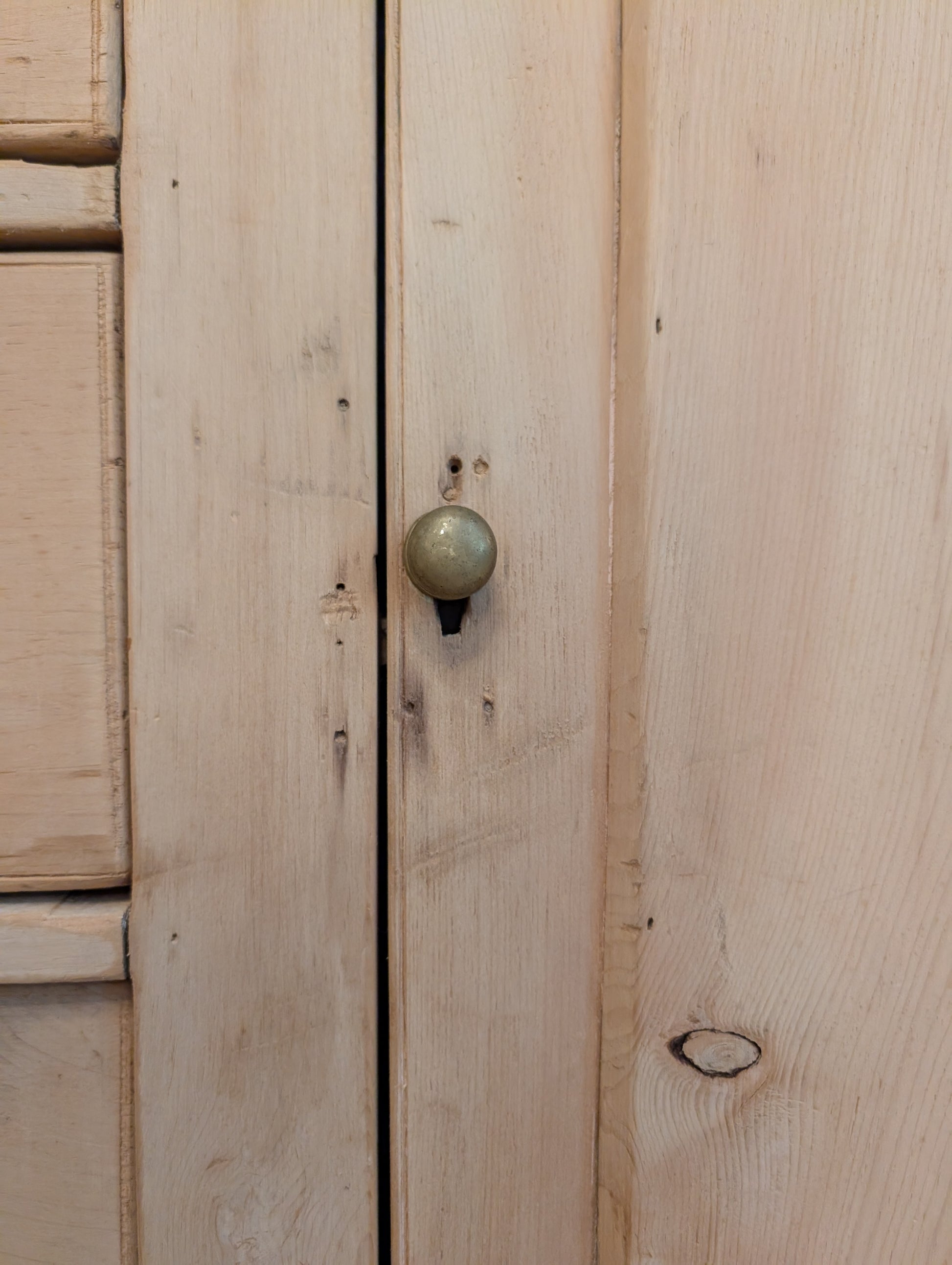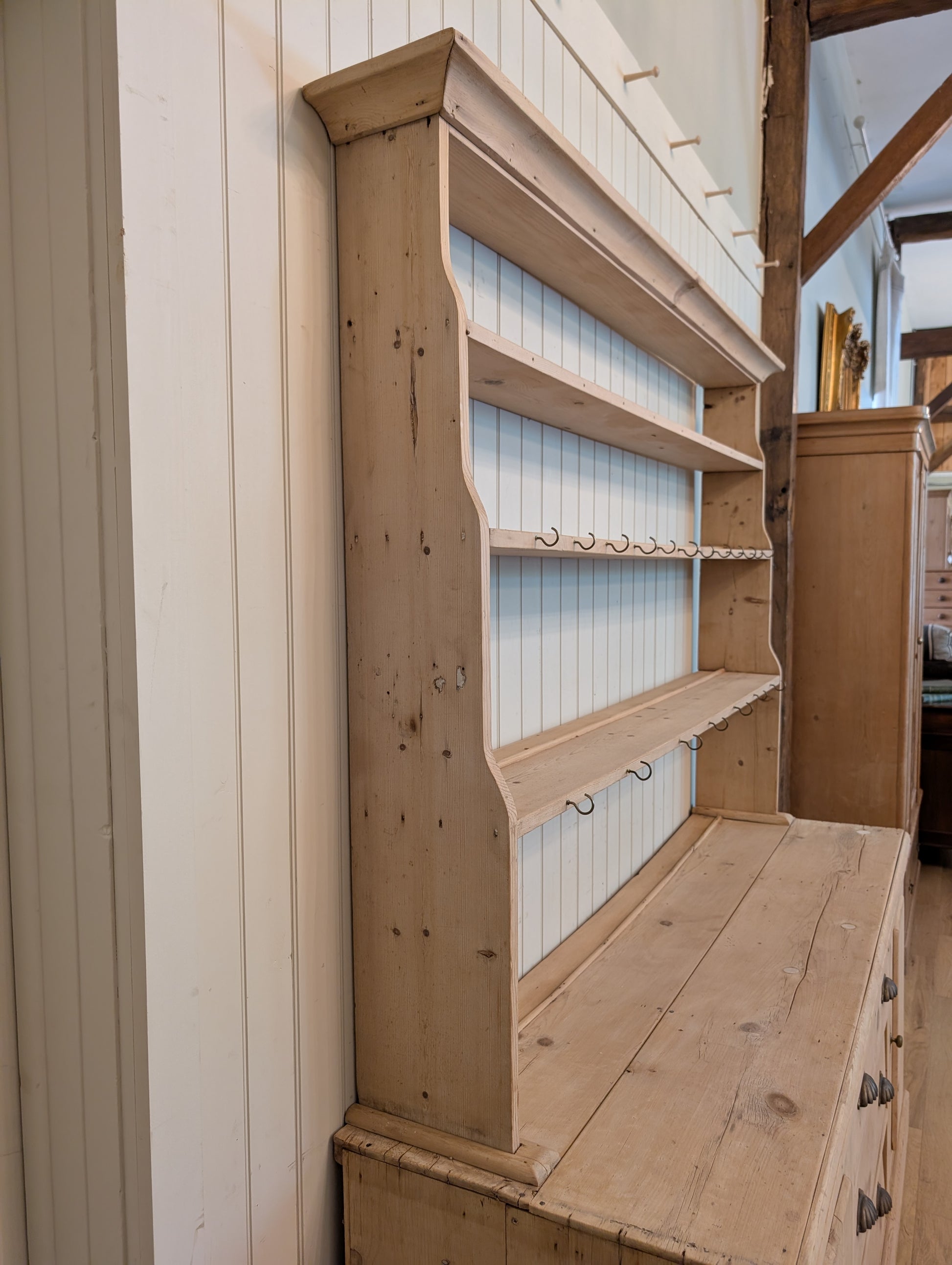 A fully stripped English pine open shelving hutch. The finish on this is extremely light and appears to have been bleached. There is no wax on this piece, adding to the mellow coloring. The base has two cupboard doors, both of which have one internal shelf. There are three middle drawers with brass hardware, all with hand cut dovetails and smooth gliding. The top has 3 graduated shelves and can be affixed to the wall if needed. Please note the slight deflection on top of the base, as is common with older stripped pine pieces.