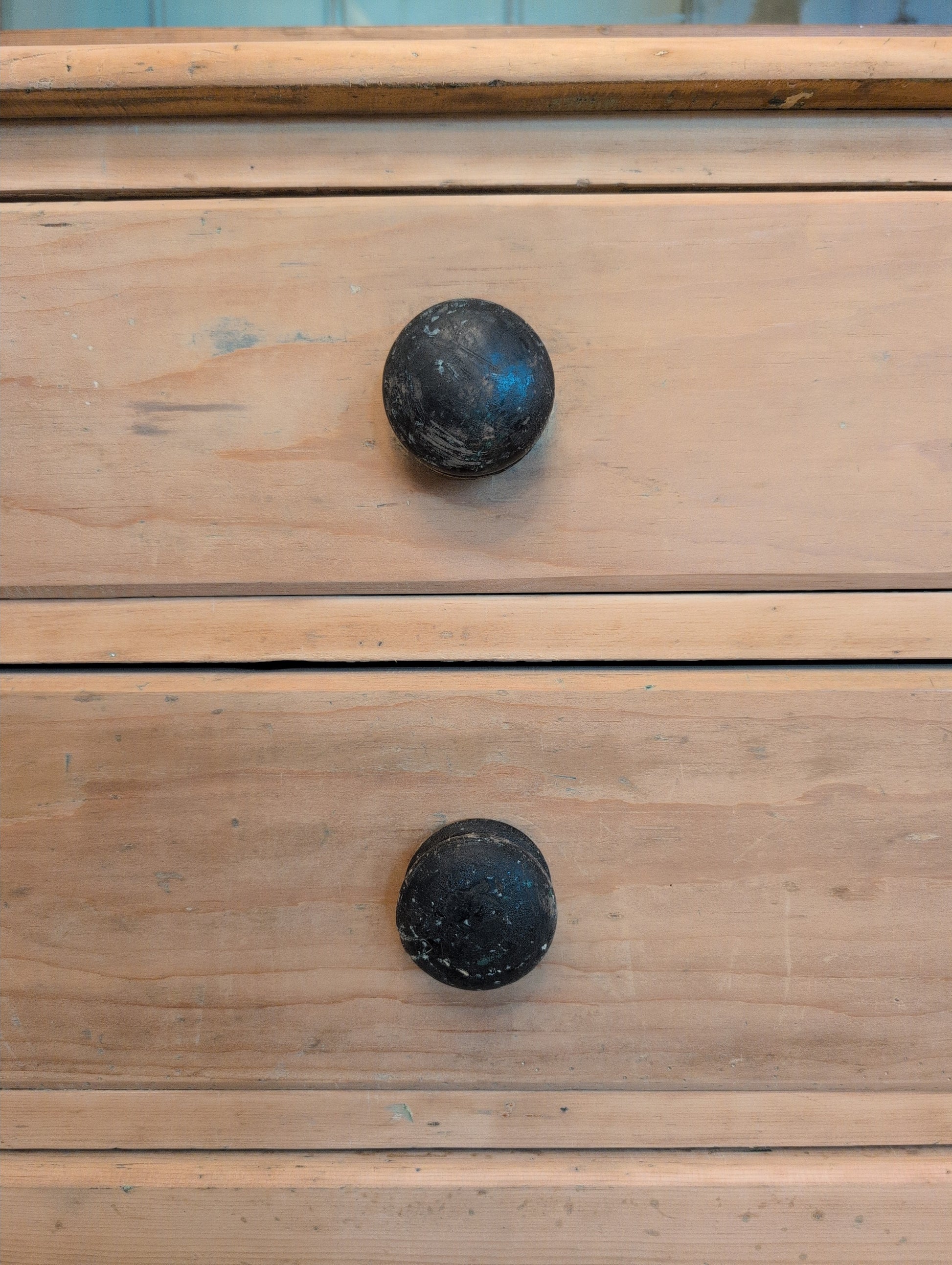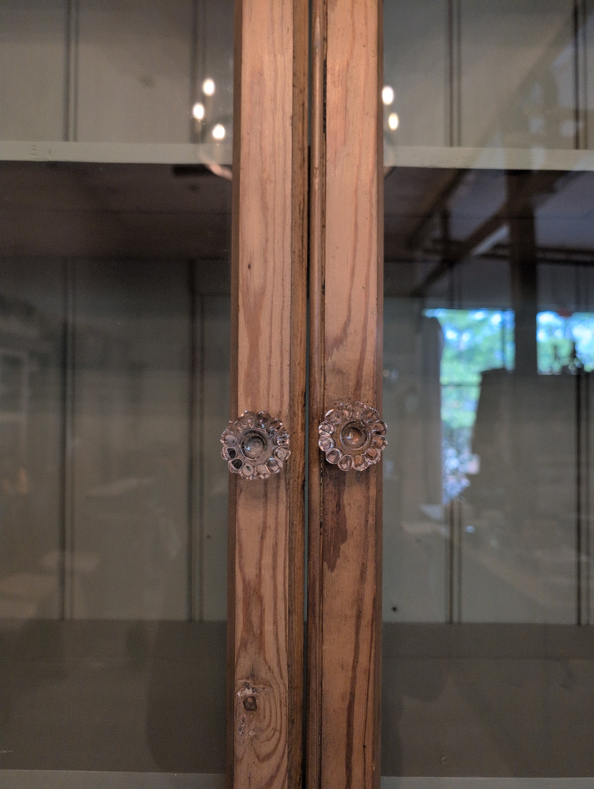 A proper tall, 2 piece English pine marriage hutch. The base and top are not original to each other, rather a marriage of two units that compliment each other quite well. We stripped the paint off of the base, giving it a slightly different finish than the top. We happen to love the way the two compliment each other. The base has two impressive glass doors, a mid green tone interior, and subtle arching at the top. The black knob hardware had many layers of white paint that was stripped back, with few remnants remaining. Overall, this piece is quite tall at just shy of 8ft. If you're looking for both storage, and plenty of display space, this piece would be ideal for you.