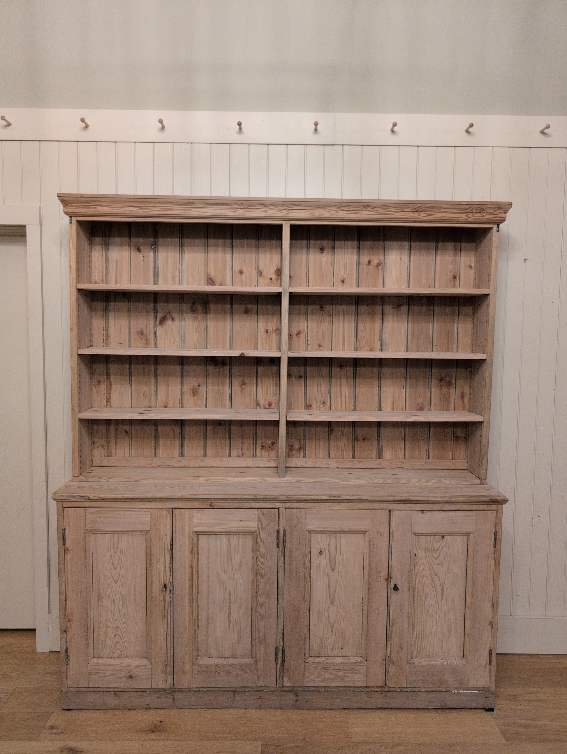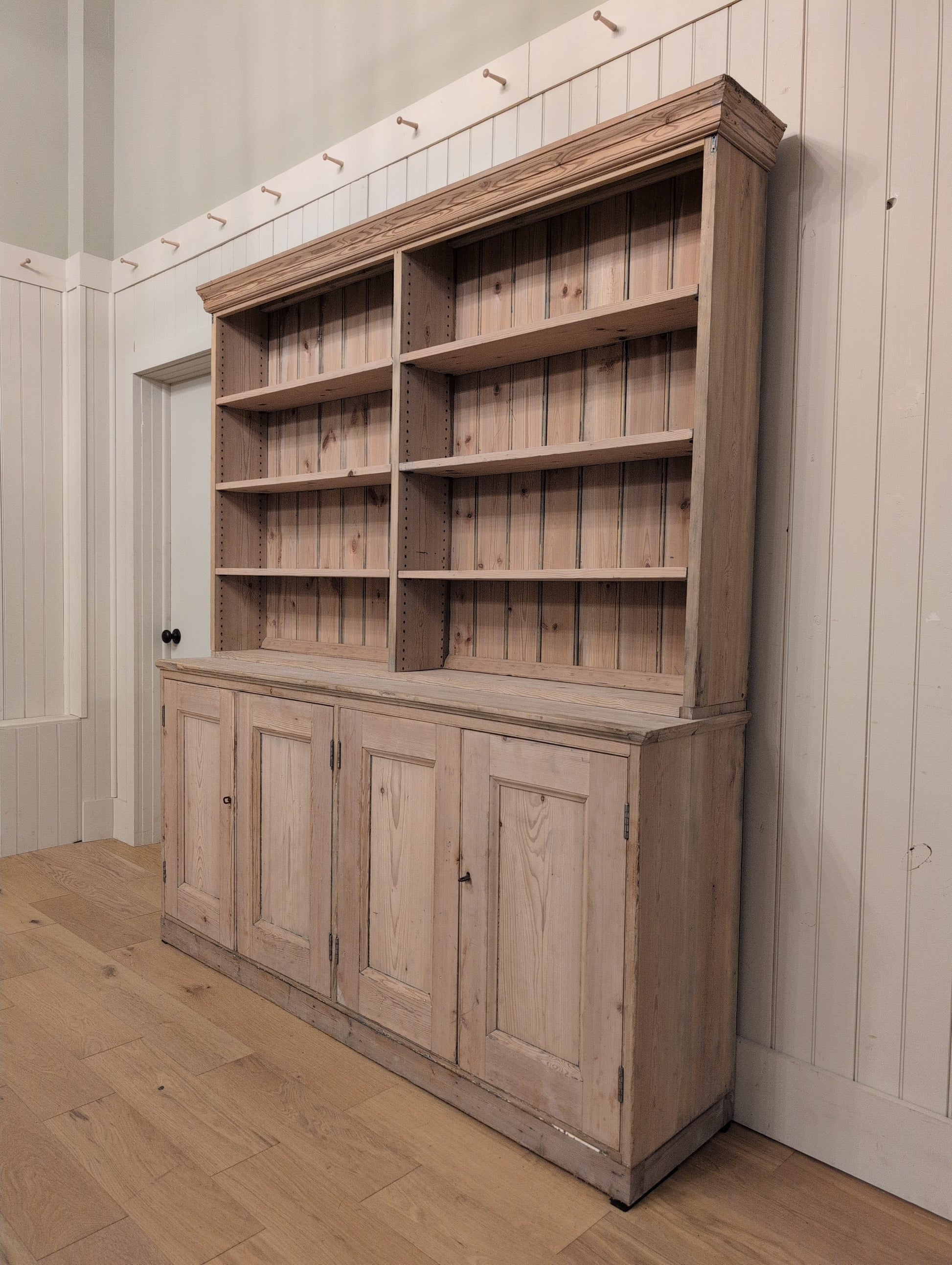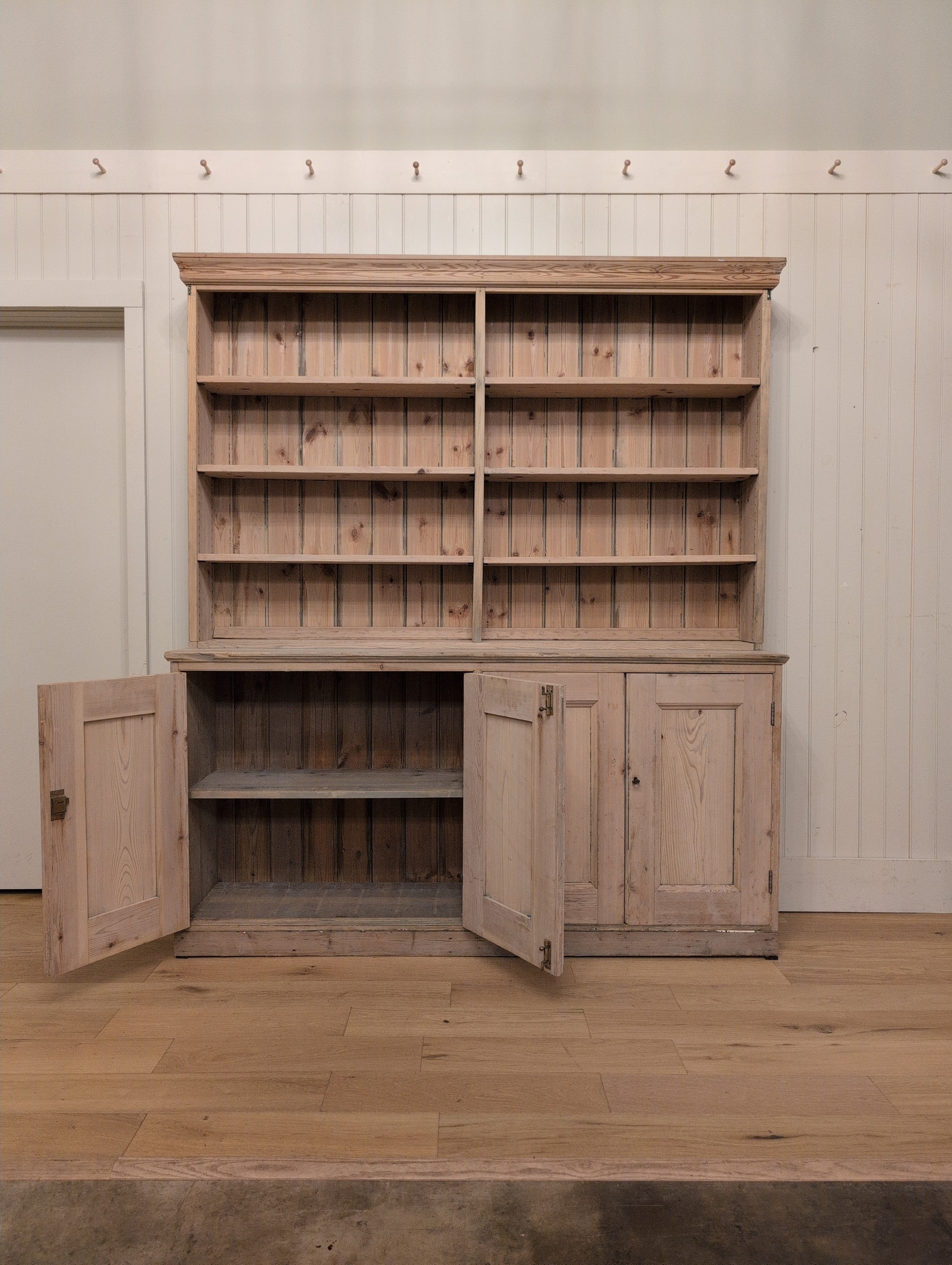 A fully stripped and exceptionally light in color English pine hutch. This pine hutch is two pieces. The bottom has 4 cupboard doors with one interior middle shelf, while the top has 3 adjustable shelves. The color on this hutch is incredibly light and has an almost bleached appearance without any wax. If you love the look of raw unfinished pine, this is the one for you.