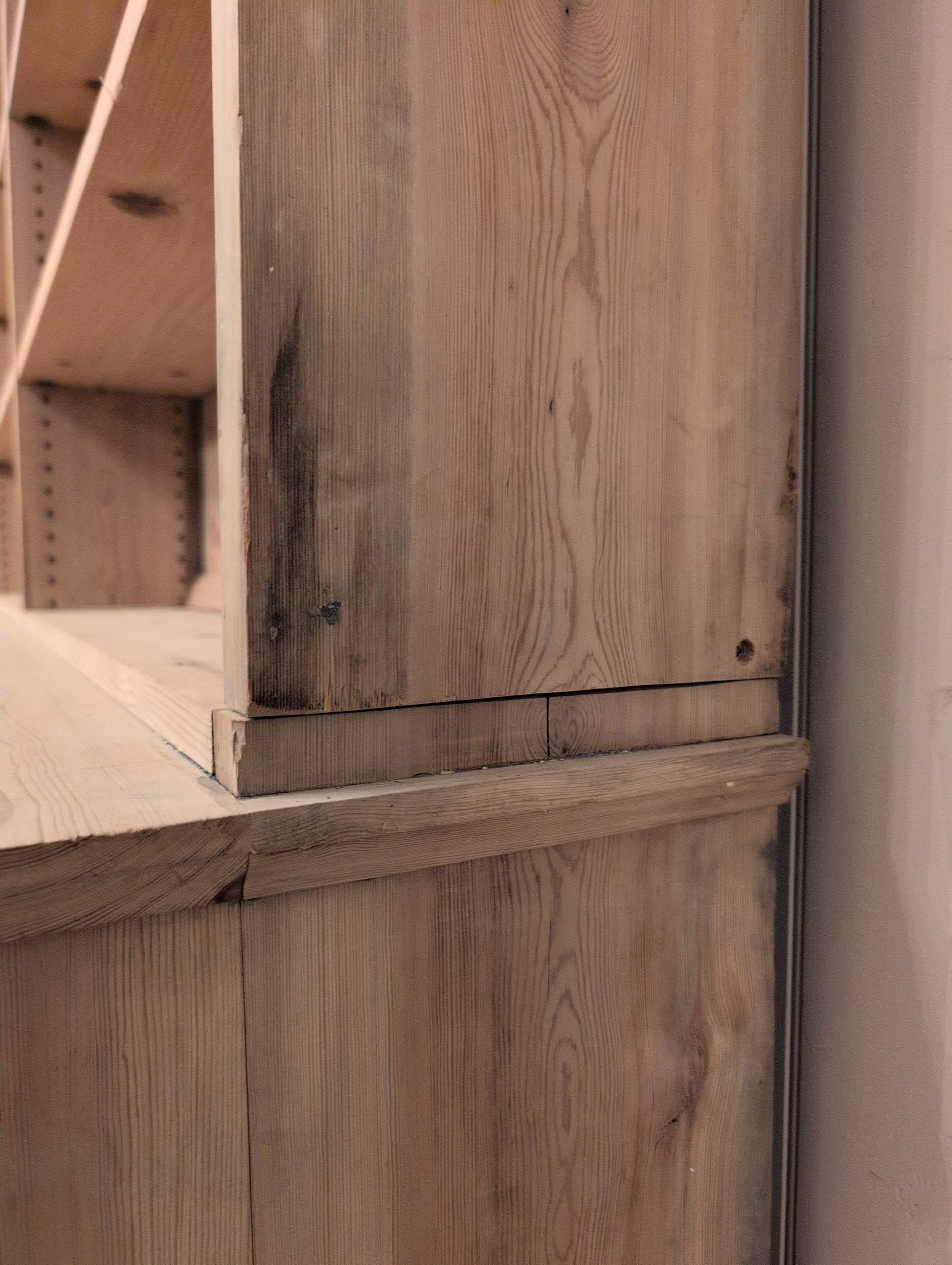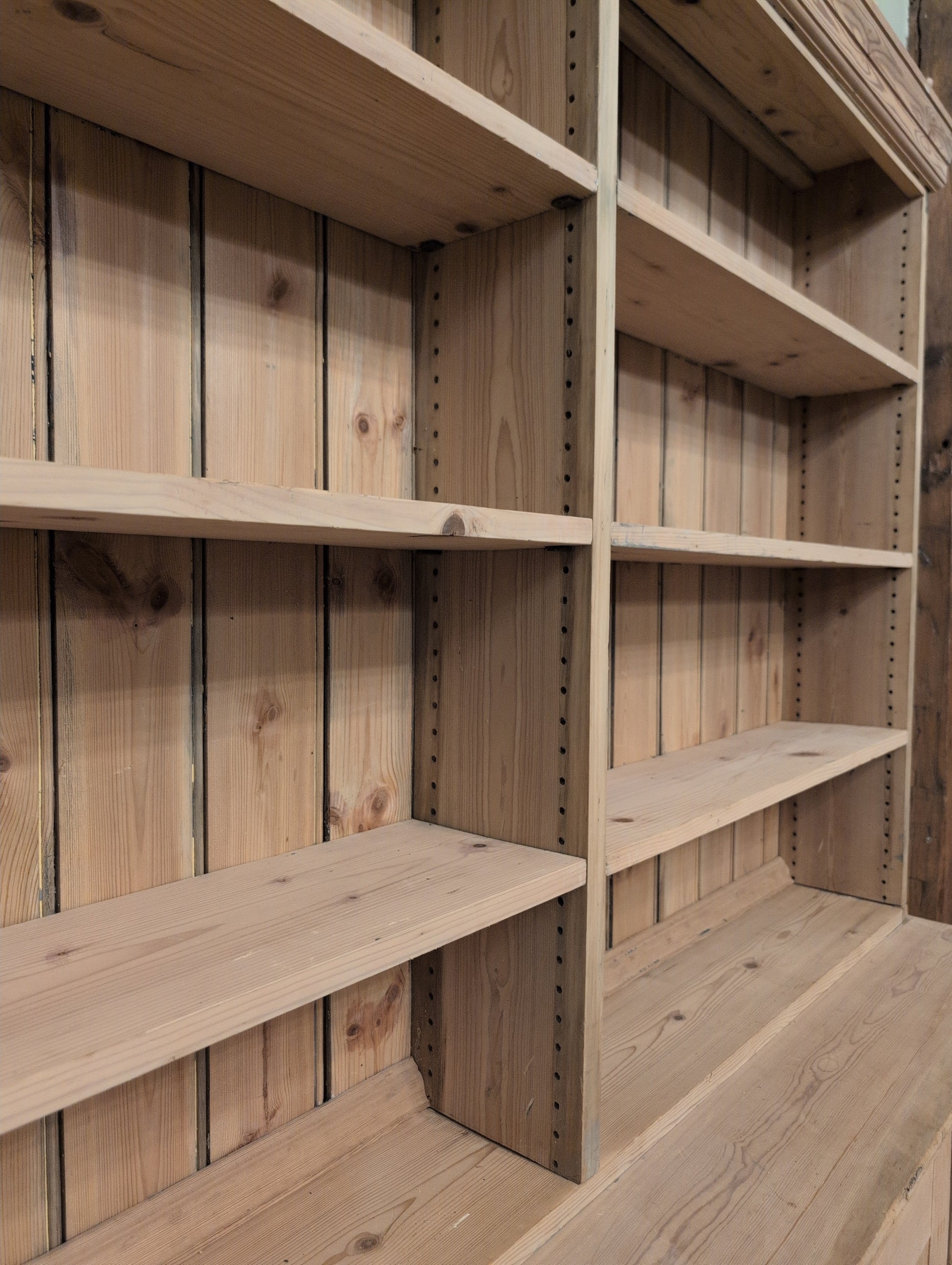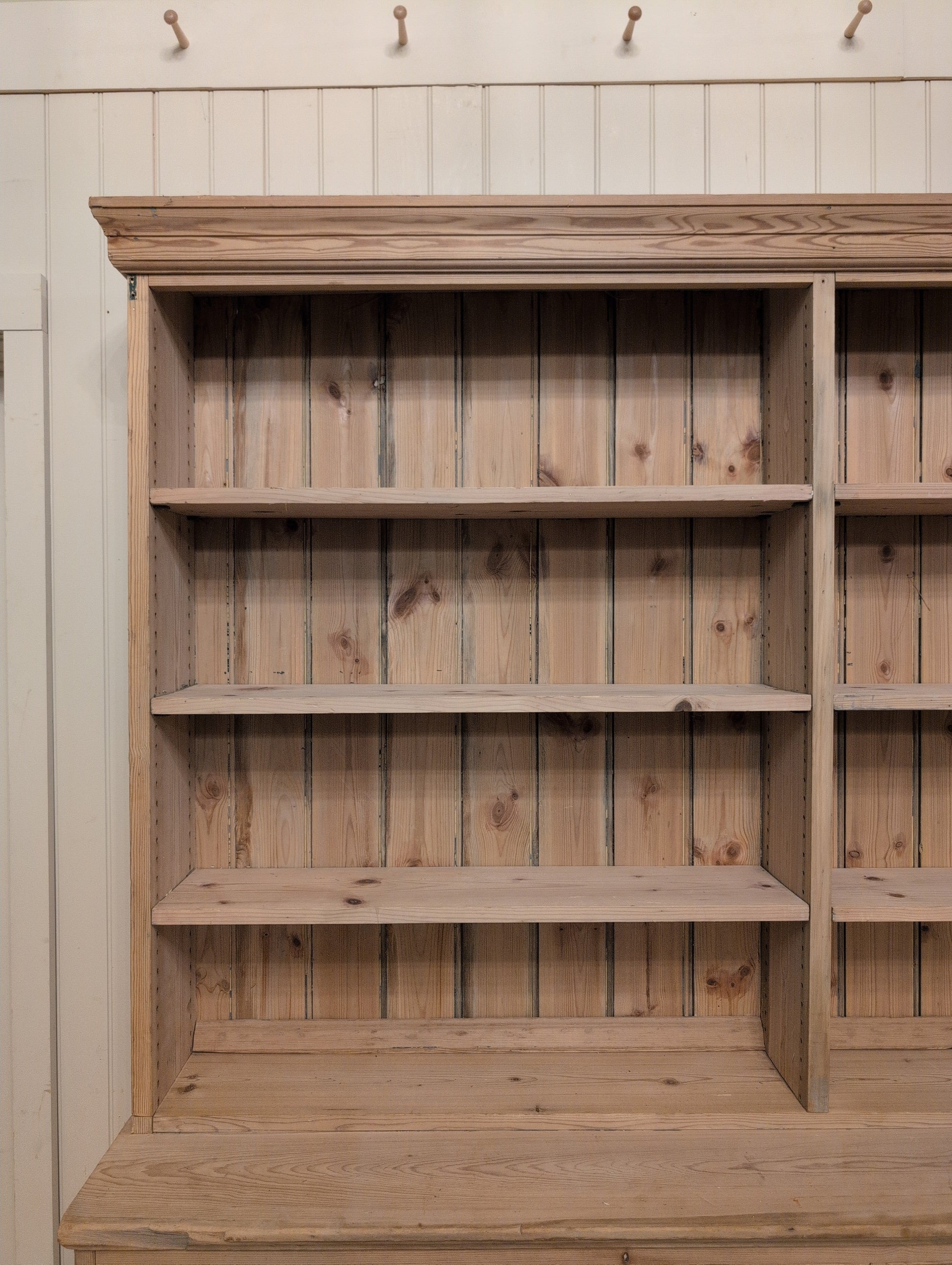 A fully stripped and exceptionally light in color English pine hutch. This pine hutch is two pieces. The bottom has 4 cupboard doors with one interior middle shelf, while the top has 3 adjustable shelves. The color on this hutch is incredibly light and has an almost bleached appearance without any wax. If you love the look of raw unfinished pine, this is the one for you.