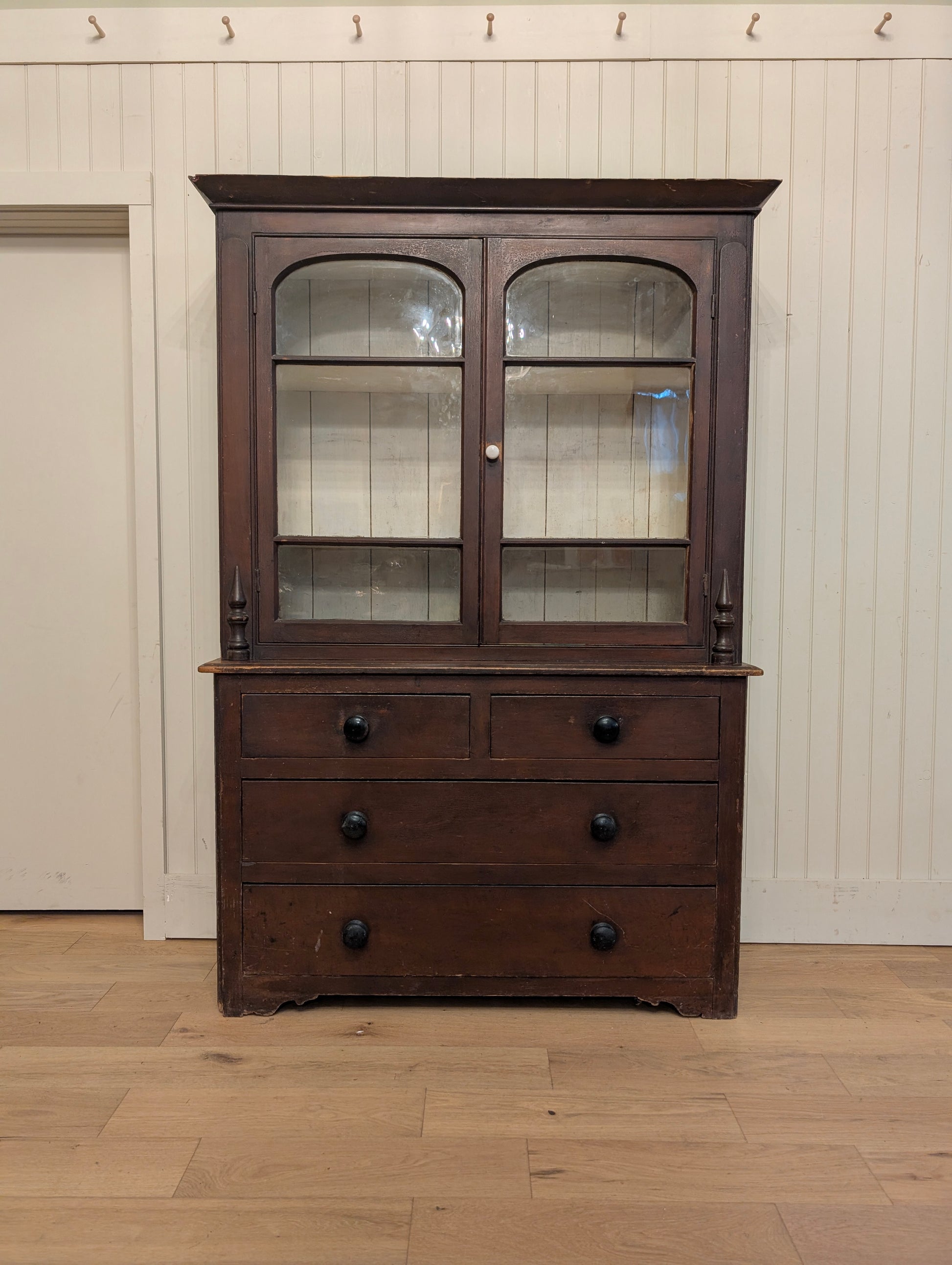 A rich and moody glass door hutch. In it's original paint, this pine hutch has a subtle arch to the doors with a white interior. The top rests on a traditional 2 over 2 base with wooden knob hardware. Please note the minor chip in the top cornice as shown. Pieces shown in the hutch are not included and used for staging purposes.