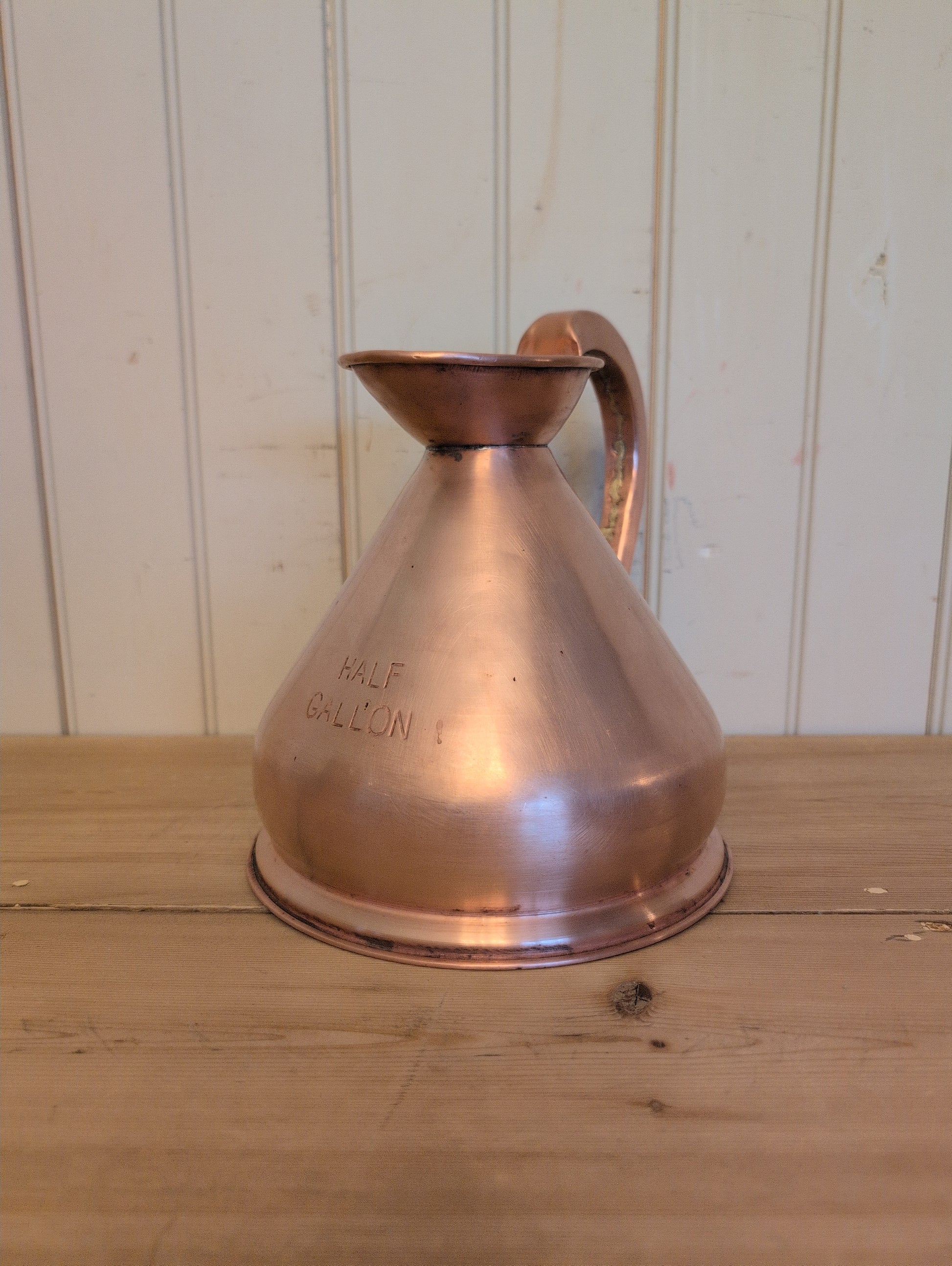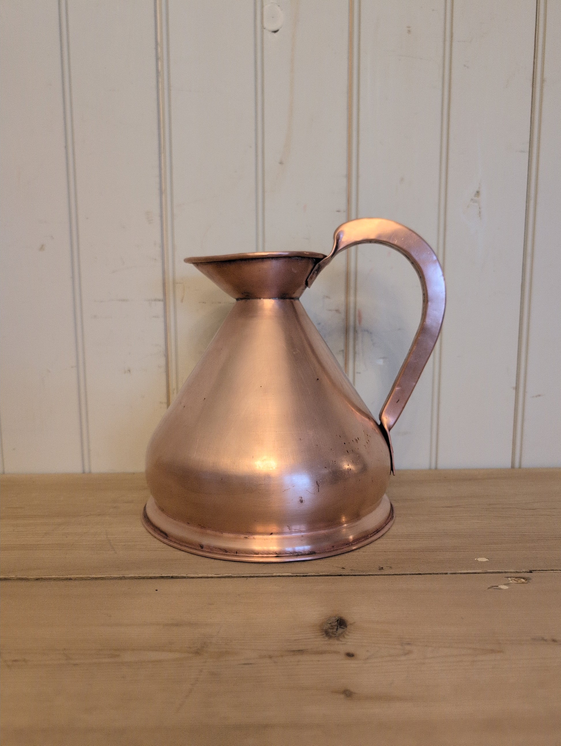 A freshly polished example of an old world measure. Copper measures like these were stamped with calibrated volumes and used for many uses from cider and ales in pubs to olive oil at market stalls. This measure is in very god condition.