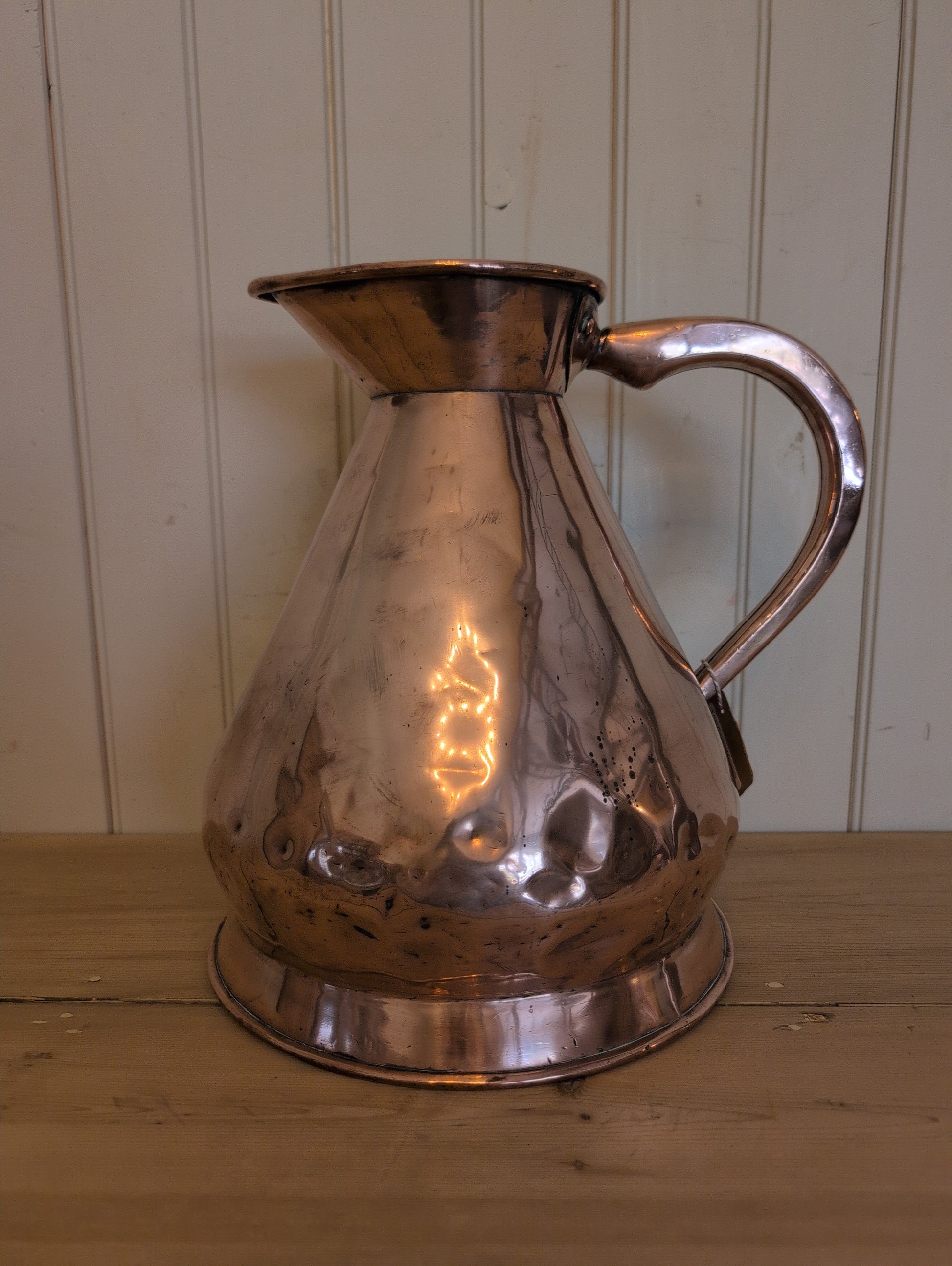 A freshly polished example of an old world measure. Copper measures like these were stamped with calibrated volumes and used for many uses from cider and ales in pubs to olive oil at market stalls. This measure is ideal for holding dried floral bouquets.