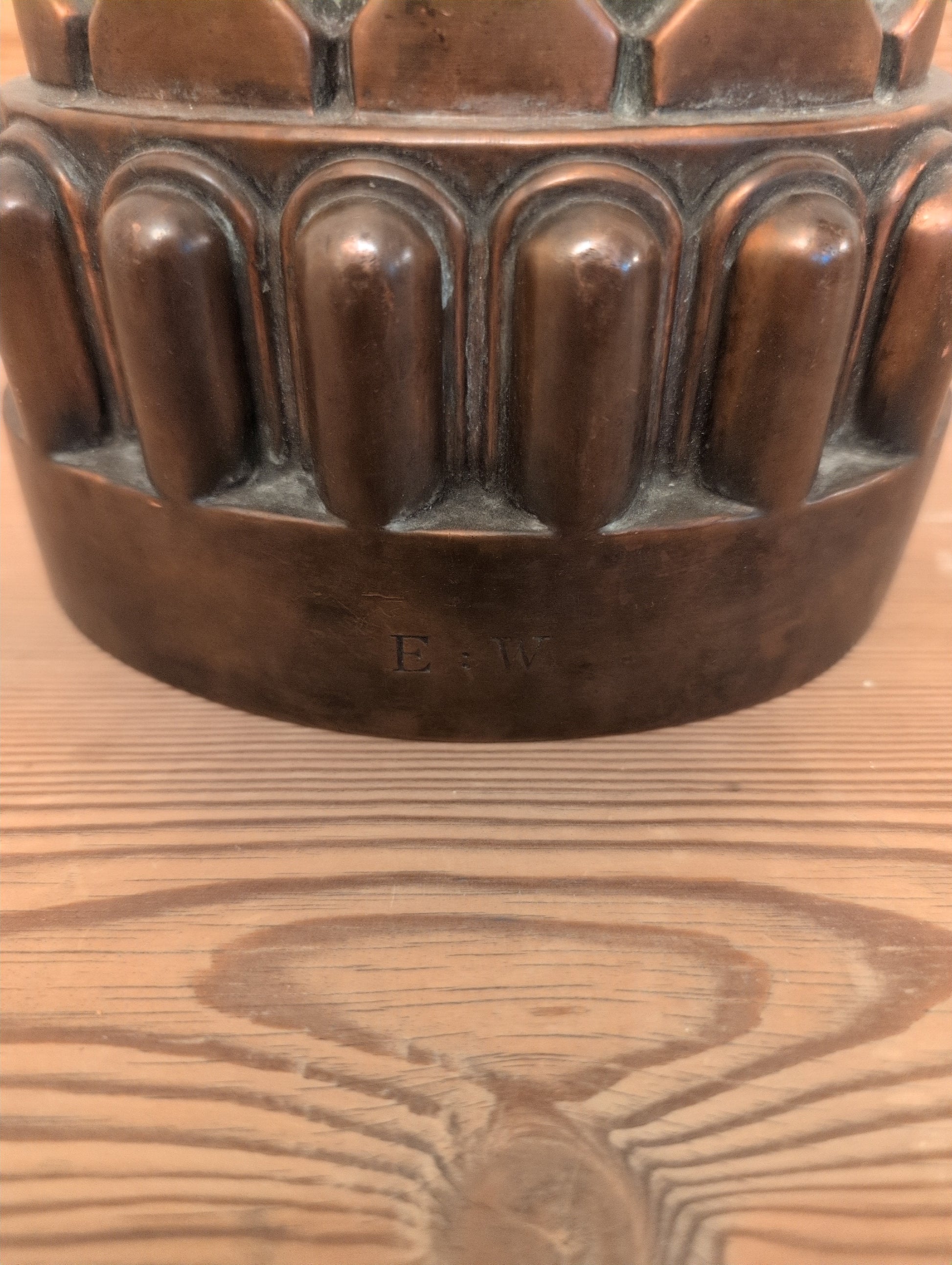 This Victorian copper mold was used to make cakes in the 19th century. The base is stamped with "E & W", likely the estate owners initials. The overall design is regal in appearance, with the pointed oval top giving a nod to crowns worn by the monarchy.