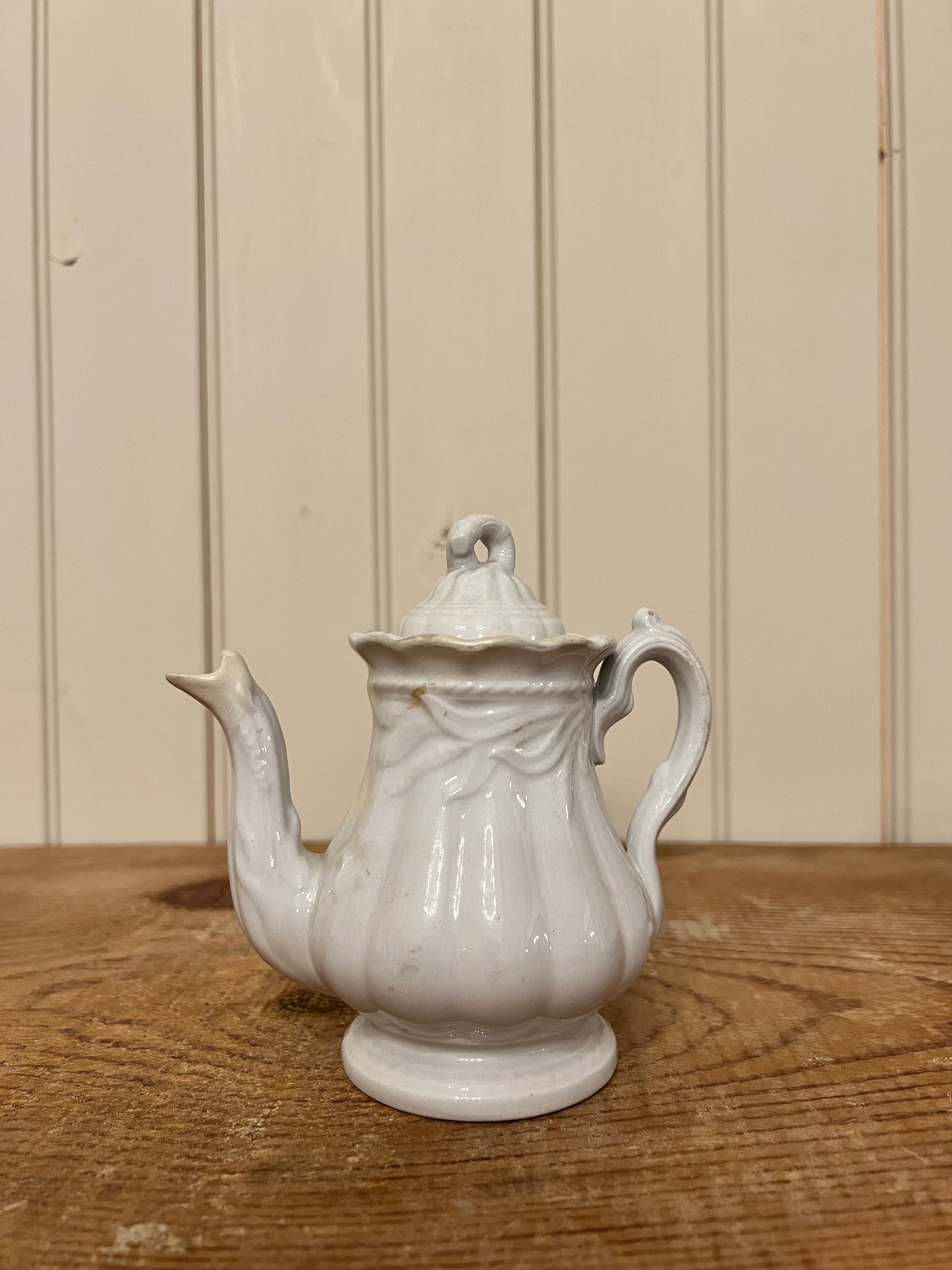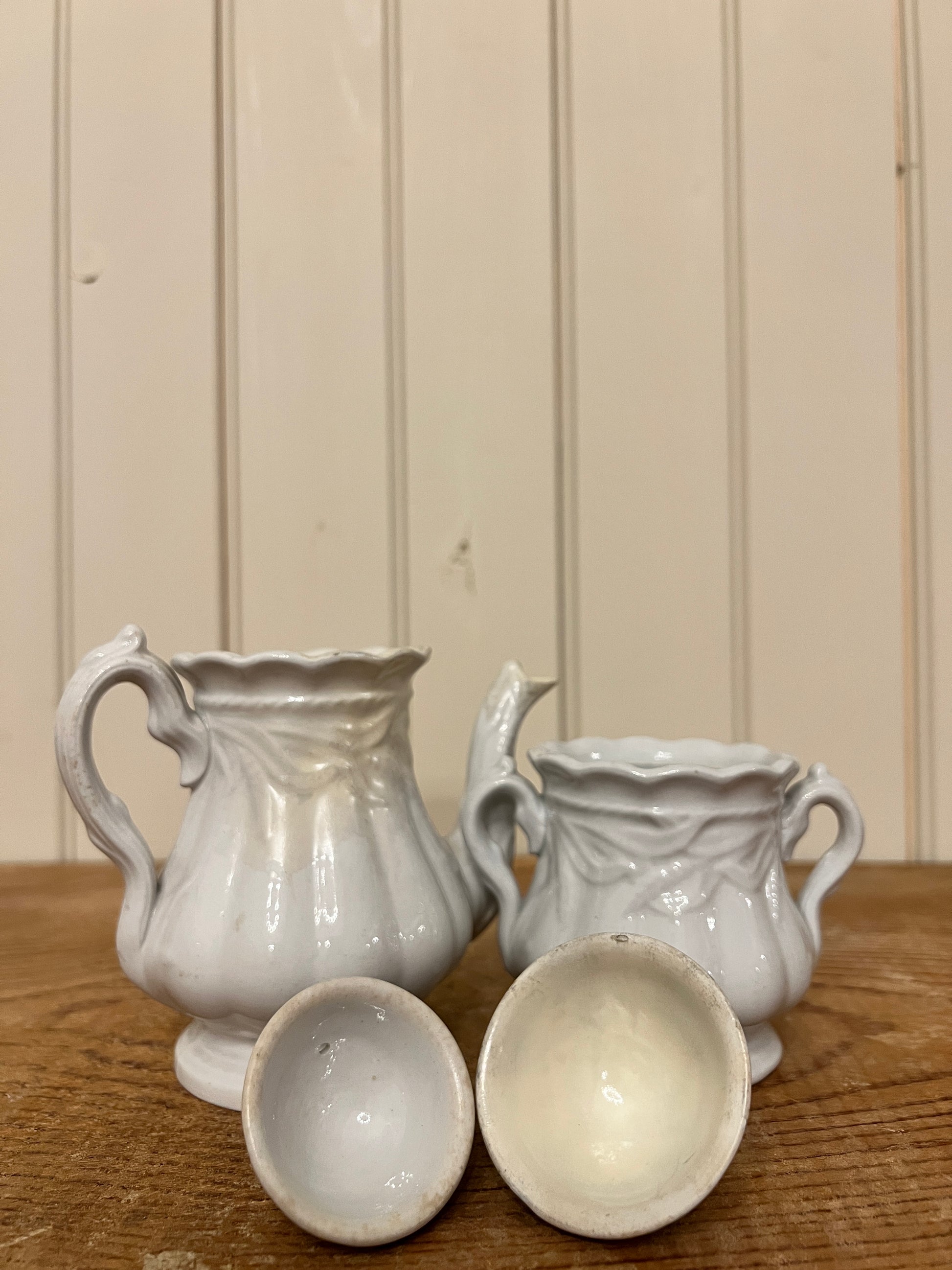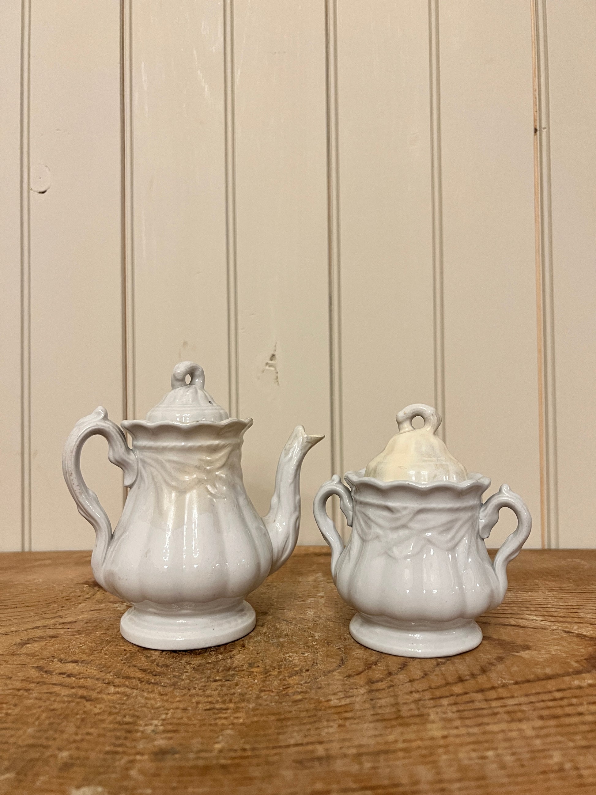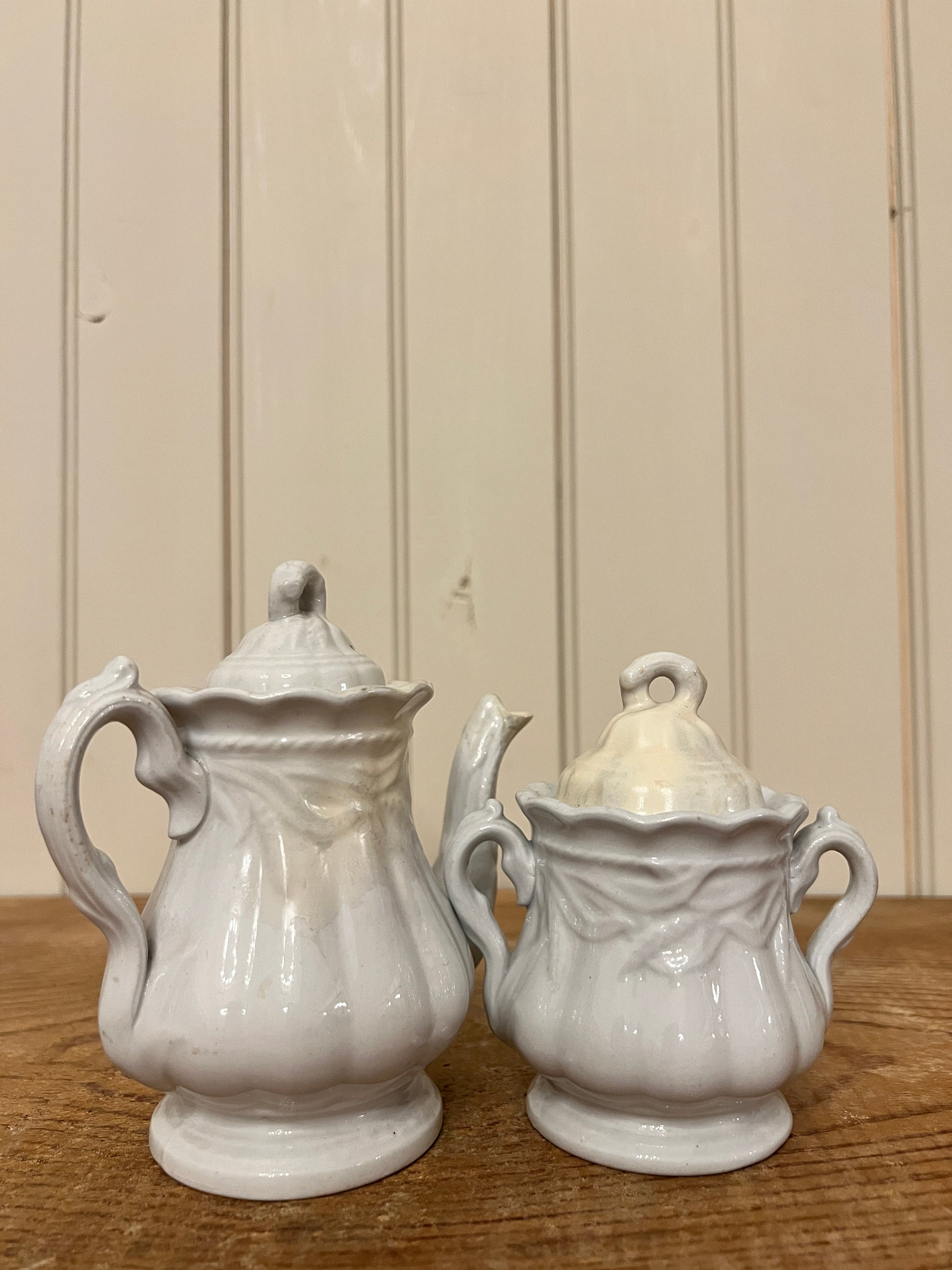 A rare miniature coffee pot and sugar bowl set dating to c. 1859 by makers mark. Both pieces are true blue ironstone, with staining and crazing throughout. Most notably, on the sugar lid, and coffee pot wheat pattern. Sold as a set.