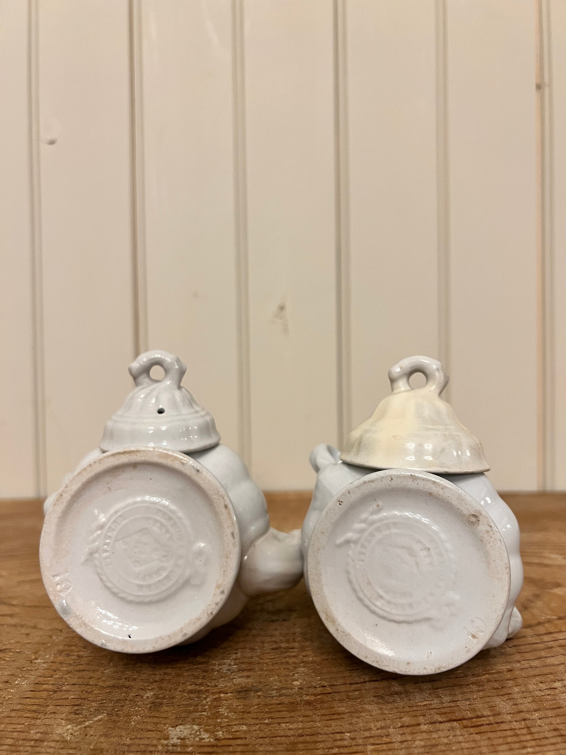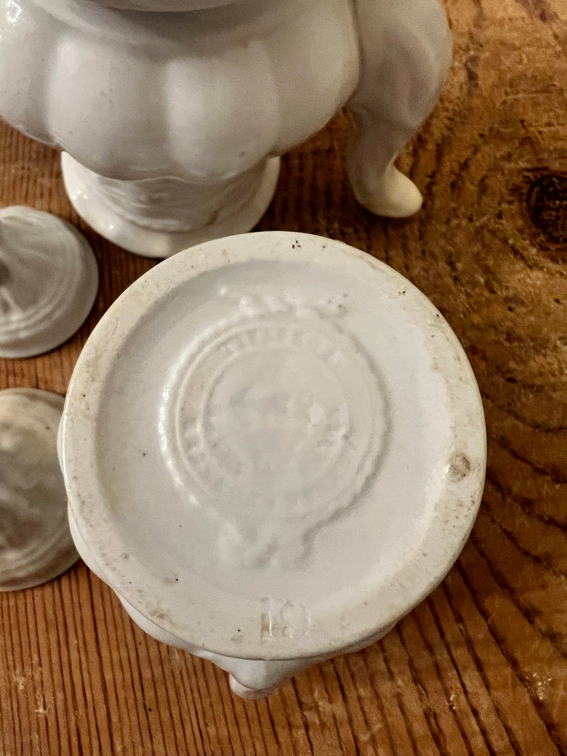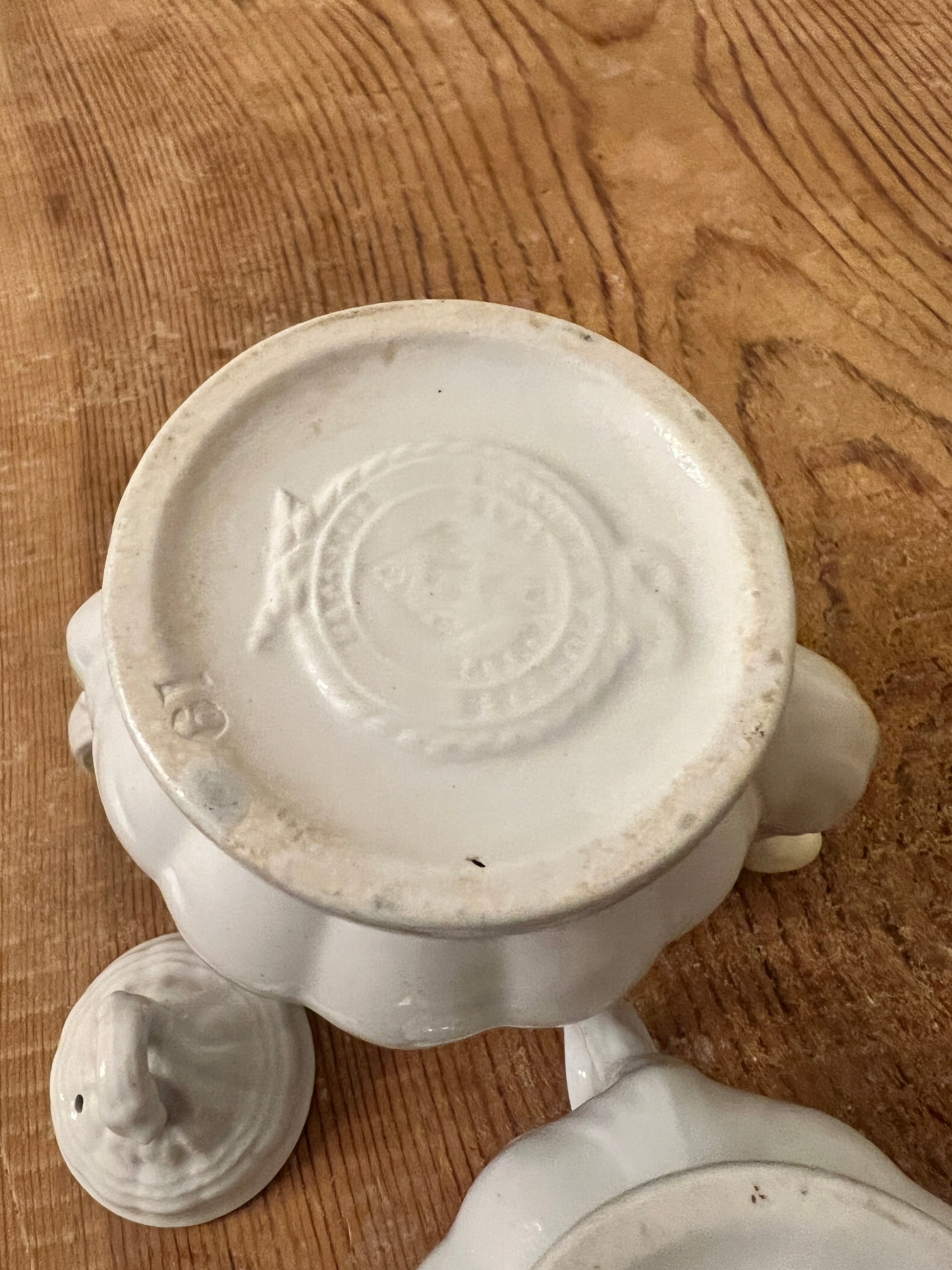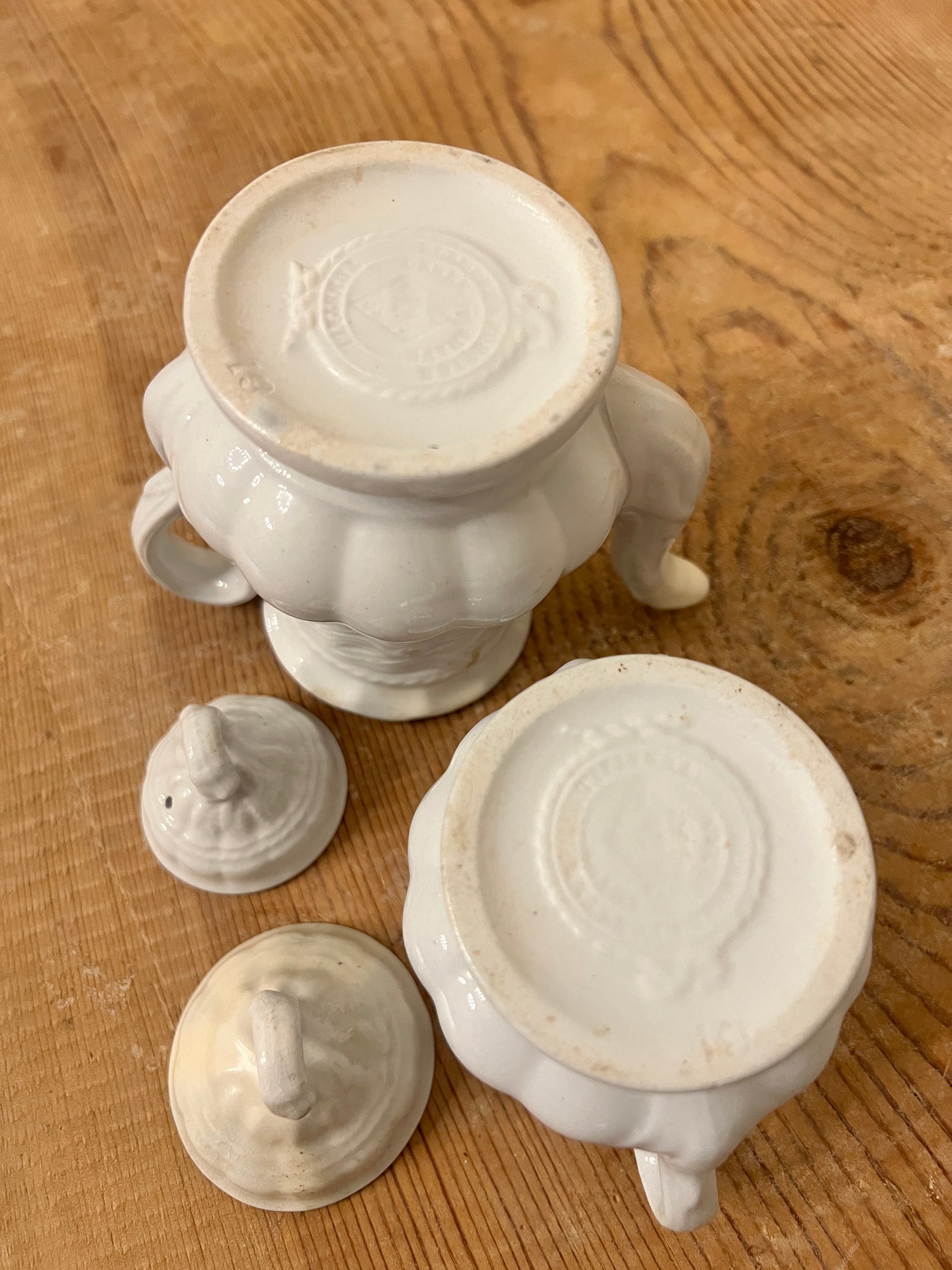 A rare miniature coffee pot and sugar bowl set dating to c. 1859 by makers mark. Both pieces are true blue ironstone, with staining and crazing throughout. Most notably, on the sugar lid, and coffee pot wheat pattern. Sold as a set.