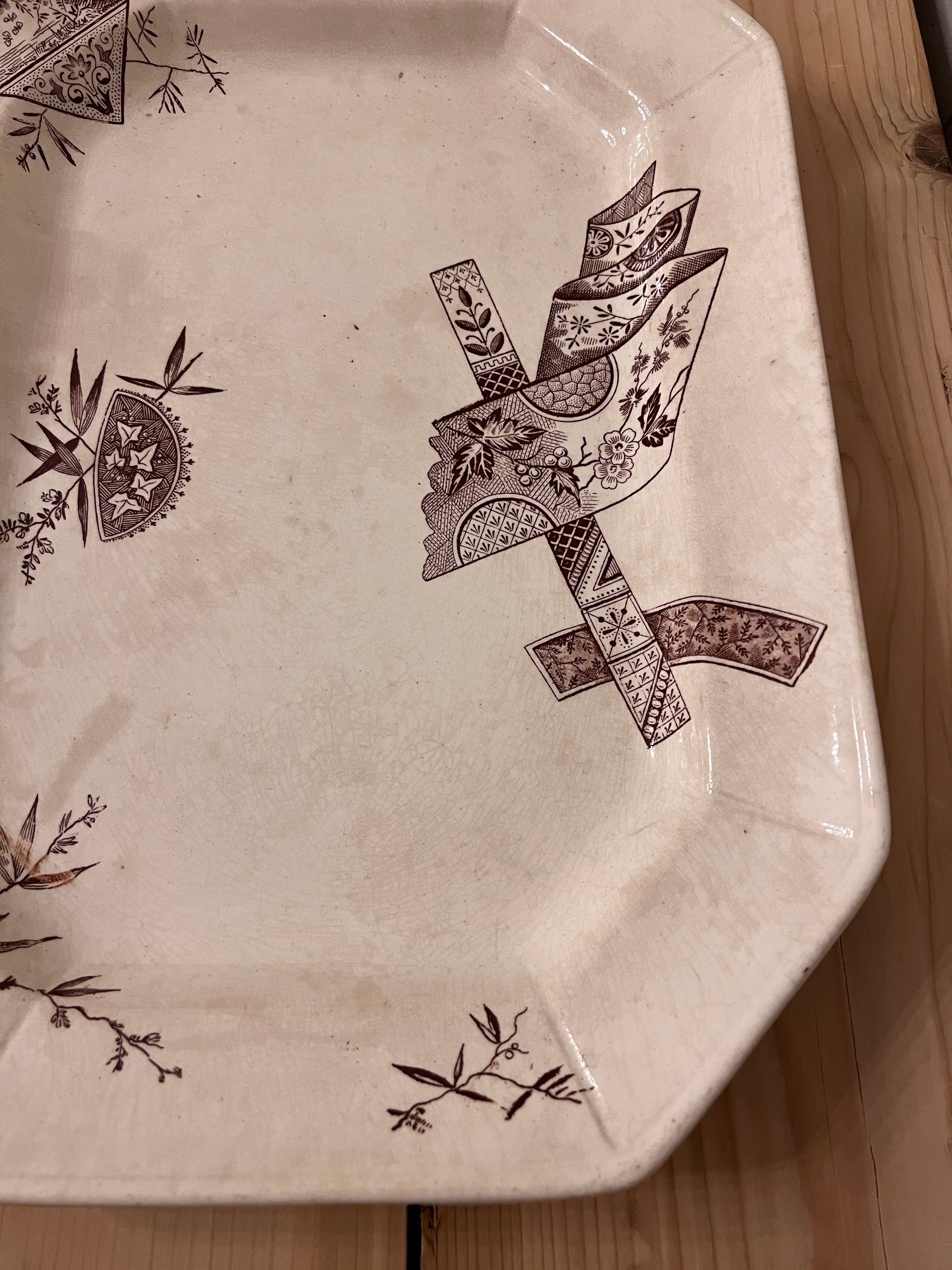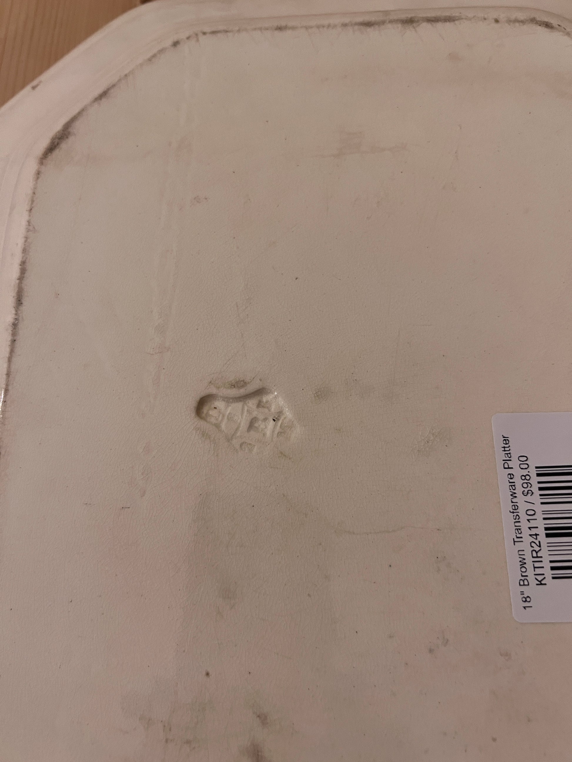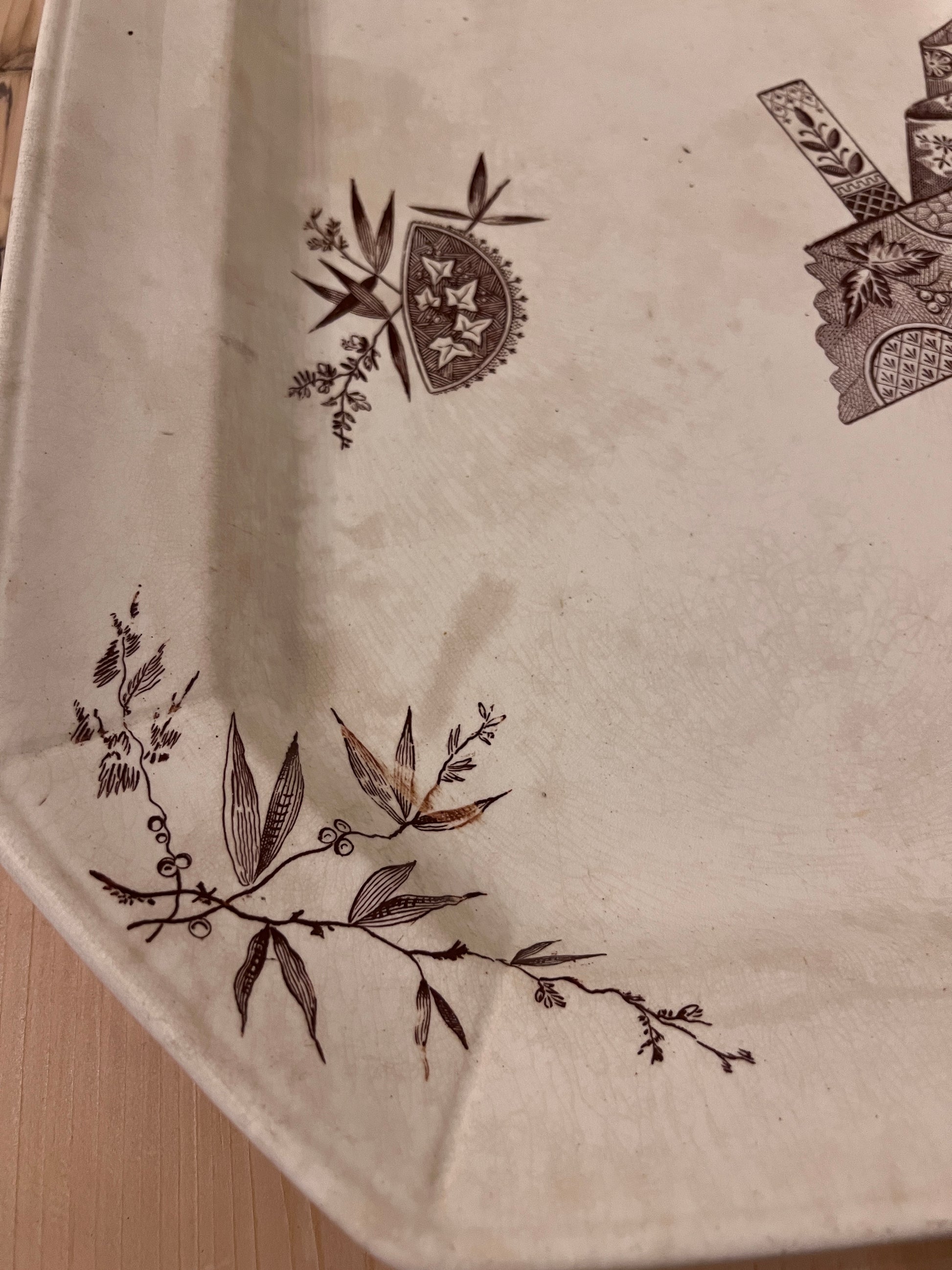 Beautiful staining and crazing is seen throughout this brown transfer ware platter. Makers mark places this platter c. 1883.