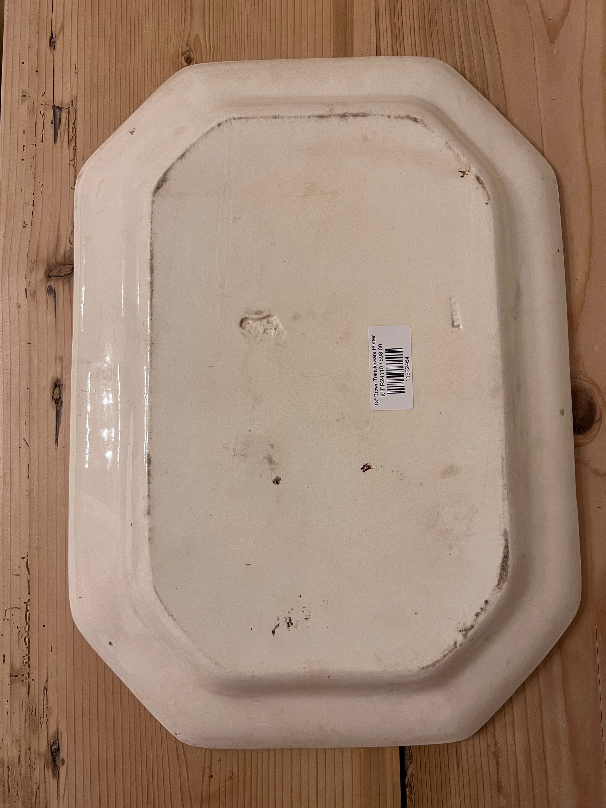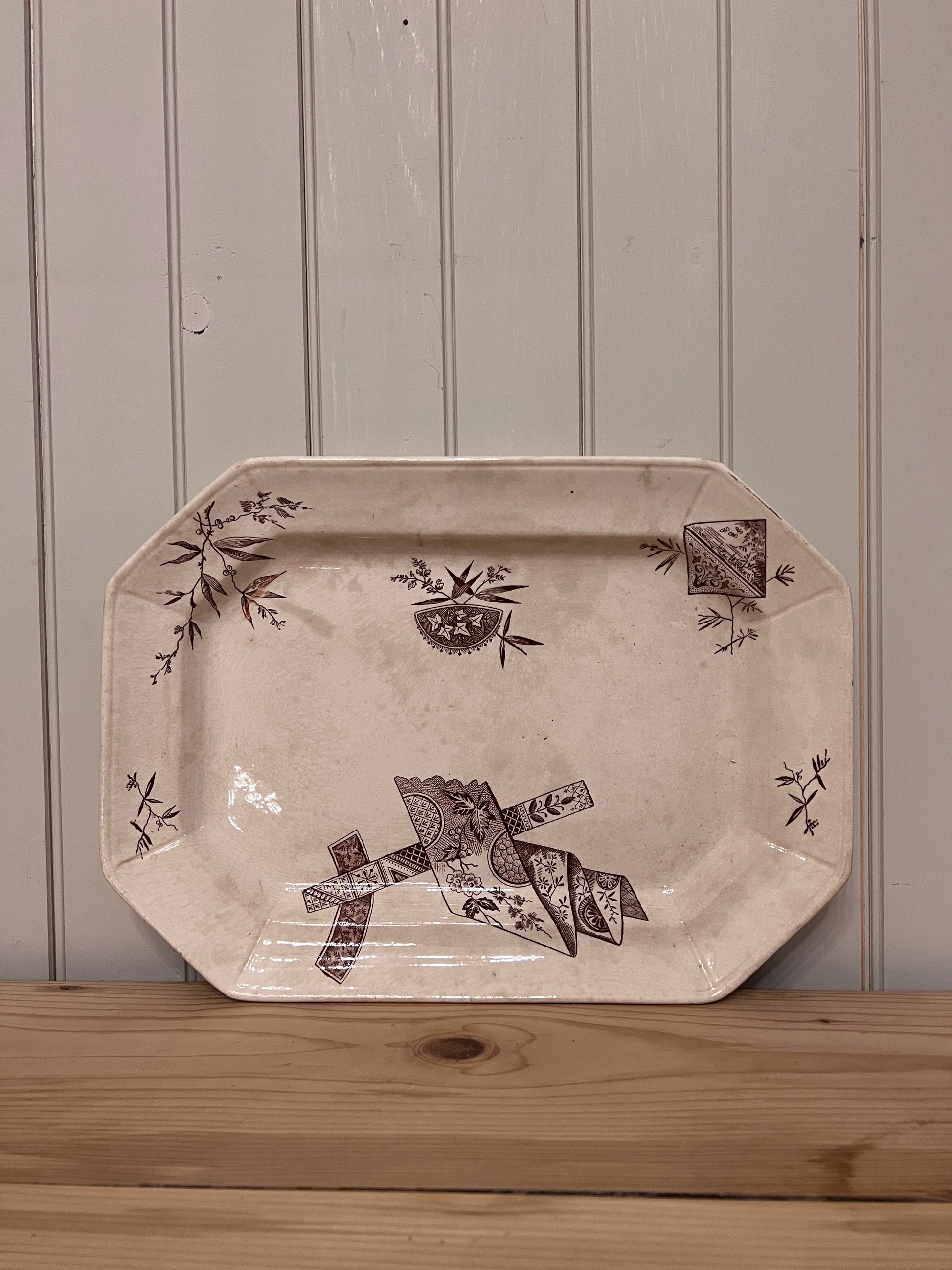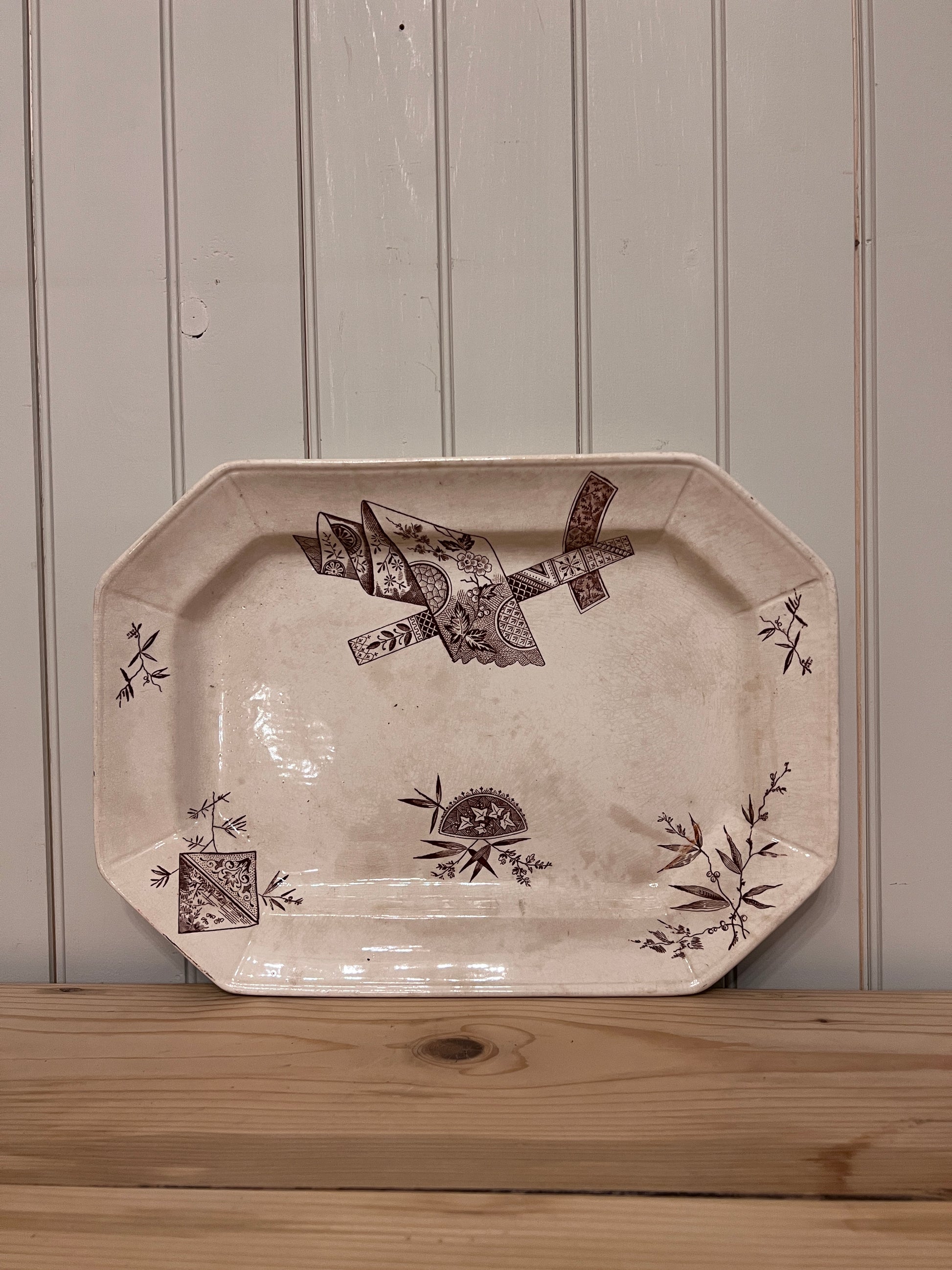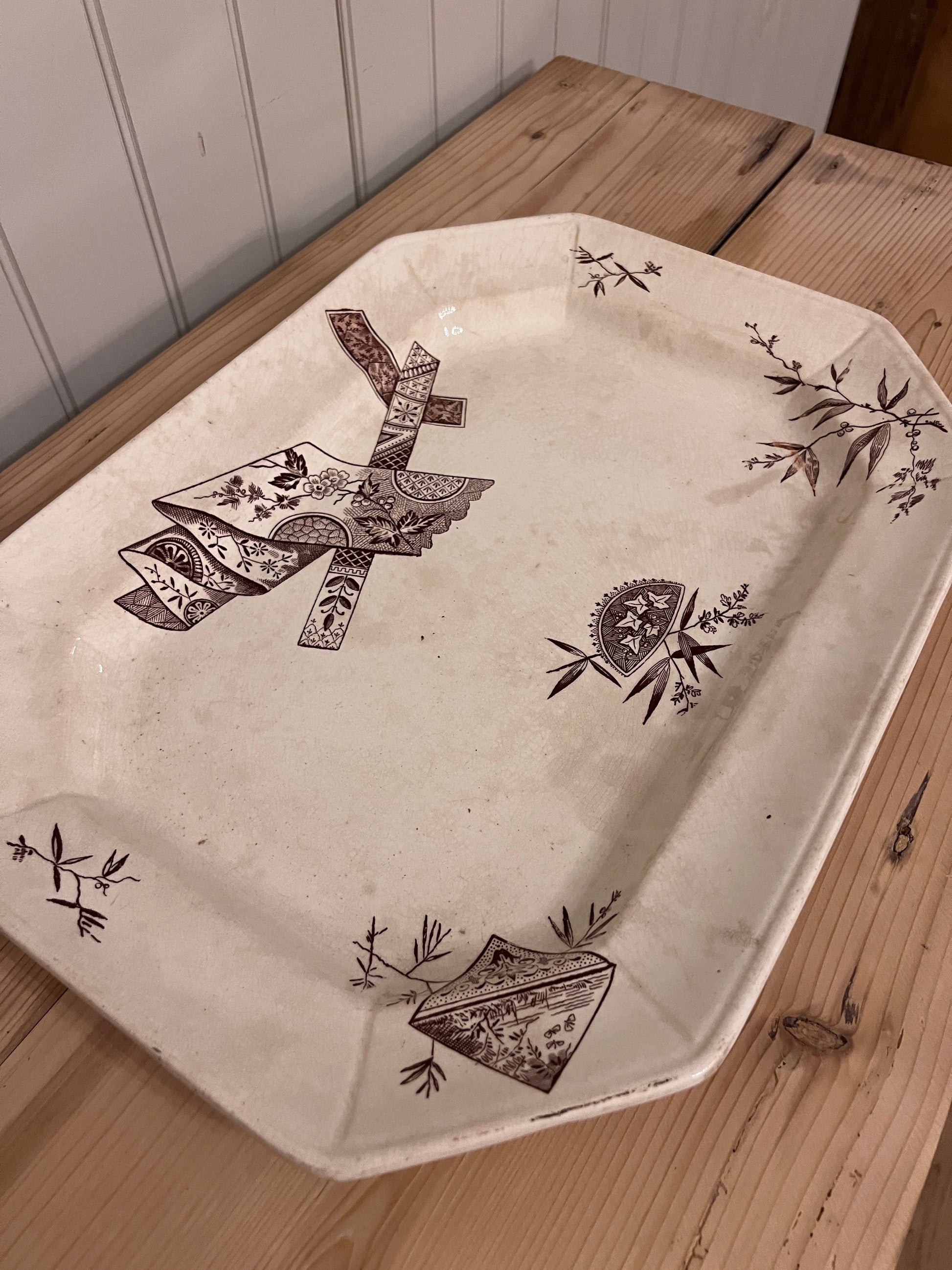 Beautiful staining and crazing is seen throughout this brown transfer ware platter. Makers mark places this platter c. 1883.