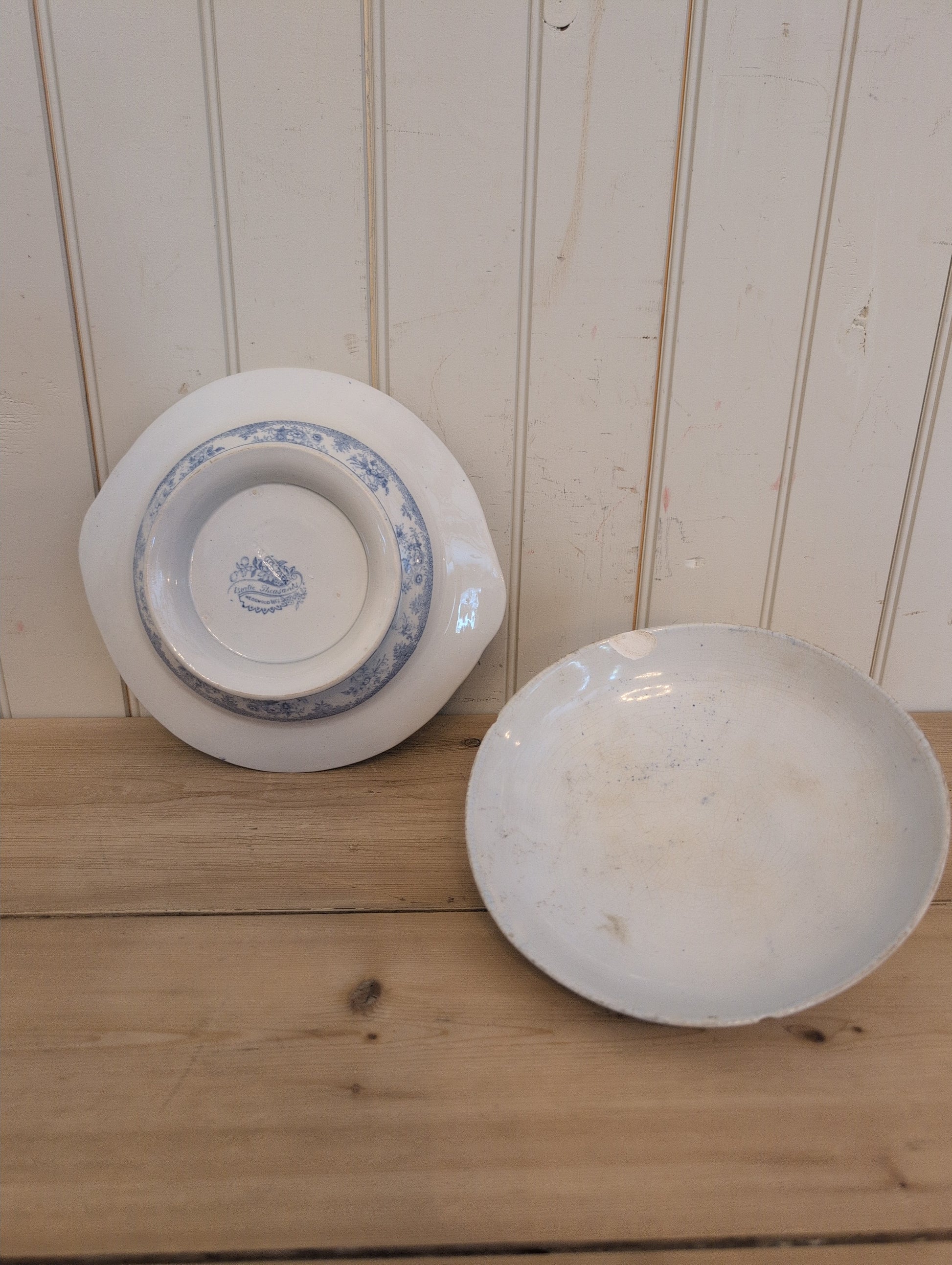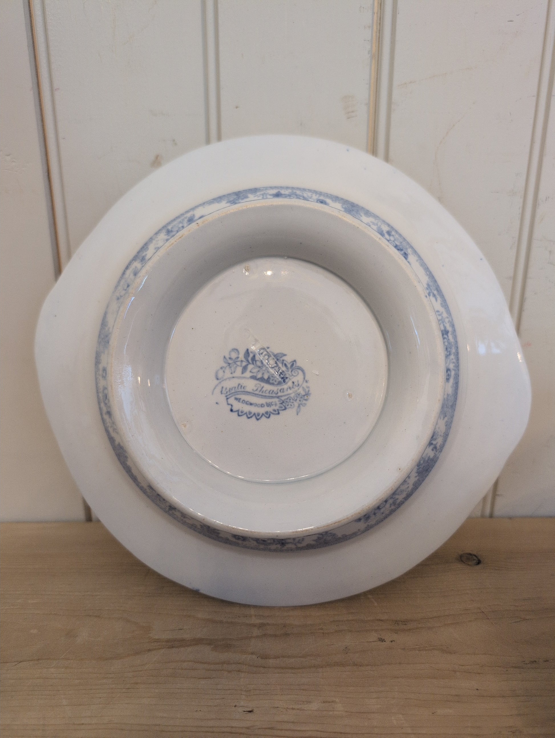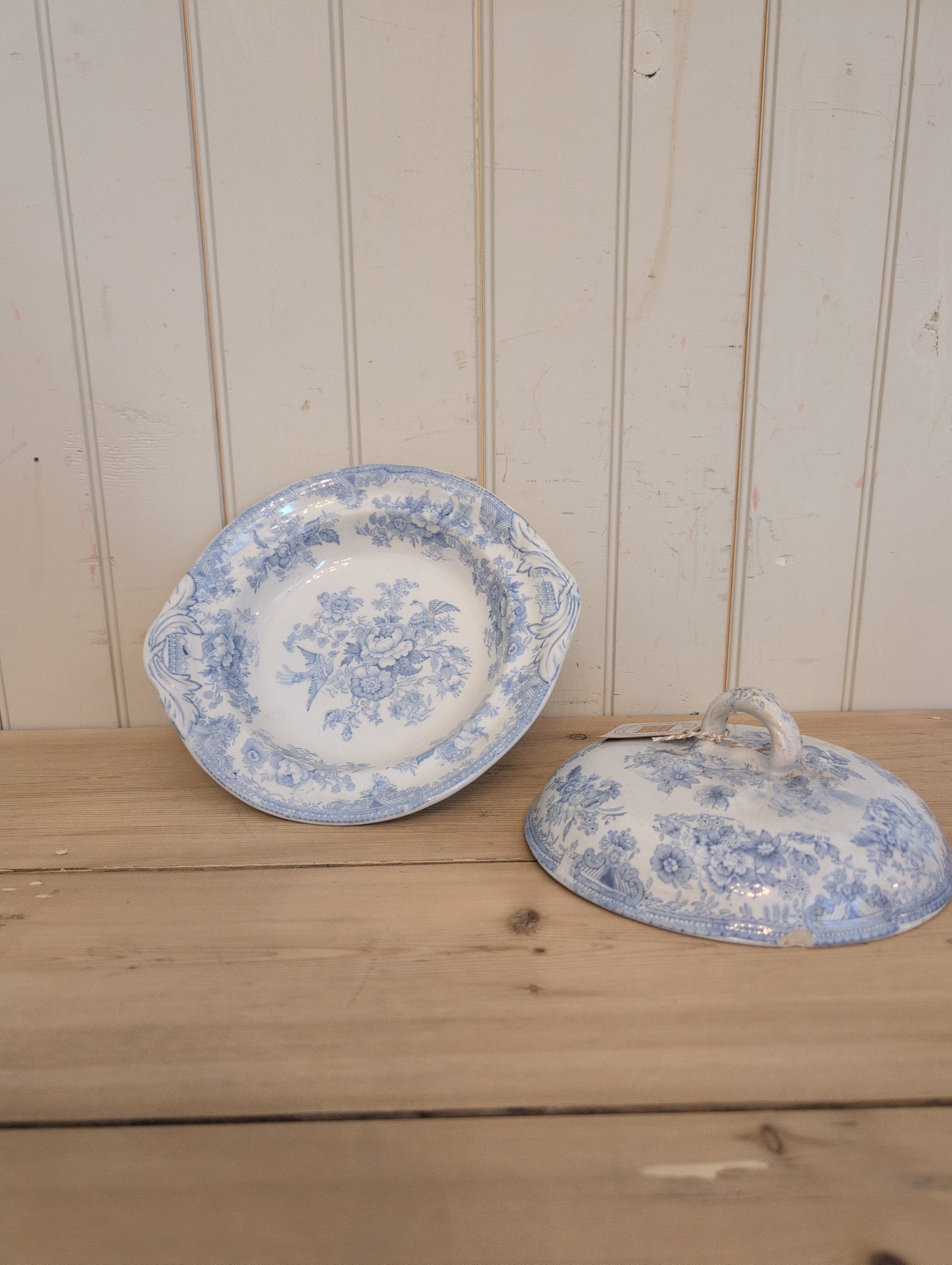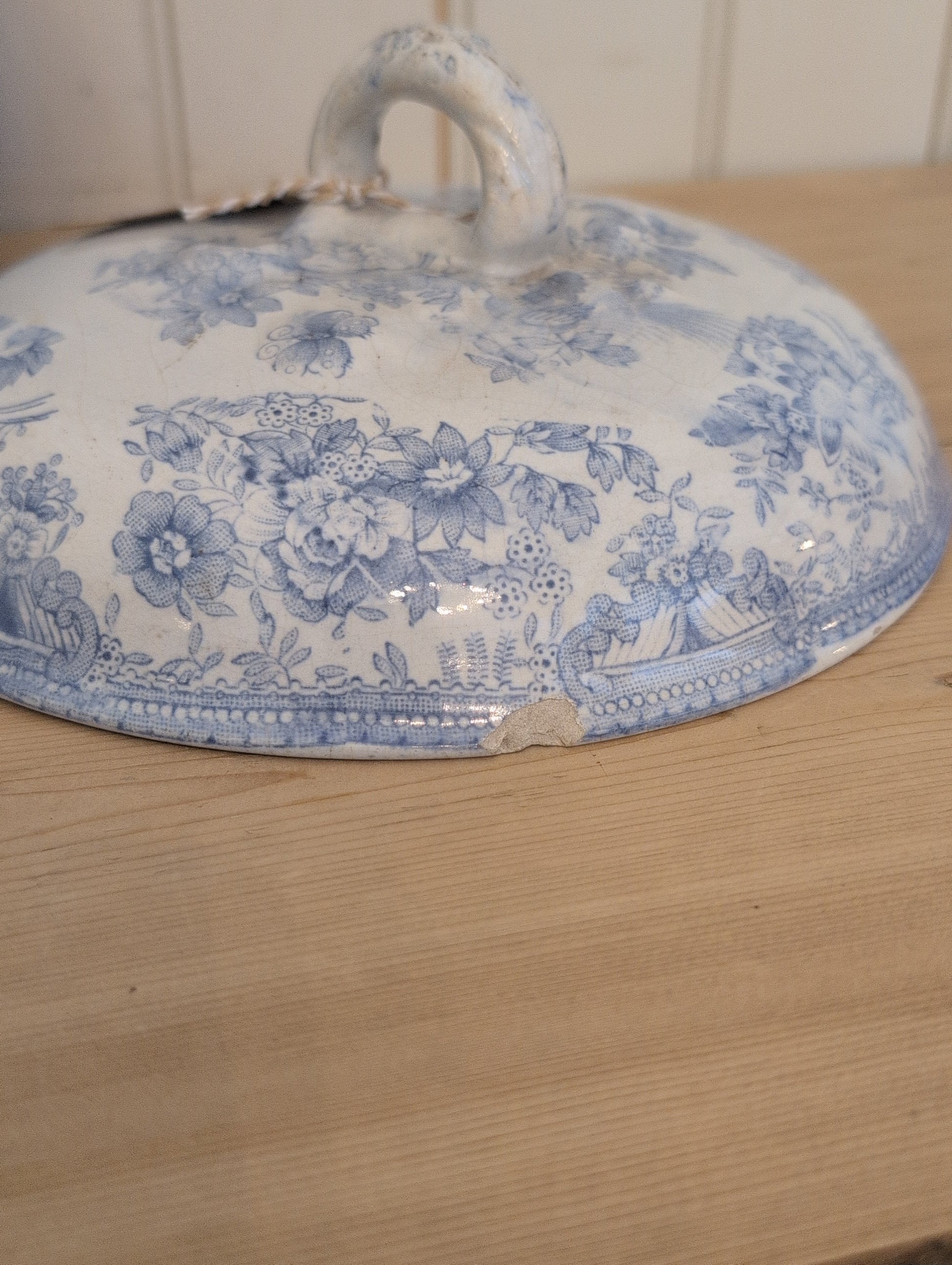 Original 19th C. Asiatic Pheasants transfer ware tureen. Staining and crazing present, no major cracks. There are three chips on the rim of the lid with two of them being visible from the outside.