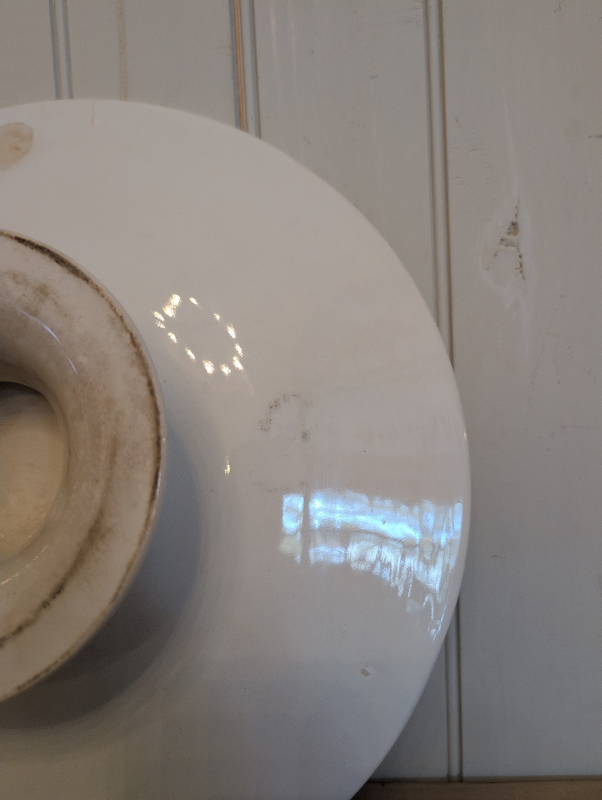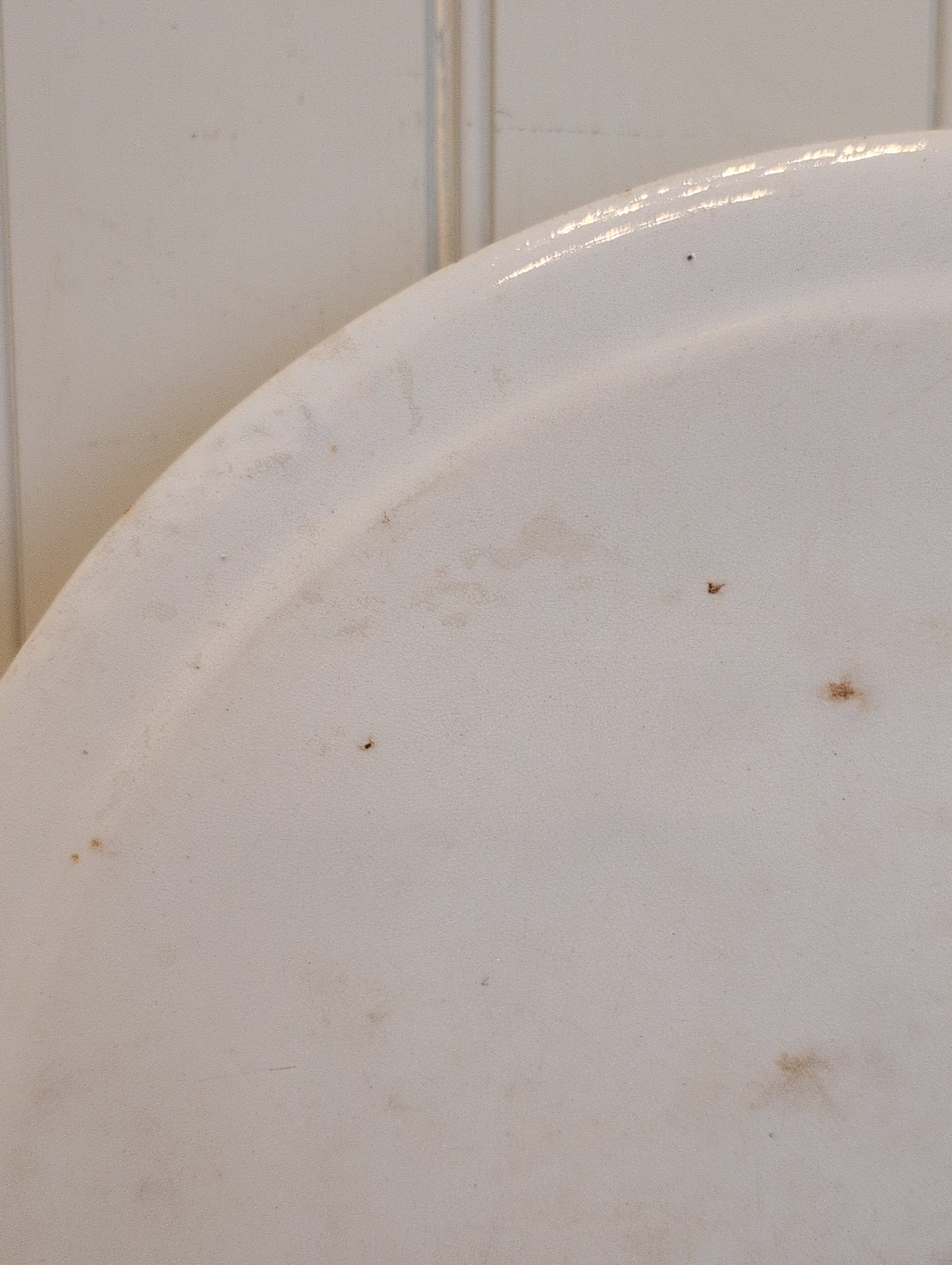 Significant staining, some crazing, and a small crack at an edge, no major chips or cracks.