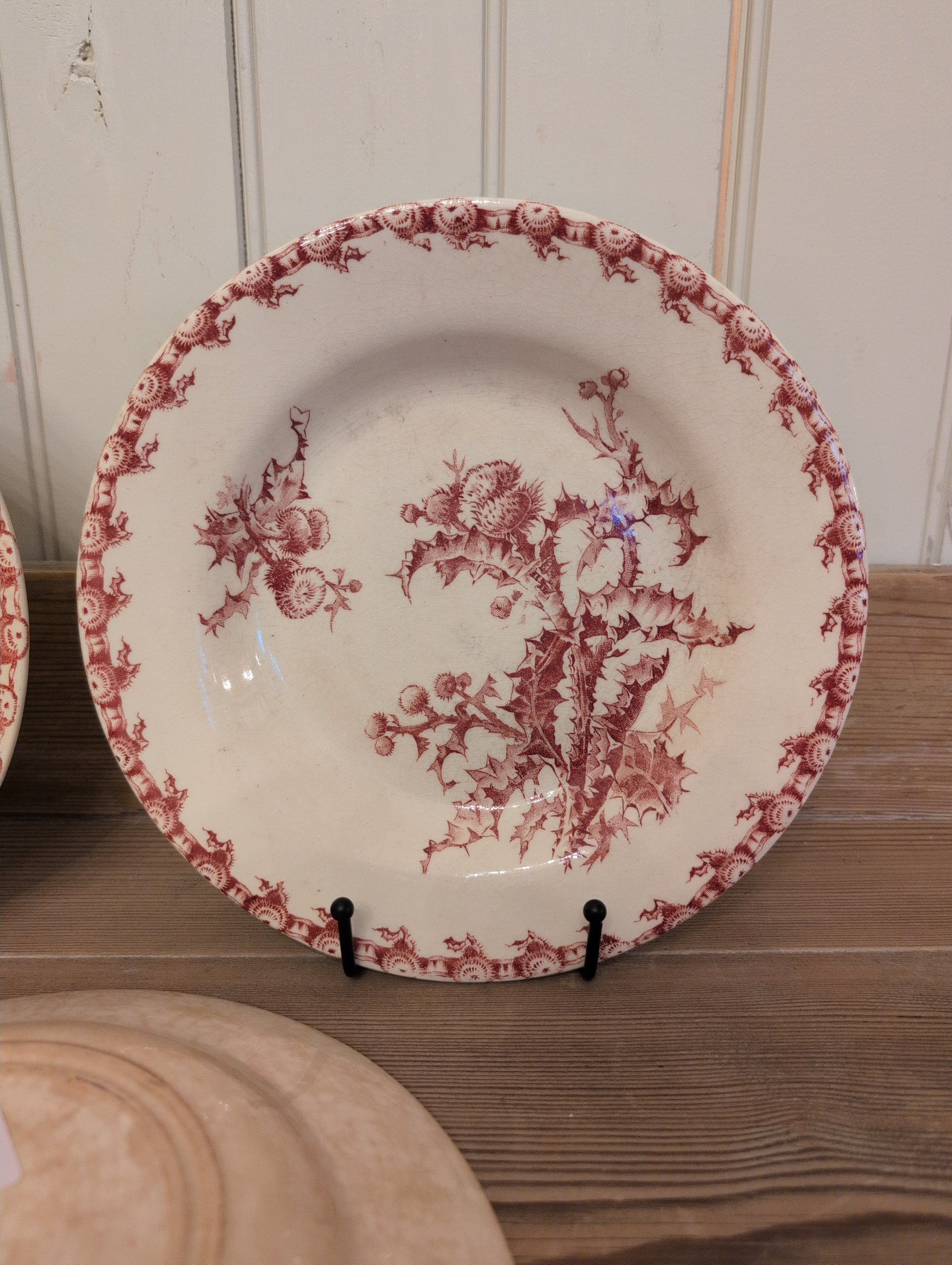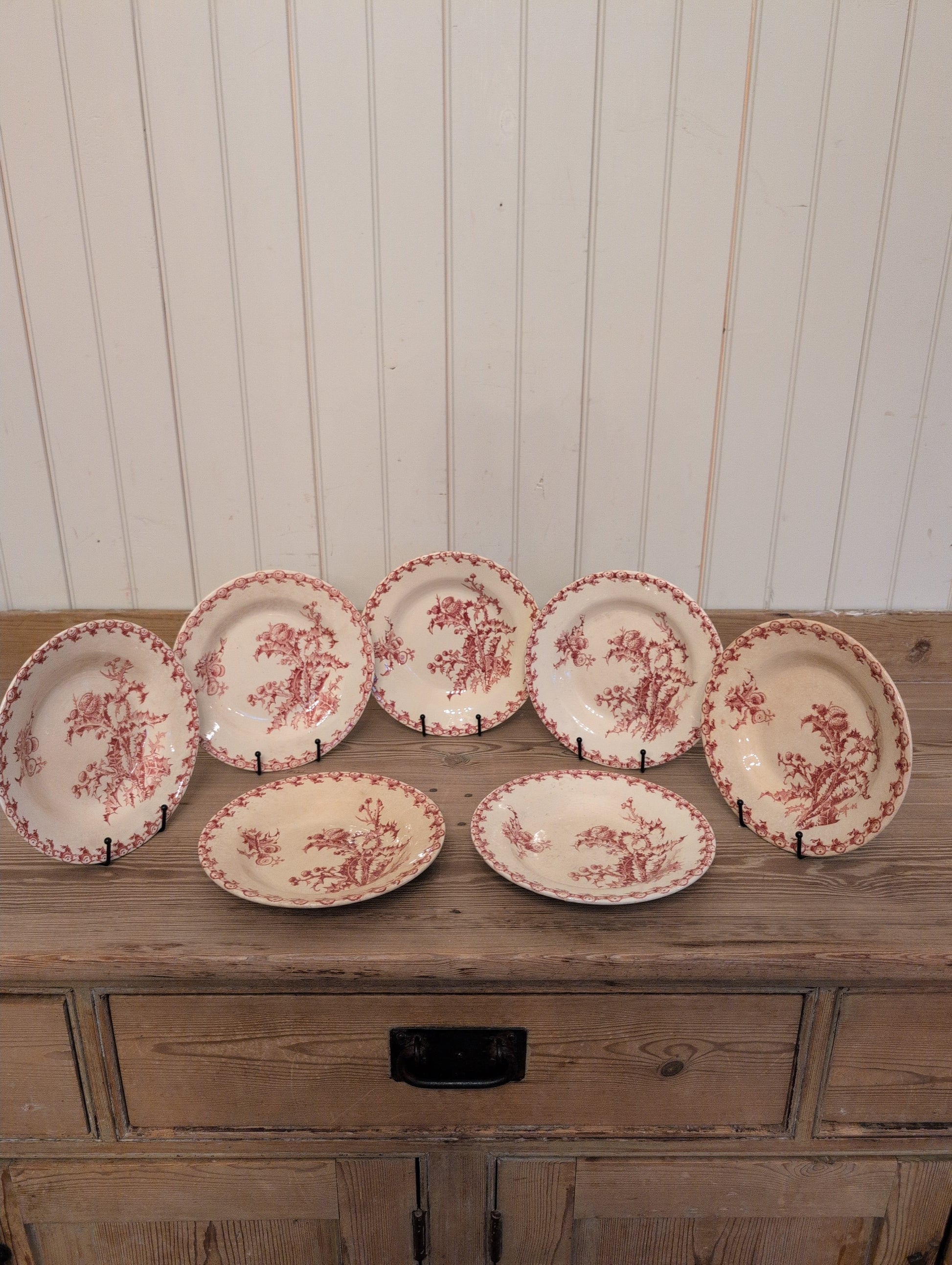French Terre de Fer produced by the renowned Gien Factory. These bowls are of the chardons (thistle) pattern in red/dark pink color way. They were produced between 1886-1938. Sold individually.
