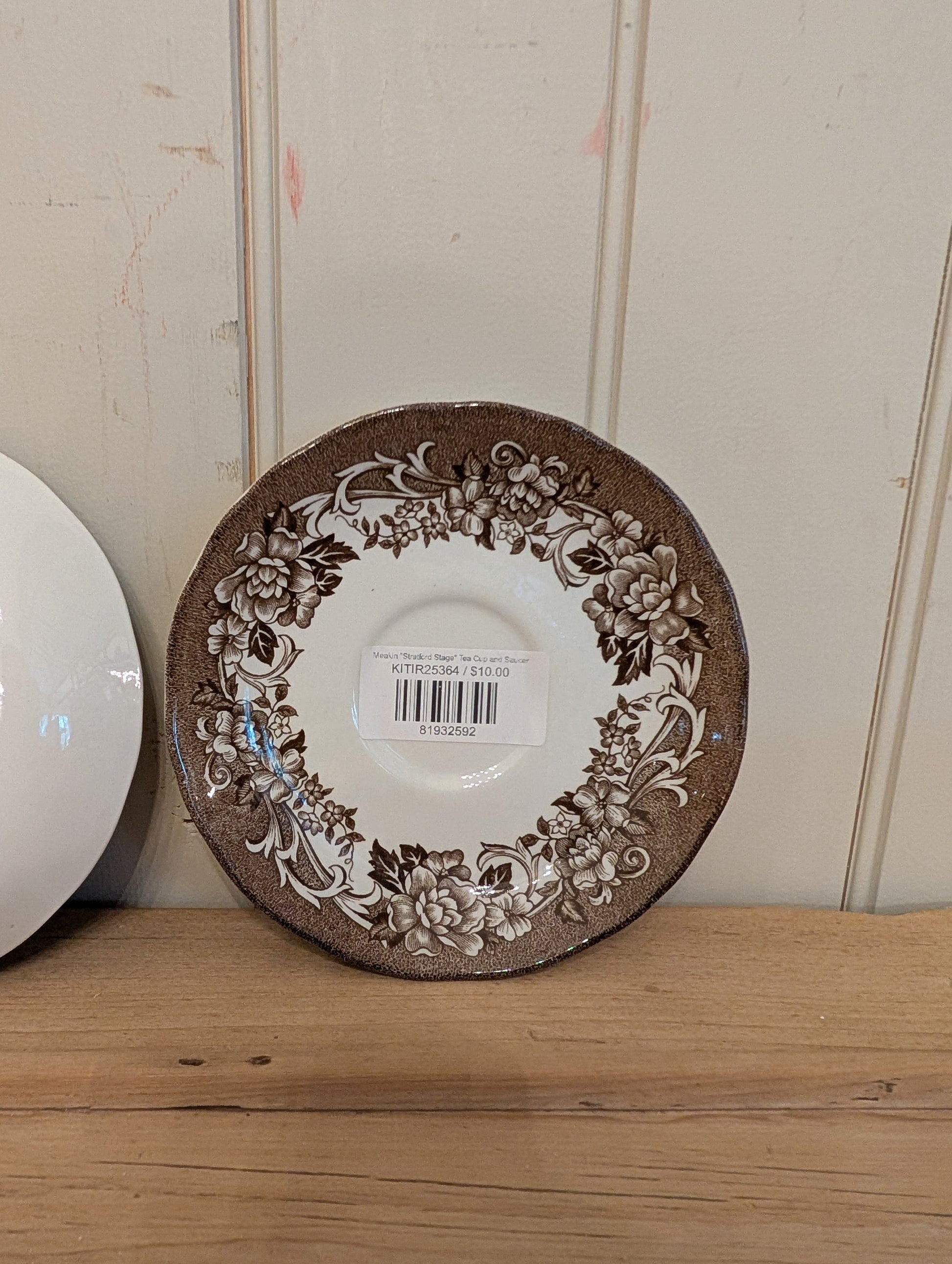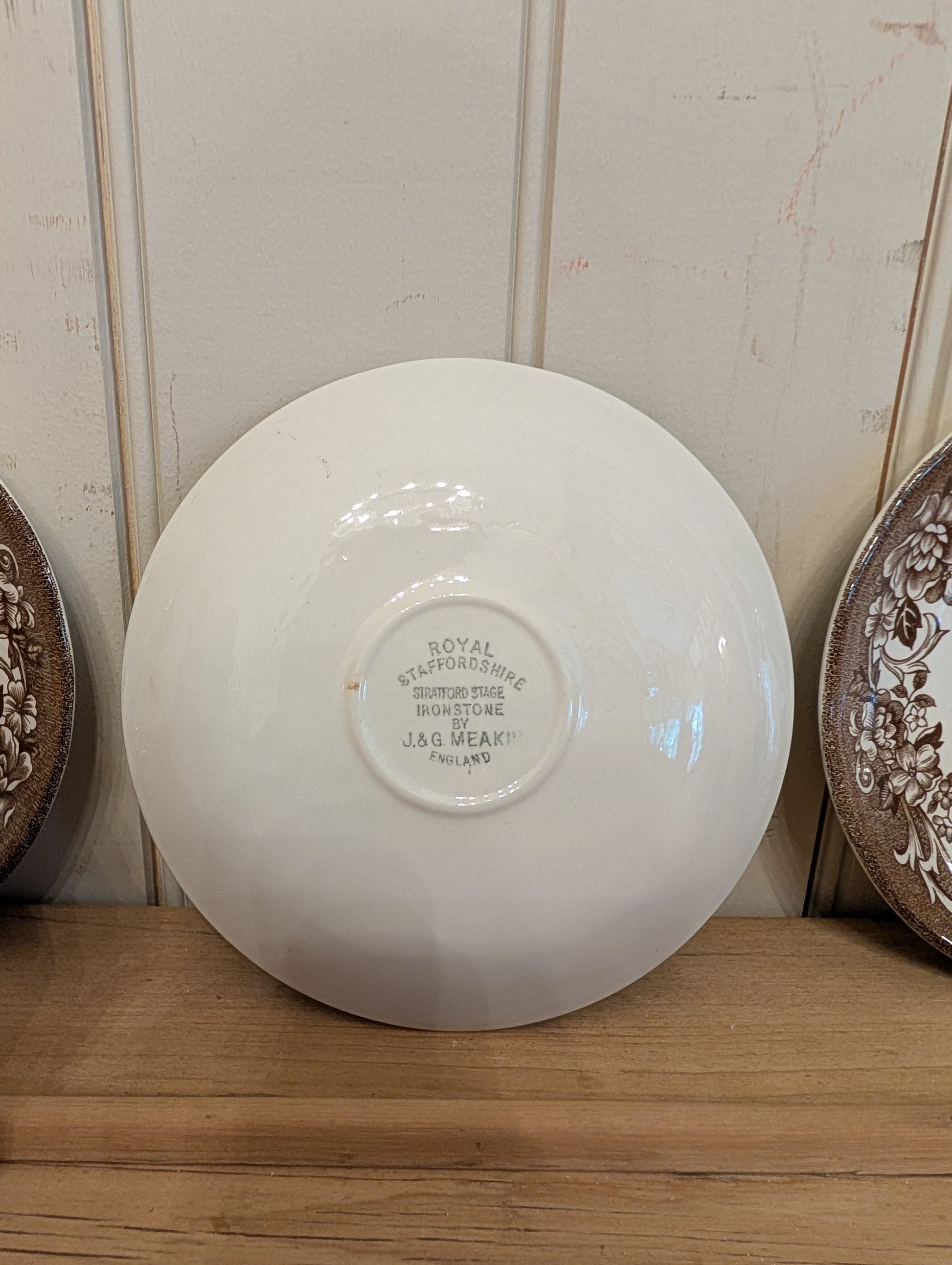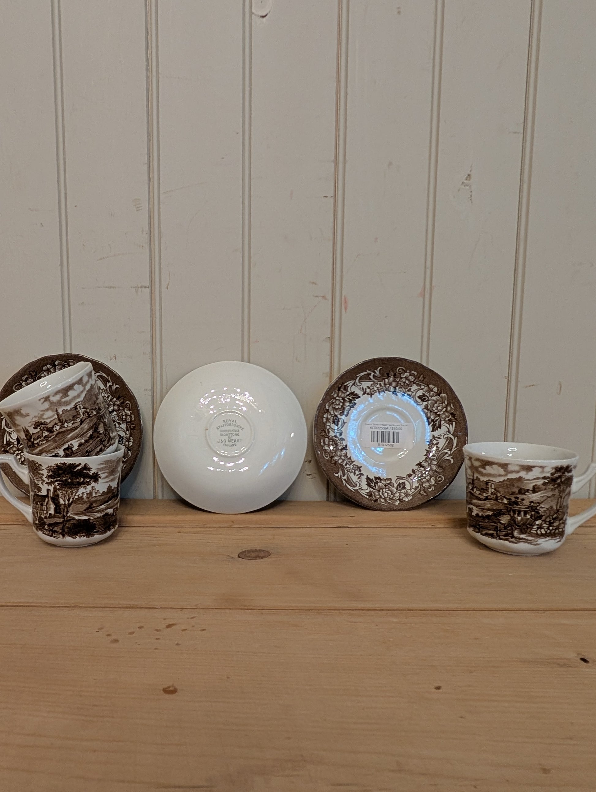 These ironstone tea cups are made in England by J&G Meakin. They are part of the "Stratford Stage" collection in a brown colorway. Purchase includes one tea cup and one saucer.