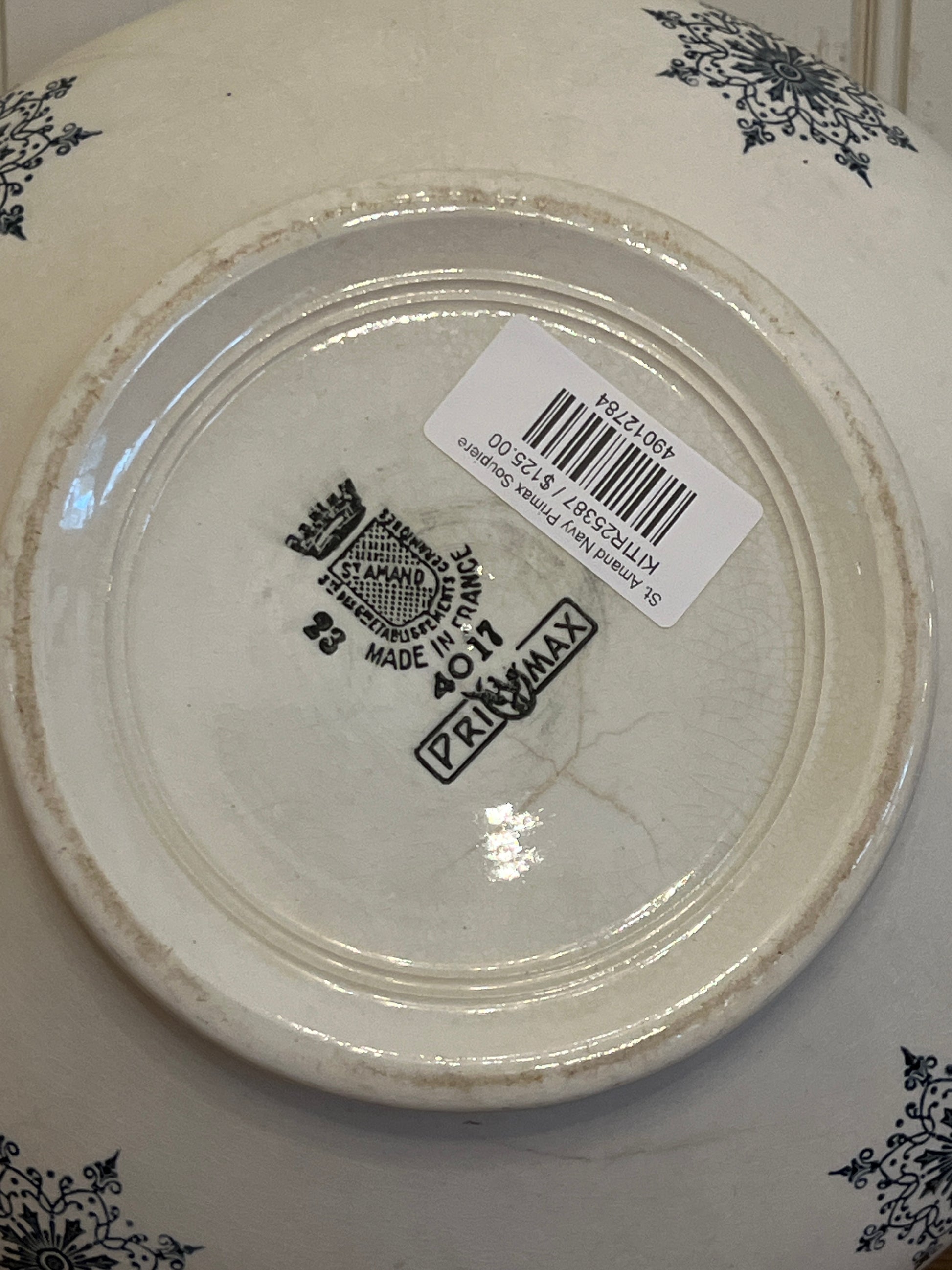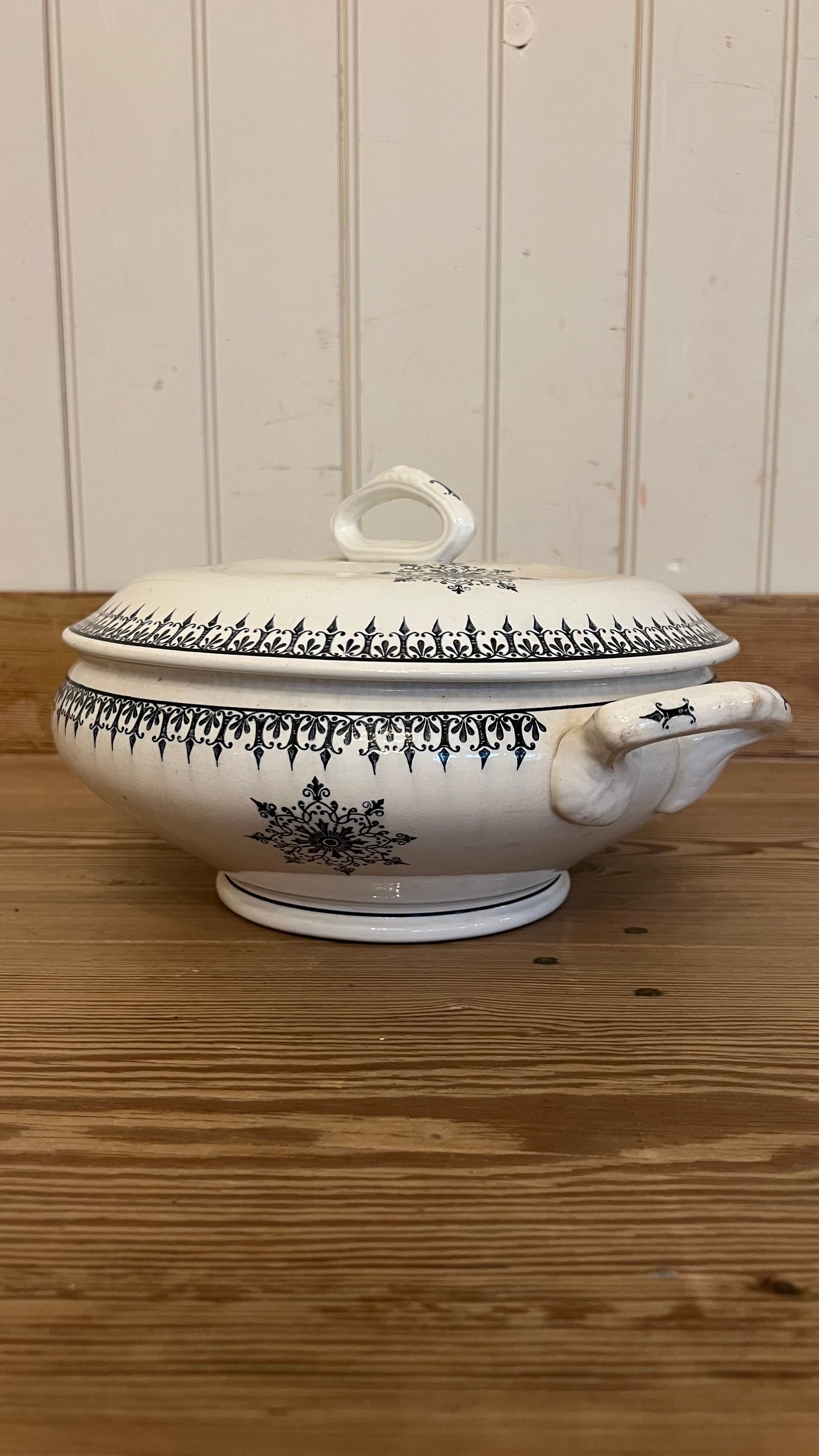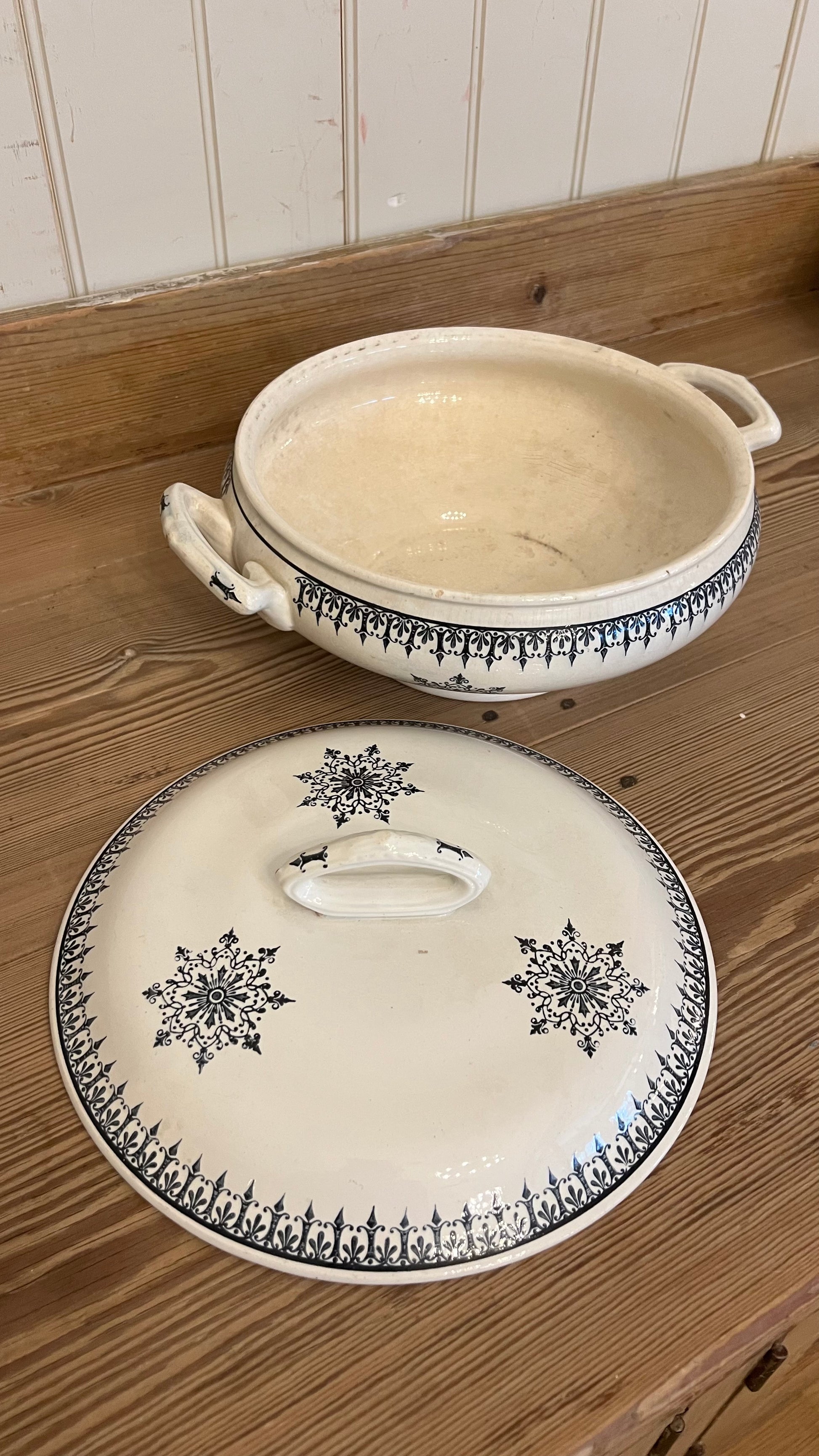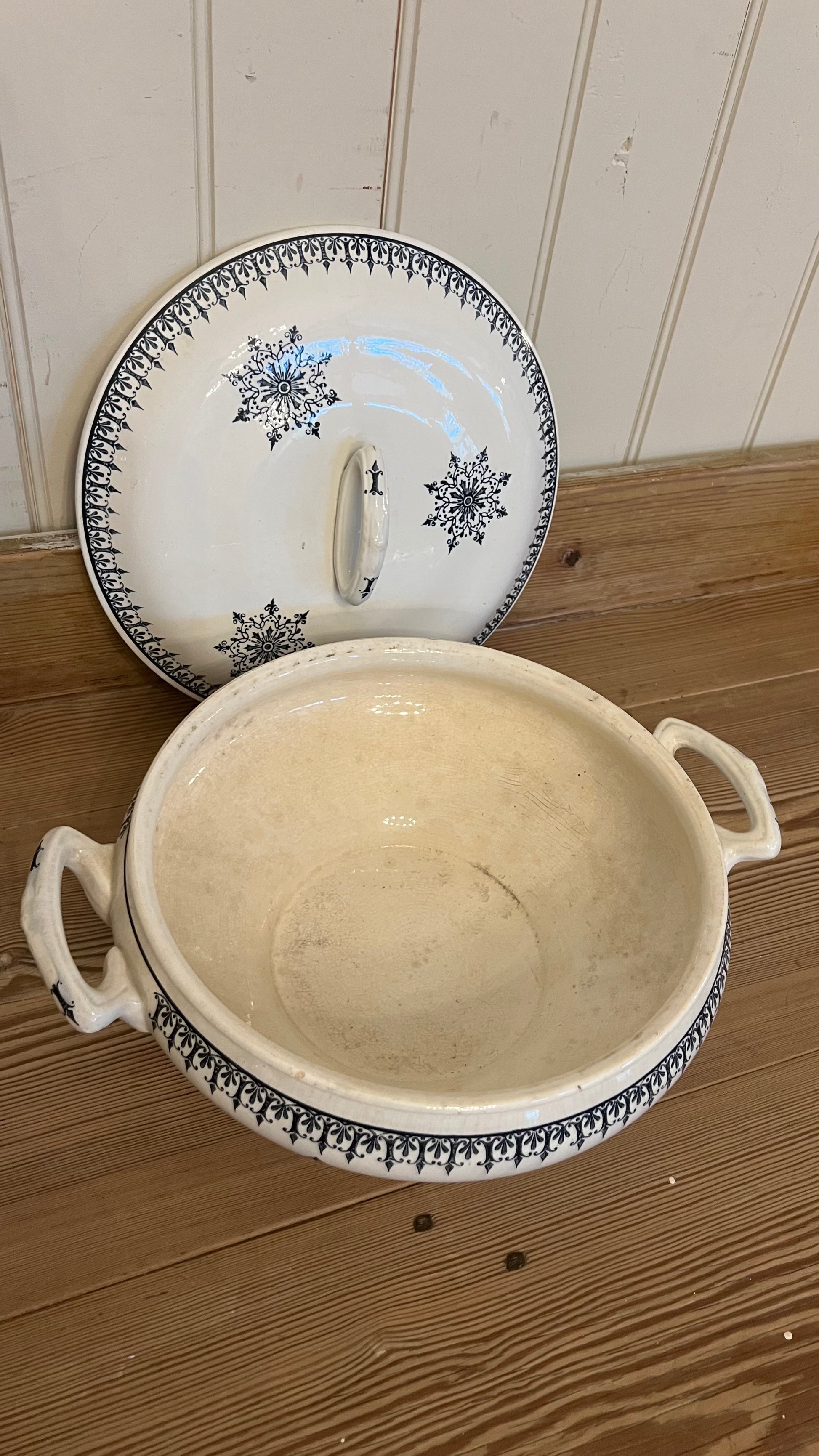 Slight staining and crazing throughout (mostly on the interior bowl of the soupiere), no chips or cracks. French Soupiere with a bold navy banding along the edges.