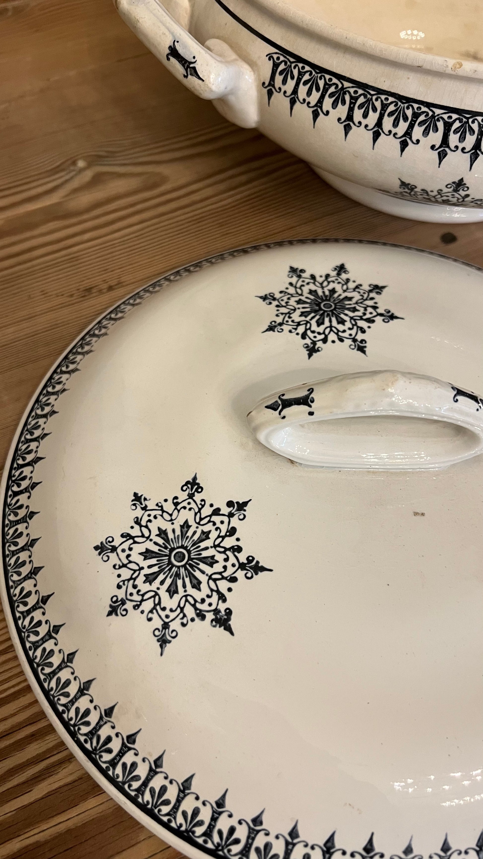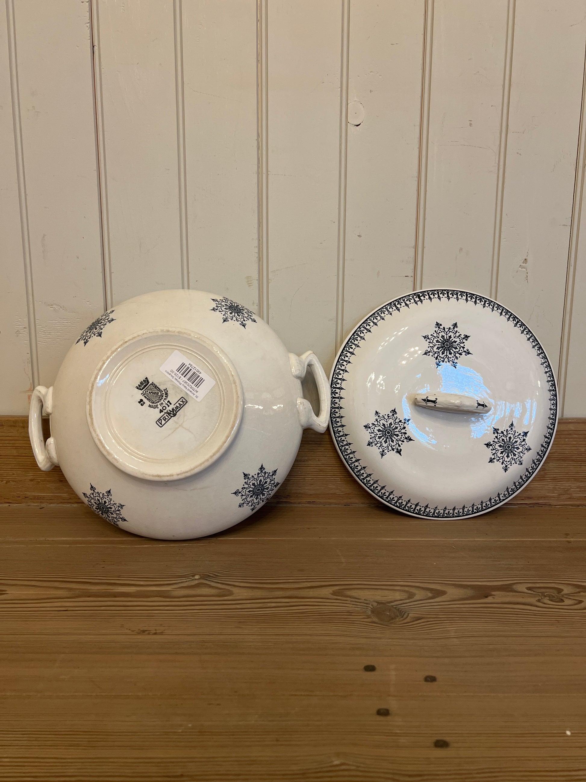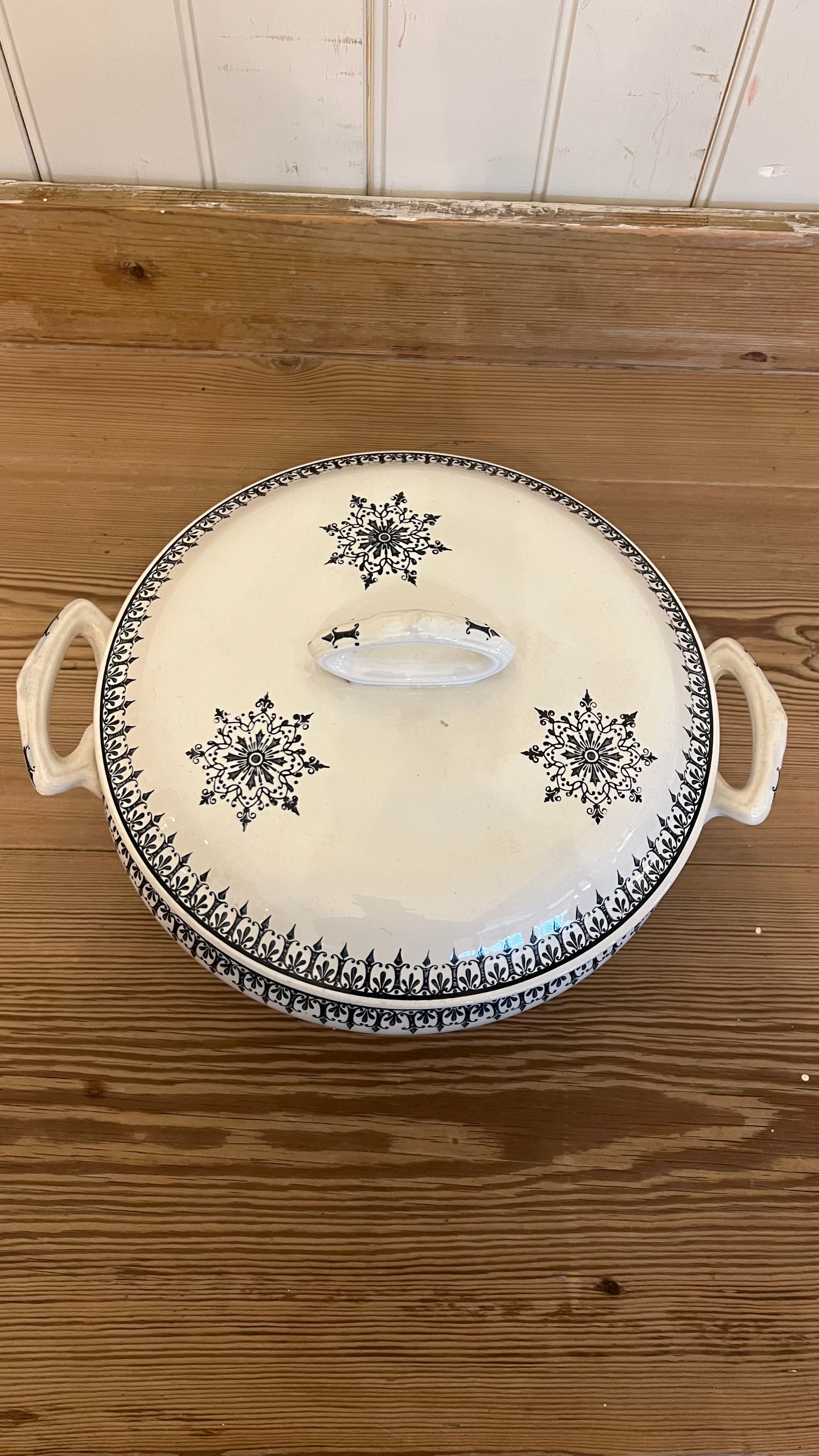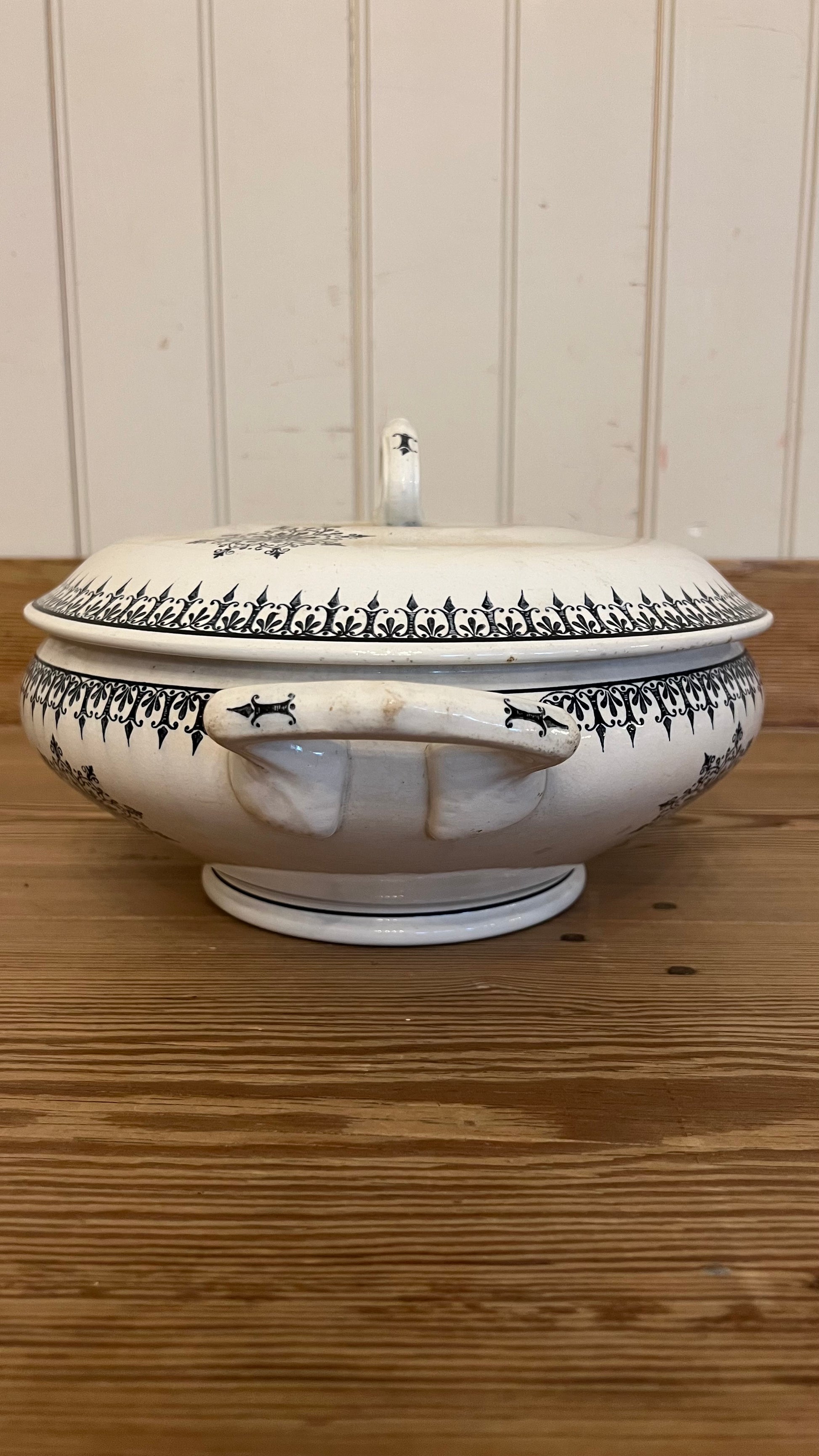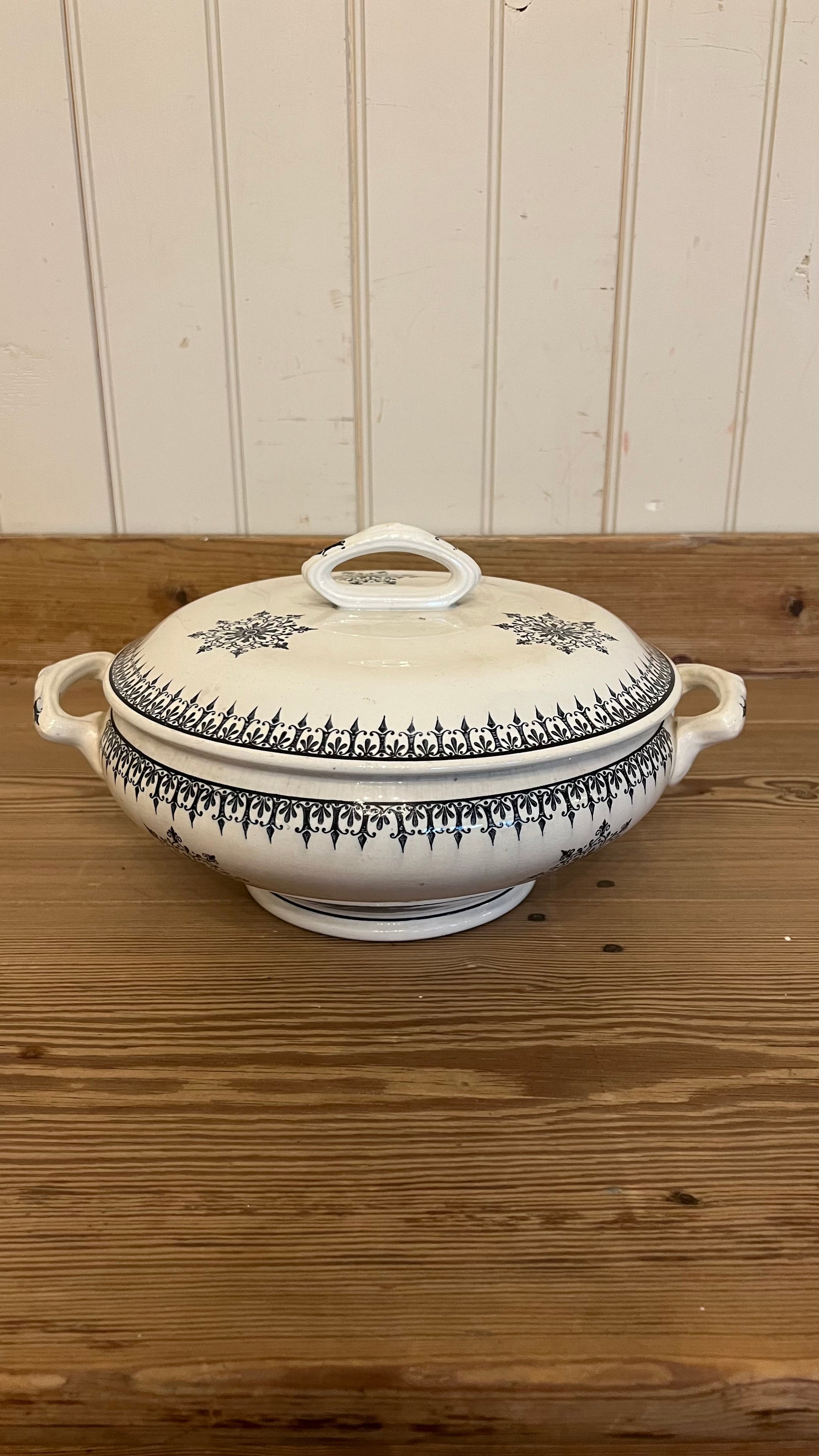 Slight staining and crazing throughout (mostly on the interior bowl of the soupiere), no chips or cracks. French Soupiere with a bold navy banding along the edges.