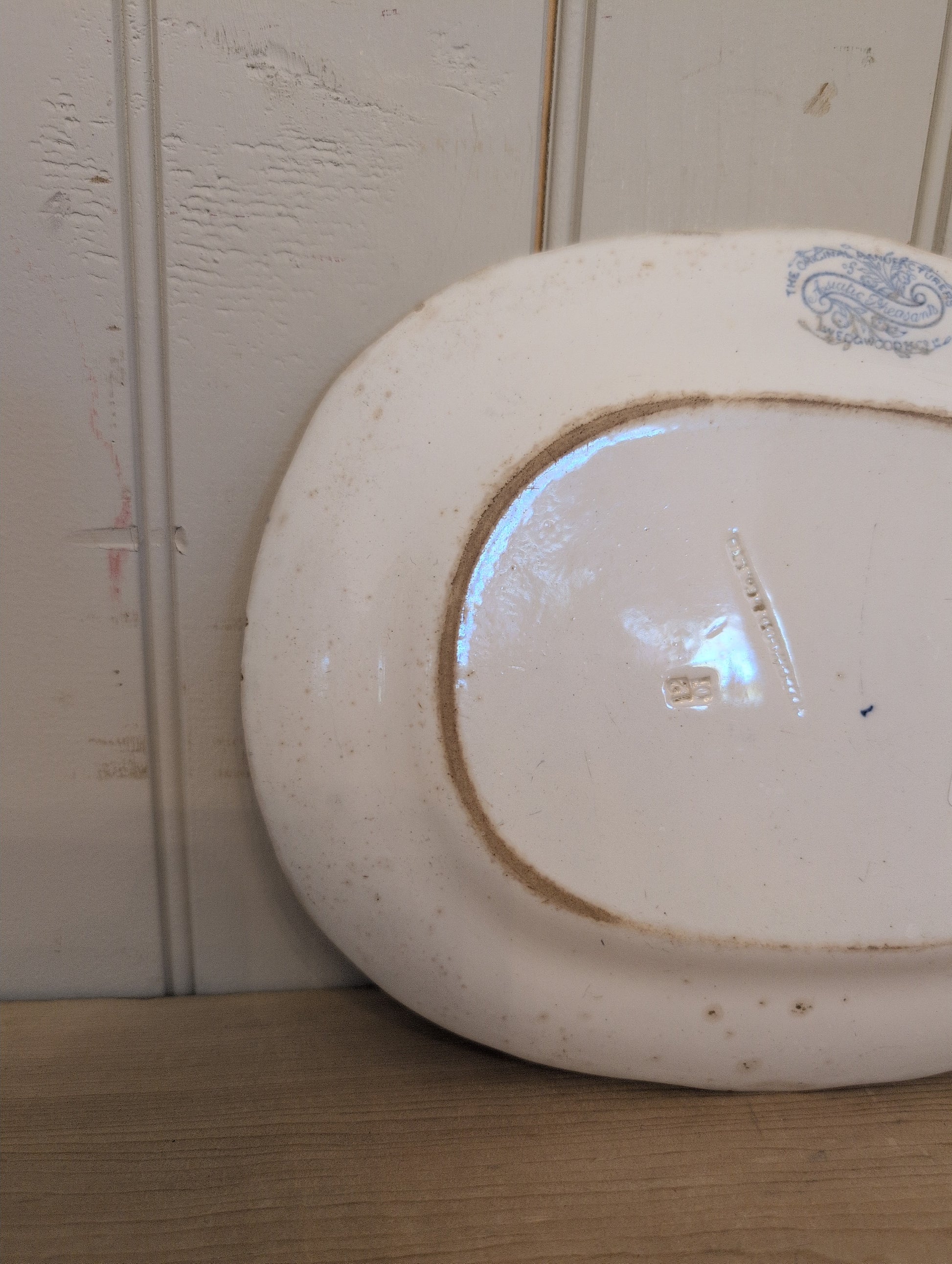 Original 19th C. Asiatic Pheasants scalloped transfer ware platter. Staining and crazing present. Some significant stains on the rim and base with a few small chips around the rim mainly on the underside. No major cracks present.