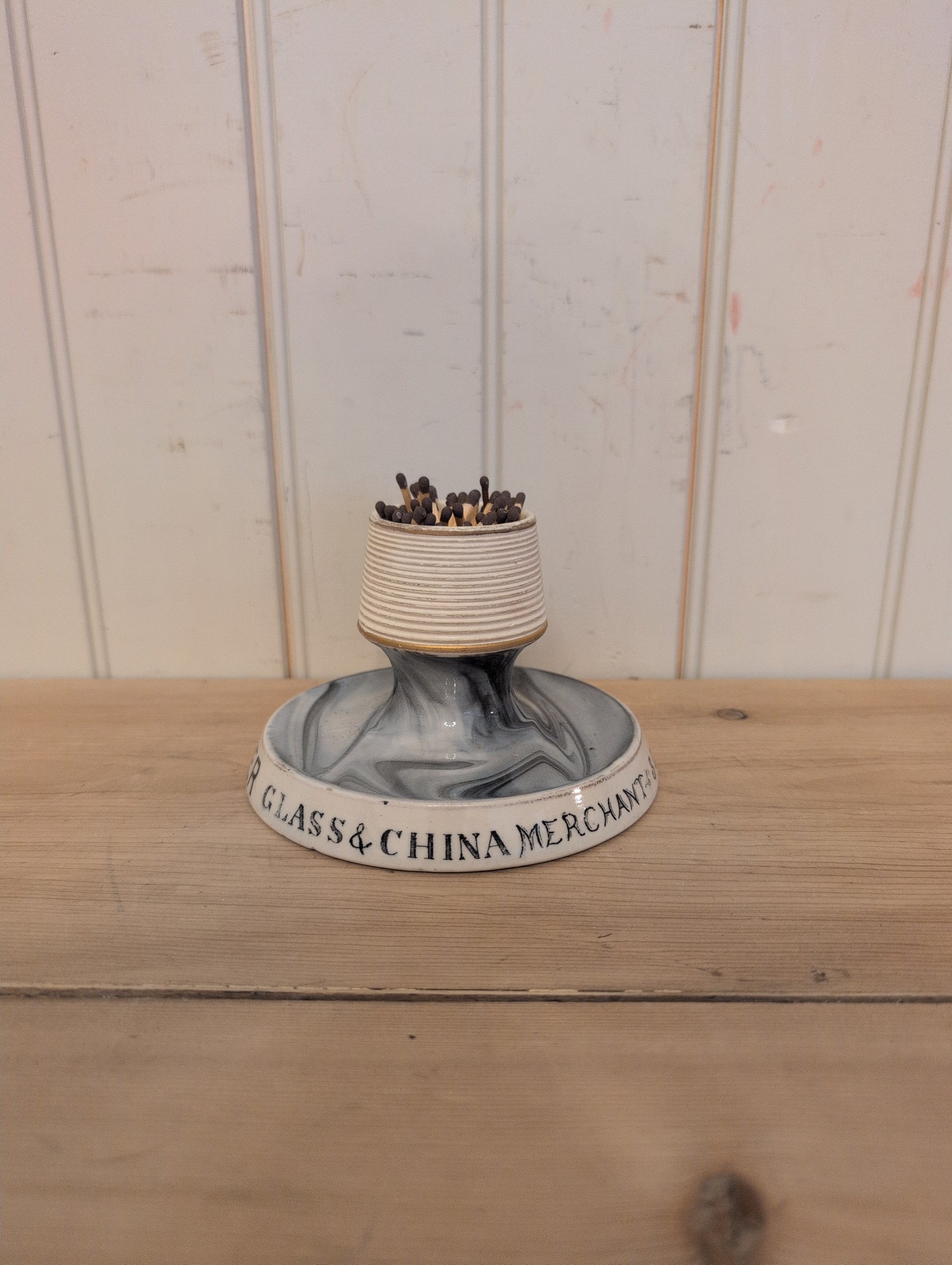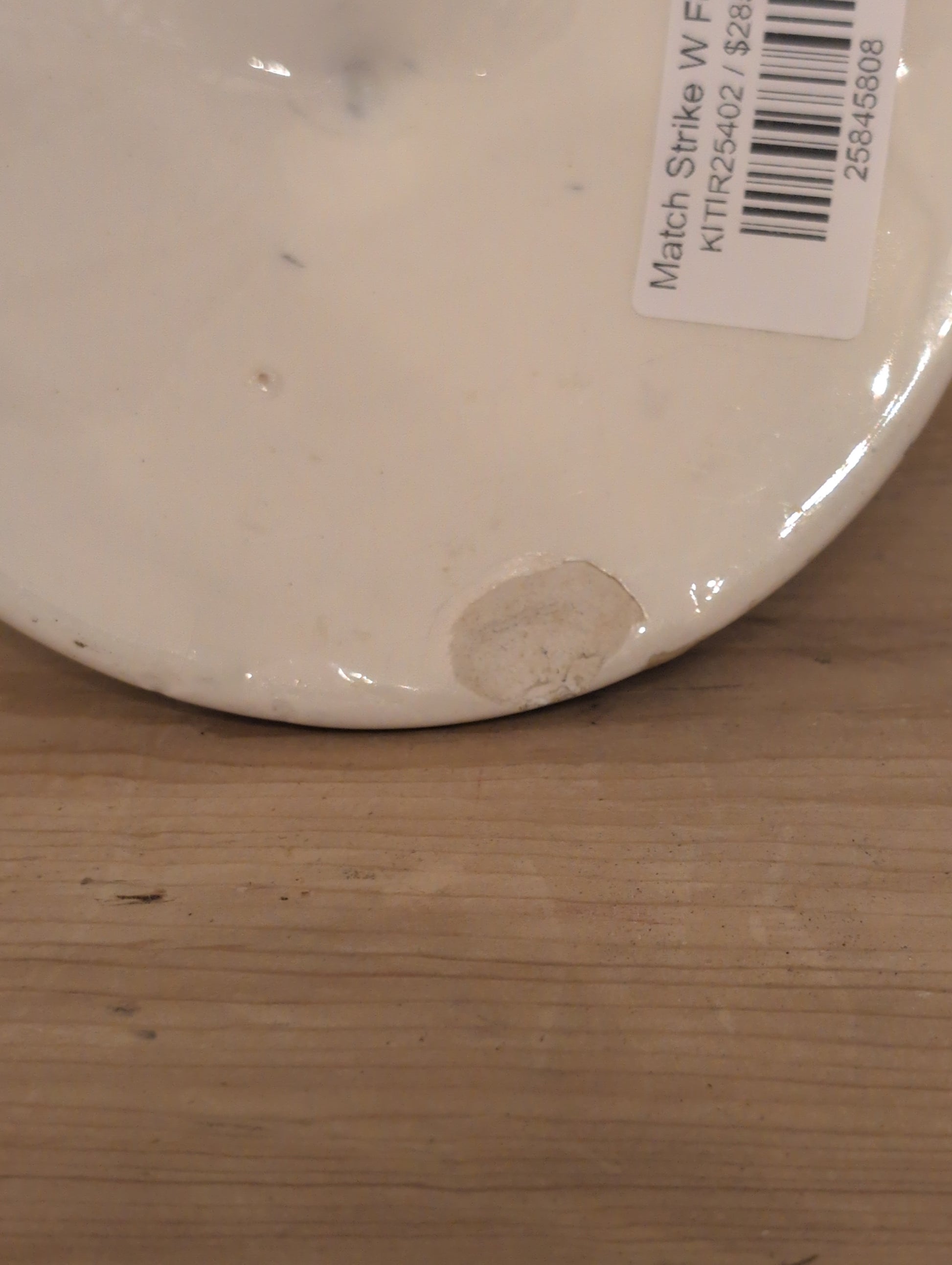 A Victorian era match strike with rich advertising and coloring. The bottom inscription reads "W. Feather Glass & China Merchants 3 Oakworth Rd. Keighley" - advertising the 19th C. shop it was used in. Staining and crazing present, there is a chip on the underside slightly visible near the "R" in "Feather", no other chips or cracks.