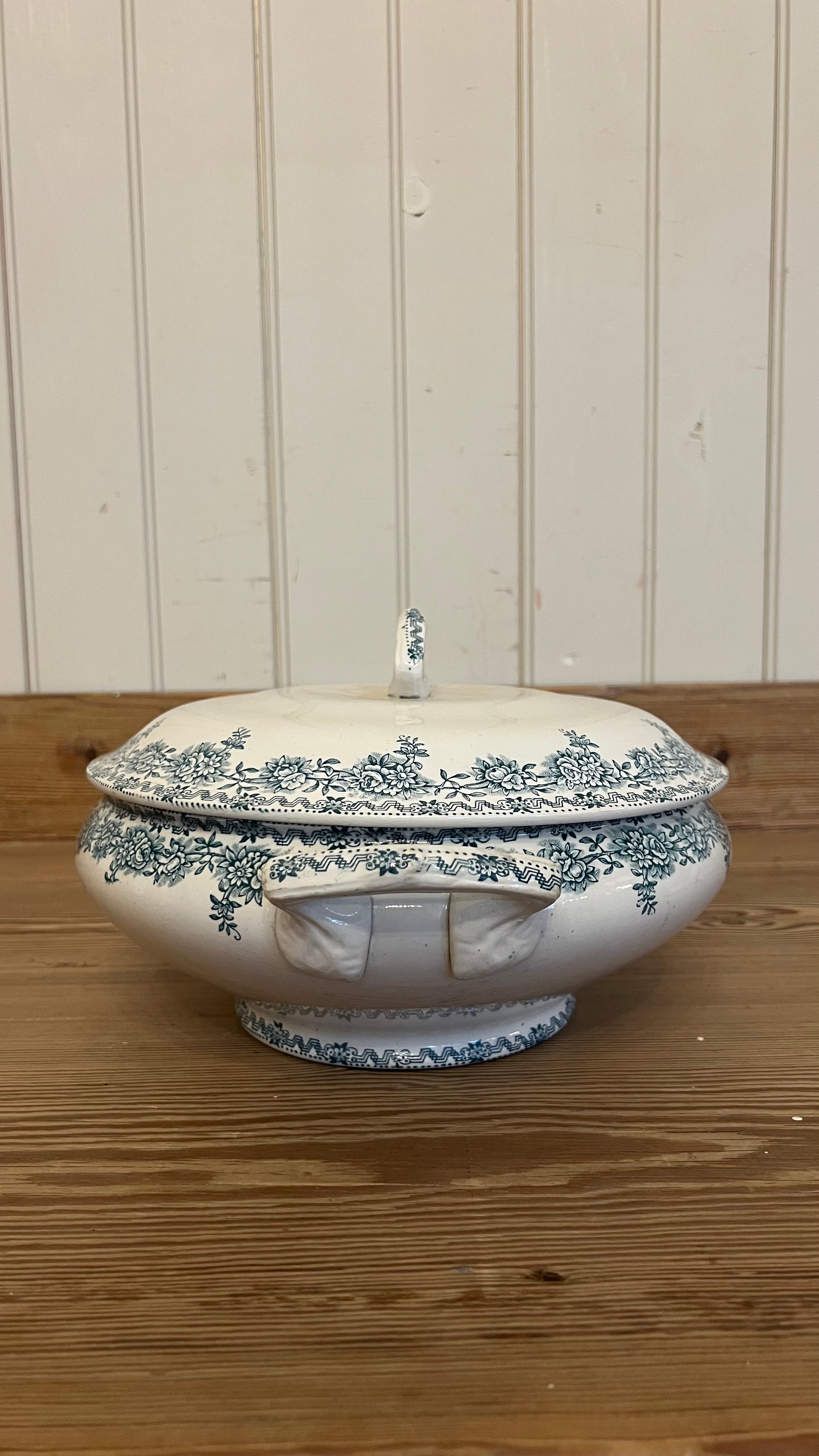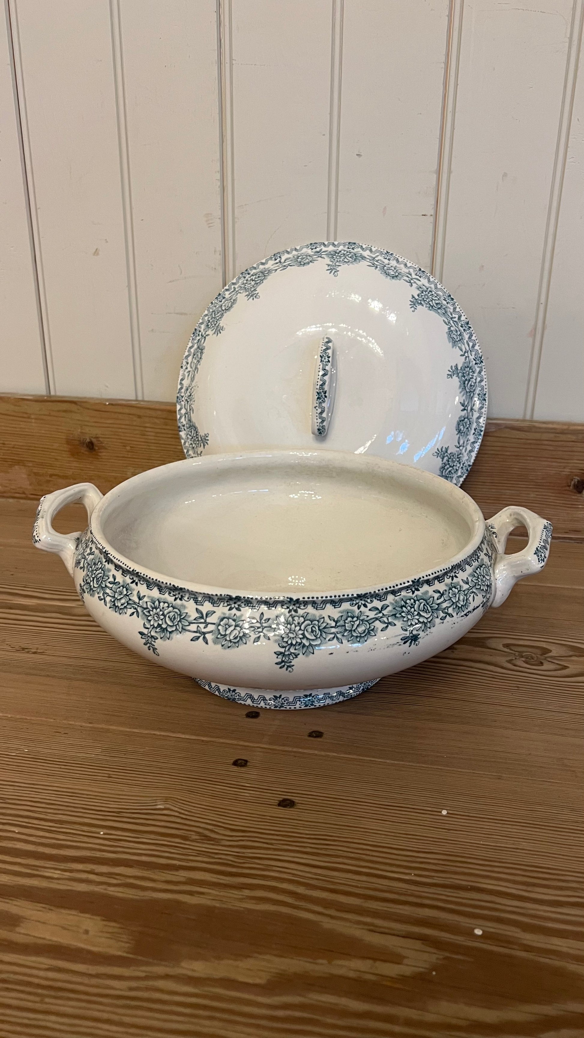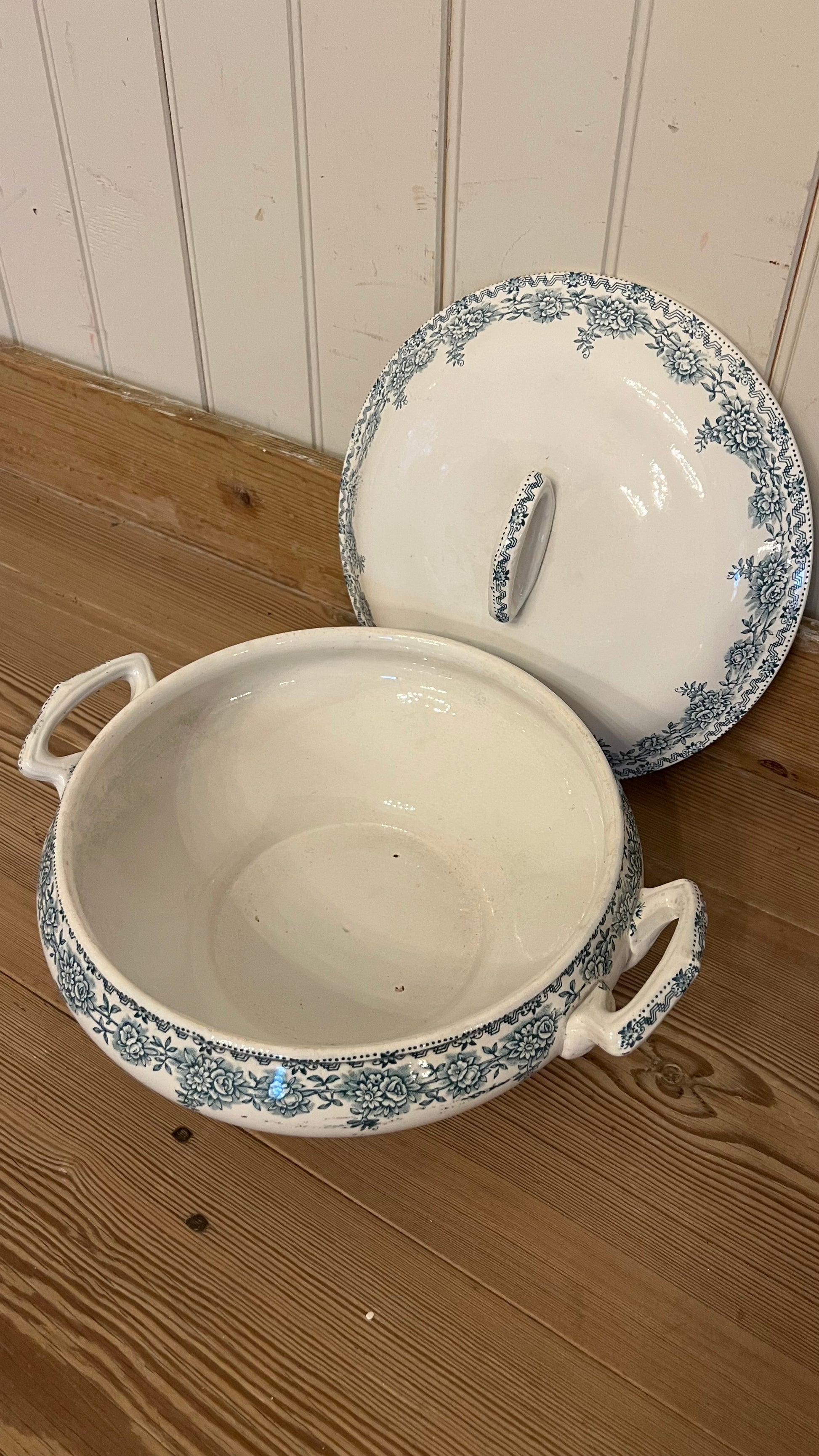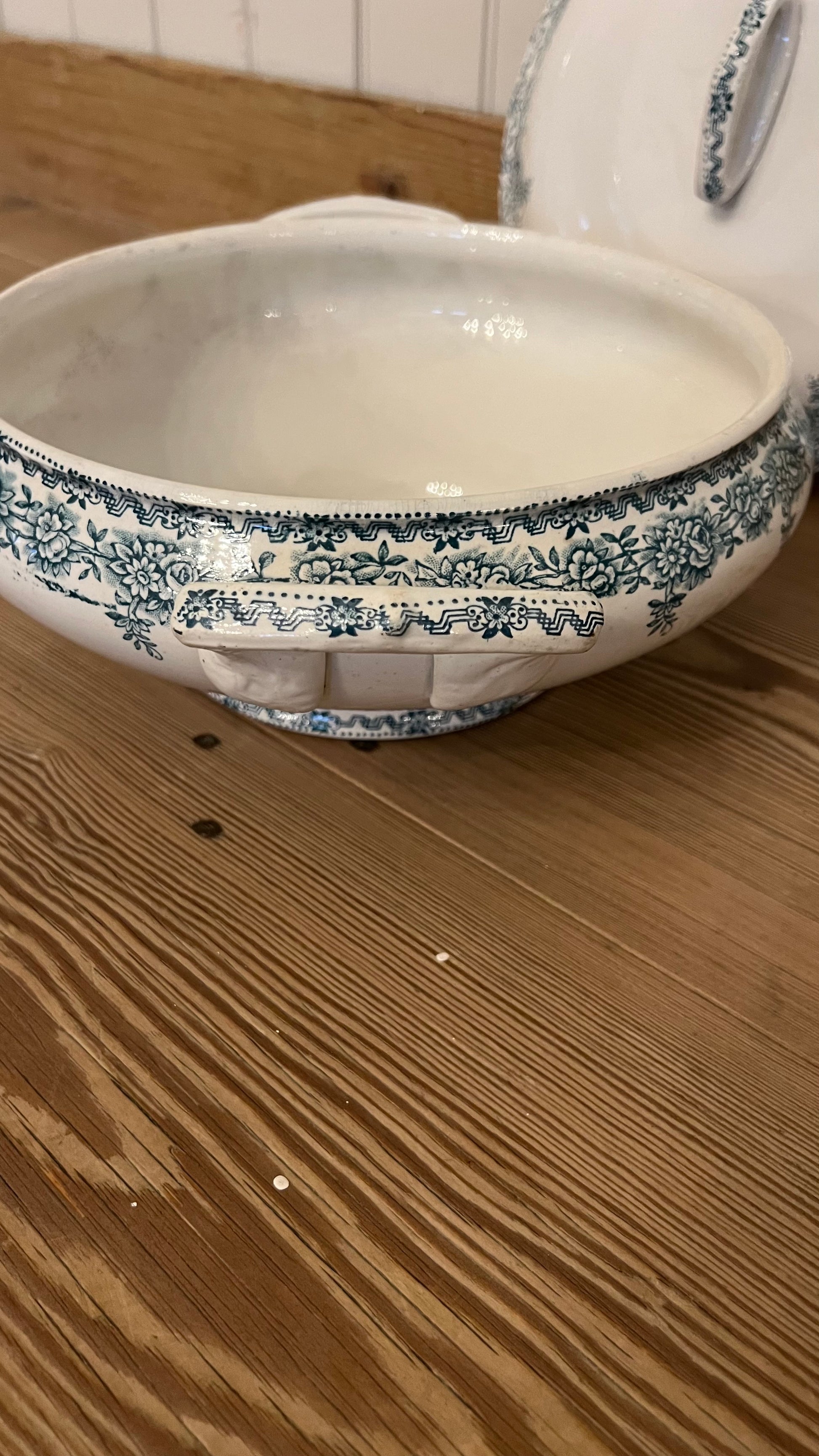 Slight staining and crazing throughout, no chips or cracks. French Soupiere with delicate floral pattern along the border.