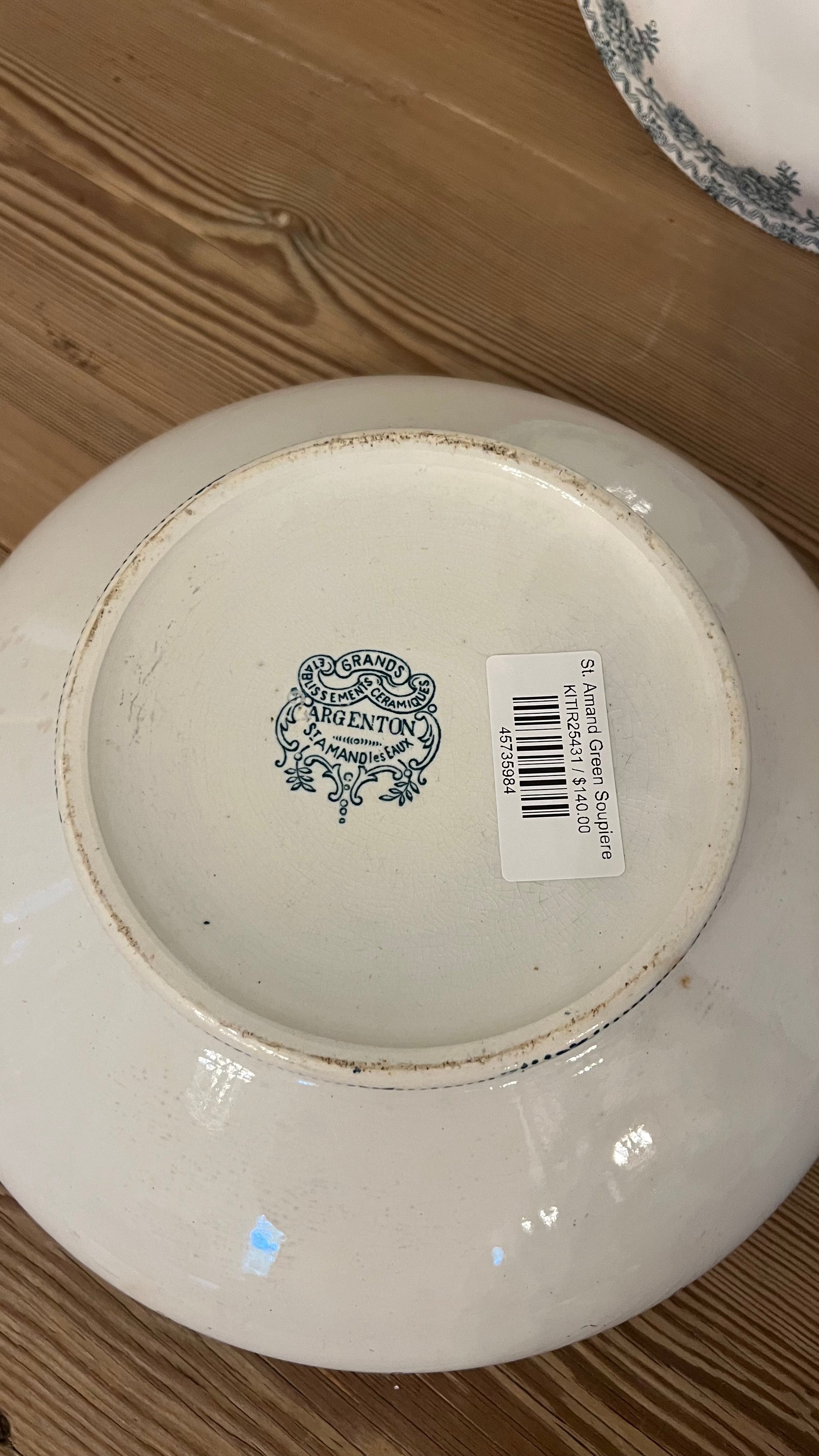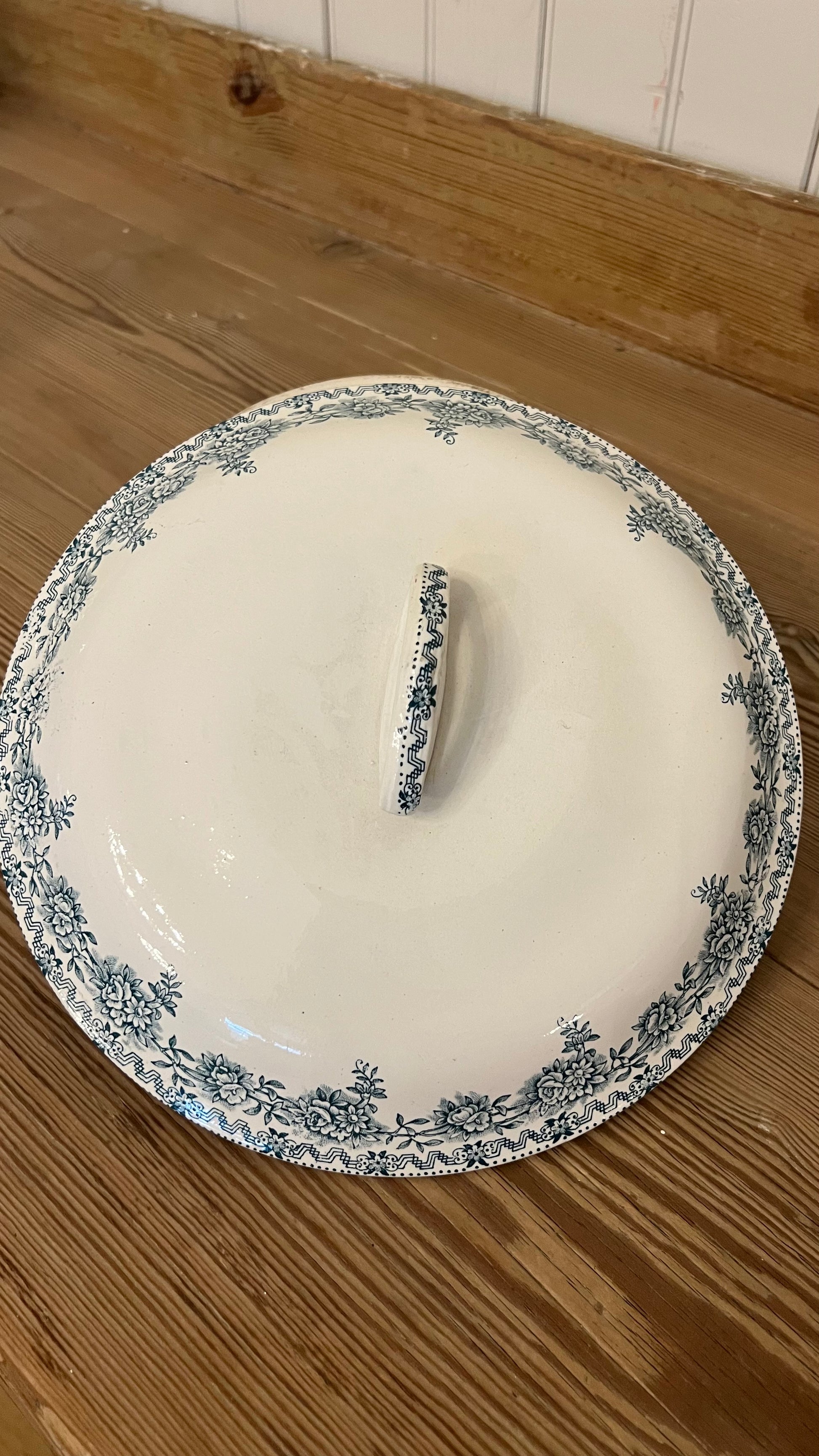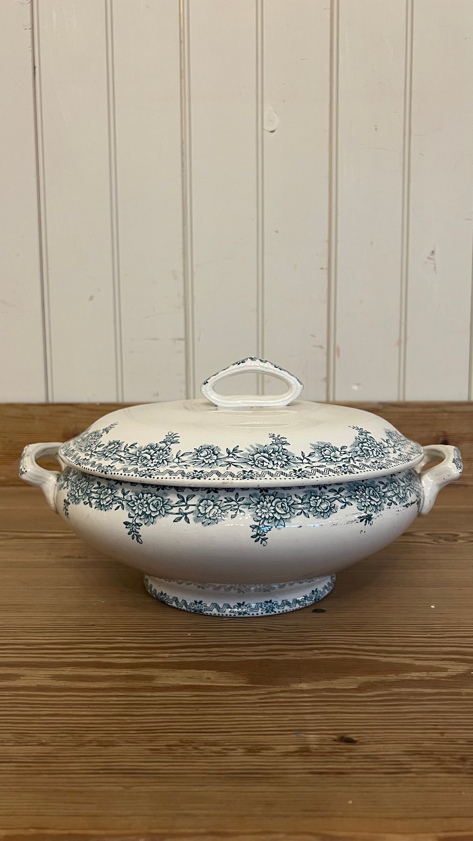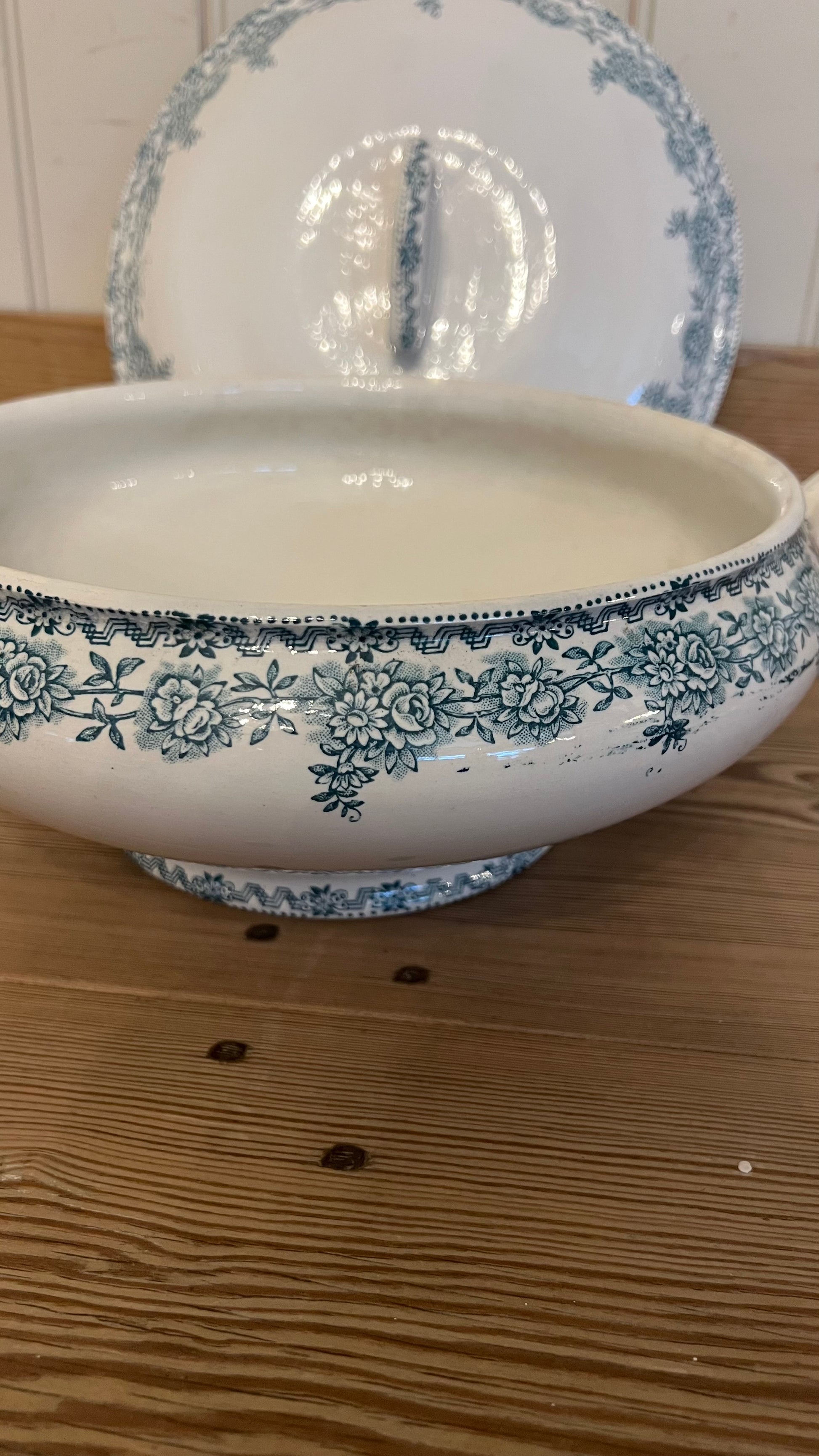 Slight staining and crazing throughout, no chips or cracks. French Soupiere with delicate floral pattern along the border.