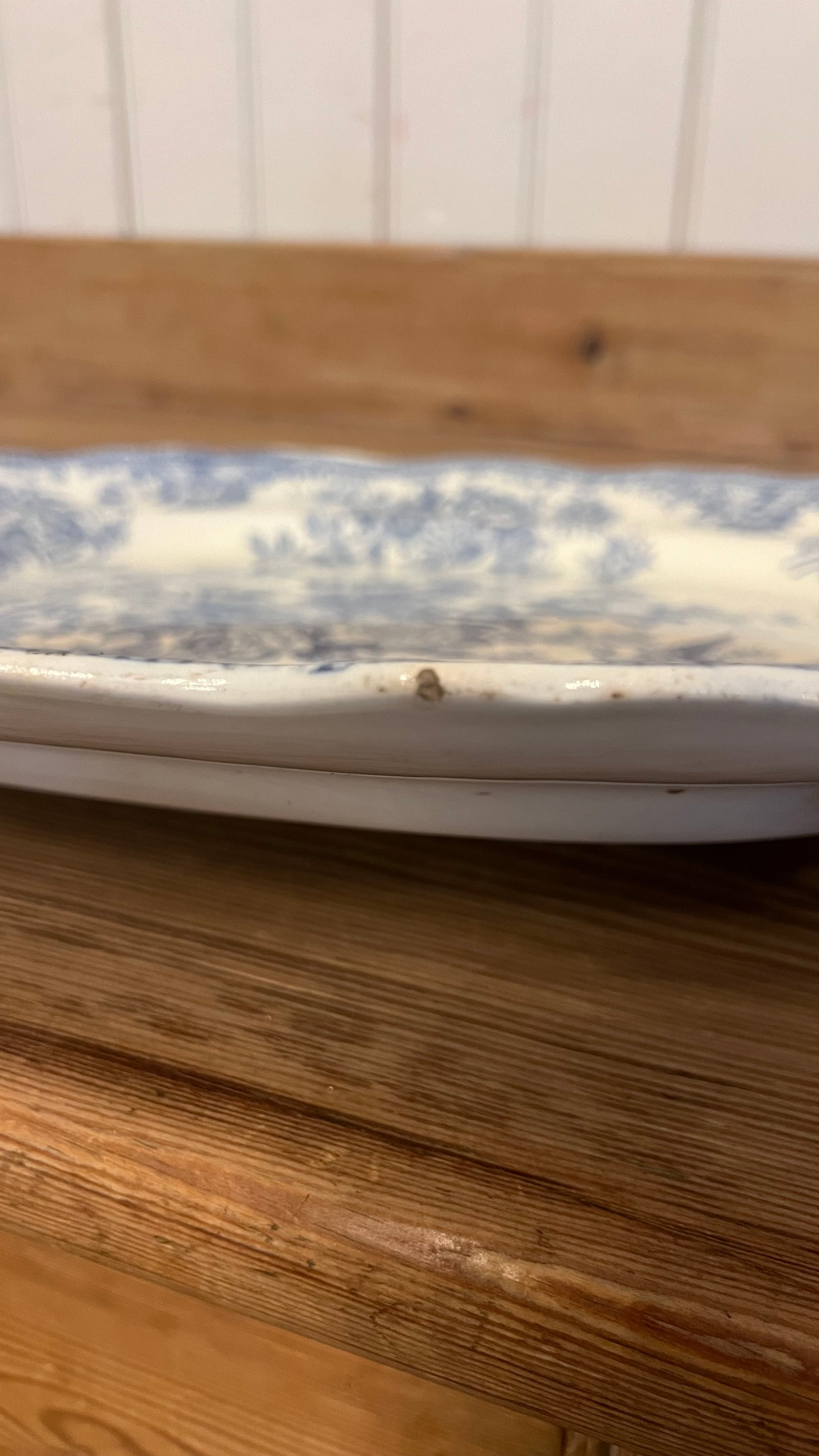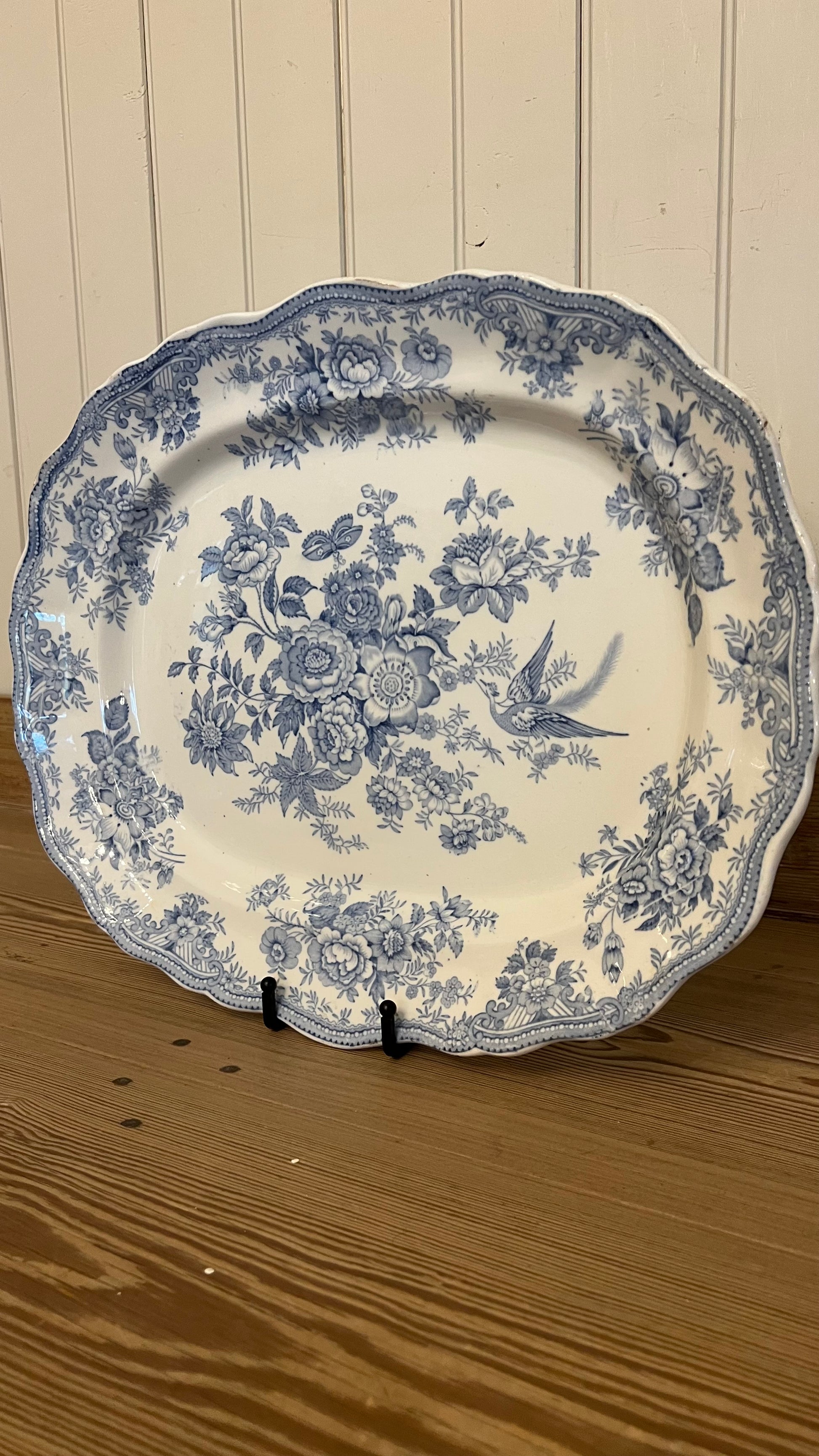 Original 19th C. Asiatic Pheasants scalloped transfer ware platter. This piece does have a back stamp and one small glazing point imperfection along the scalloped edge as shown. This platter is neither dark nor light blue rather a middle of the road blue, minimal staining/crazing/smudging.