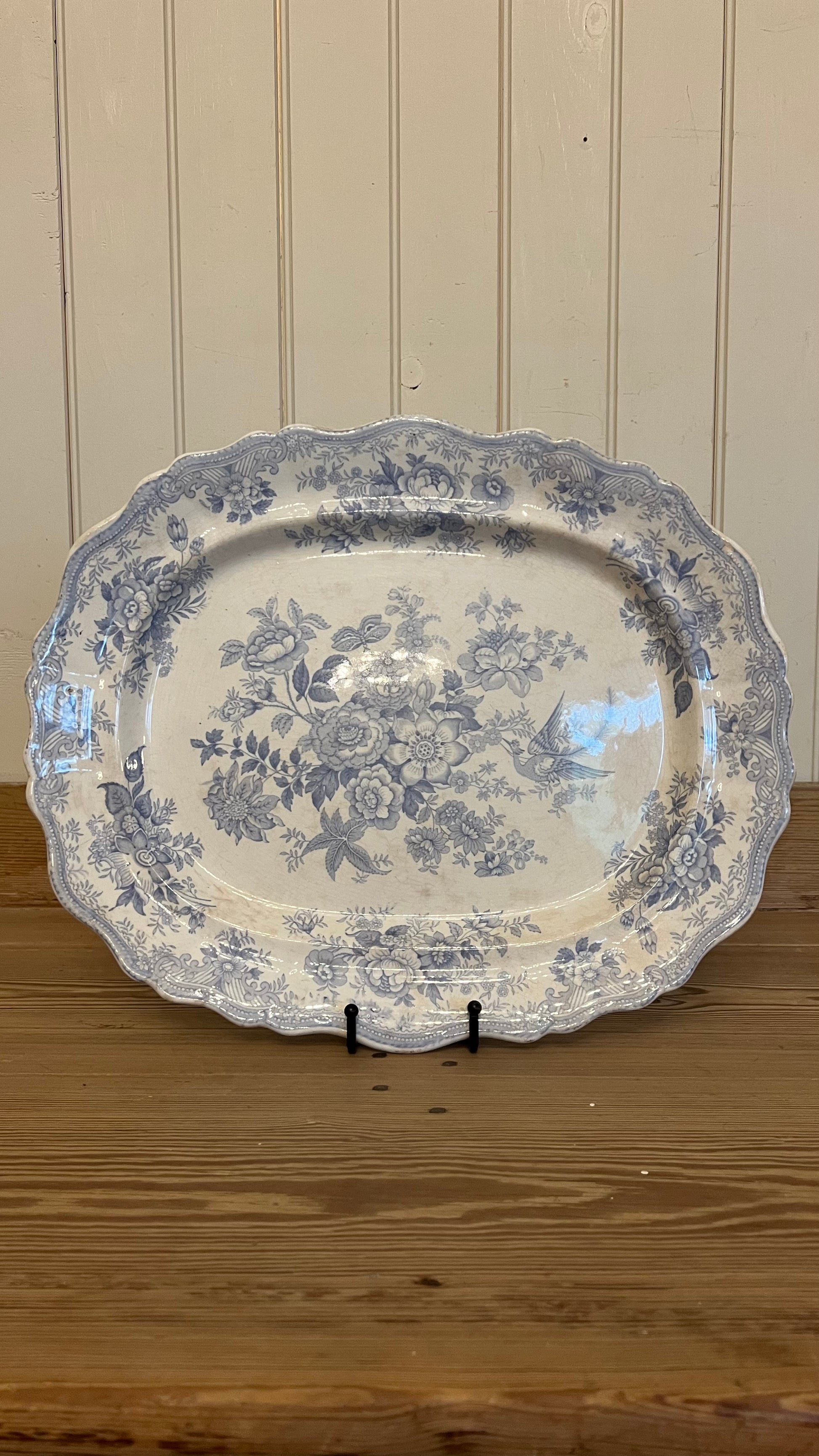 Original 19th C. Asiatic Pheasants scalloped transfer ware platter. This piece does have a back stamp and one small glazing point imperfection along the scalloped edge as shown. This piece is light blue and has various staining/crazing on the border/basin.