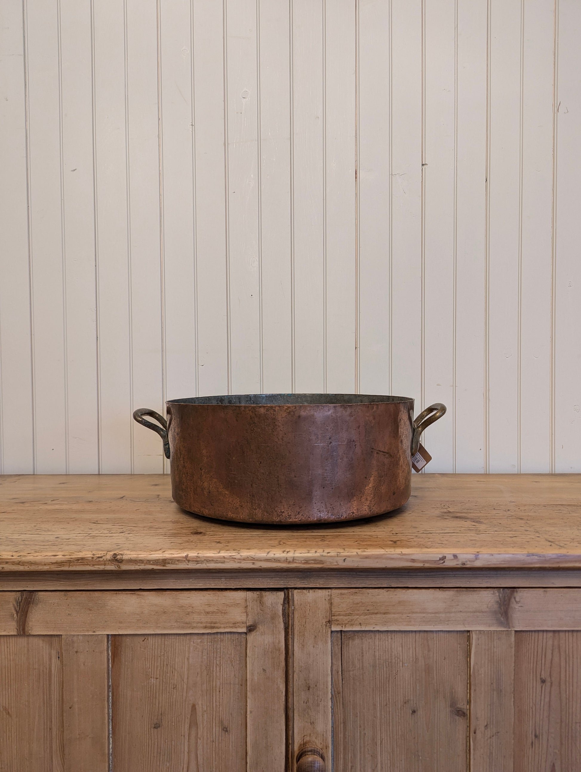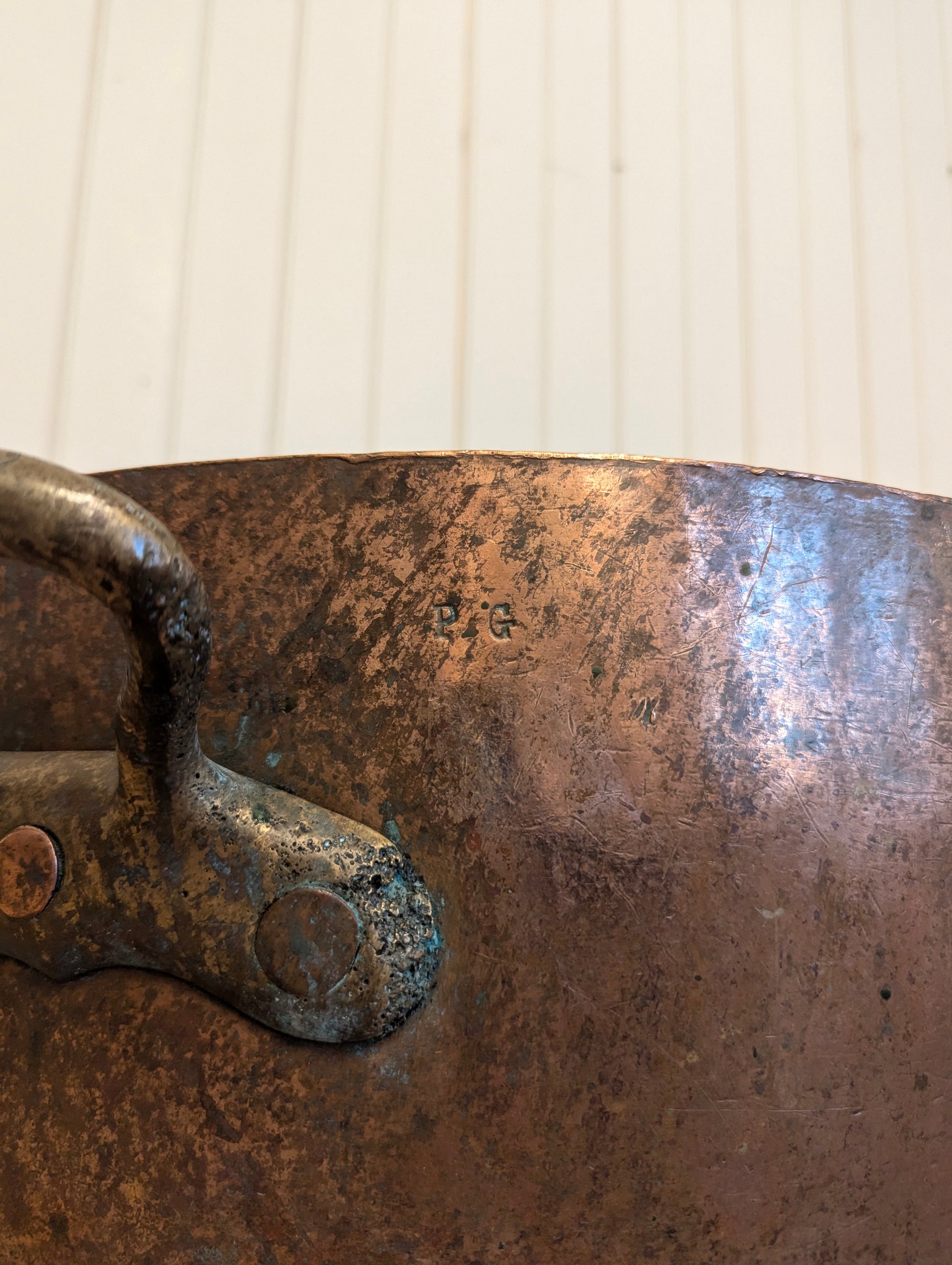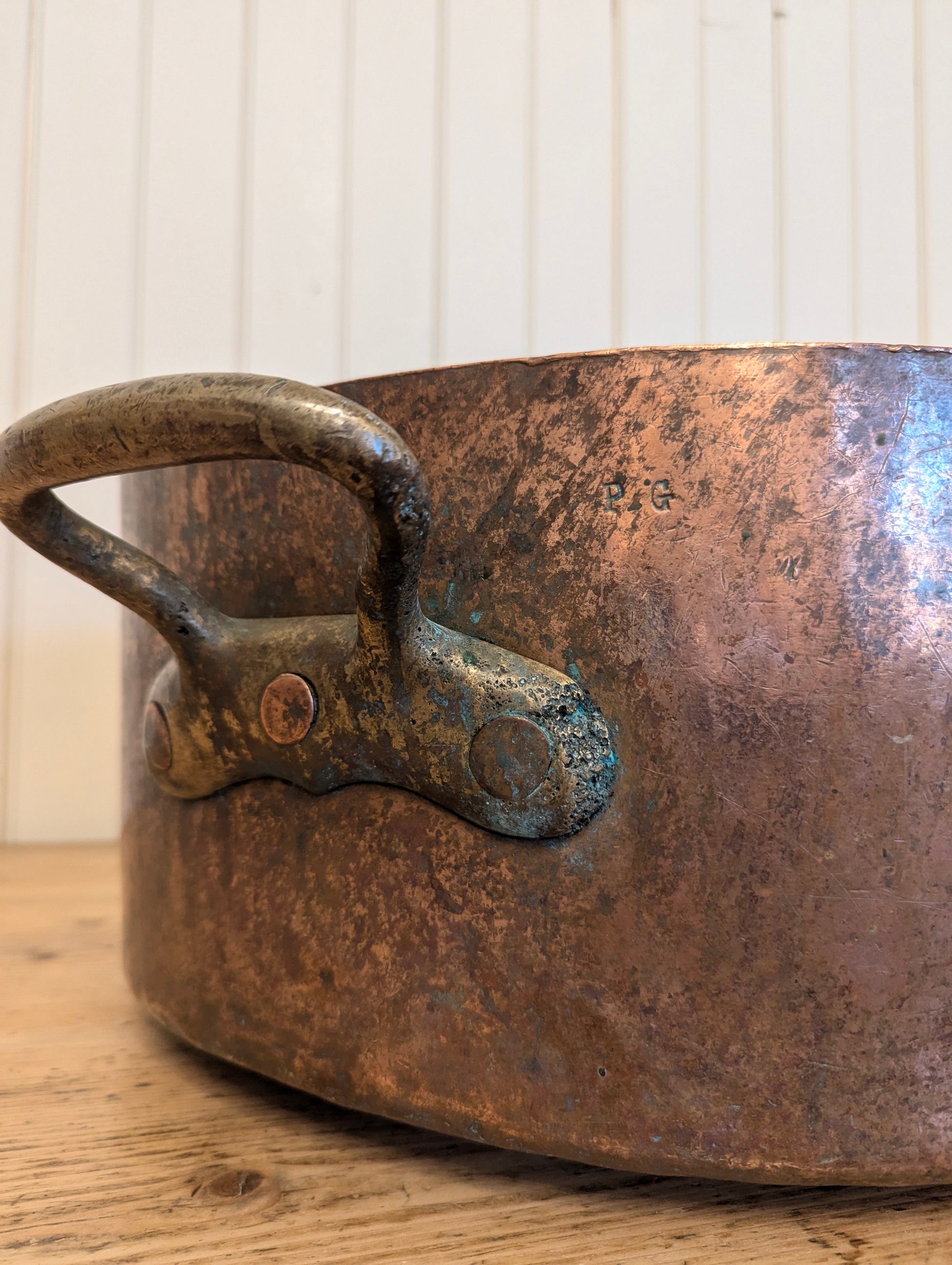 An exceptionally large French copper chefware pan. While it would have once has a lid, this pan now makes a stunning vessel for decorative use, or perched on a shelf/rack in the kitchen to add warmth. Right above the handle is the PG makers mark.